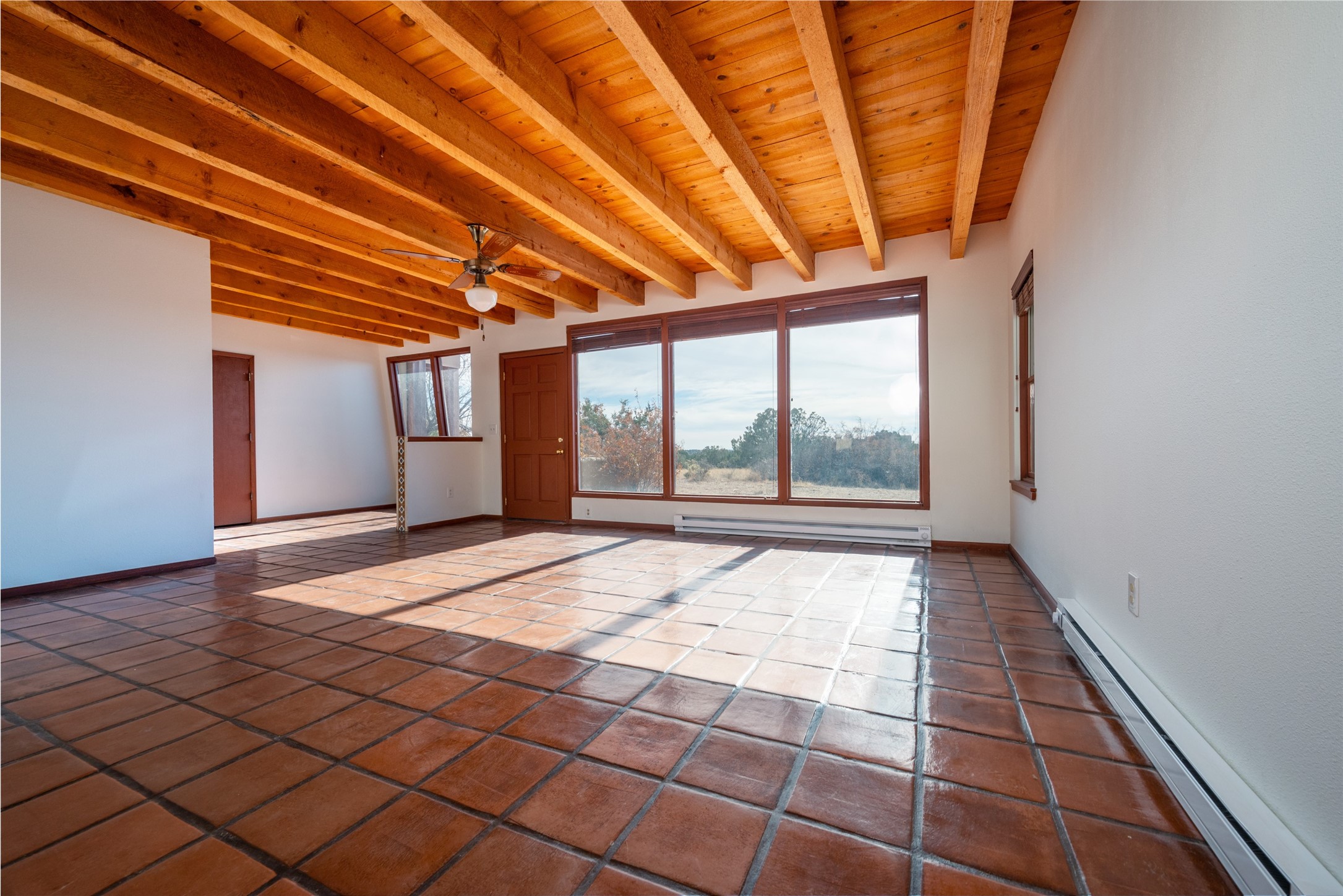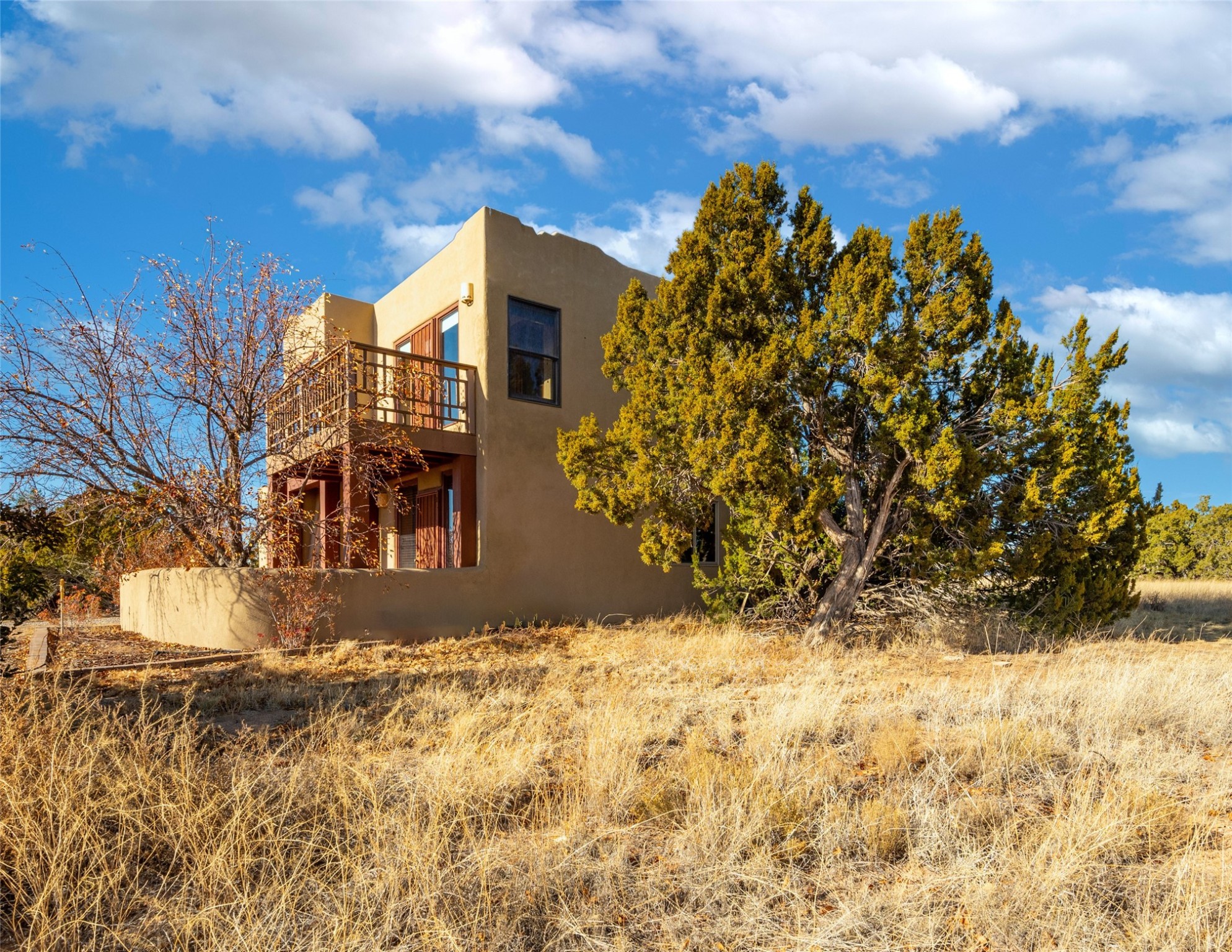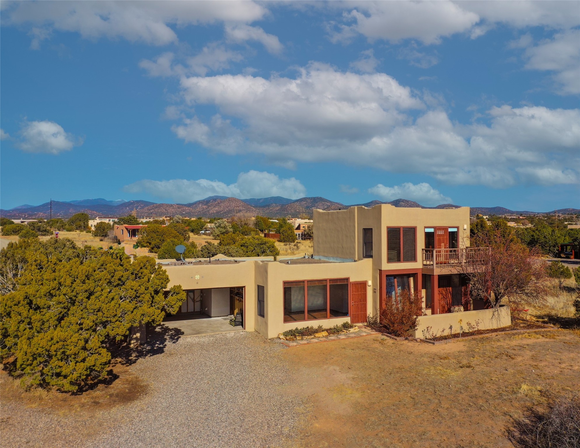 Home for the Holidays!! Come view this charming passive solar style home, strategically positioned to capture breathtaking views of the Turquoise Hills, Ortiz Mountains, and Sandia Mountains. Experience the beauty of New Mexico's stunning sunsets and stormy skies from the comfort of the enclosed and heated sunroom, located off the upstairs primary bedroom. Situated on almost an acre and a half of land, this property offers ample space for outdoor activities. With two full baths, including one in the primary bedroom upstairs, convenience is ensured for all occupants. The main living area features an open floor plan with Saltillo-style flooring and beamed ceilings, adding a touch of warmth and character to the space, while the bedrooms are carpeted for added comfort. The well-appointed kitchen boasts essential appliances such as a dishwasher, electric range, and refrigerator, providing all you need for culinary endeavors. Additional features include a newer hot water heater for your comfort and efficiency. The home is all-electric with natural gas available if desired. Water supply is through a shared well. This property offers a unique opportunity to enjoy New Mexico's natural beauty while providing comfortable living spaces. Don't miss out on this wonderful home - schedule a showing today!