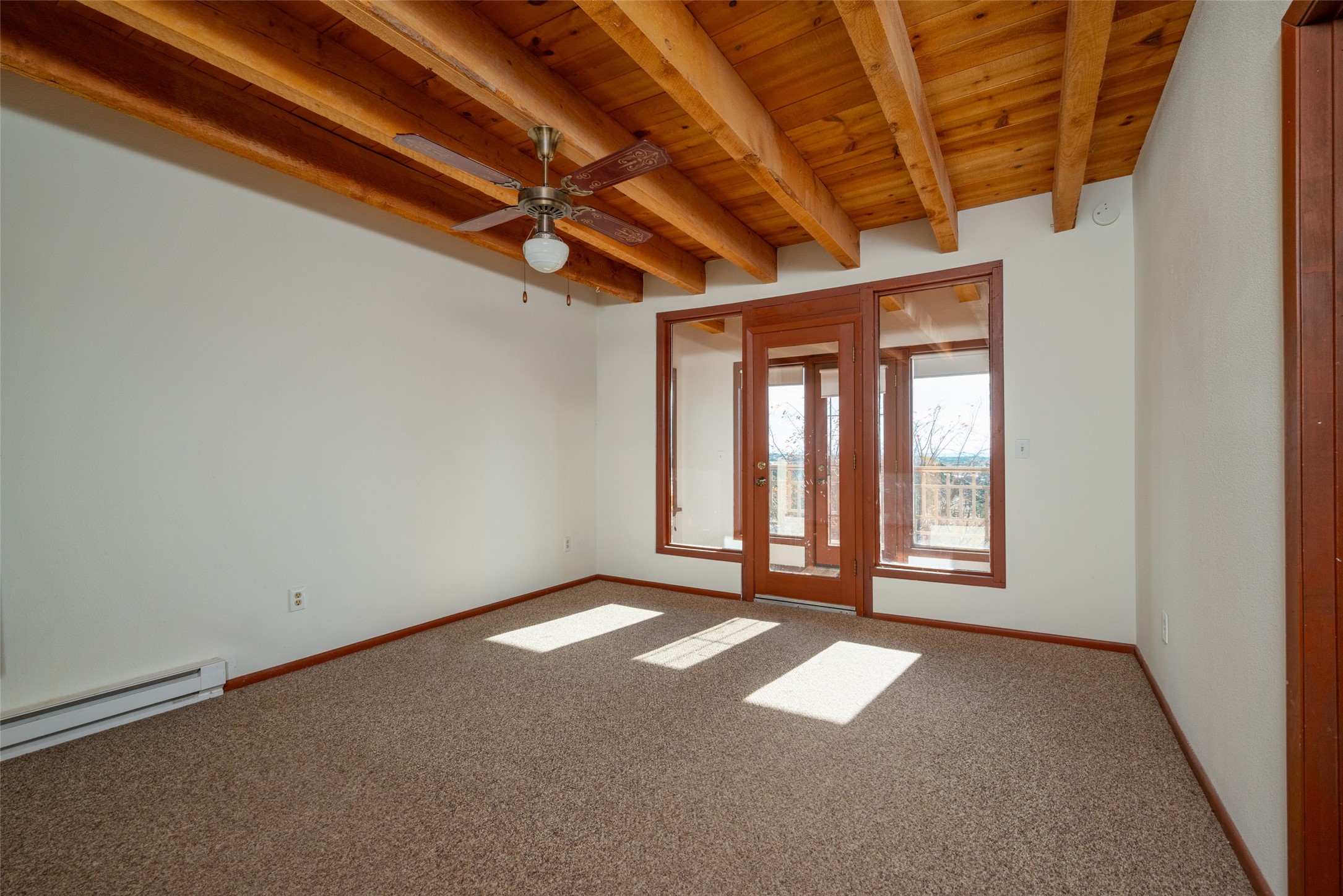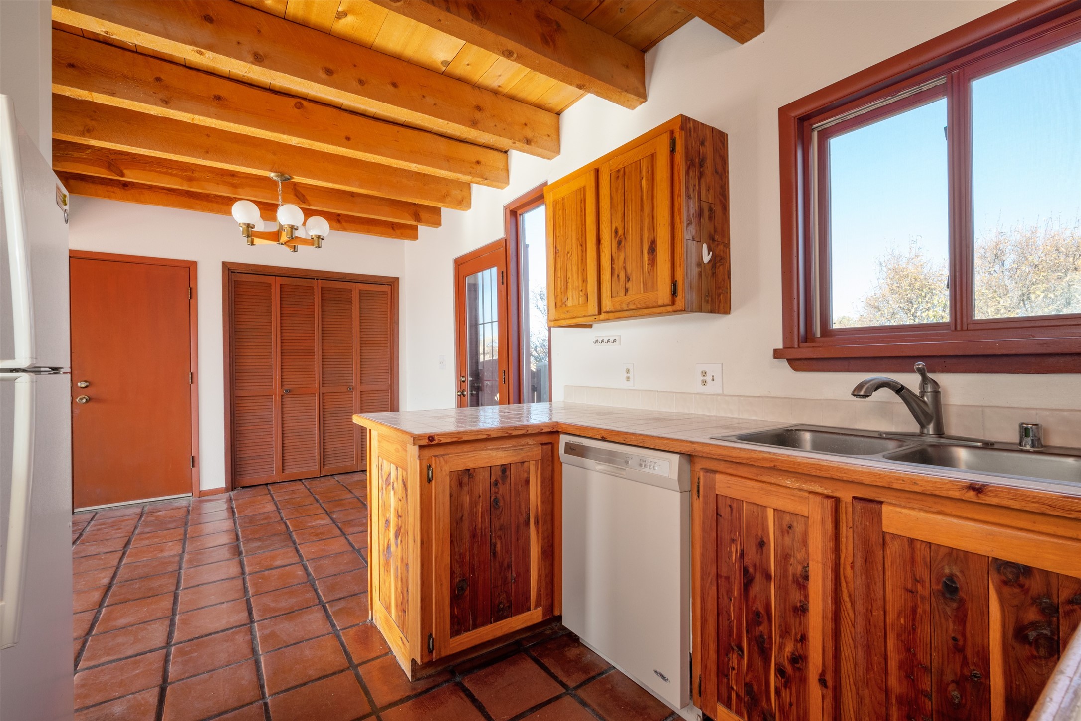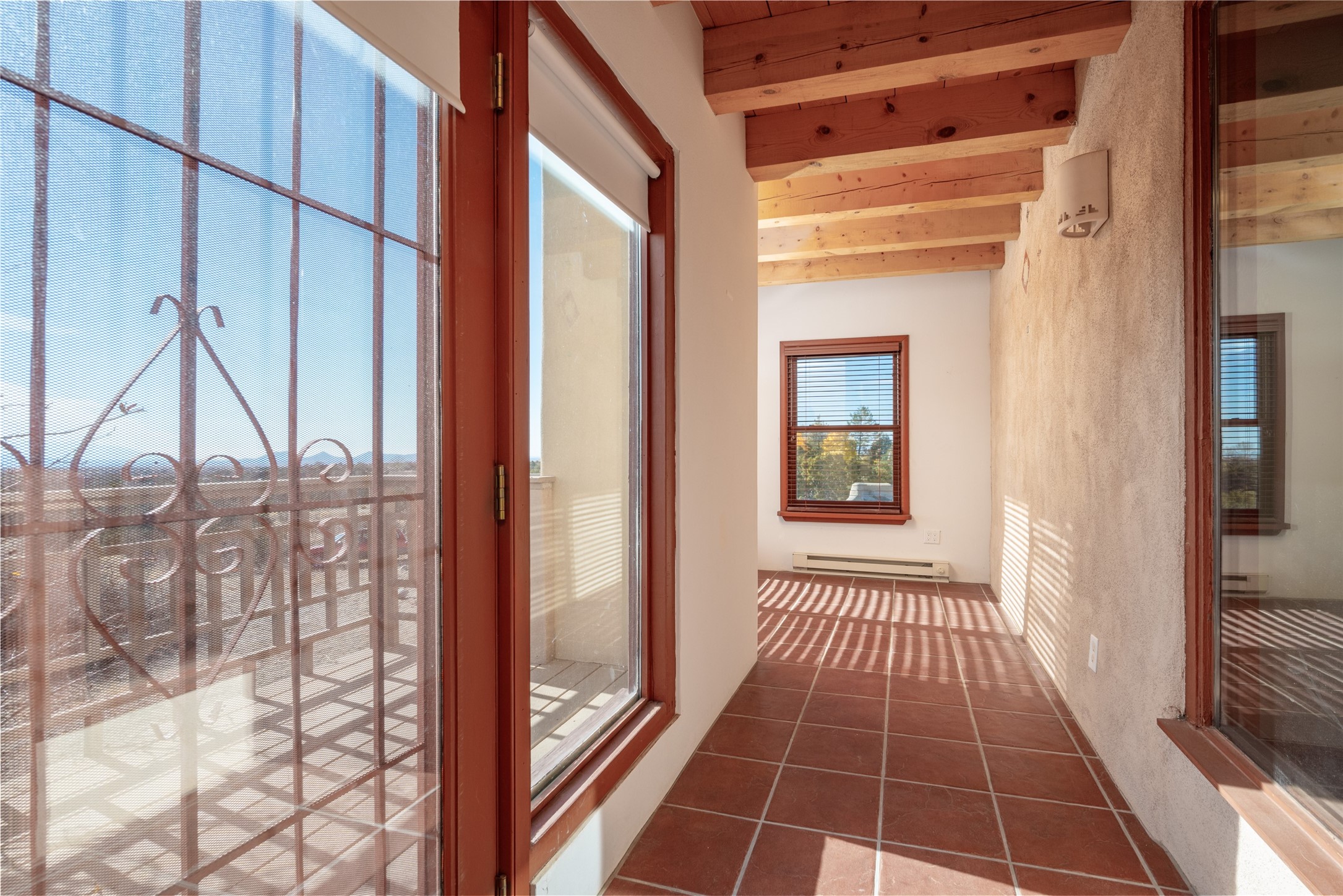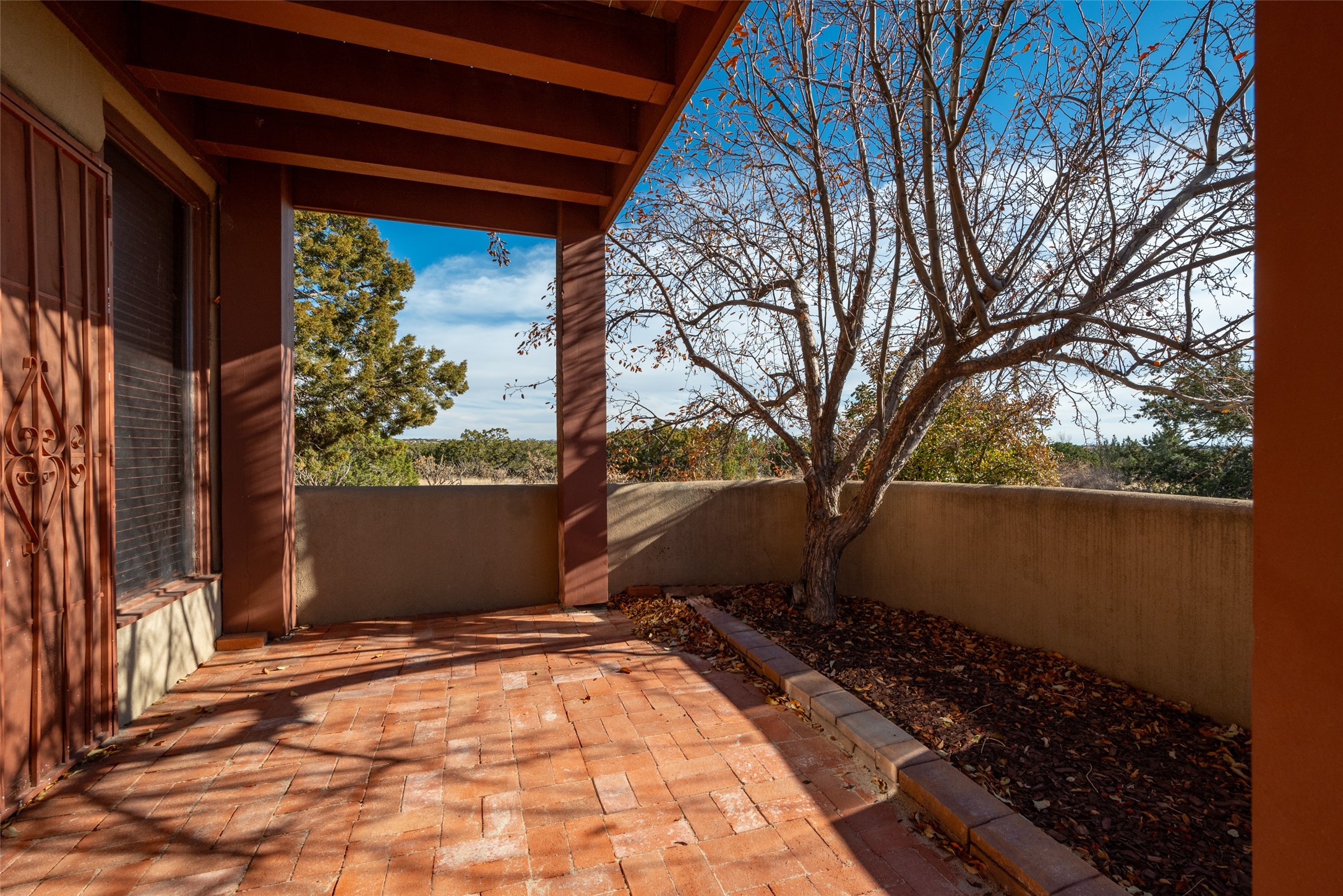 Home for the Holidays!! Come view this charming passive solar style home, strategically positioned to capture breathtaking views of the Turquoise Hills, Ortiz Mountains, and Sandia Mountains. Experience the beauty of New Mexico's stunning sunsets and stormy skies from the comfort of the enclosed and heated sunroom, located off the upstairs primary bedroom. Situated on almost an acre and a half of land, this property offers ample space for outdoor activities. With two full baths, including one in the primary bedroom upstairs, convenience is ensured for all occupants. The main living area features an open floor plan with Saltillo-style flooring and beamed ceilings, adding a touch of warmth and character to the space, while the bedrooms are carpeted for added comfort. The well-appointed kitchen boasts essential appliances such as a dishwasher, electric range, and refrigerator, providing all you need for culinary endeavors. Additional features include a newer hot water heater for your comfort and efficiency. The home is all-electric with natural gas available if desired. Water supply is through a shared well. This property offers a unique opportunity to enjoy New Mexico's natural beauty while providing comfortable living spaces. Don't miss out on this wonderful home - schedule a showing today!