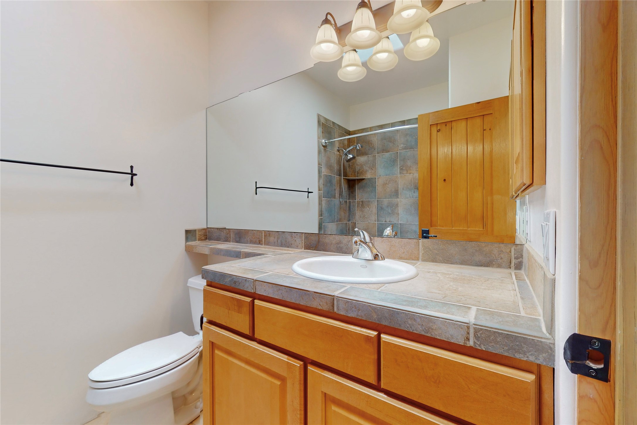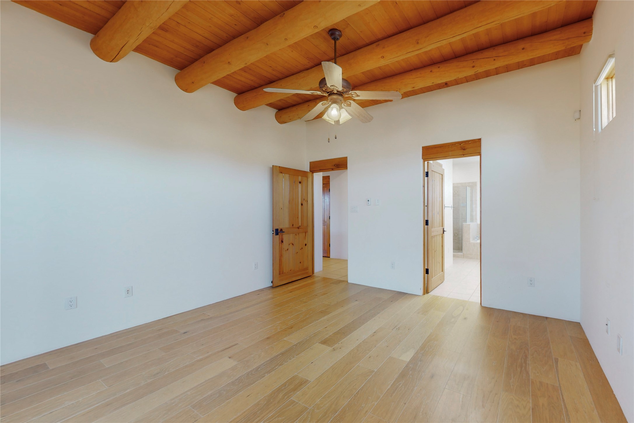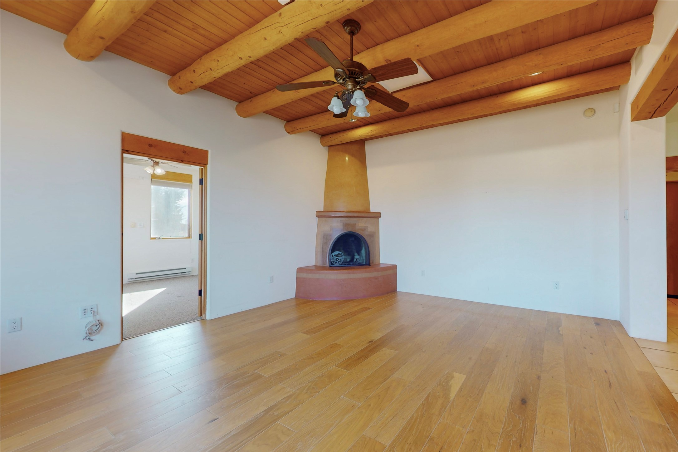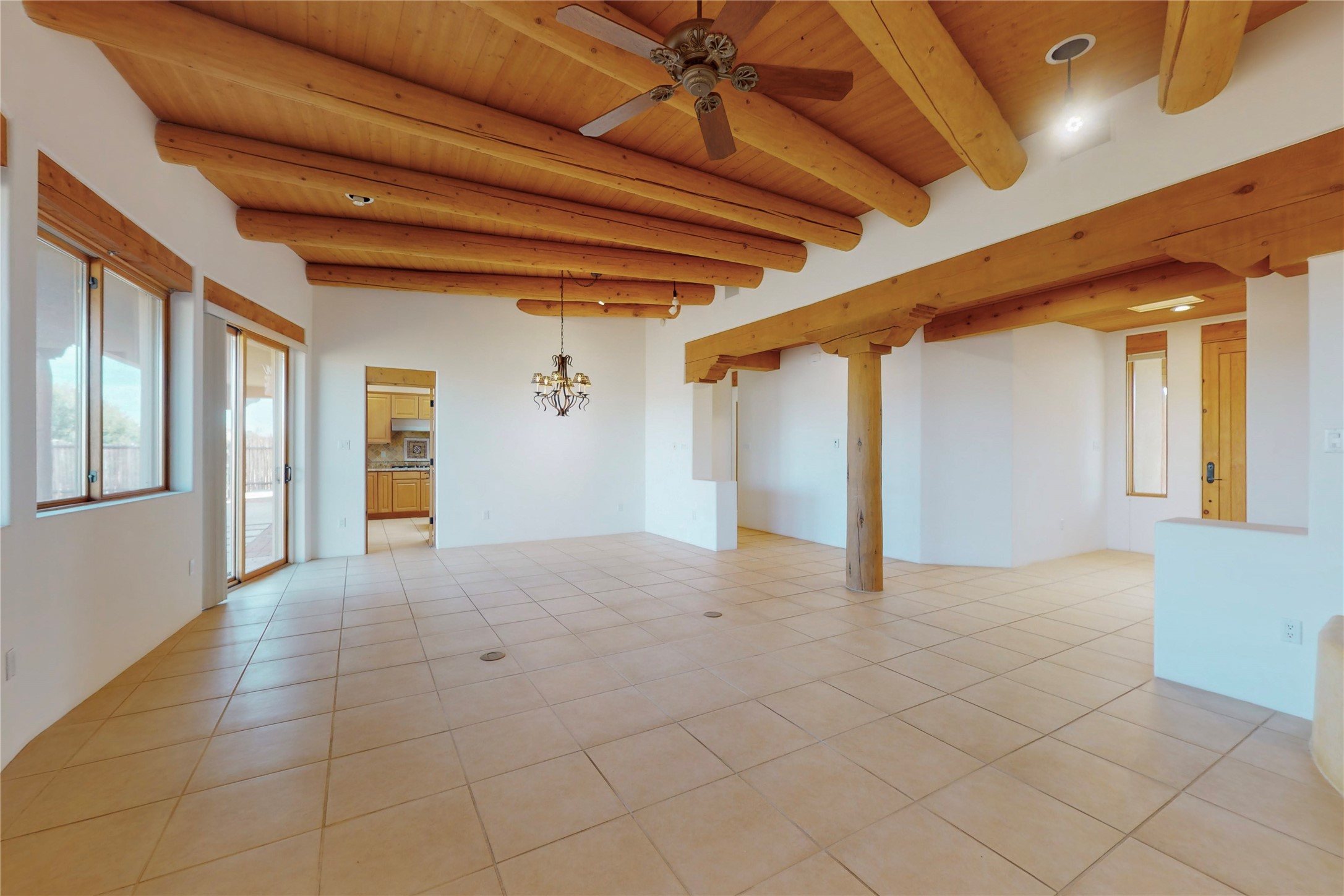 Enter through a private front courtyard with established landscaping and mature trees to this elegant single-level Eldorado home with a generous covered portal and classic Santa Fe details. Open concept living room/dining room with high ceilings, vigas, and plastered kiva fireplace. Cook's kitchen includes a large island, pantry, breakfast area, stainless appliances, granite countertops, and a built-in desk. An outdoor patio with coyote fencing for privacy and securing furry friends is just off the dining area, perfect for entertaining. Built on a 1.7-acre lot, the home includes a second living area off the kitchen with a kiva fireplace, which would make a great media or game room. An office/studio space off this bonus room is very private with endless potential (originally a third garage bay). The primary bathroom has double sinks, tall countertops, a separate shower and tub, as well as a large walk-in closet. Separate laundry room. Lots of storage. Heated garage. Just a 20-minute drive to Downtown Santa Fe. The Eldorado community offers hiking/biking trails, a grocery store, a seasonal pool, a library, a Senior Center, a dog park, restaurants, and many other amenities. Schedule a showing today.