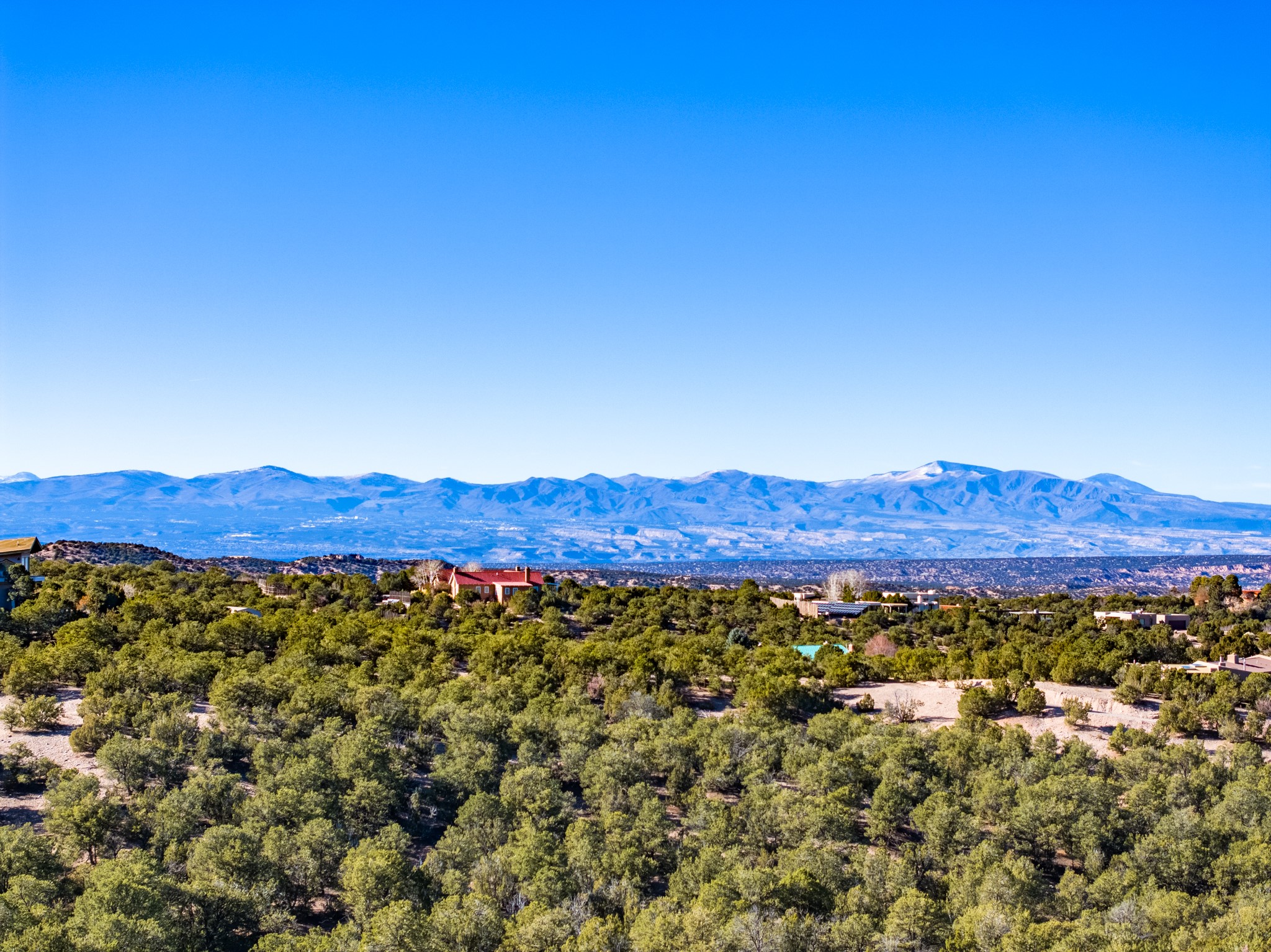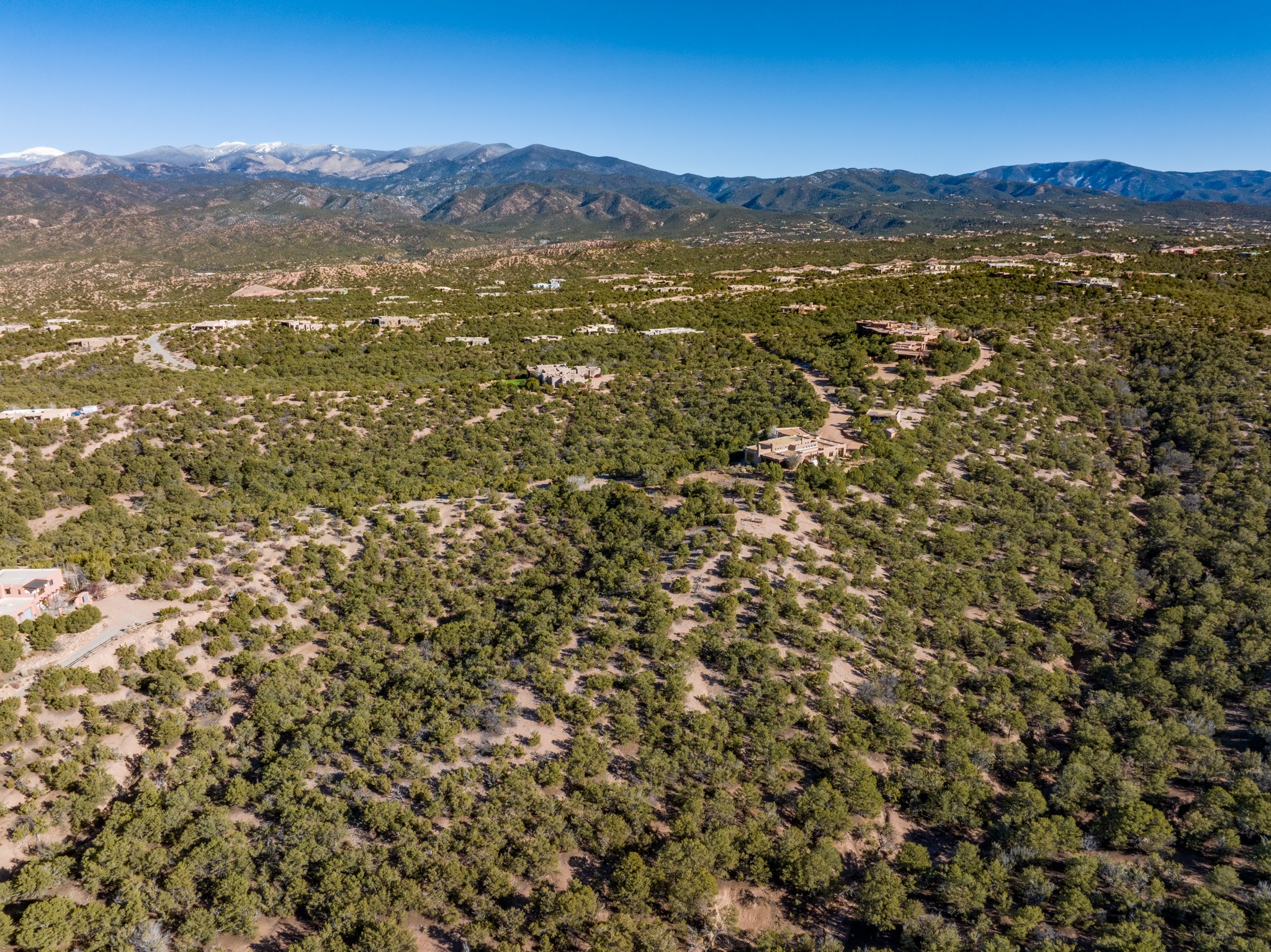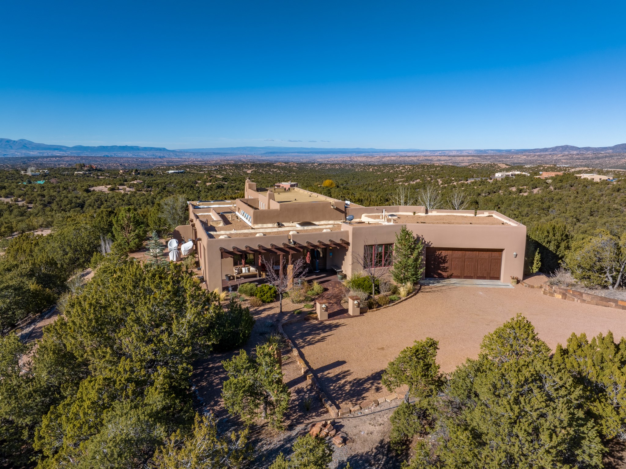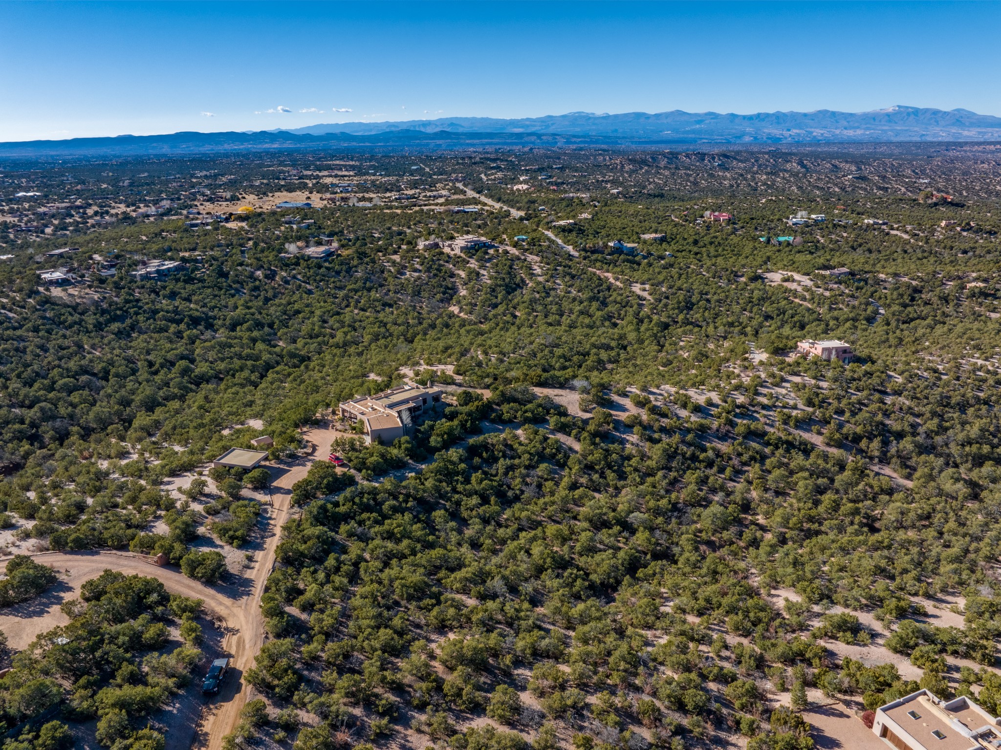 Extraordinary single-level home sited on 6.3 acres off Tano Road offers unobstructed views of the Barrancas, Sangres, and Jemez mountains. Perched on a knoll and at the end of a private drive, a short 8 minutes from the Plaza, this singular property features a main house of +/- 2850sqft with an attached oversize 2-car garage, a 2-car carport, and shed/workshop. Originally built in 1981, the Dave Gibbons design was masterfully renovated in 2011 by Sharon Woods to seamlessly marry Southwestern and soft- contemporary elements in a grand, light-filled, open-concept living space. The refined aesthetic showcases 14-foot high coved ceilings, diamond plaster walls, museum-quality lighting, and endless walls of windows, all grounded by brick floors, fireplaces, and solid custom cabinetry. The chef's kitchen features Wolf and SubZero appliances, stone countertops, and walk-in pantry. Taking a cue from its celestial name, the Polaris home offers deep portals facing each cardinal direction for uninterrupted views of the spectacular night sky, high desert terrain, and jaw-dropping vistas. Timeless architecture, enchanting views, manicured gardens, and a serene setting come together in a one-of-a-kind offering that will provide comfort and tranquility for years to come. This listing includes a separately deeded 3-acre lot (MLS 202341954). The home on 6.3 acres can be purchased as MLS 202341949.