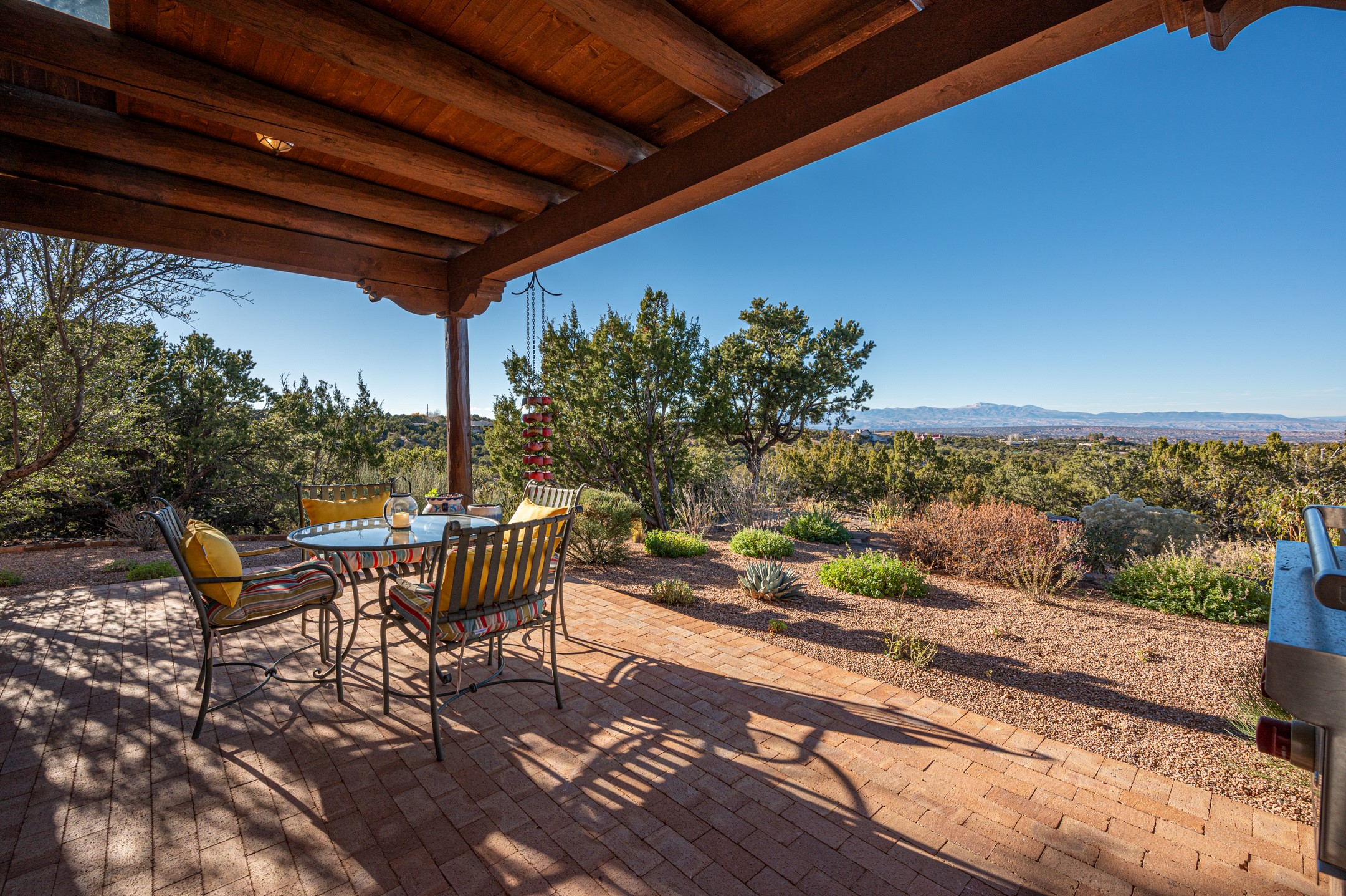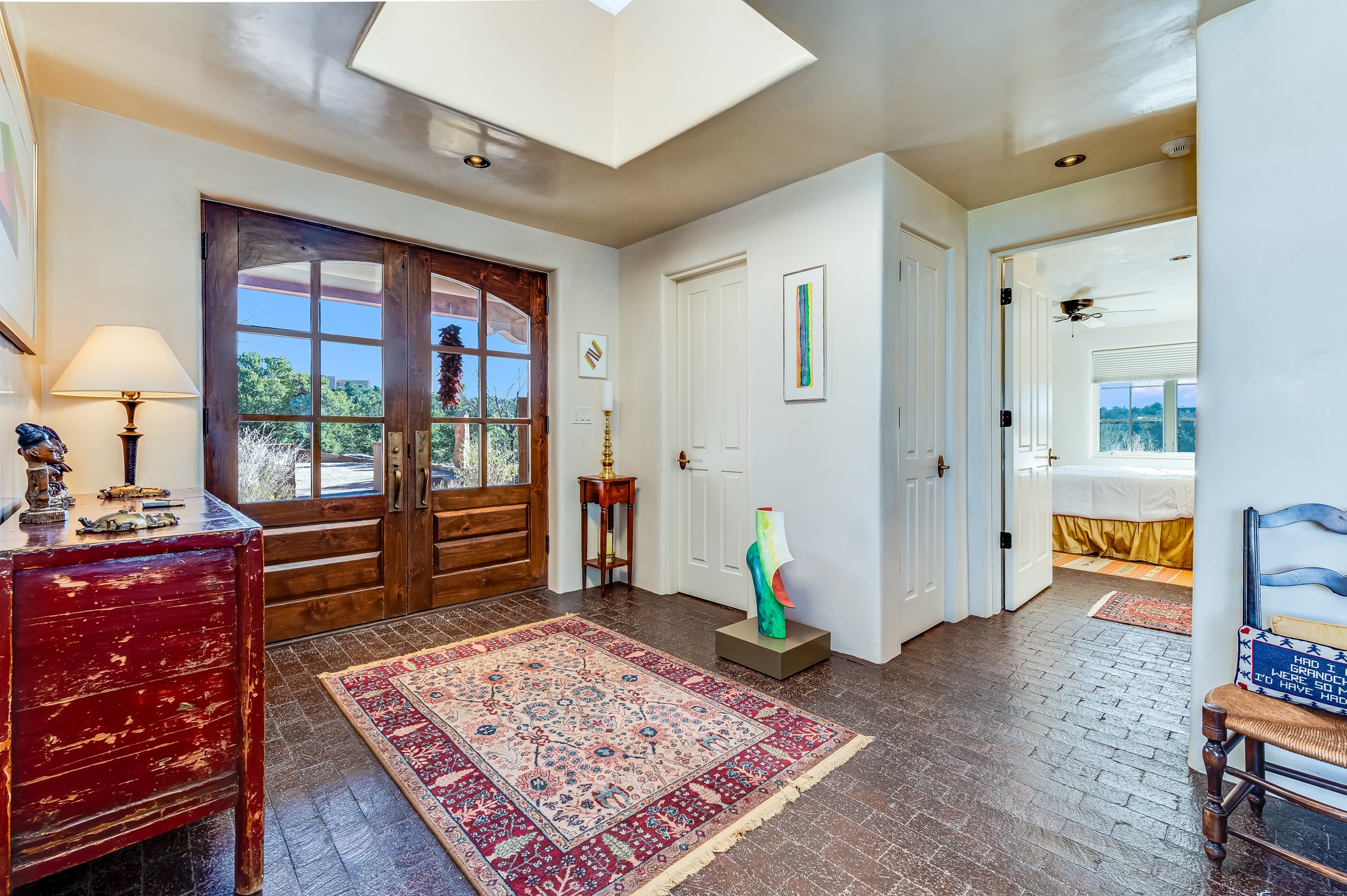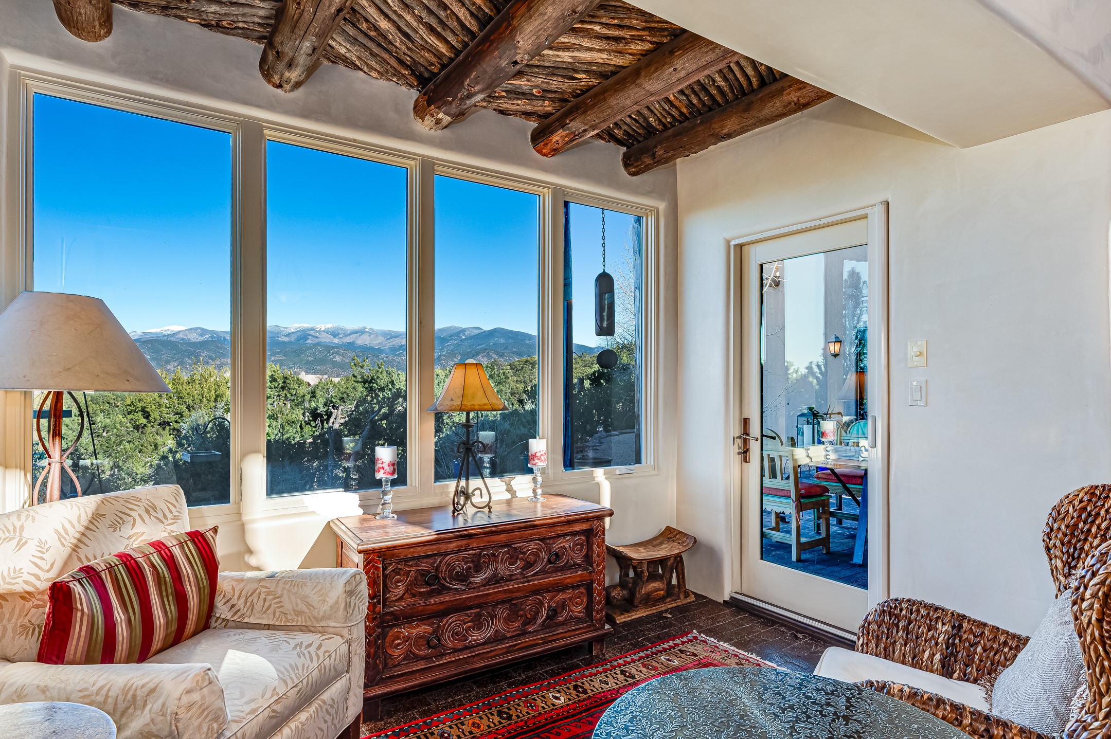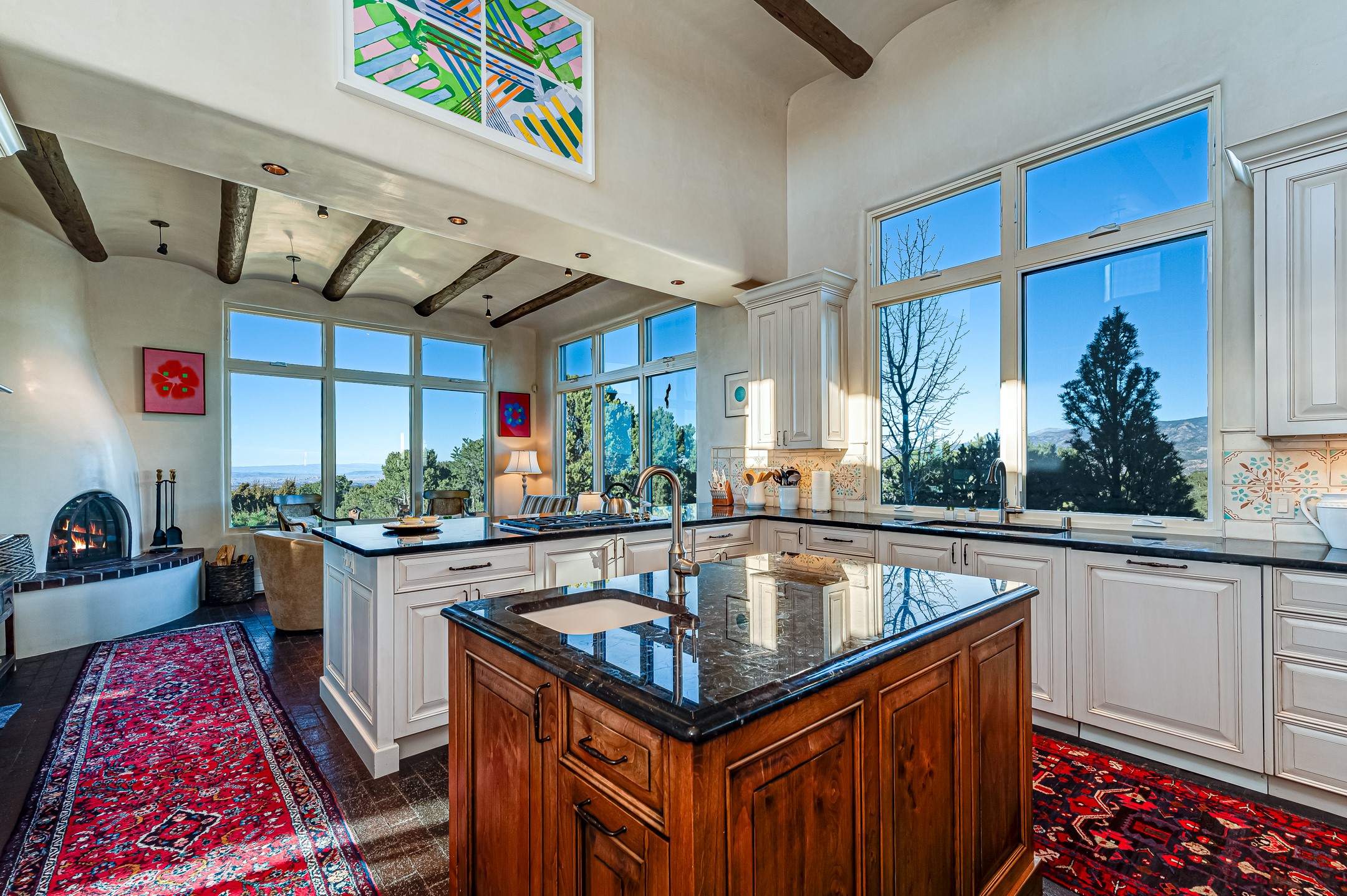 Extraordinary single-level home sited on 6.3 acres off Tano Road offers unobstructed views of the Barrancas, Sangres, and Jemez mountains. Perched on a knoll and at the end of a private drive, a short 8 minutes from the Plaza, this singular property features a main house of +/- 2850sqft with an attached oversize 2-car garage, a 2-car carport, and shed/workshop. Originally built in 1981, the Dave Gibbons design was masterfully renovated in 2011 by Sharon Woods to seamlessly marry Southwestern and soft- contemporary elements in a grand, light-filled, open-concept living space. The refined aesthetic showcases 14-foot high coved ceilings, diamond plaster walls, museum-quality lighting, and endless walls of windows, all grounded by brick floors, fireplaces, and solid custom cabinetry. The chef's kitchen features Wolf and SubZero appliances, stone countertops, and walk-in pantry. Taking a cue from its celestial name, the Polaris home offers deep portals facing each cardinal direction for uninterrupted views of the spectacular night sky, high desert terrain, and jaw-dropping vistas. Timeless architecture, enchanting views, manicured gardens, and a serene setting come together in a one-of-a-kind offering that will provide comfort and tranquility for years to come. This listing includes a separately deeded 3-acre lot (MLS 202341954). The home on 6.3 acres can be purchased as MLS 202341949.