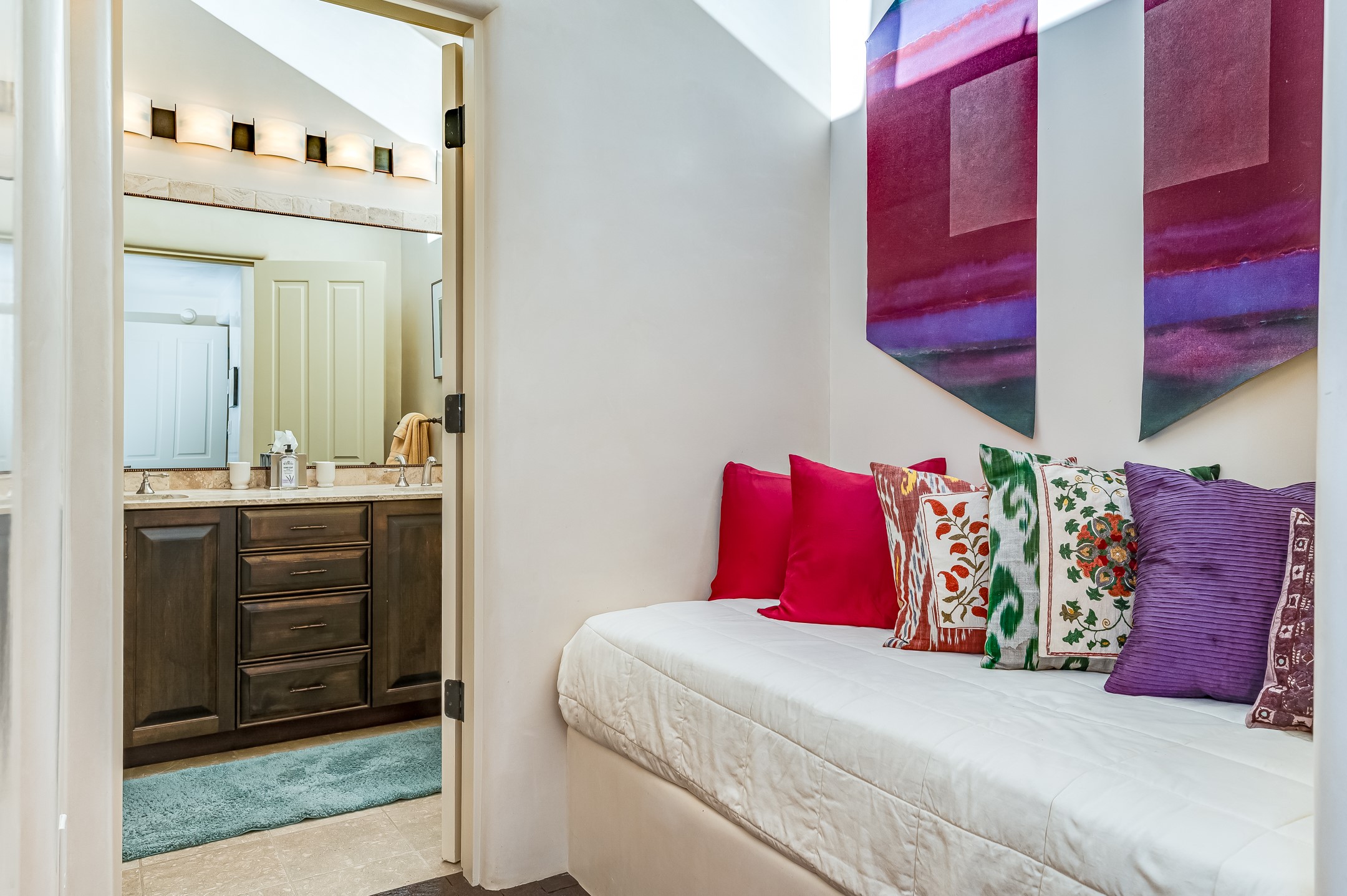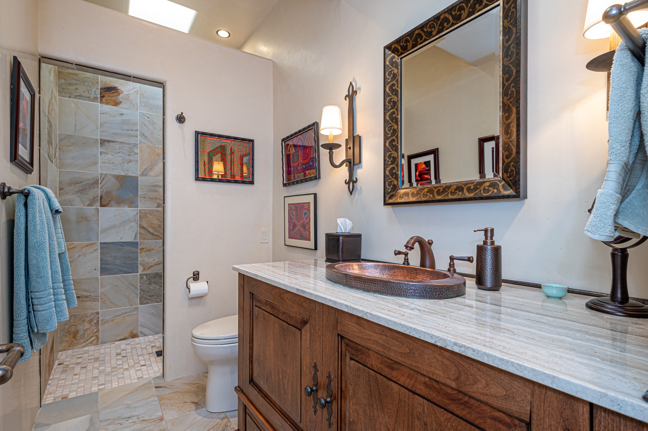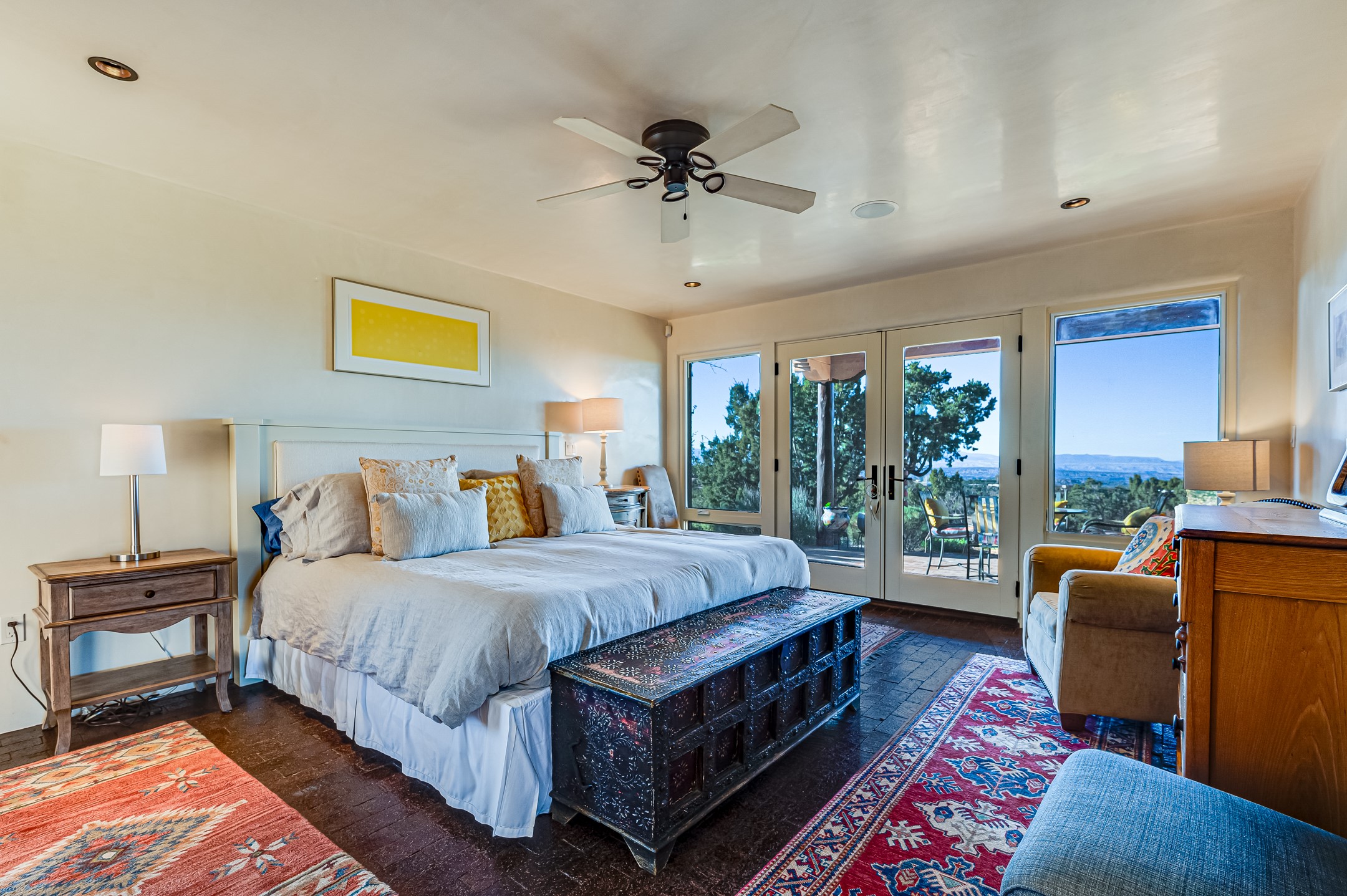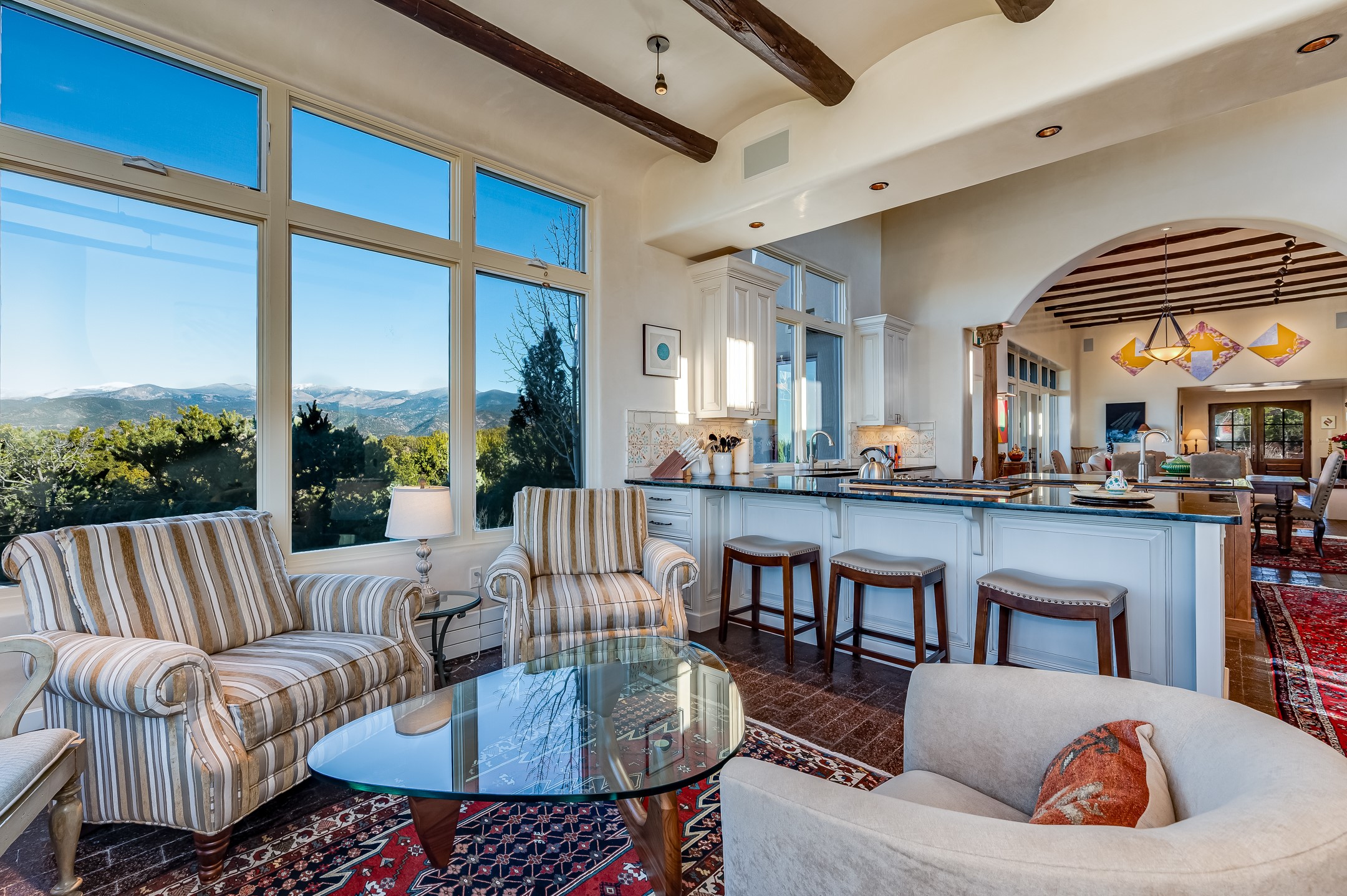 Extraordinary single-level home sited on 6.3 acres off Tano Road offers unobstructed views of the Barrancas, Sangres, and Jemez mountains. Perched on a knoll and at the end of a private drive, a short 8 minutes from the Plaza, this singular property features a main house of +/- 2850sqft with an attached oversize 2-car garage, a 2-car carport, and shed/workshop. Originally built in 1981, the Dave Gibbons design was masterfully renovated in 2011 by Sharon Woods to seamlessly marry Southwestern and soft- contemporary elements in a grand, light-filled, open-concept living space. The refined aesthetic showcases 14-foot high coved ceilings, diamond plaster walls, museum-quality lighting, and endless walls of windows, all grounded by brick floors, fireplaces, and solid custom cabinetry. The chef's kitchen features Wolf and SubZero appliances, stone countertops, and walk-in pantry. Taking a cue from its celestial name, the Polaris home offers deep portals facing each cardinal direction for uninterrupted views of the spectacular night sky, high desert terrain, and jaw-dropping vistas. Timeless architecture, enchanting views, manicured gardens, and a serene setting come together in a one-of-a-kind offering that will provide comfort and tranquility for years to come. This listing includes a separately deeded 3-acre lot (MLS 202341954). The home on 6.3 acres can be purchased as MLS 202341949.