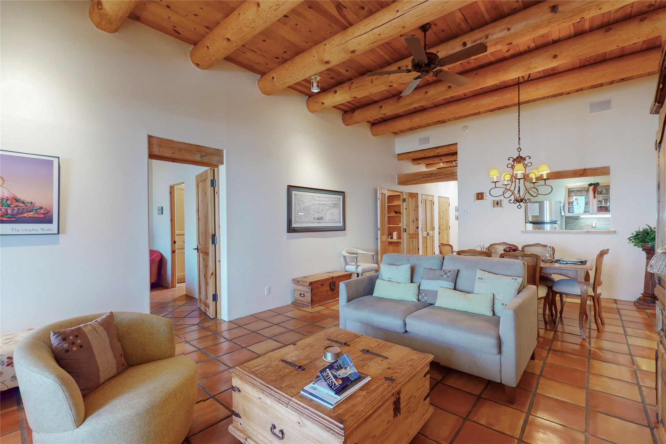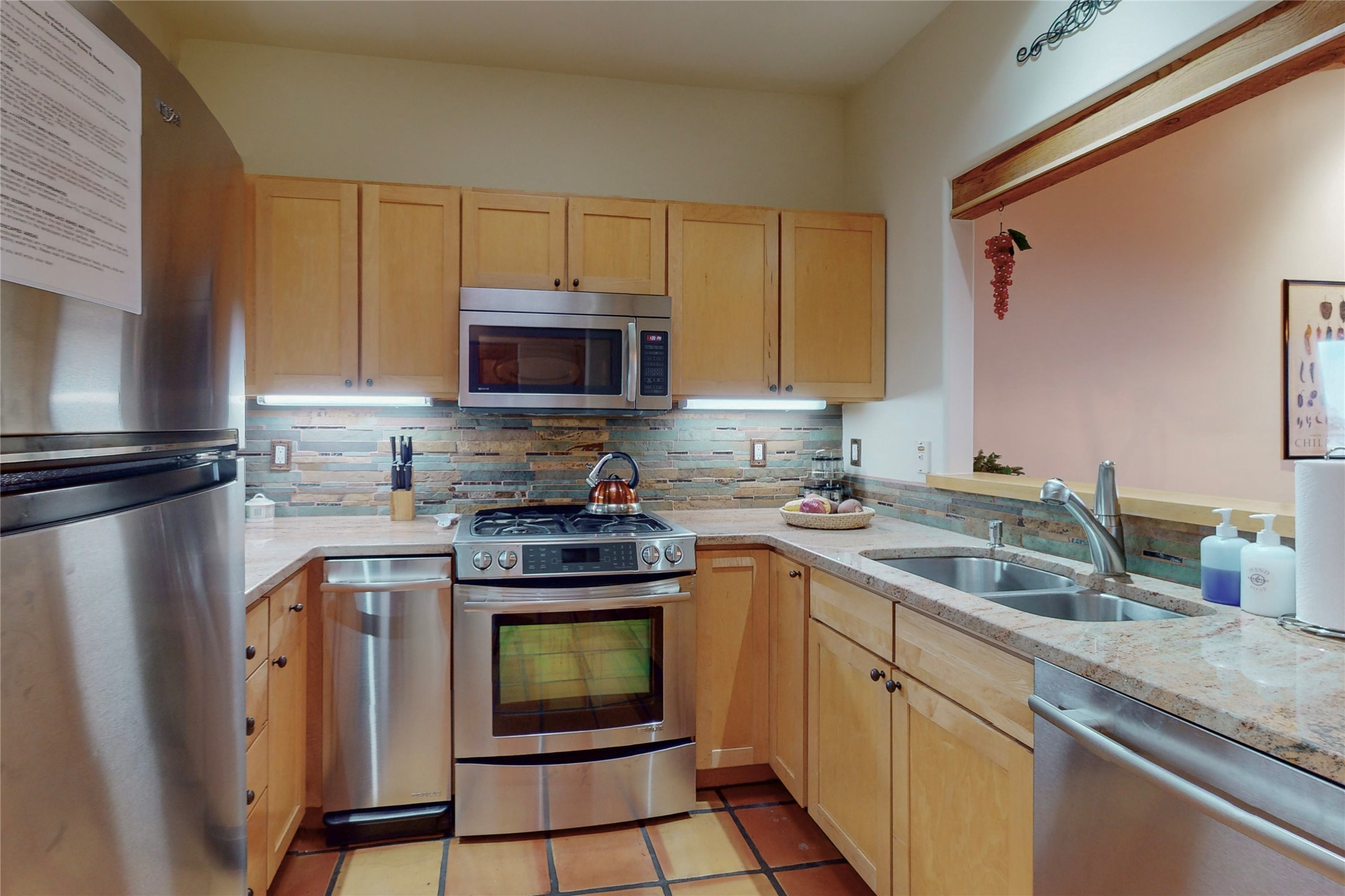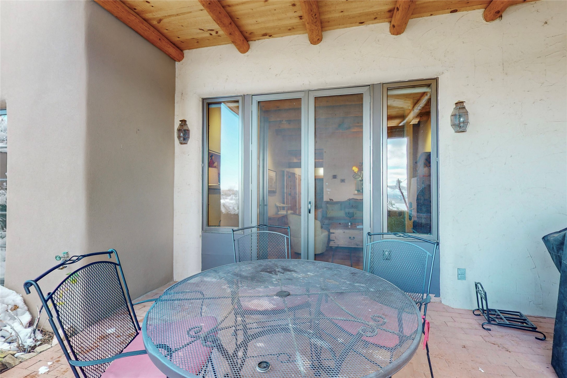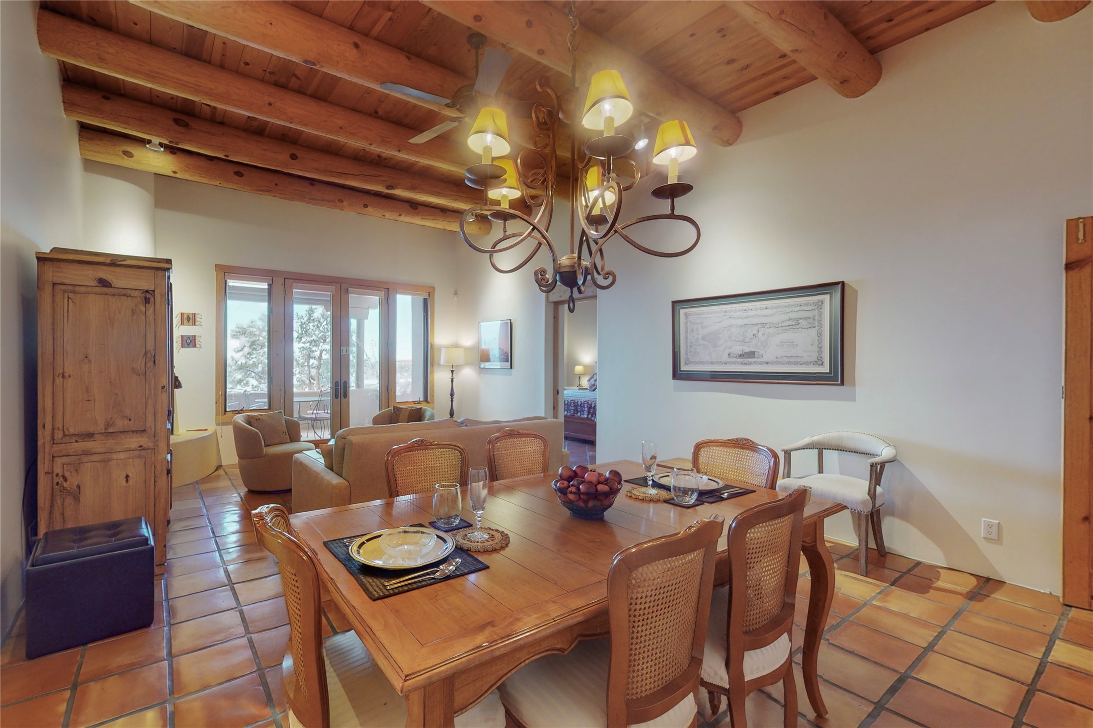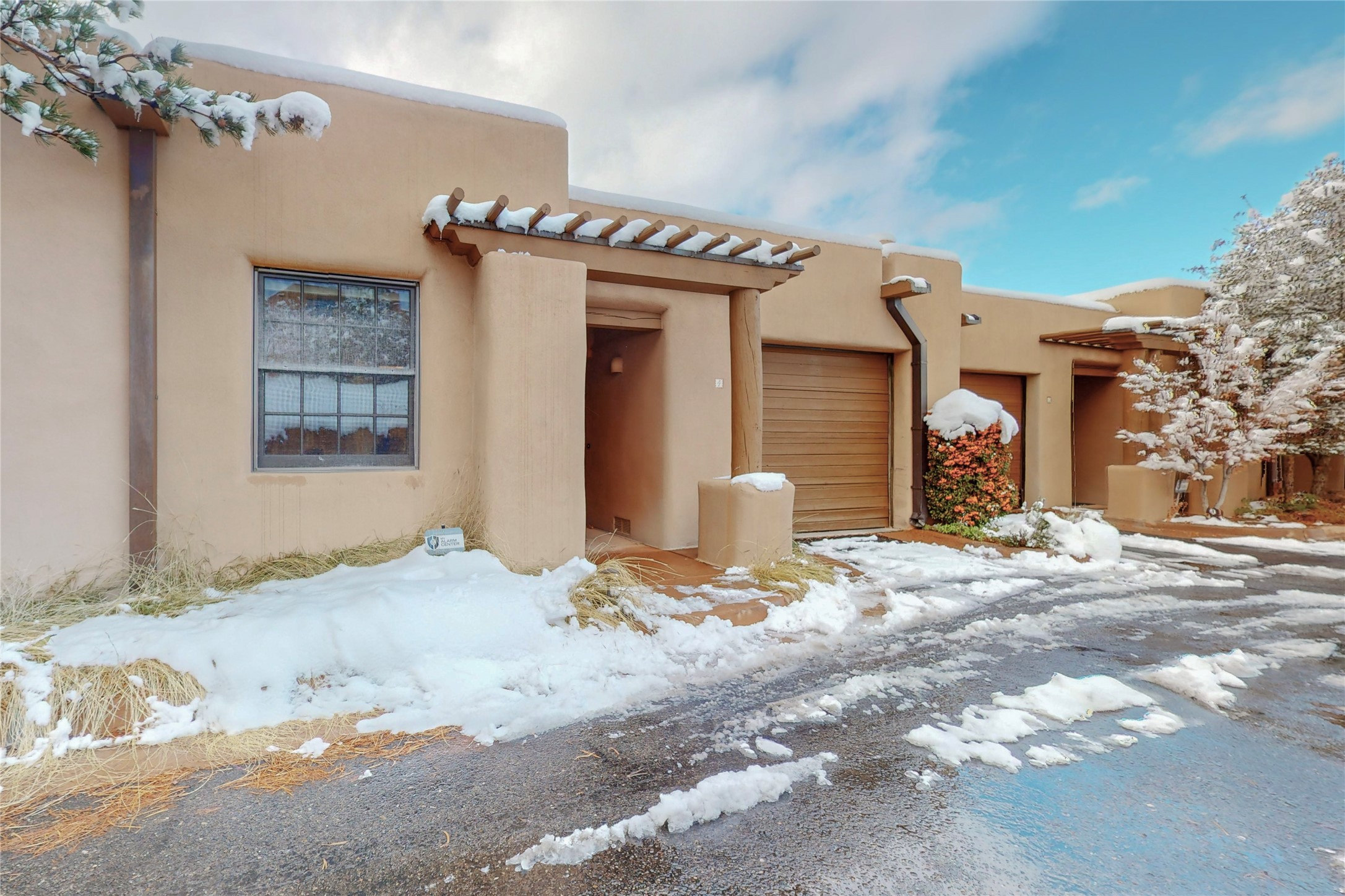 A very rare and exquisite Philip Combs design in the highly desirable Portales Vistas condominium compound. ONE LEVEL condominium floorplan that is just a few minutes to the Plaza and Canyon Road amenities. Easy drive to ski areas, opera and dining attractions. Dazzling sunset views of the Jemez Mountain Range by day and sparkling Santa Fe and Los Alamos city lights by night are absolutely incredible. 2 bedrooms, 2 baths plus a separate office with built-in desk and cabinets. 2 cozy charming Kiva fireplaces, beautiful Saltillo tile floors, high ceilings, gorgeous kitchen with granite counters and stainless appliances! The attached direct entry garage is a wonderful convenience-just drive in and park out of the weather. One additional outside parking space at the unit. Very well-maintained roof, stucco, and driveways. This condo is excellent for full or part time living. Short term rental history and professionally managed for current owner. Meticulously maintained. Seller offers all furnishing and provisions for separate purchase! This is as effortlessly turn-key as you could wish. Come see and you will want to move in!