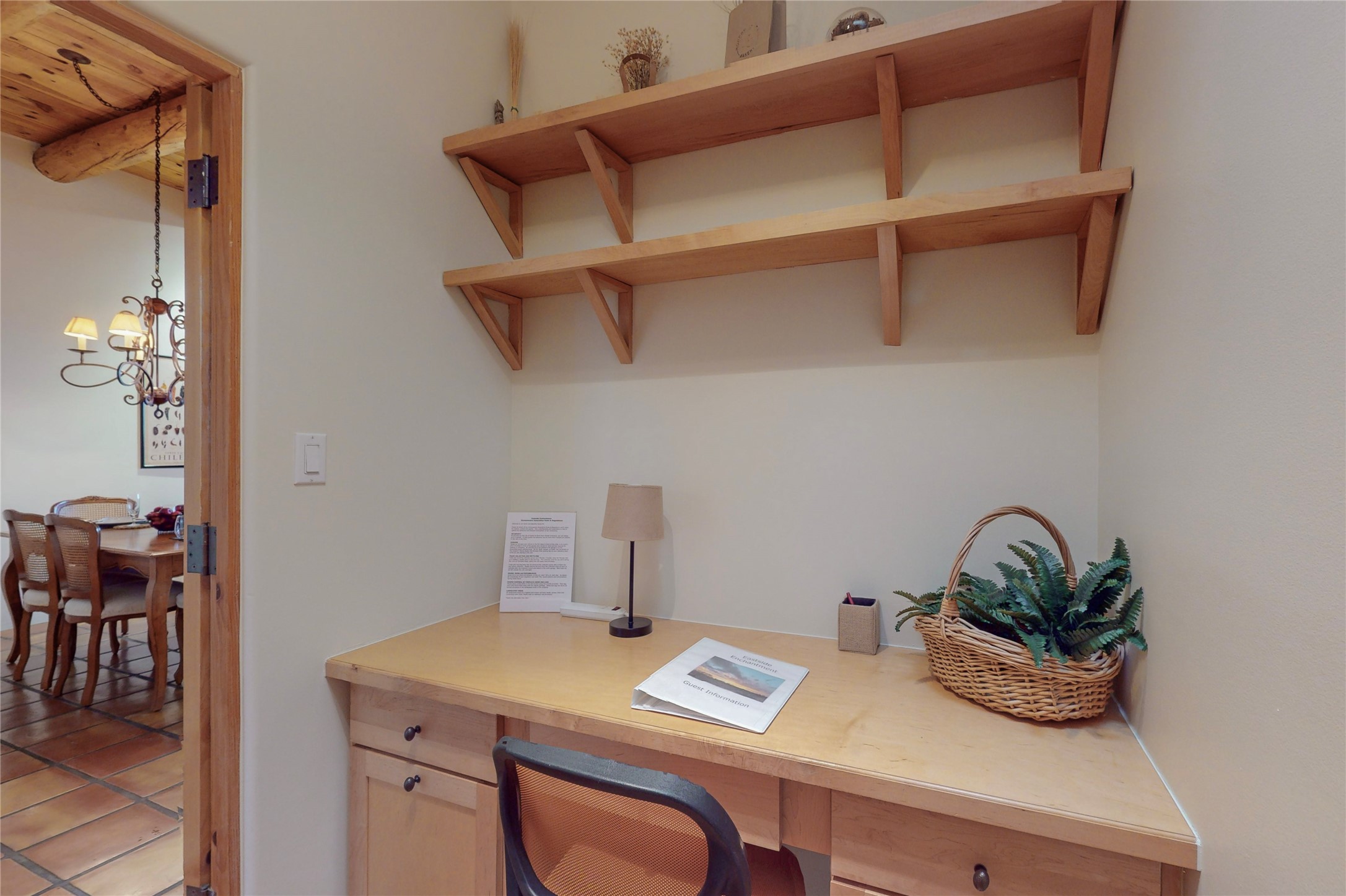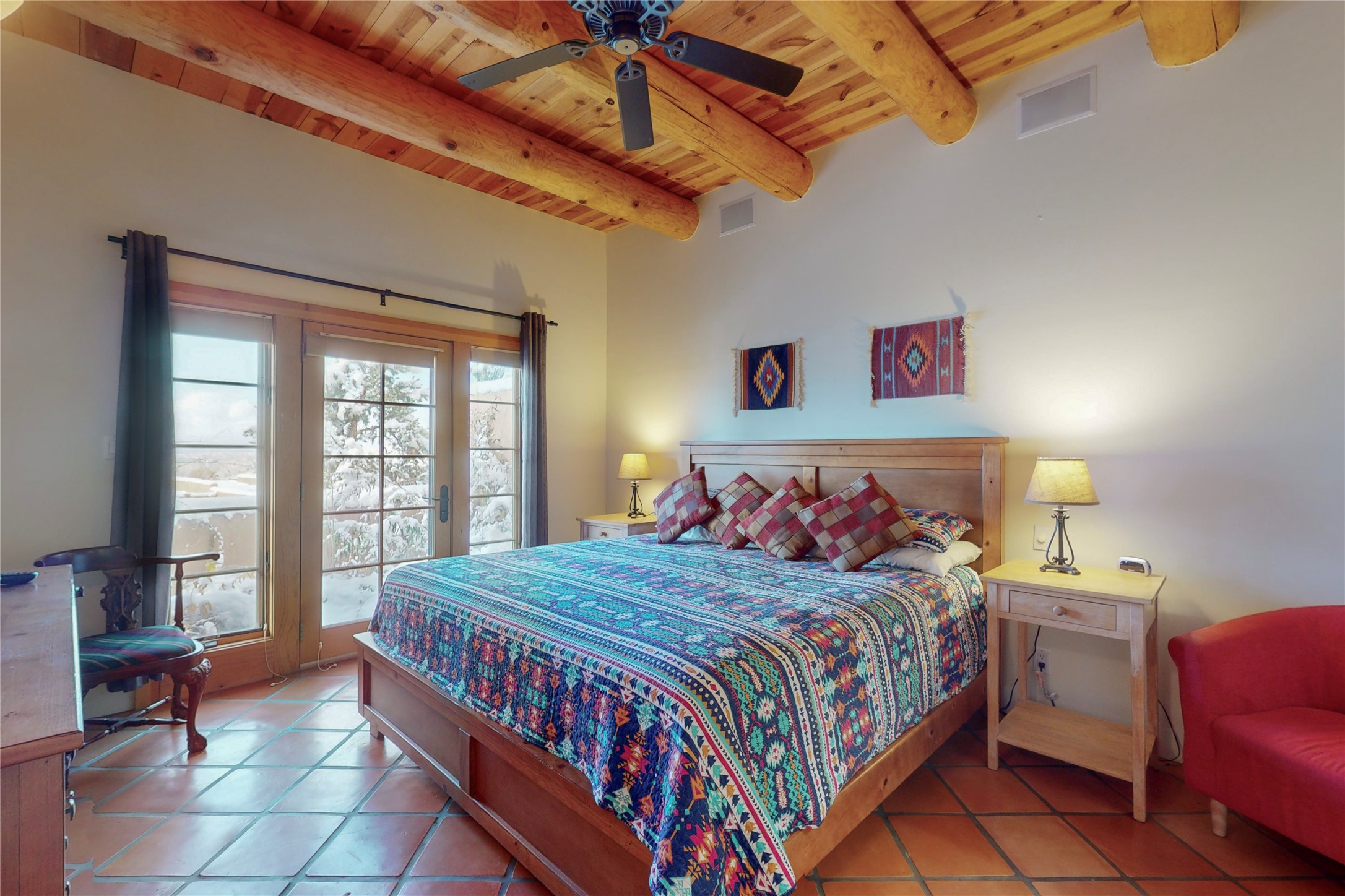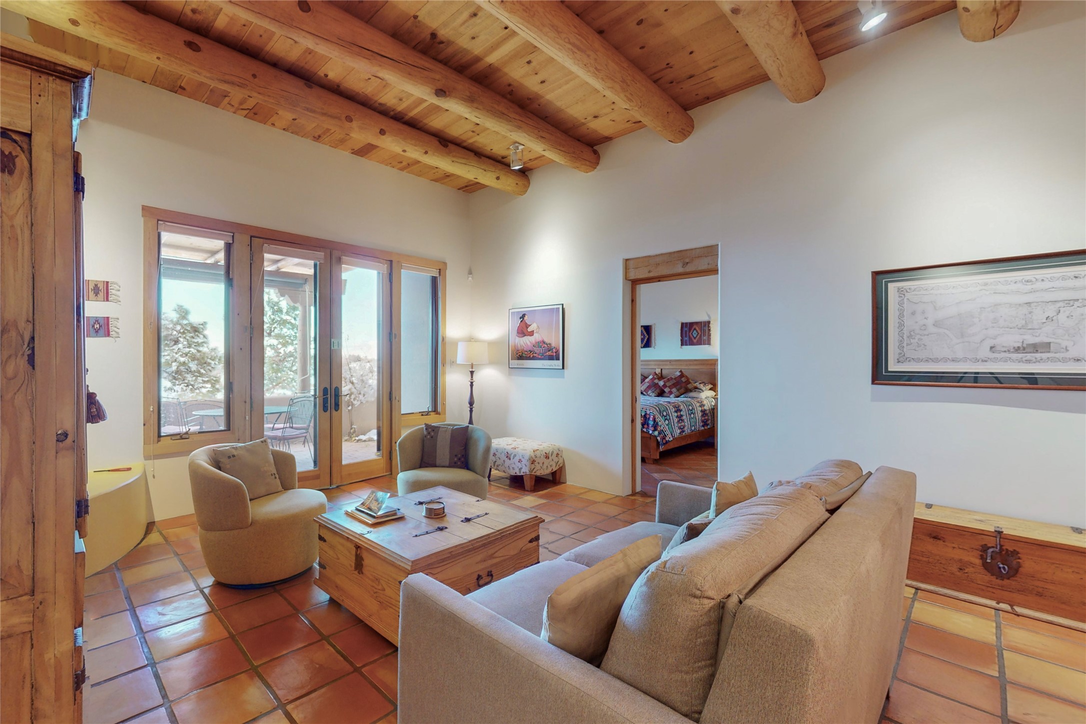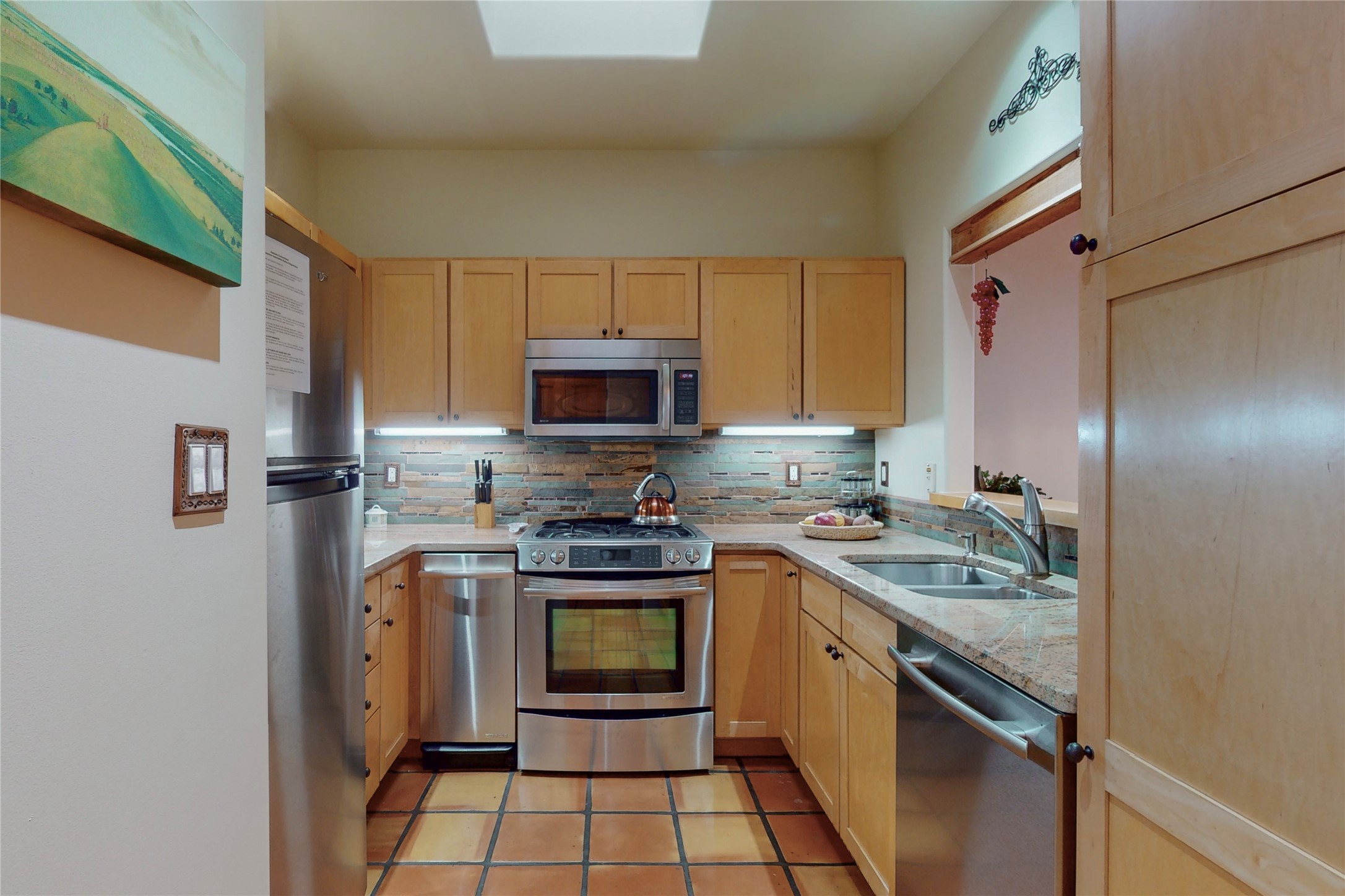A very rare and exquisite Philip Combs design in the highly desirable Portales Vistas condominium compound. ONE LEVEL condominium floorplan that is just a few minutes to the Plaza and Canyon Road amenities. Easy drive to ski areas, opera and dining attractions. Dazzling sunset views of the Jemez Mountain Range by day and sparkling Santa Fe and Los Alamos city lights by night are absolutely incredible. 2 bedrooms, 2 baths plus a separate office with built-in desk and cabinets. 2 cozy charming Kiva fireplaces, beautiful Saltillo tile floors, high ceilings, gorgeous kitchen with granite counters and stainless appliances! The attached direct entry garage is a wonderful convenience-just drive in and park out of the weather. One additional outside parking space at the unit. Very well-maintained roof, stucco, and driveways. This condo is excellent for full or part time living. Short term rental history and professionally managed for current owner. Meticulously maintained. Seller offers all furnishing and provisions for separate purchase! This is as effortlessly turn-key as you could wish. Come see and you will want to move in!