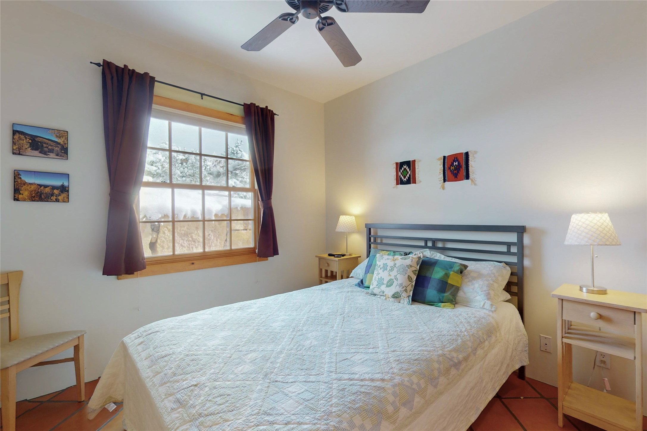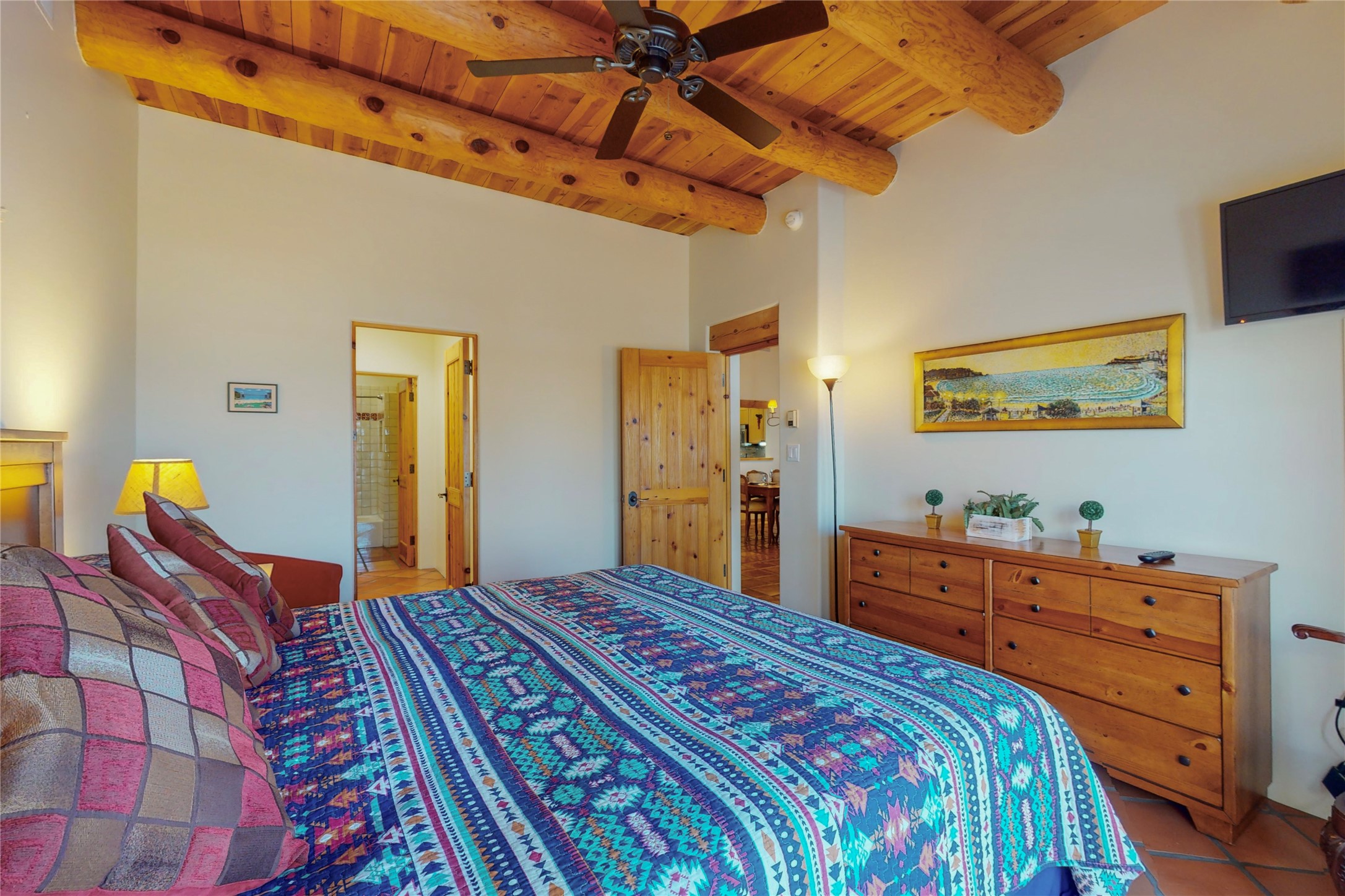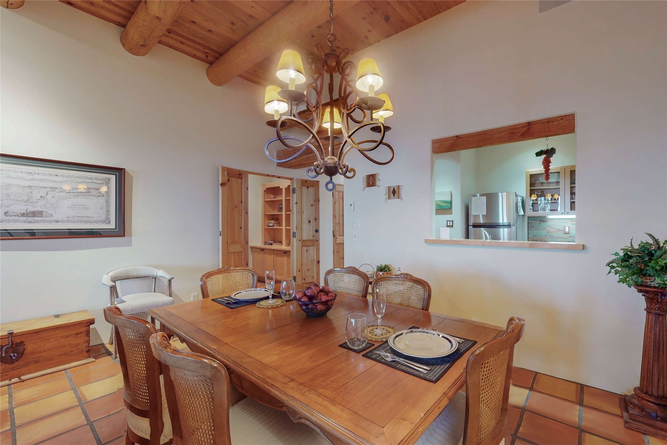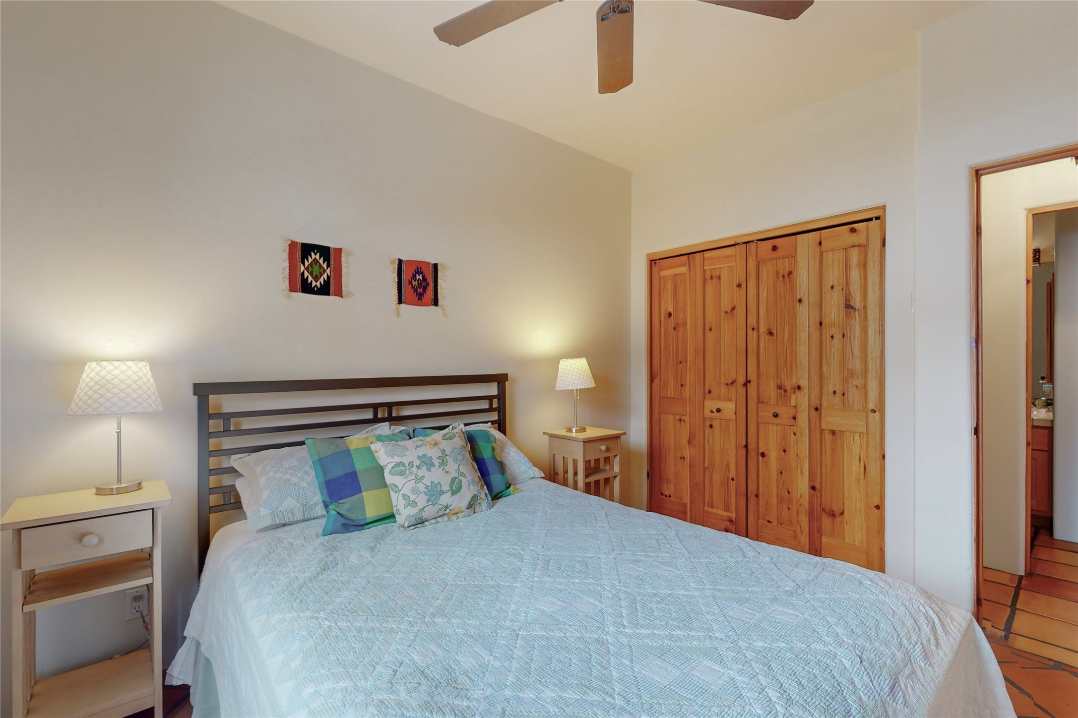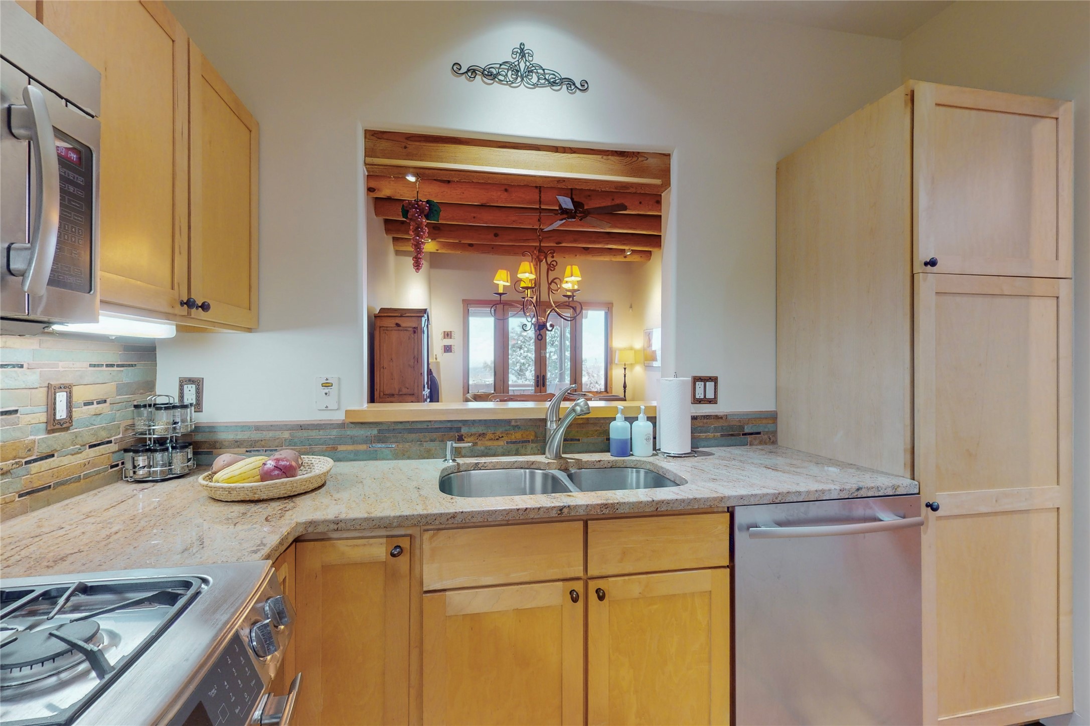 A very rare and exquisite Philip Combs design in the highly desirable Portales Vistas condominium compound. ONE LEVEL condominium floorplan that is just a few minutes to the Plaza and Canyon Road amenities. Easy drive to ski areas, opera and dining attractions. Dazzling sunset views of the Jemez Mountain Range by day and sparkling Santa Fe and Los Alamos city lights by night are absolutely incredible. 2 bedrooms, 2 baths plus a separate office with built-in desk and cabinets. 2 cozy charming Kiva fireplaces, beautiful Saltillo tile floors, high ceilings, gorgeous kitchen with granite counters and stainless appliances! The attached direct entry garage is a wonderful convenience-just drive in and park out of the weather. One additional outside parking space at the unit. Very well-maintained roof, stucco, and driveways. This condo is excellent for full or part time living. Short term rental history and professionally managed for current owner. Meticulously maintained. Seller offers all furnishing and provisions for separate purchase! This is as effortlessly turn-key as you could wish. Come see and you will want to move in!