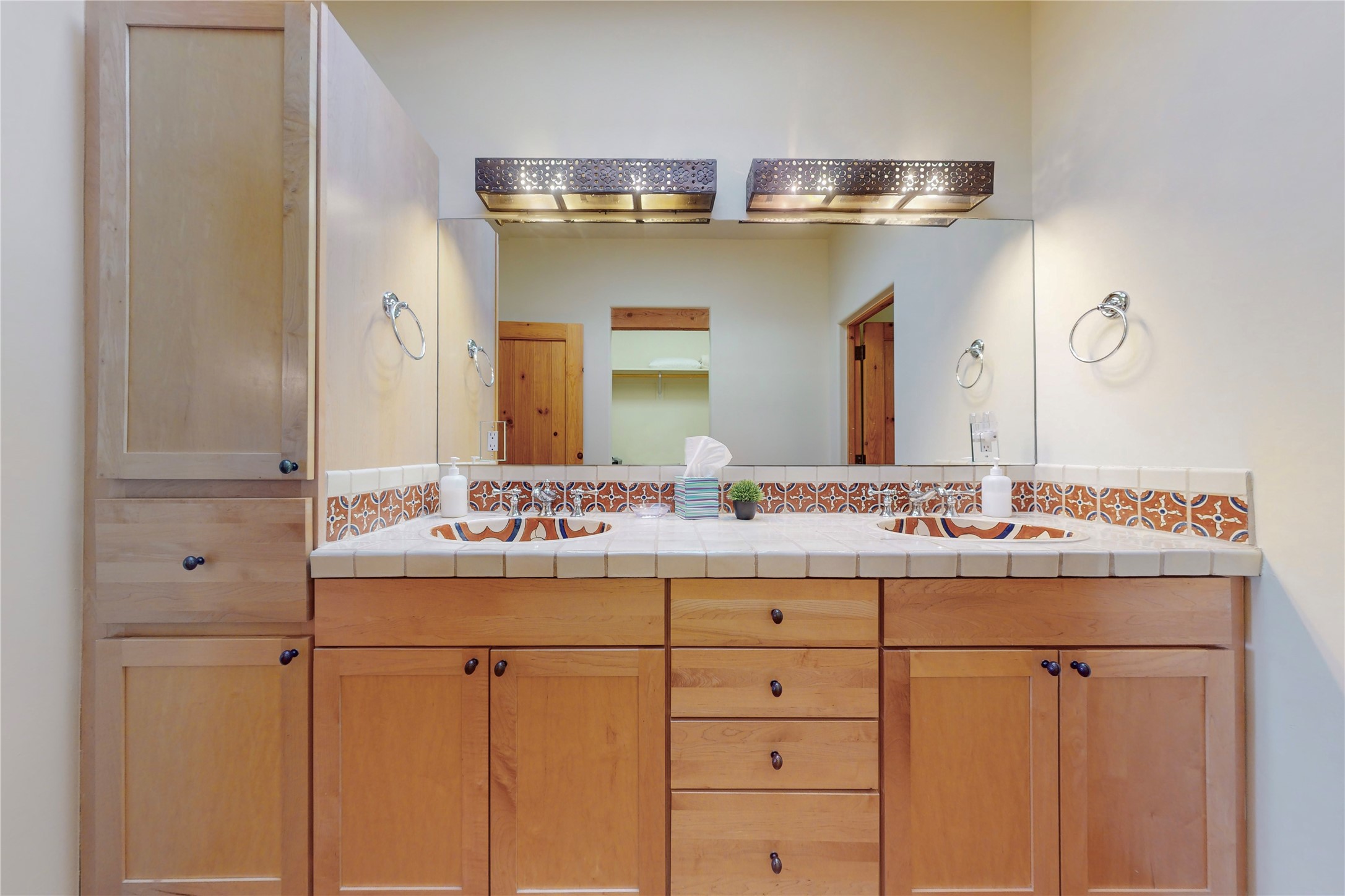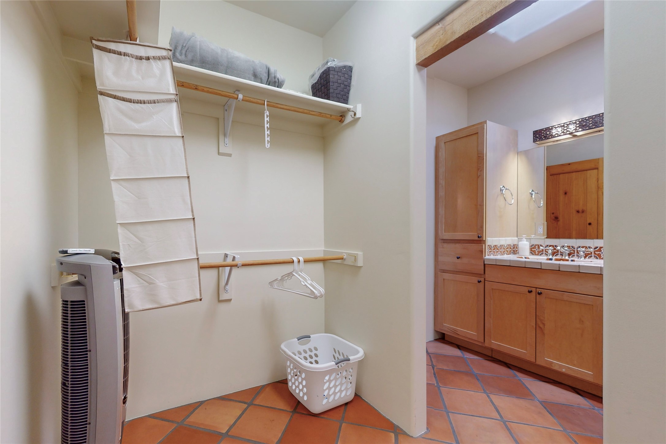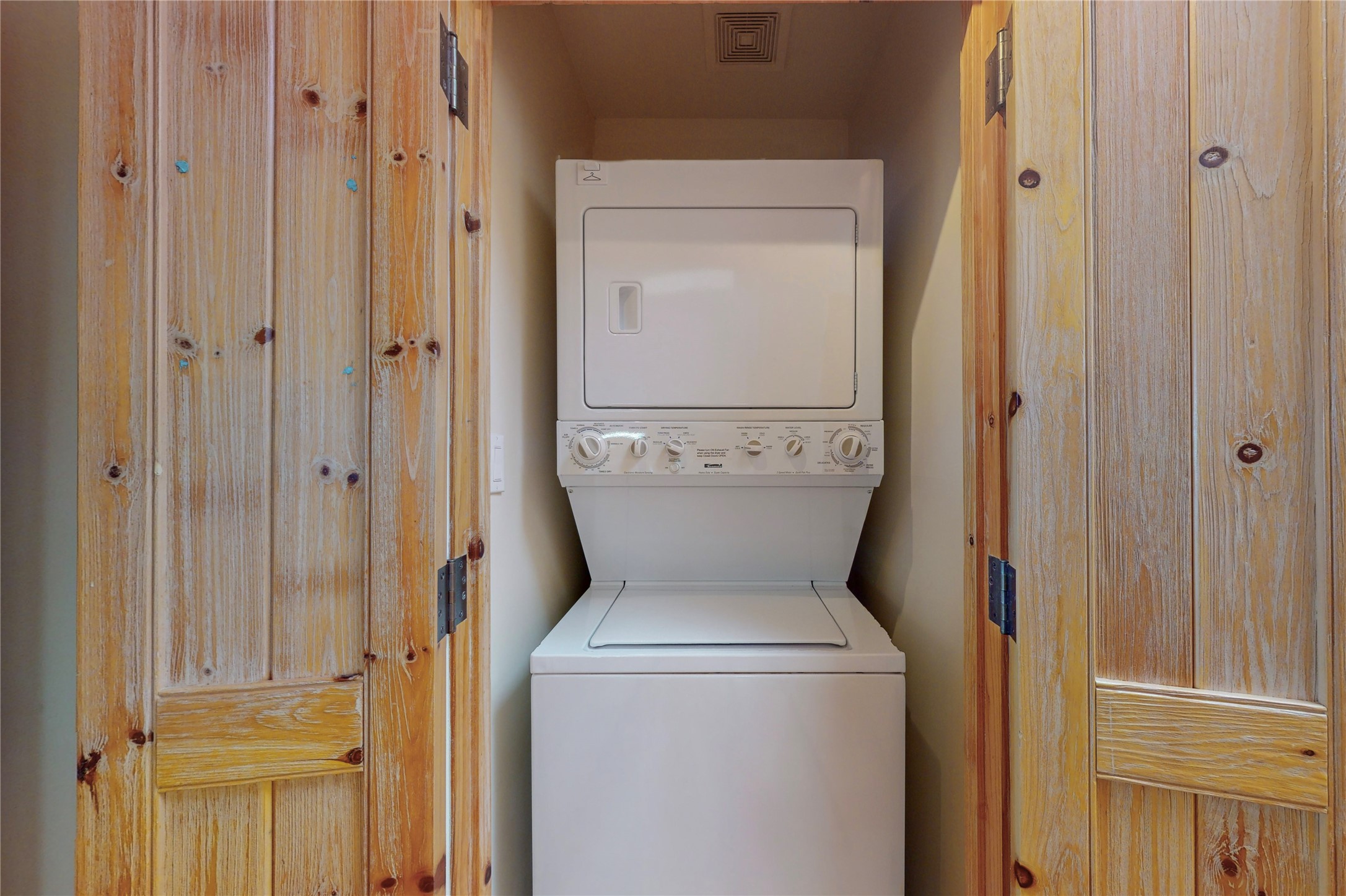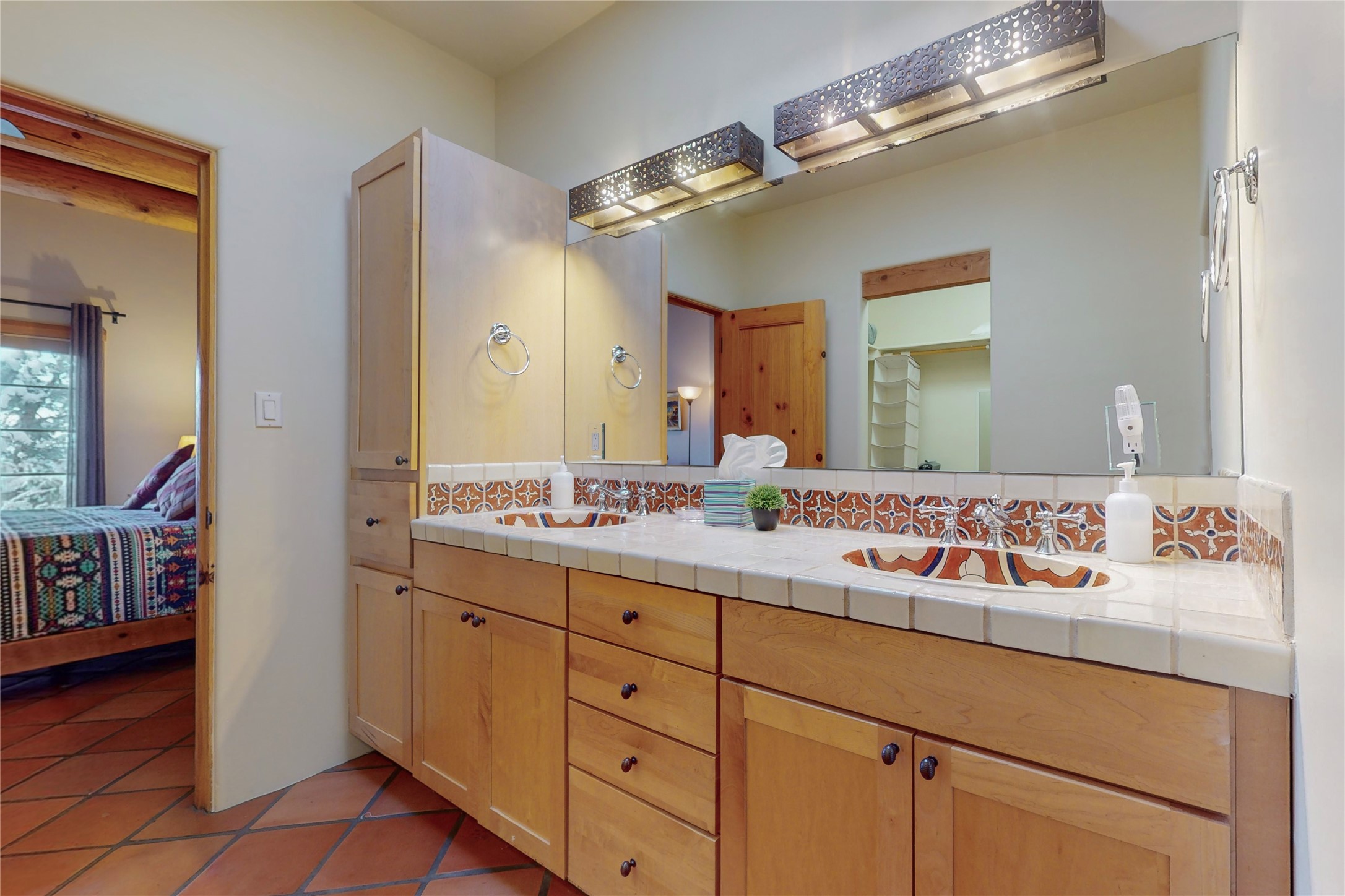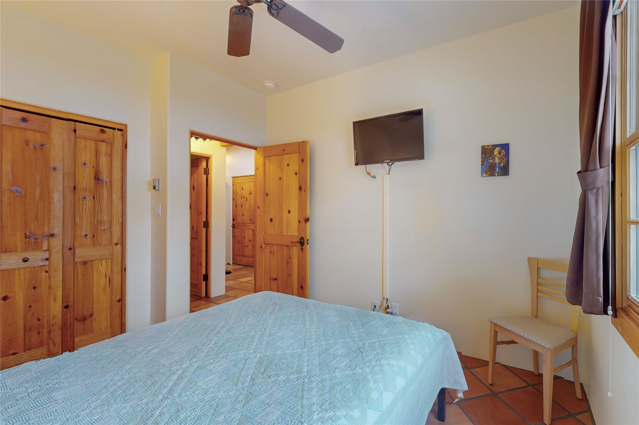 A very rare and exquisite Philip Combs design in the highly desirable Portales Vistas condominium compound. ONE LEVEL condominium floorplan that is just a few minutes to the Plaza and Canyon Road amenities. Easy drive to ski areas, opera and dining attractions. Dazzling sunset views of the Jemez Mountain Range by day and sparkling Santa Fe and Los Alamos city lights by night are absolutely incredible. 2 bedrooms, 2 baths plus a separate office with built-in desk and cabinets. 2 cozy charming Kiva fireplaces, beautiful Saltillo tile floors, high ceilings, gorgeous kitchen with granite counters and stainless appliances! The attached direct entry garage is a wonderful convenience-just drive in and park out of the weather. One additional outside parking space at the unit. Very well-maintained roof, stucco, and driveways. This condo is excellent for full or part time living. Short term rental history and professionally managed for current owner. Meticulously maintained. Seller offers all furnishing and provisions for separate purchase! This is as effortlessly turn-key as you could wish. Come see and you will want to move in!