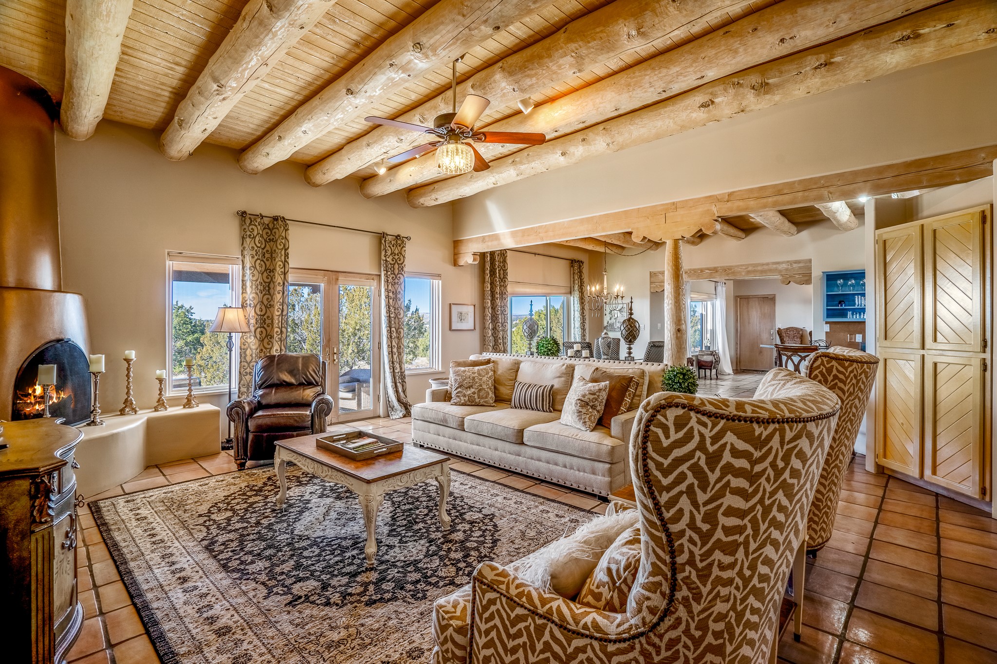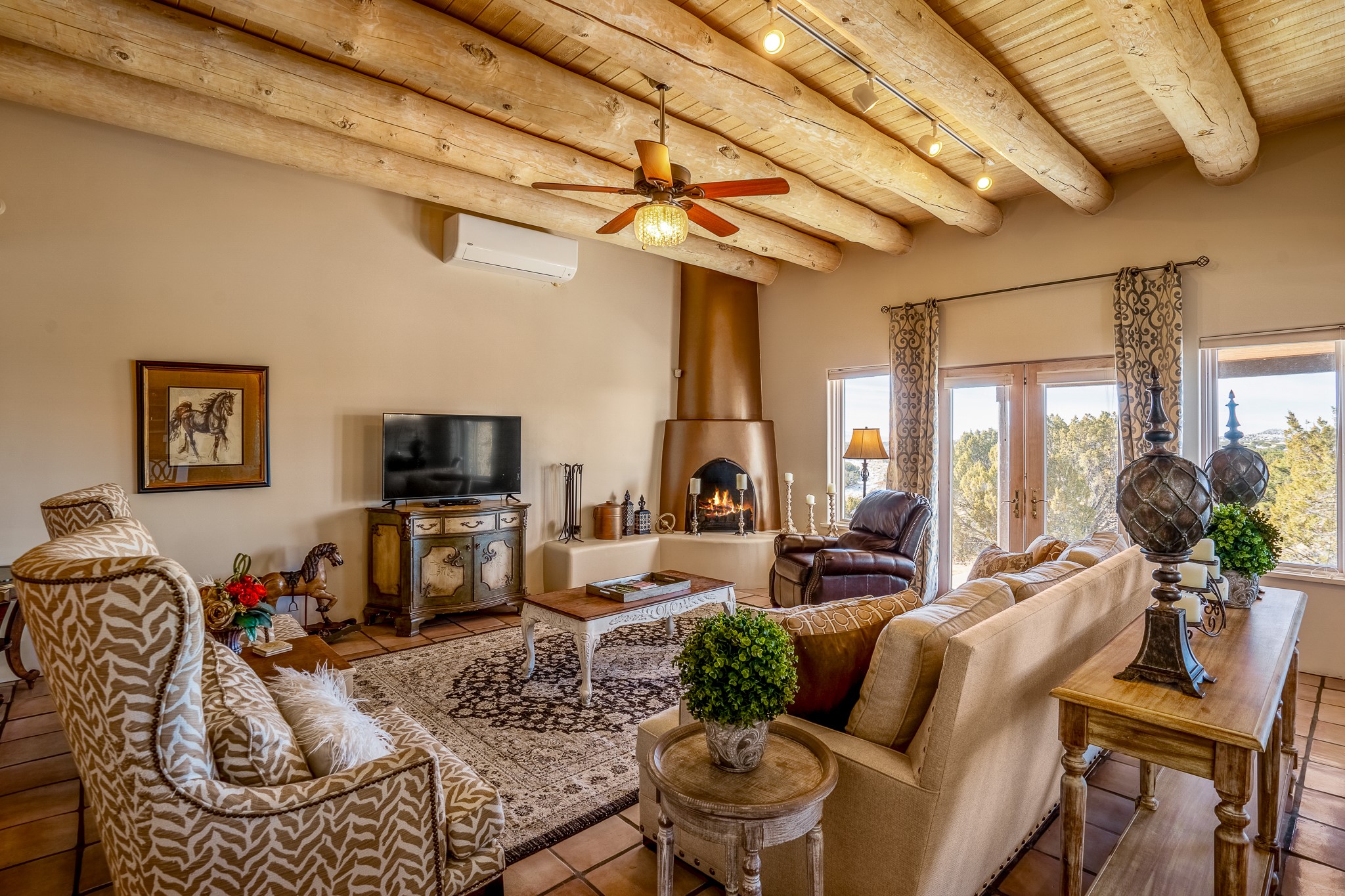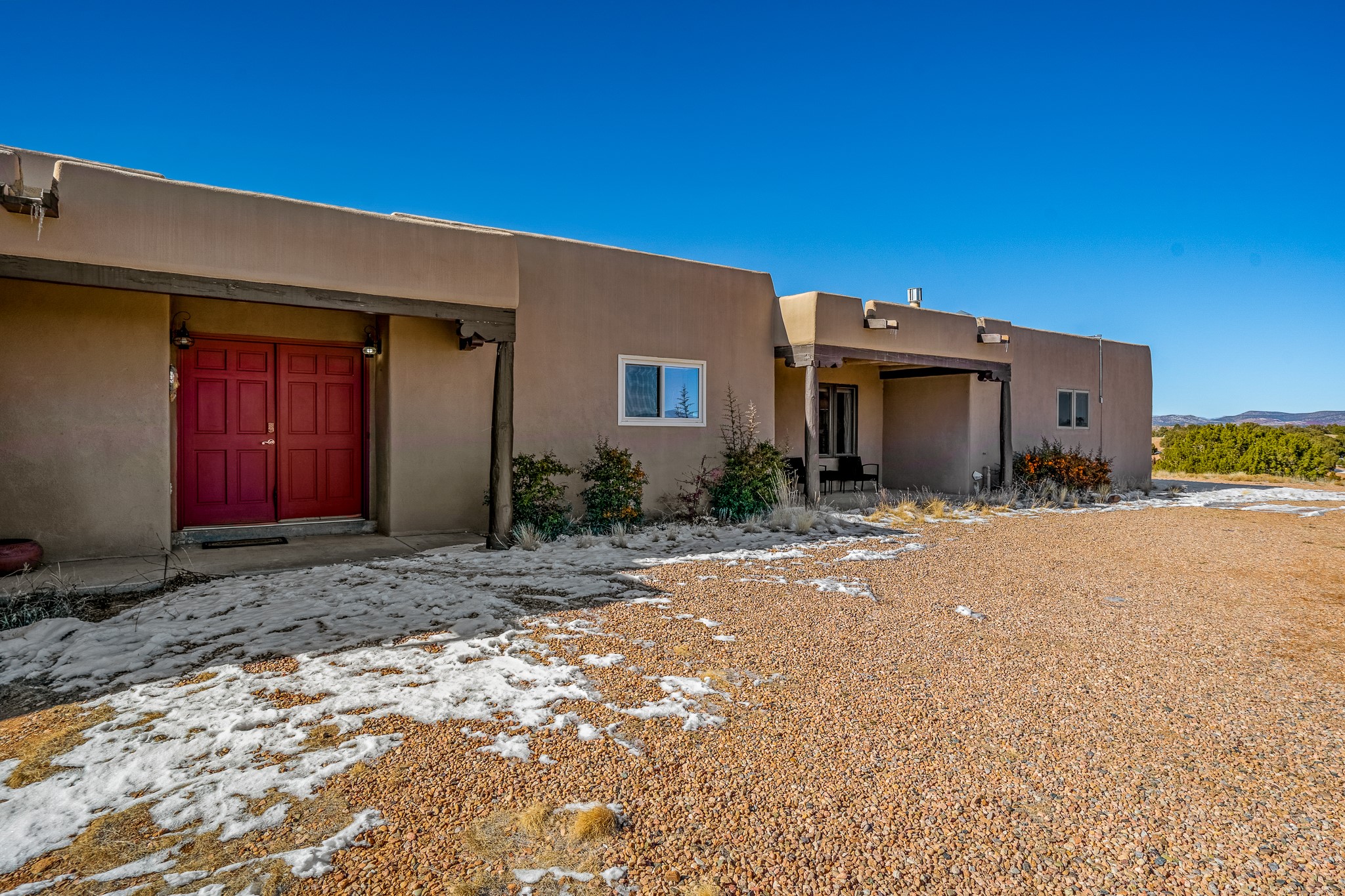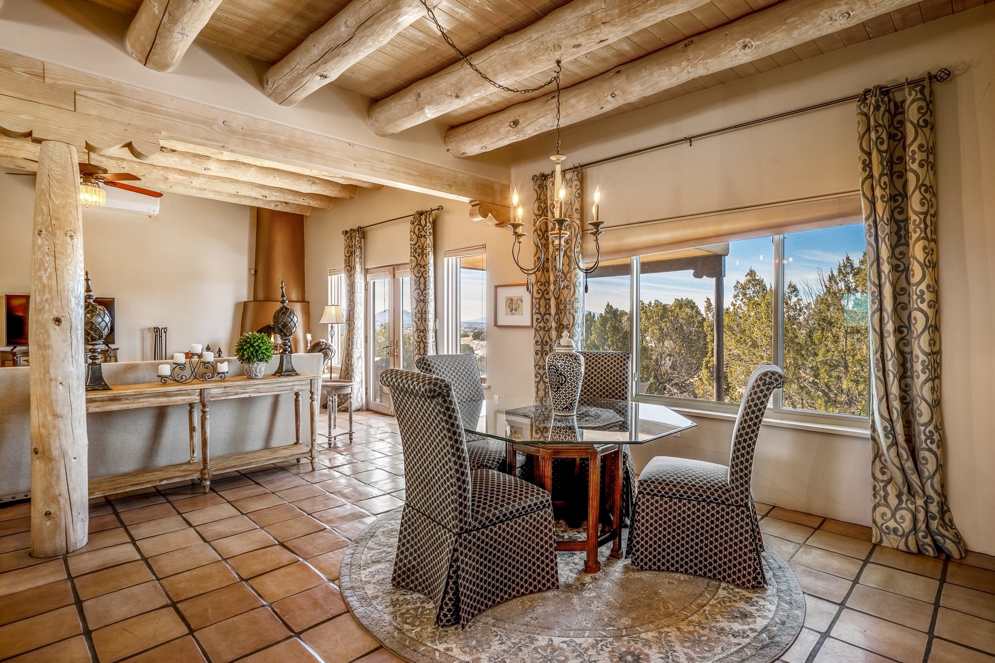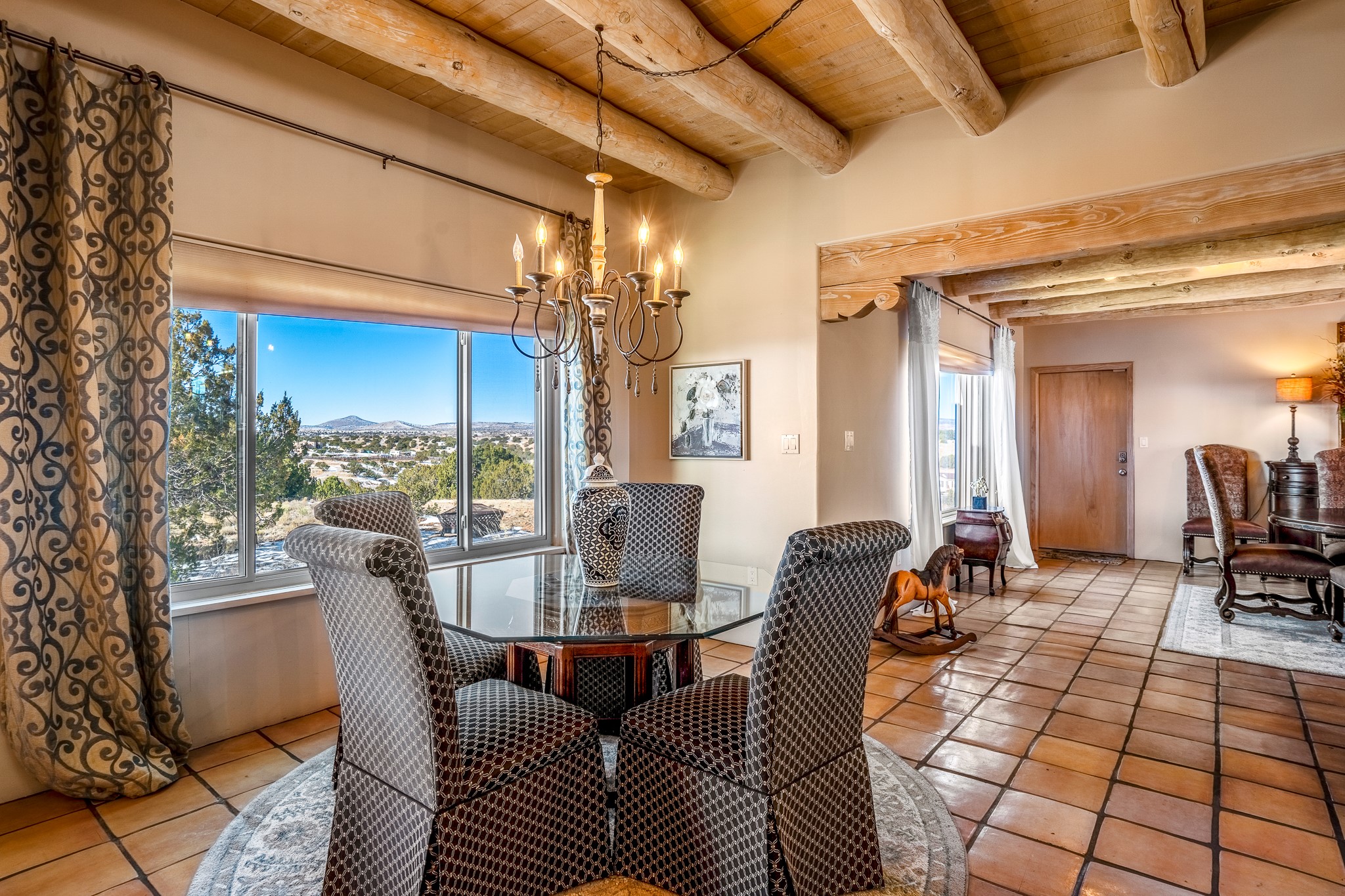 You will adore the breathtaking mountain vistas from here. Situated atop a ridge in thepicturesque La Cienega district. Imagine owning 5.74 acres of land where your neighbors leaveample space and there is no HOA. This exquisite residence features two bathrooms, threebedrooms, and a two-cargarage. The primary bedroom's expansive deckoffers a breathtakingview of the mountains. There is a second patio located off the living room, that also featuresbeautiful mountain views. The residence features an open floor plan and is constructed in thetraditional Santa Fe style, featuring vigas, two kiva fireplaces, andSaltillotile flooring in itsentirety.
