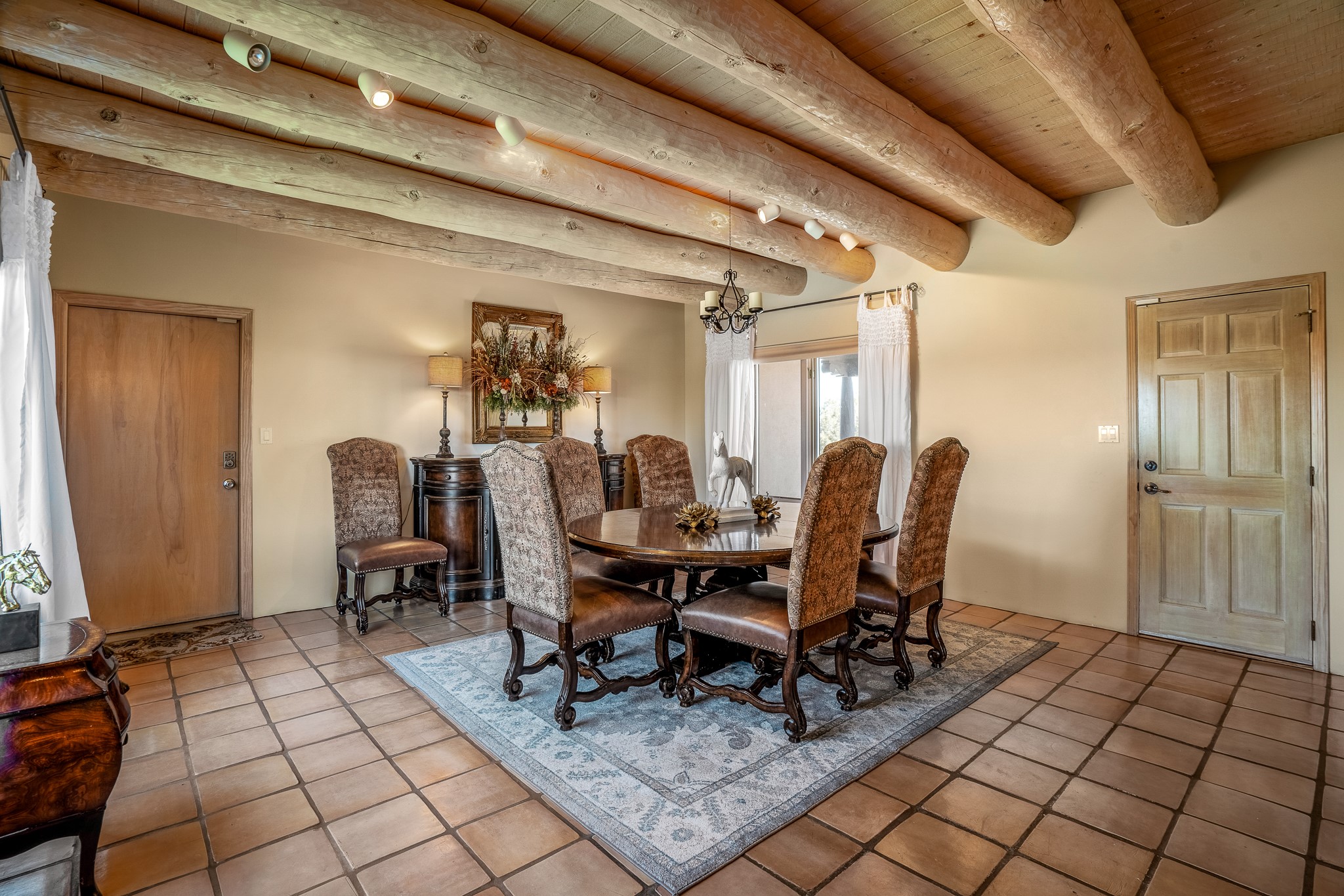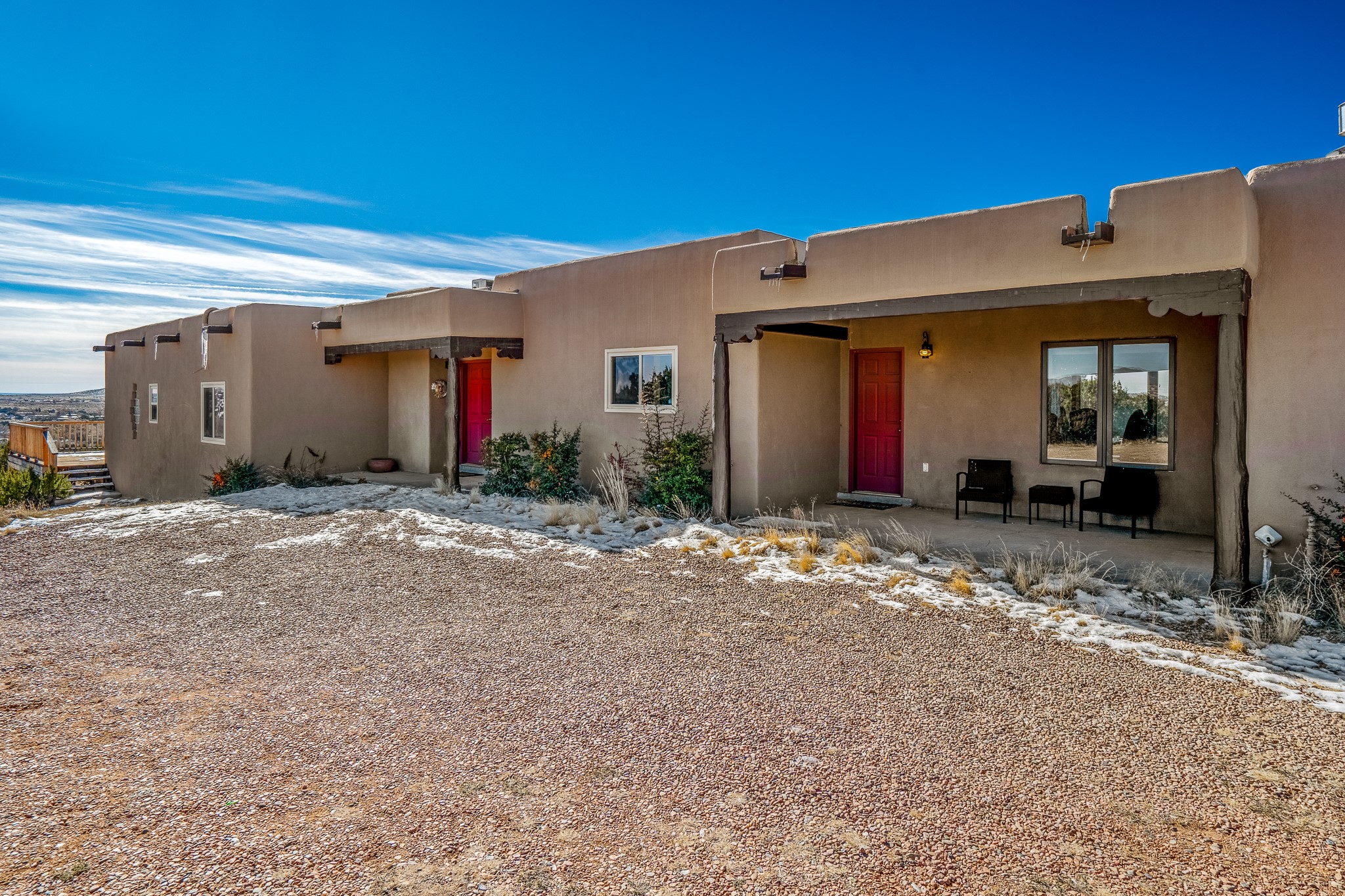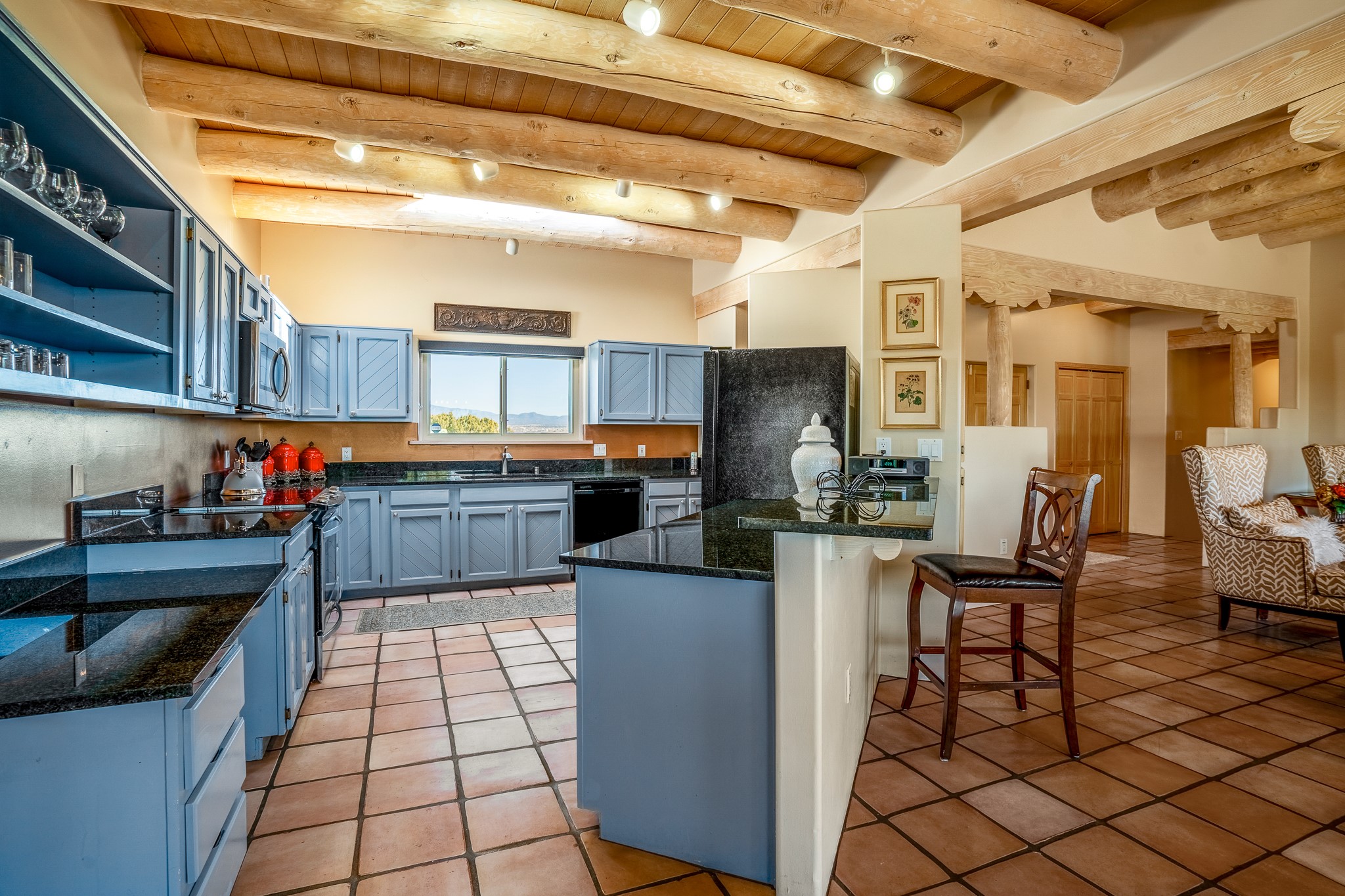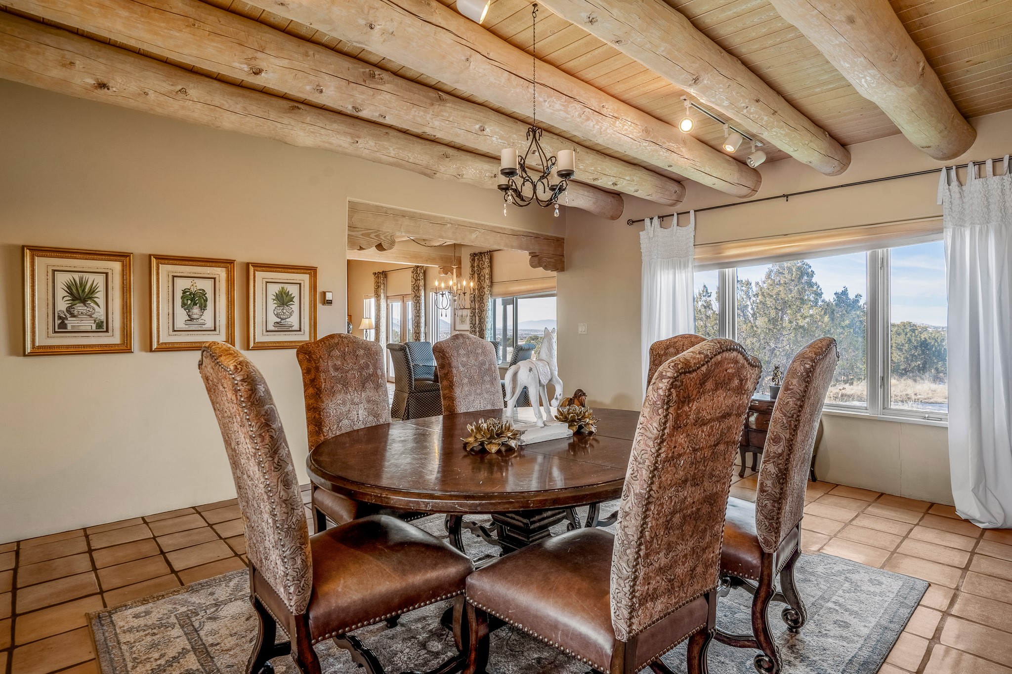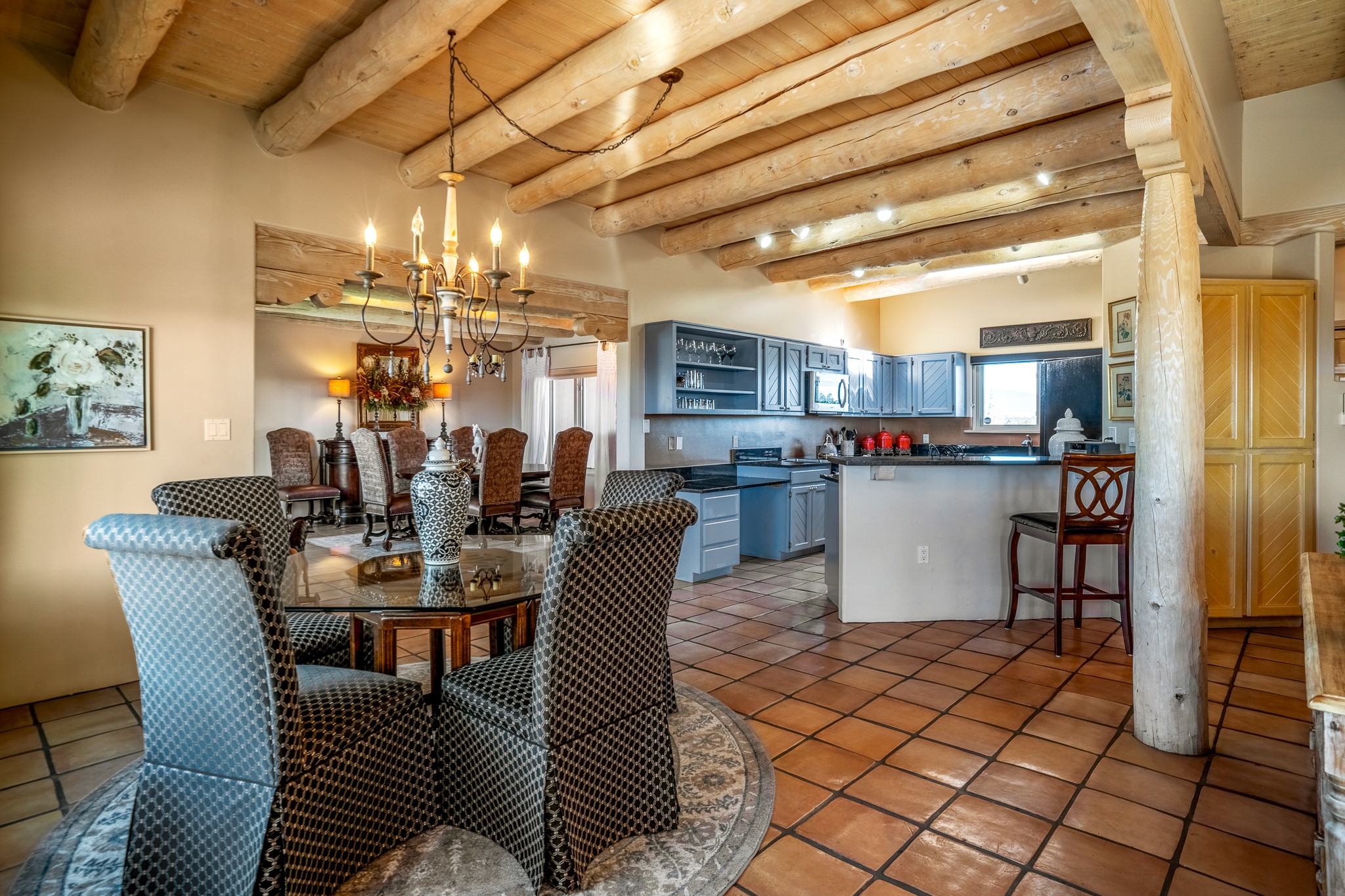 You will adore the breathtaking mountain vistas from here. Situated atop a ridge in thepicturesque La Cienega district. Imagine owning 5.74 acres of land where your neighbors leaveample space and there is no HOA. This exquisite residence features two bathrooms, threebedrooms, and a two-cargarage. The primary bedroom's expansive deckoffers a breathtakingview of the mountains. There is a second patio located off the living room, that also featuresbeautiful mountain views. The residence features an open floor plan and is constructed in thetraditional Santa Fe style, featuring vigas, two kiva fireplaces, andSaltillotile flooring in itsentirety.