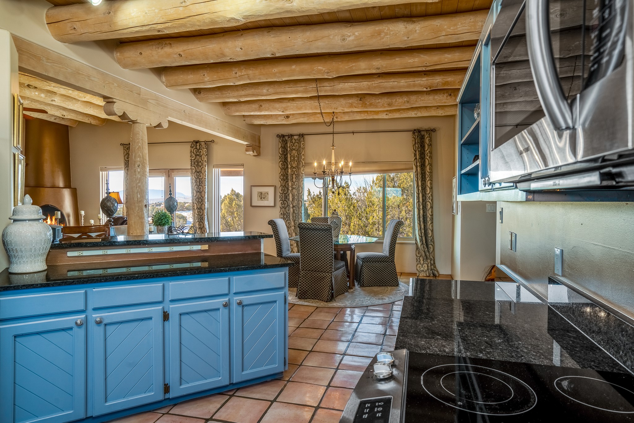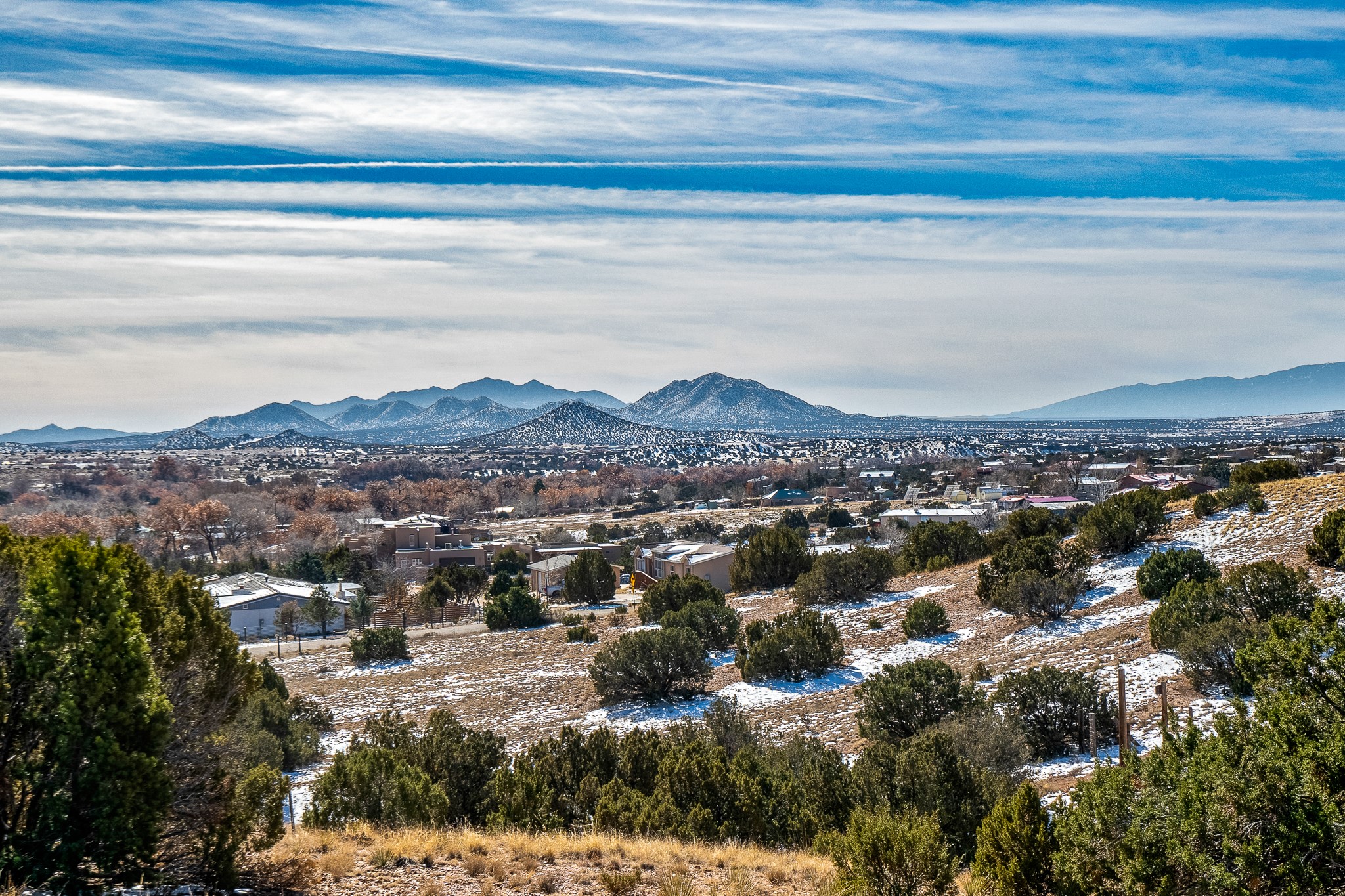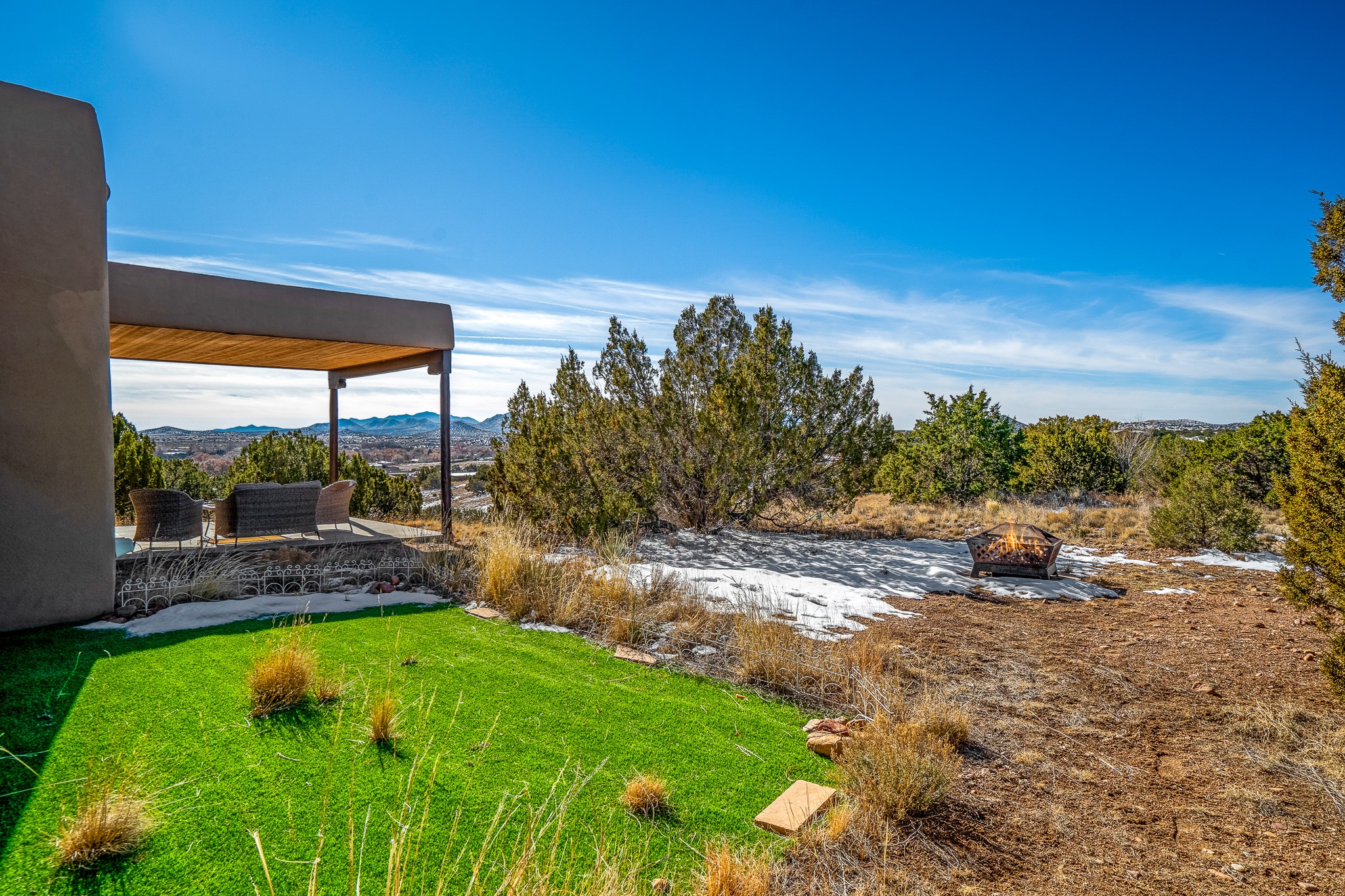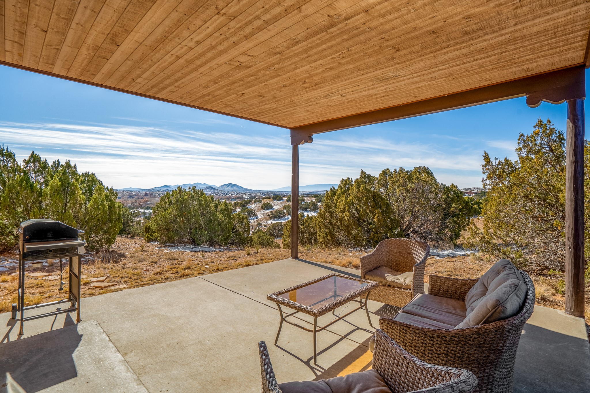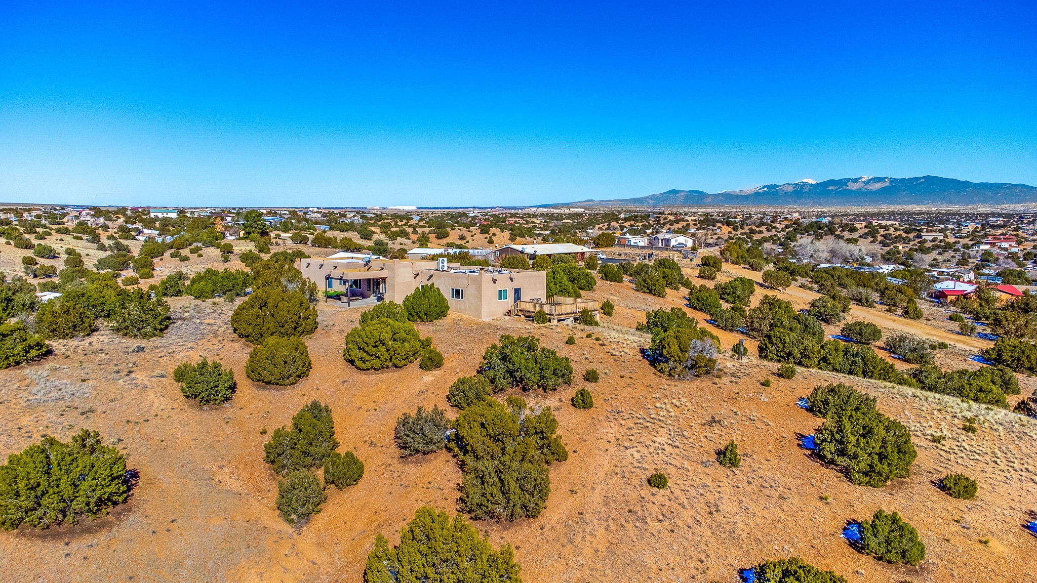 You will adore the breathtaking mountain vistas from here. Situated atop a ridge in thepicturesque La Cienega district. Imagine owning 5.74 acres of land where your neighbors leaveample space and there is no HOA. This exquisite residence features two bathrooms, threebedrooms, and a two-cargarage. The primary bedroom's expansive deckoffers a breathtakingview of the mountains. There is a second patio located off the living room, that also featuresbeautiful mountain views. The residence features an open floor plan and is constructed in thetraditional Santa Fe style, featuring vigas, two kiva fireplaces, andSaltillotile flooring in itsentirety.