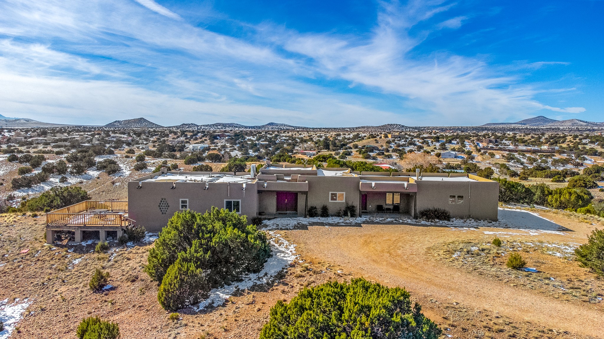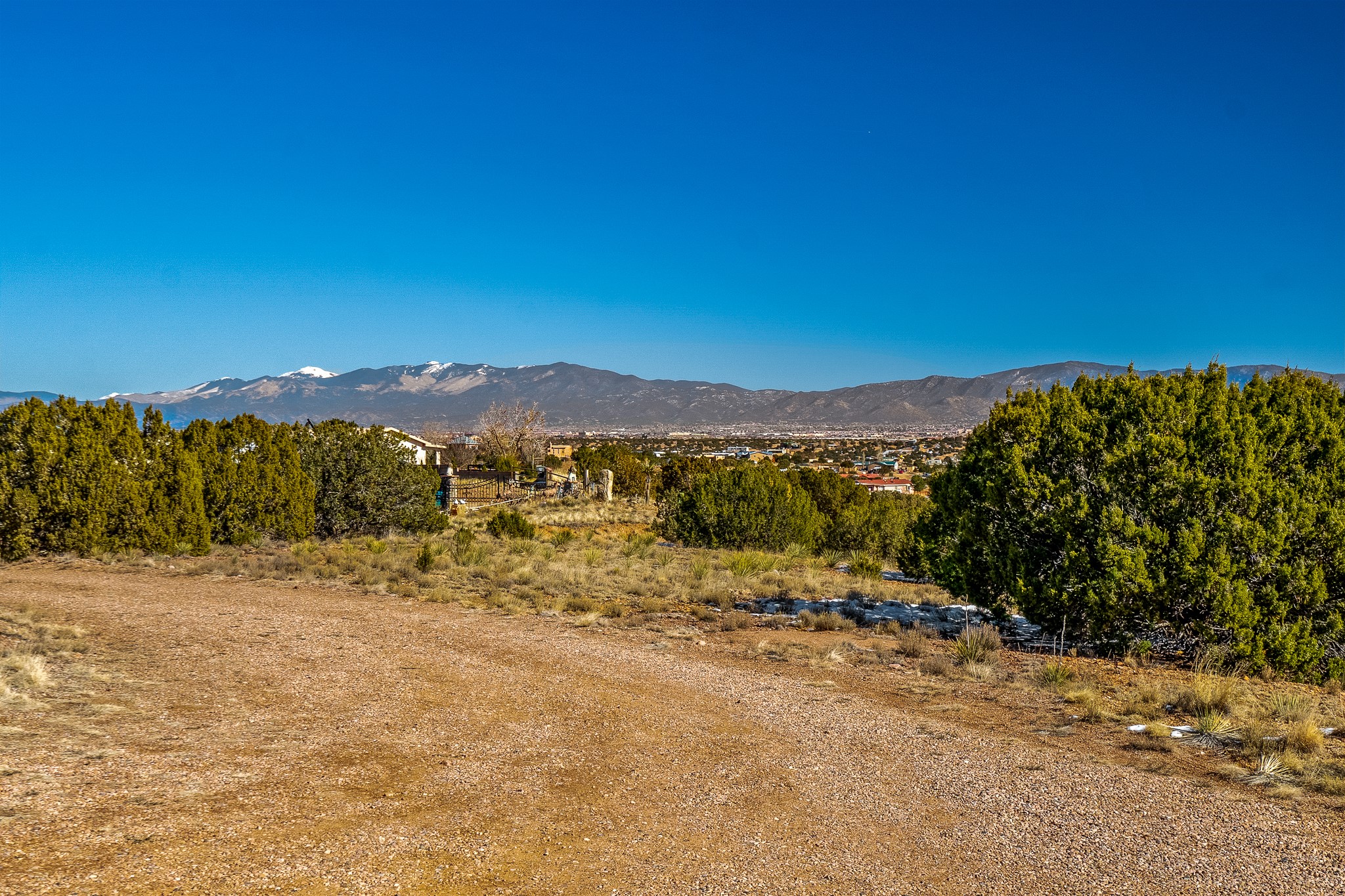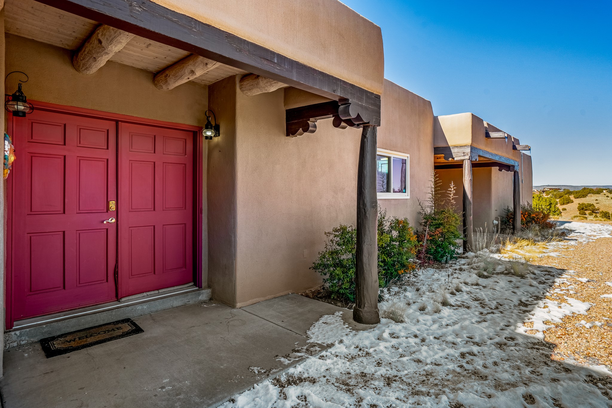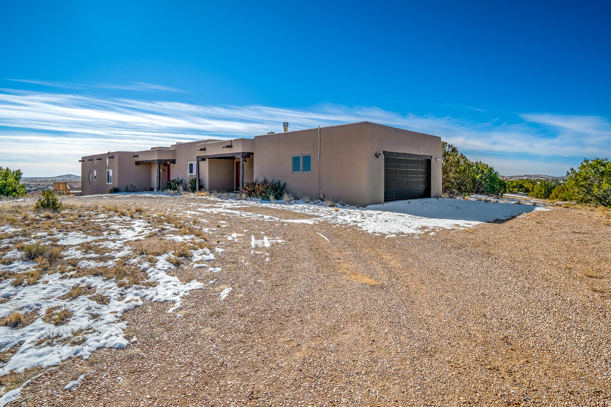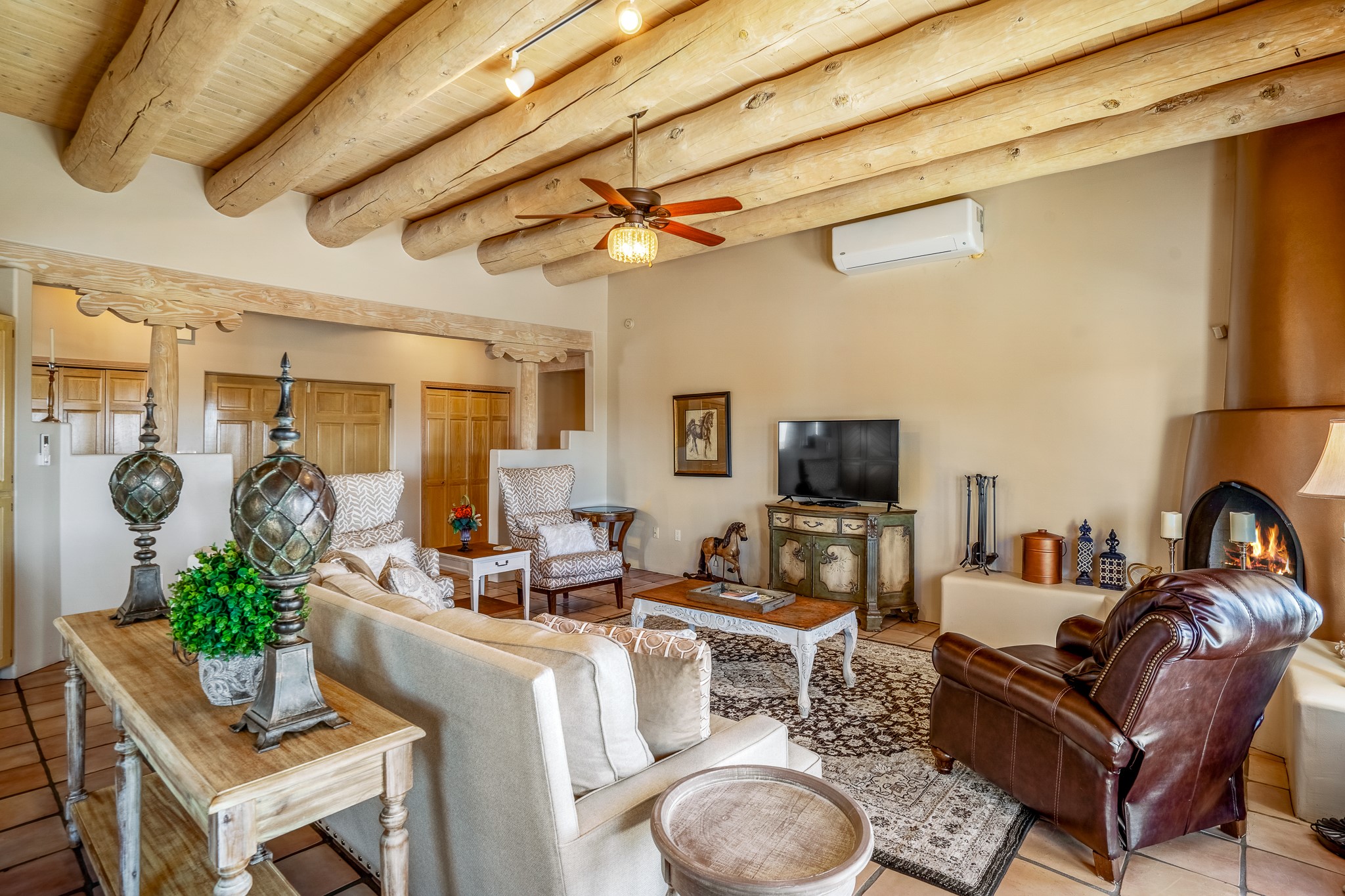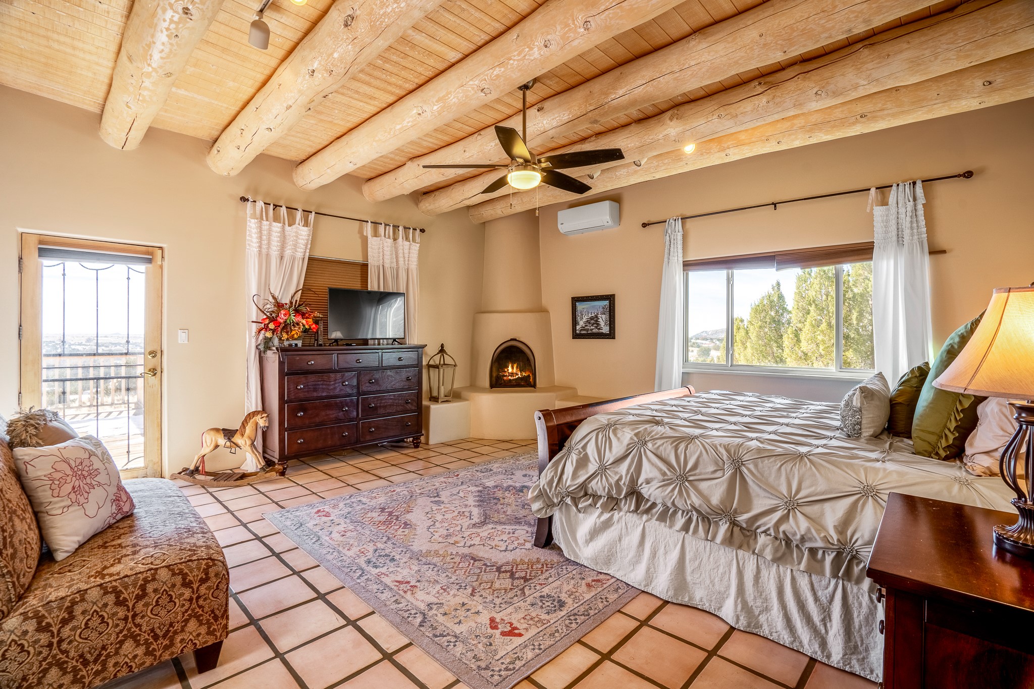 You will adore the breathtaking mountain vistas from here. Situated atop a ridge in thepicturesque La Cienega district. Imagine owning 5.74 acres of land where your neighbors leaveample space and there is no HOA. This exquisite residence features two bathrooms, threebedrooms, and a two-cargarage. The primary bedroom's expansive deckoffers a breathtakingview of the mountains. There is a second patio located off the living room, that also featuresbeautiful mountain views. The residence features an open floor plan and is constructed in thetraditional Santa Fe style, featuring vigas, two kiva fireplaces, andSaltillotile flooring in itsentirety.