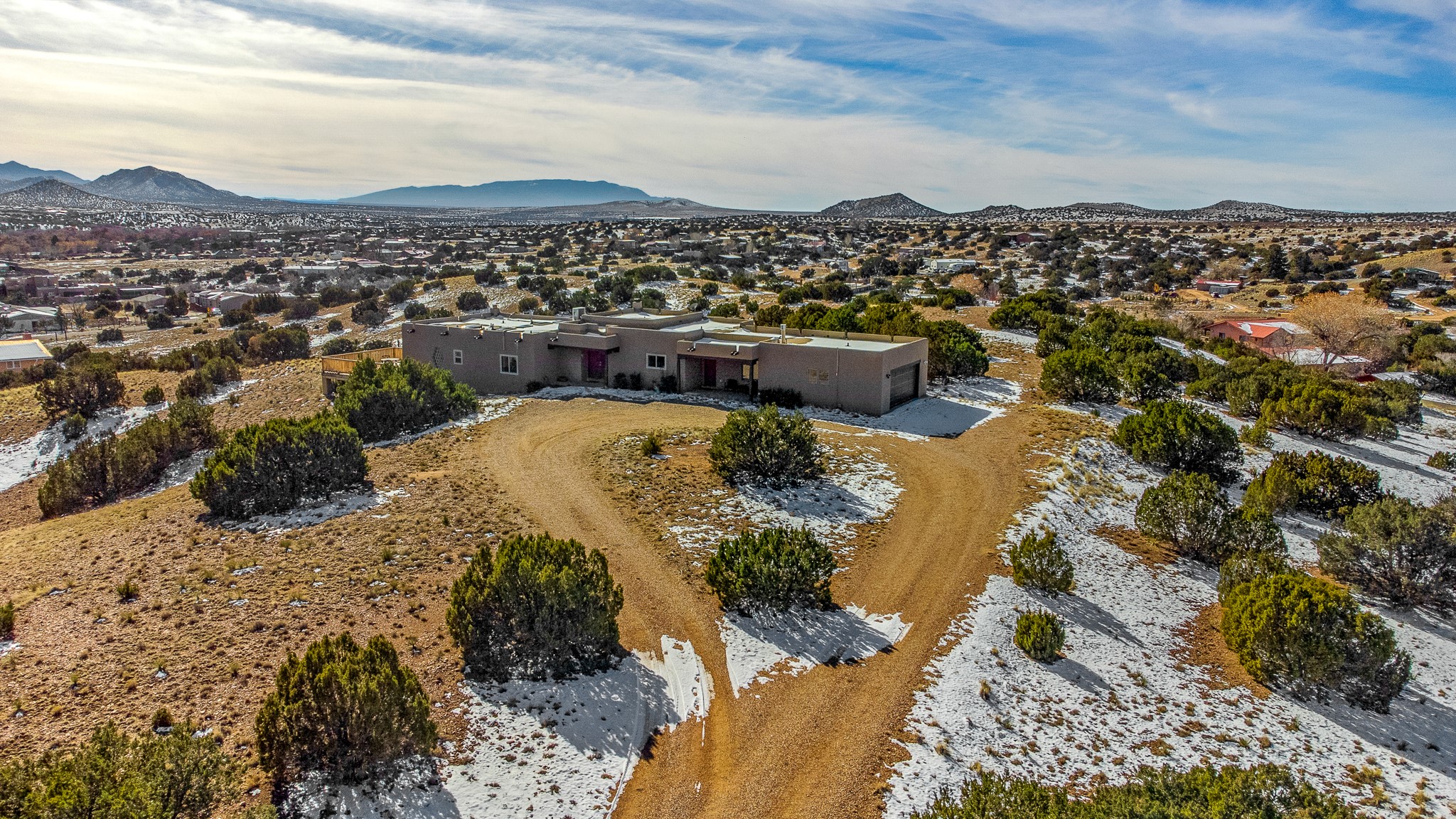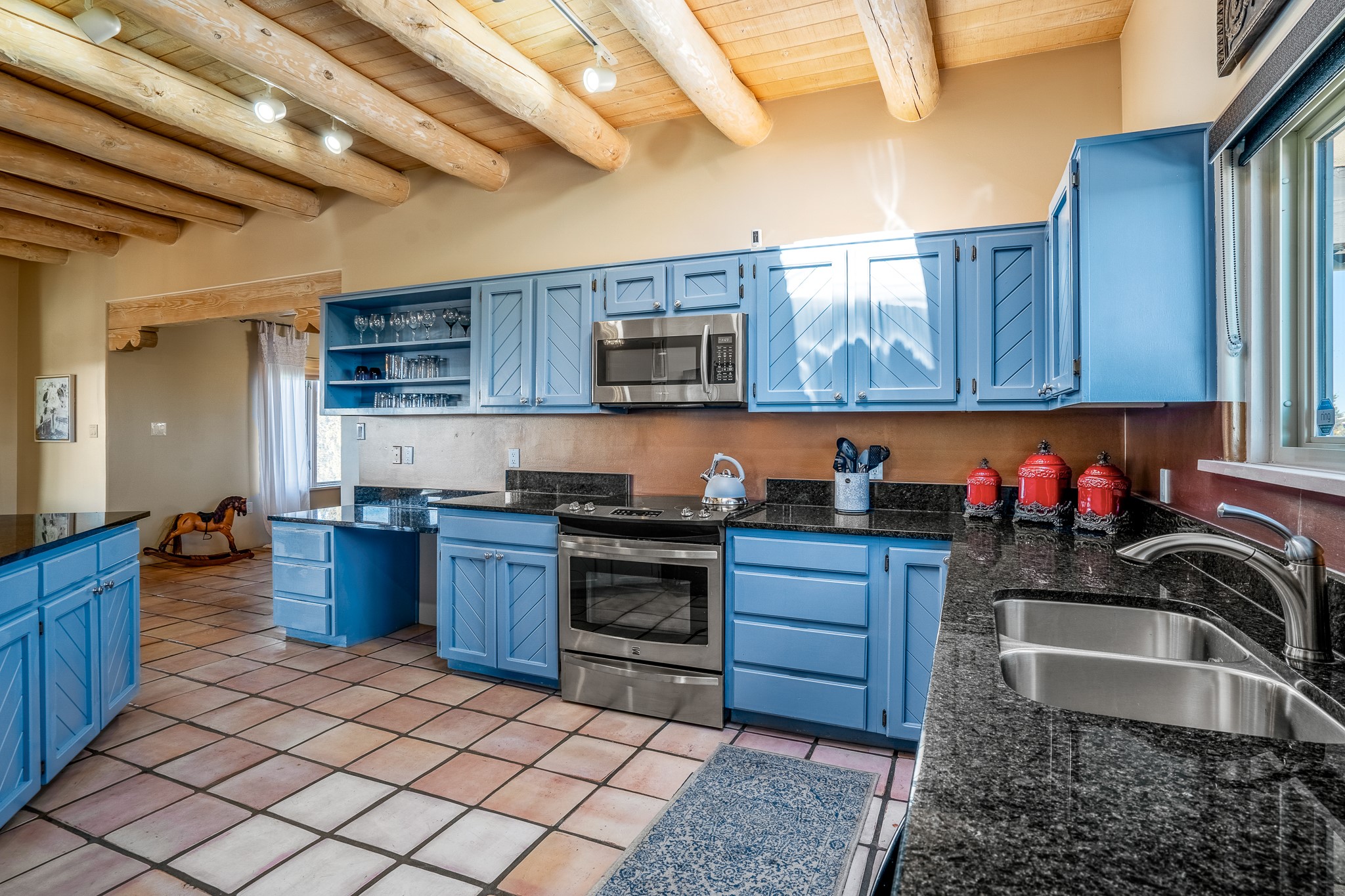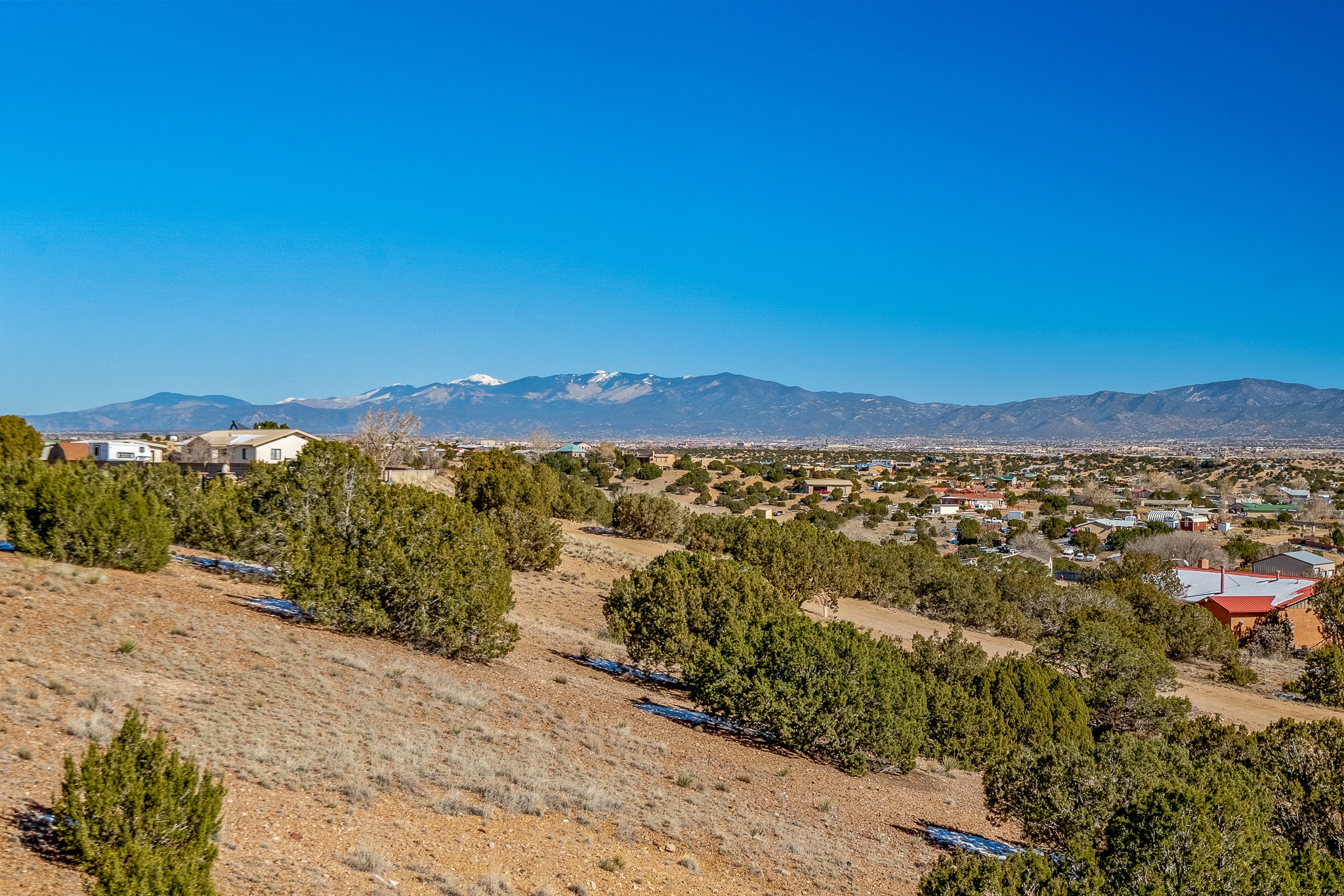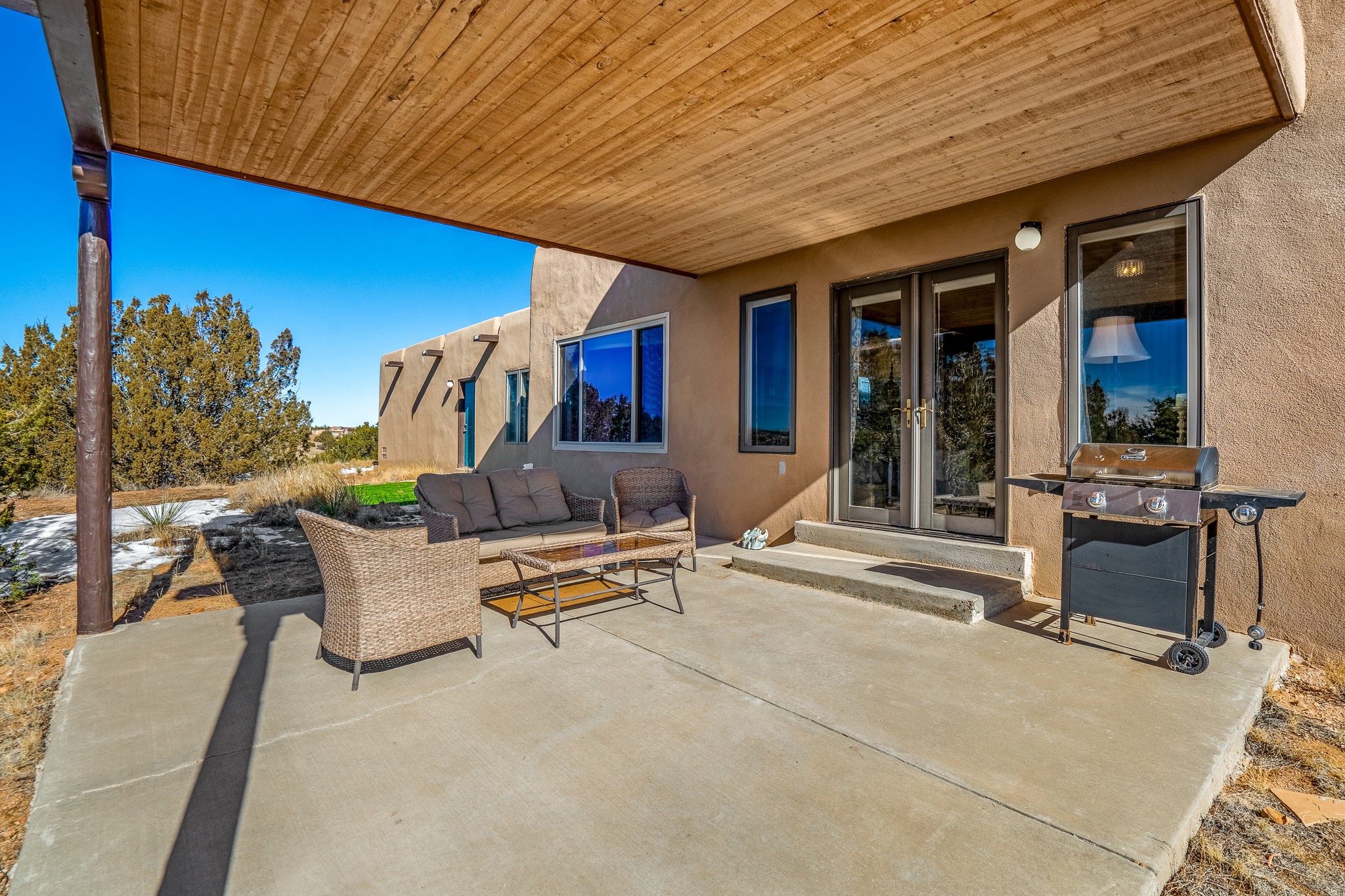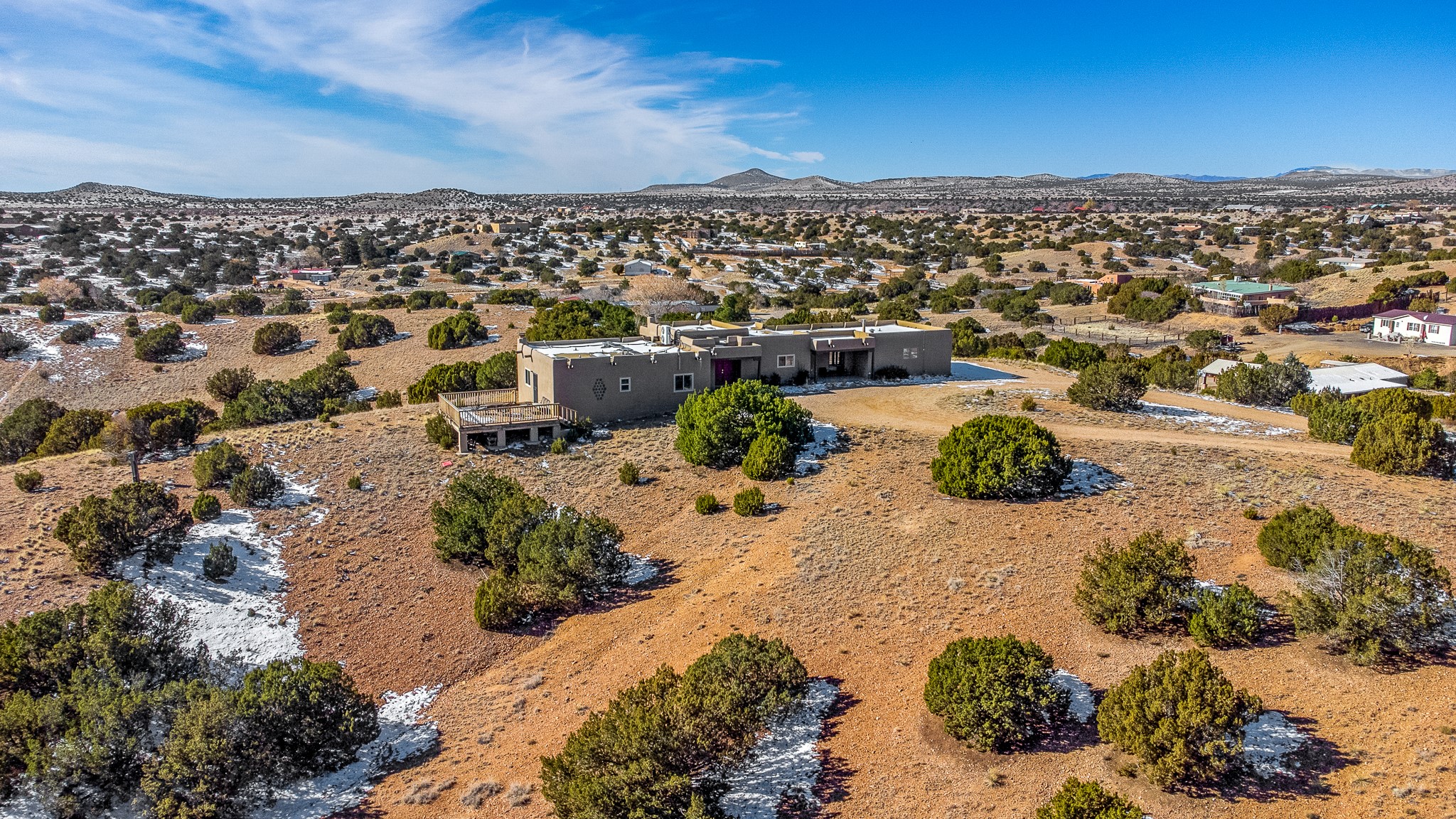 You will adore the breathtaking mountain vistas from here. Situated atop a ridge in thepicturesque La Cienega district. Imagine owning 5.74 acres of land where your neighbors leaveample space and there is no HOA. This exquisite residence features two bathrooms, threebedrooms, and a two-cargarage. The primary bedroom's expansive deckoffers a breathtakingview of the mountains. There is a second patio located off the living room, that also featuresbeautiful mountain views. The residence features an open floor plan and is constructed in thetraditional Santa Fe style, featuring vigas, two kiva fireplaces, andSaltillotile flooring in itsentirety.