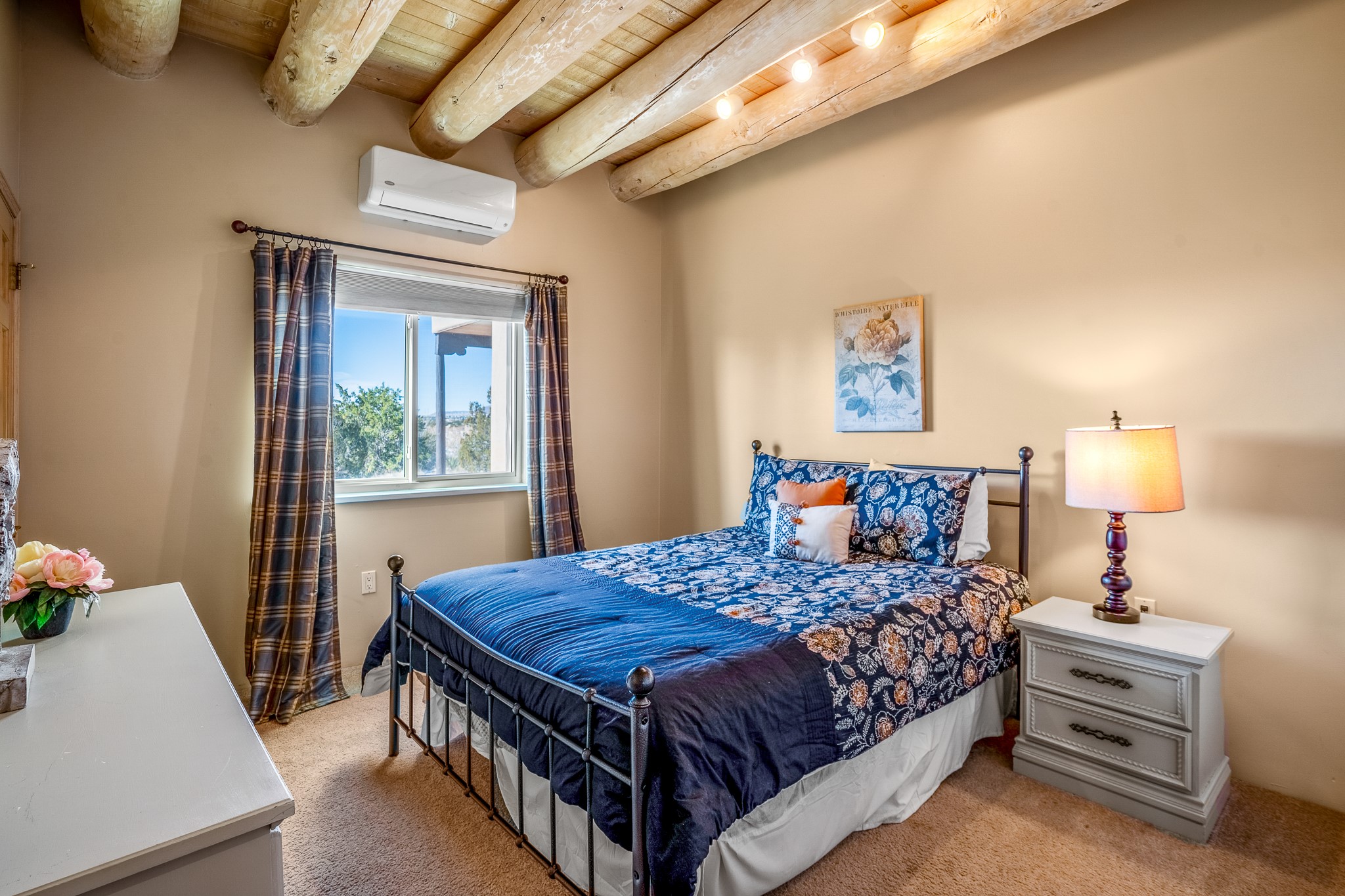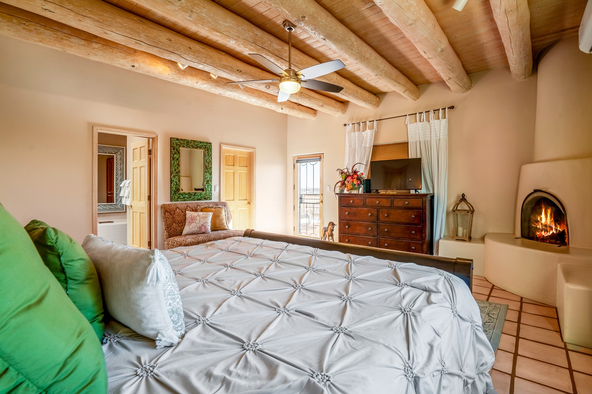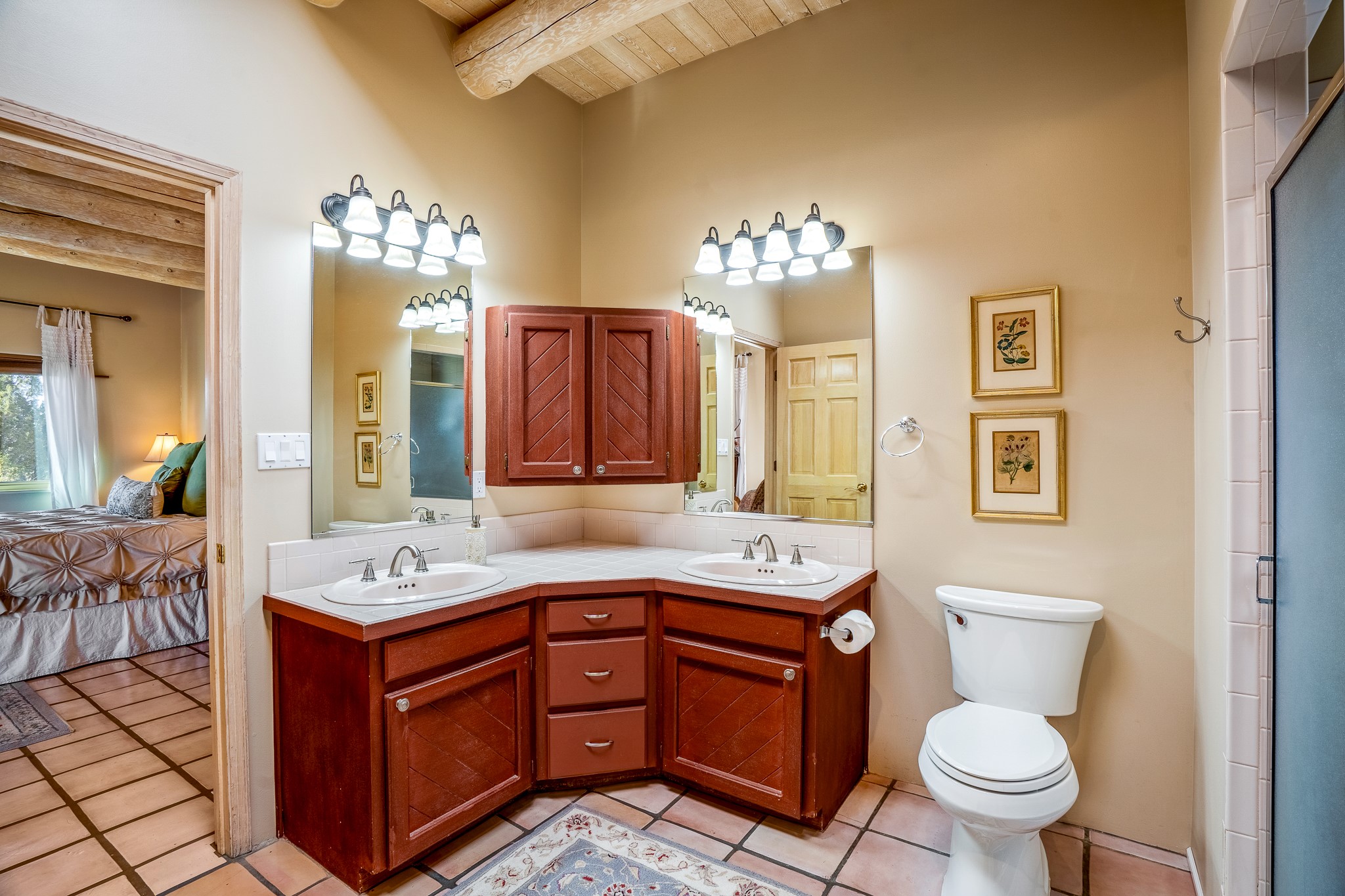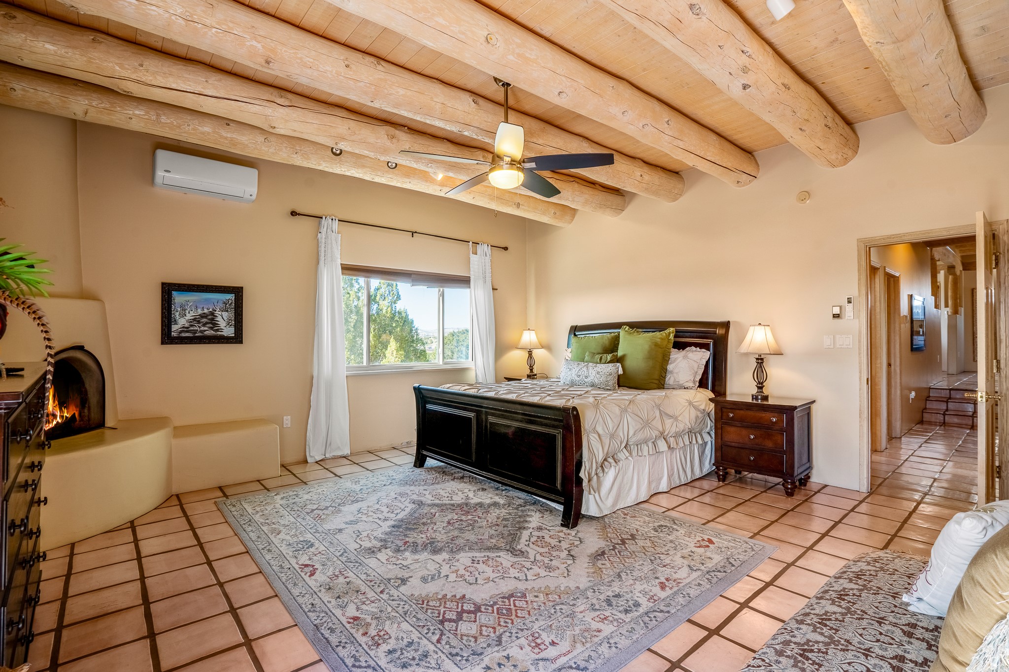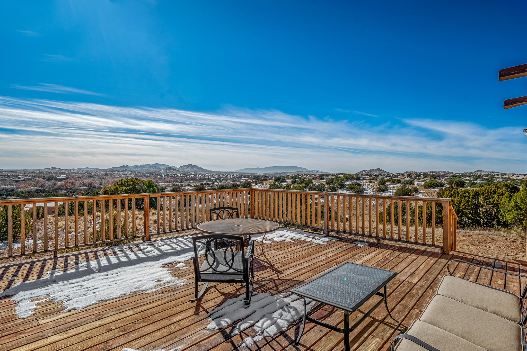 You will adore the breathtaking mountain vistas from here. Situated atop a ridge in thepicturesque La Cienega district. Imagine owning 5.74 acres of land where your neighbors leaveample space and there is no HOA. This exquisite residence features two bathrooms, threebedrooms, and a two-cargarage. The primary bedroom's expansive deckoffers a breathtakingview of the mountains. There is a second patio located off the living room, that also featuresbeautiful mountain views. The residence features an open floor plan and is constructed in thetraditional Santa Fe style, featuring vigas, two kiva fireplaces, andSaltillotile flooring in itsentirety.