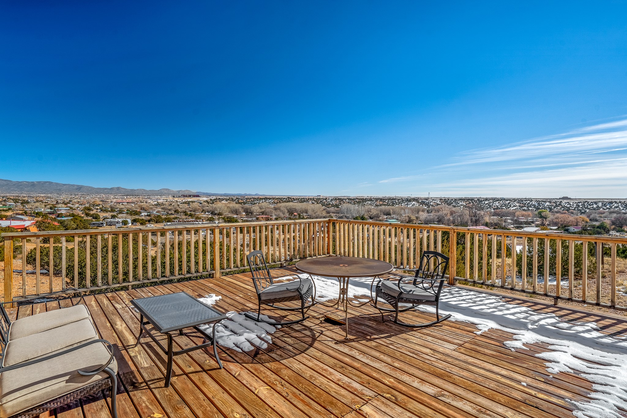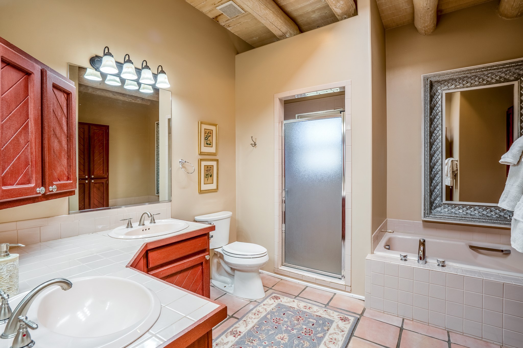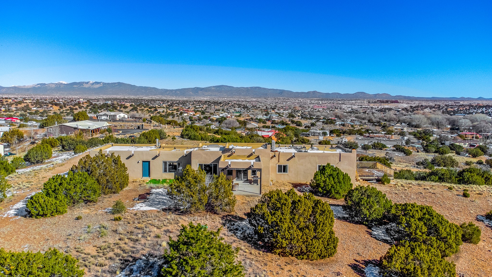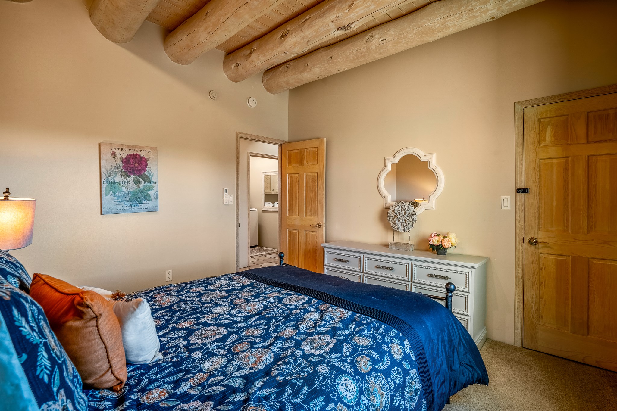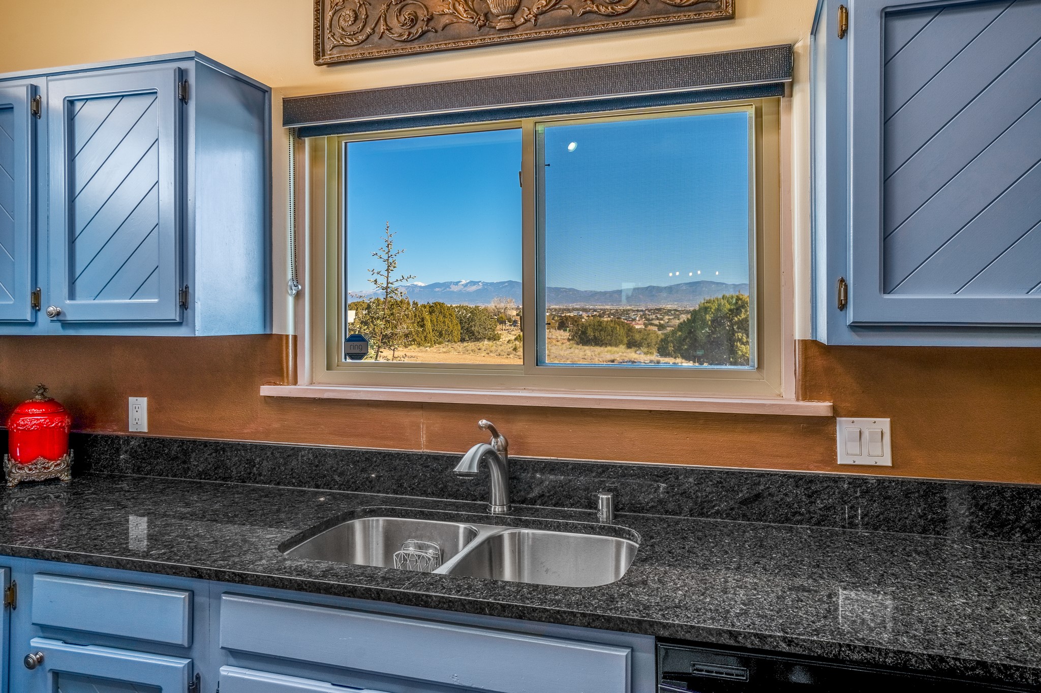 You will adore the breathtaking mountain vistas from here. Situated atop a ridge in thepicturesque La Cienega district. Imagine owning 5.74 acres of land where your neighbors leaveample space and there is no HOA. This exquisite residence features two bathrooms, threebedrooms, and a two-cargarage. The primary bedroom's expansive deckoffers a breathtakingview of the mountains. There is a second patio located off the living room, that also featuresbeautiful mountain views. The residence features an open floor plan and is constructed in thetraditional Santa Fe style, featuring vigas, two kiva fireplaces, andSaltillotile flooring in itsentirety.