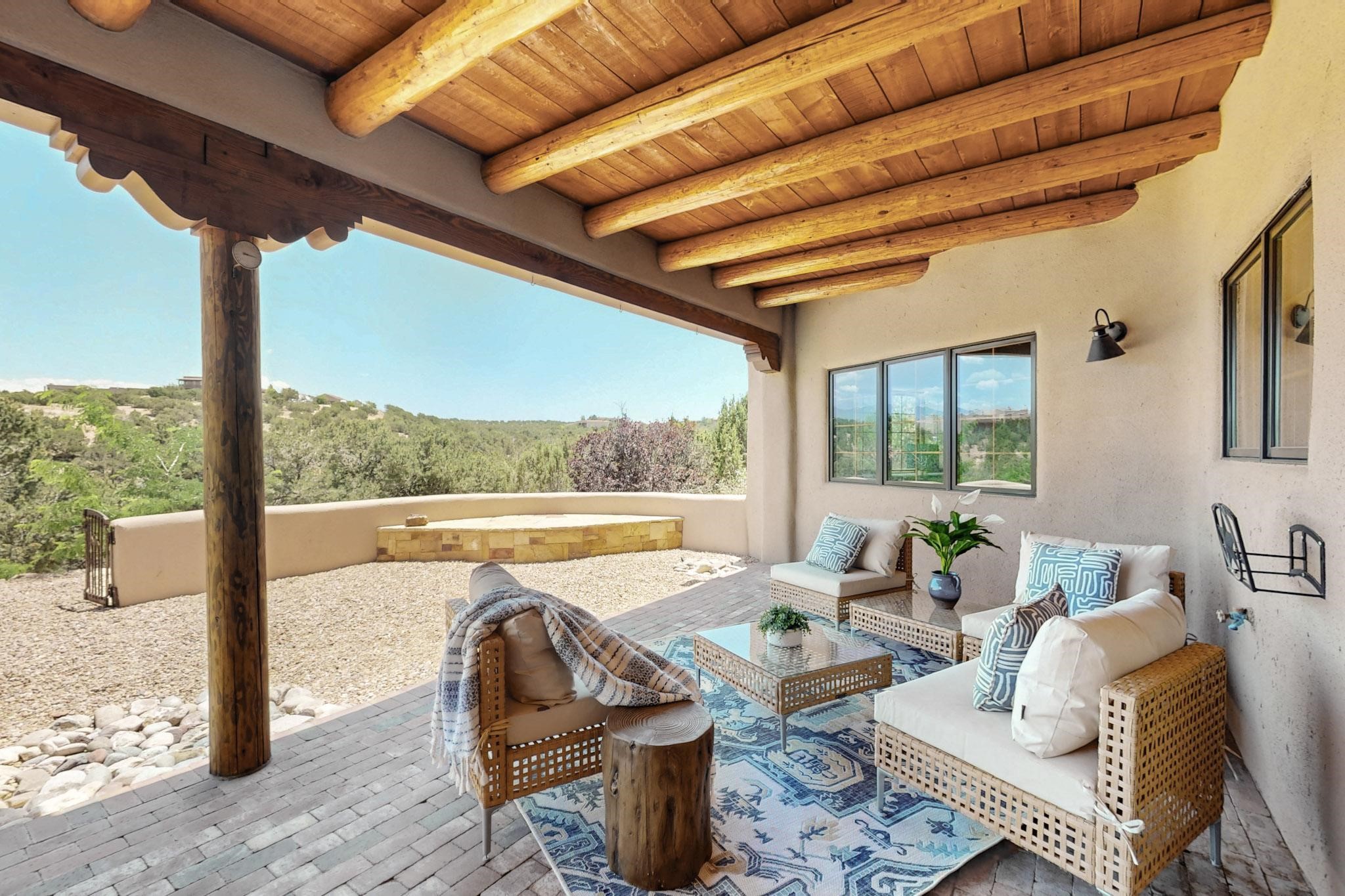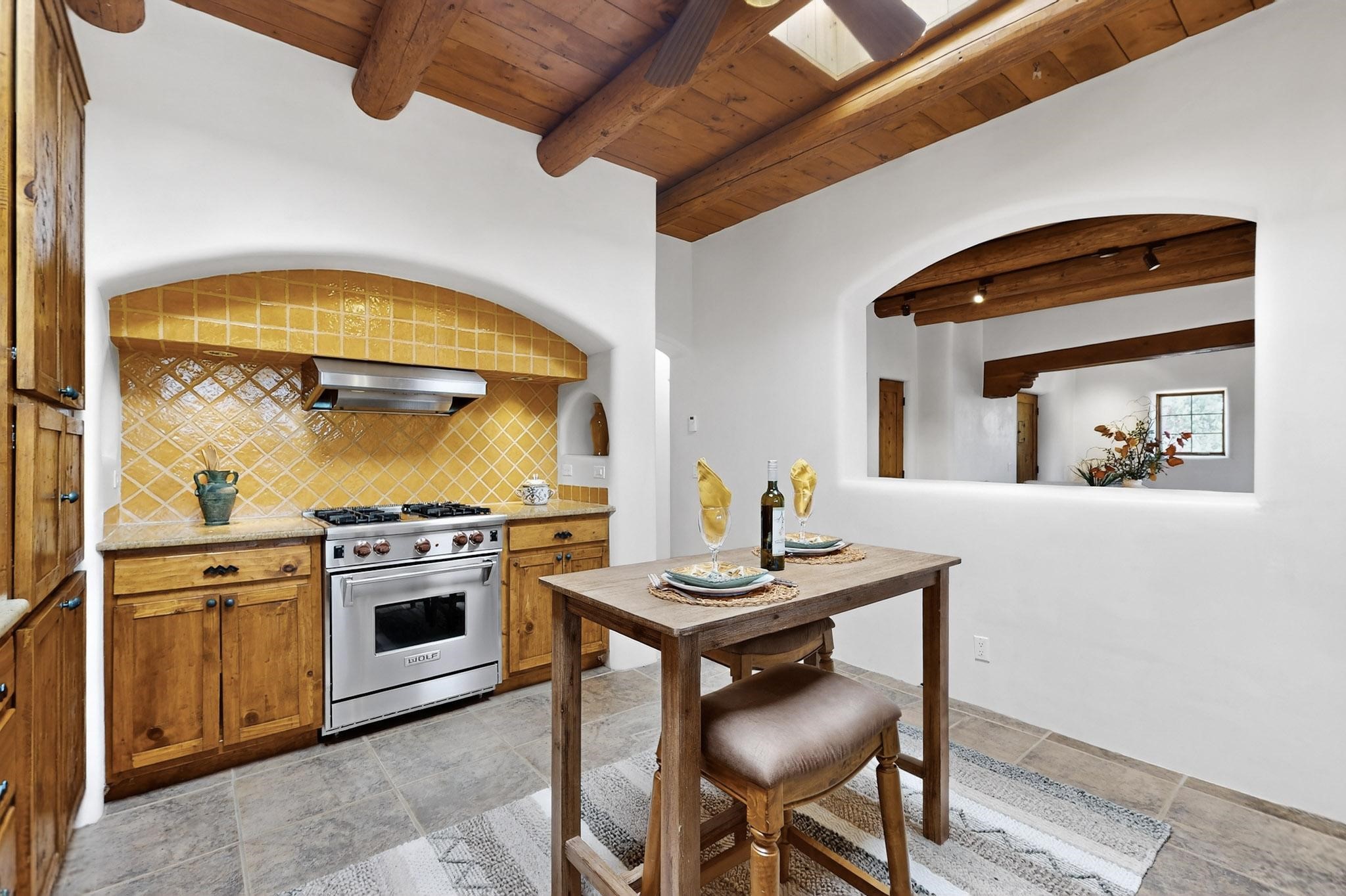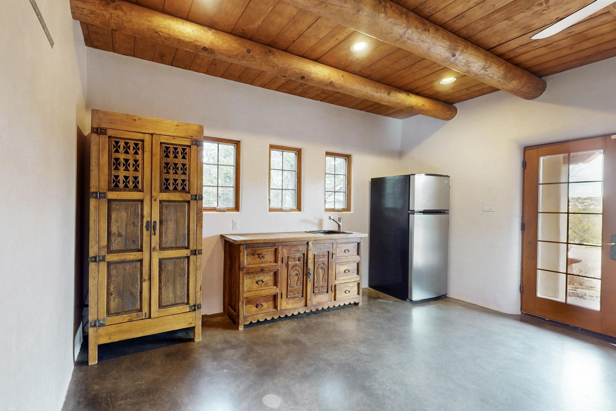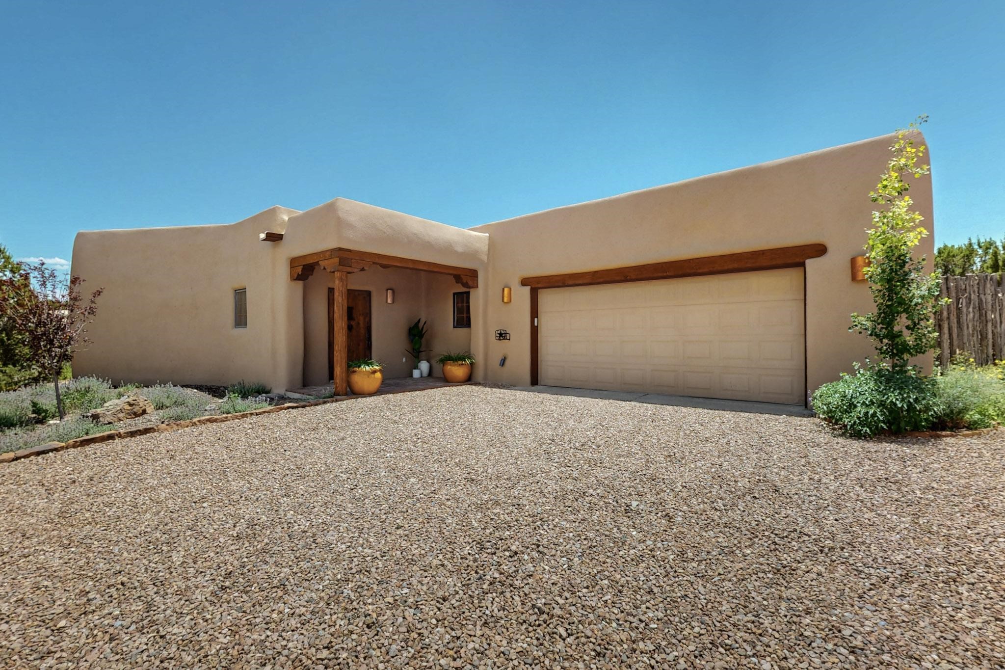 This Pueblo Revival style home features three bedrooms in the main house along with a detached, one-bedroom studio/casita. Situated in the beautiful La Tierra area, this adobe home is set on over two acres of land and is conveniently located just 15 minutes from downtown. The main home, spanning just over 2,000 sq ft, offers a private retreat with an open concept layout, high ceilings, vigas, wood decked ceilings, plastered walls, and two kiva fireplaces. You'll find panoramic views of the Sangre de Cristo Mountains from the large portal off the dining area, which creates a perfect setting for entertaining. The kitchen is well-appointed with a Wolf range, stainless steel appliances, colorful tile, Alder cabinets, and plenty of storage. The property also includes a heated garage for your convenience. The one-bedroom casita features similar finishes and a kiva fireplace, offering flexible options for use.