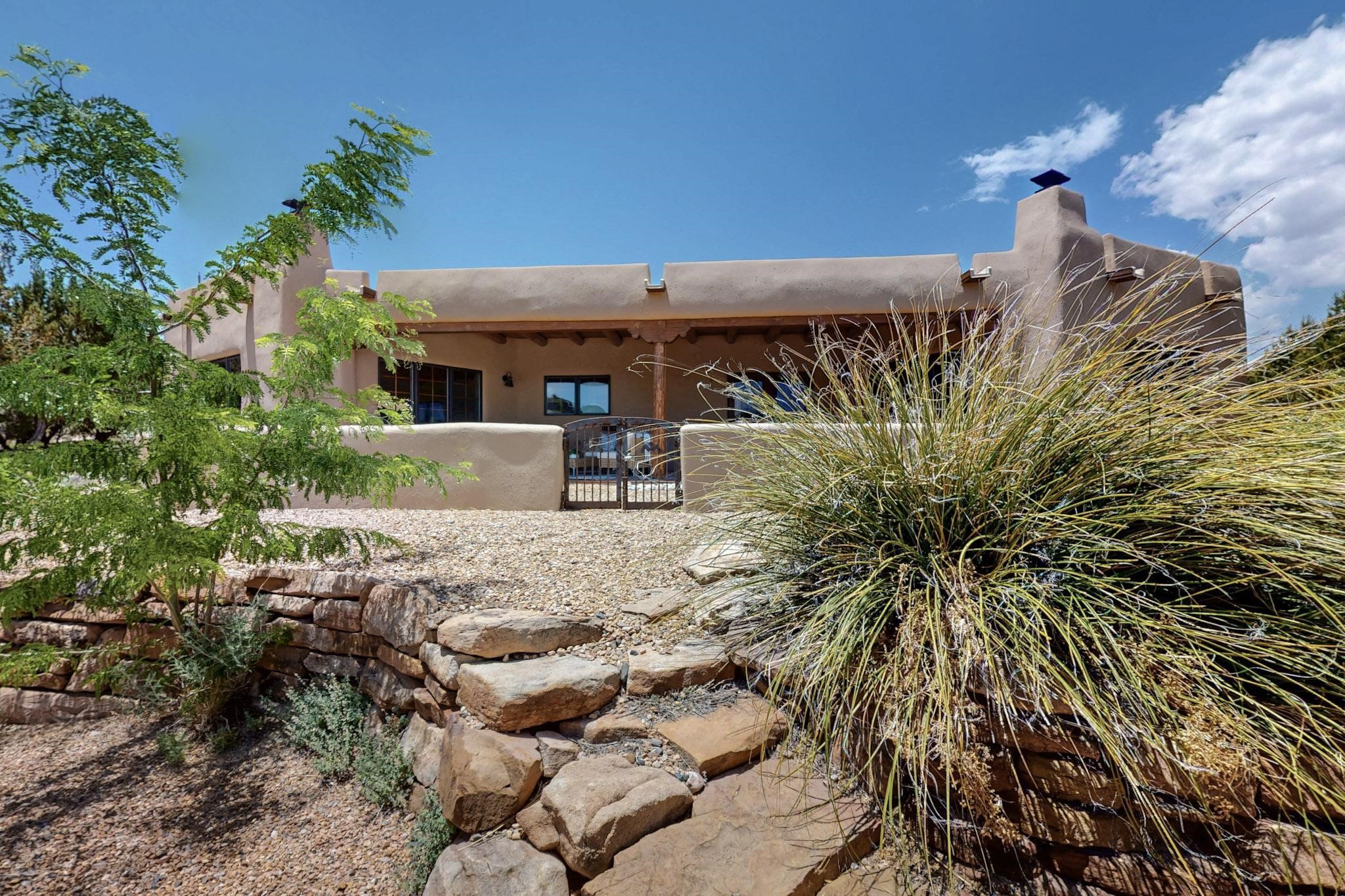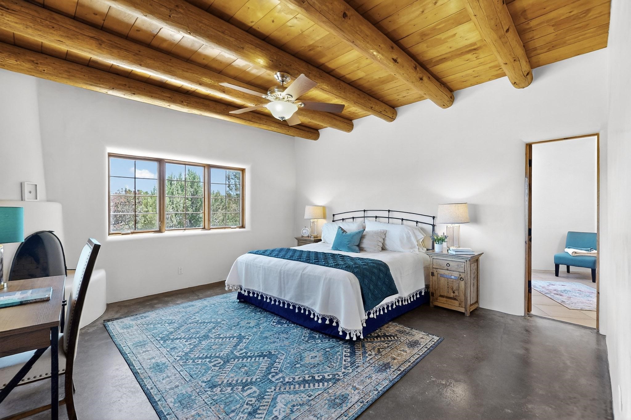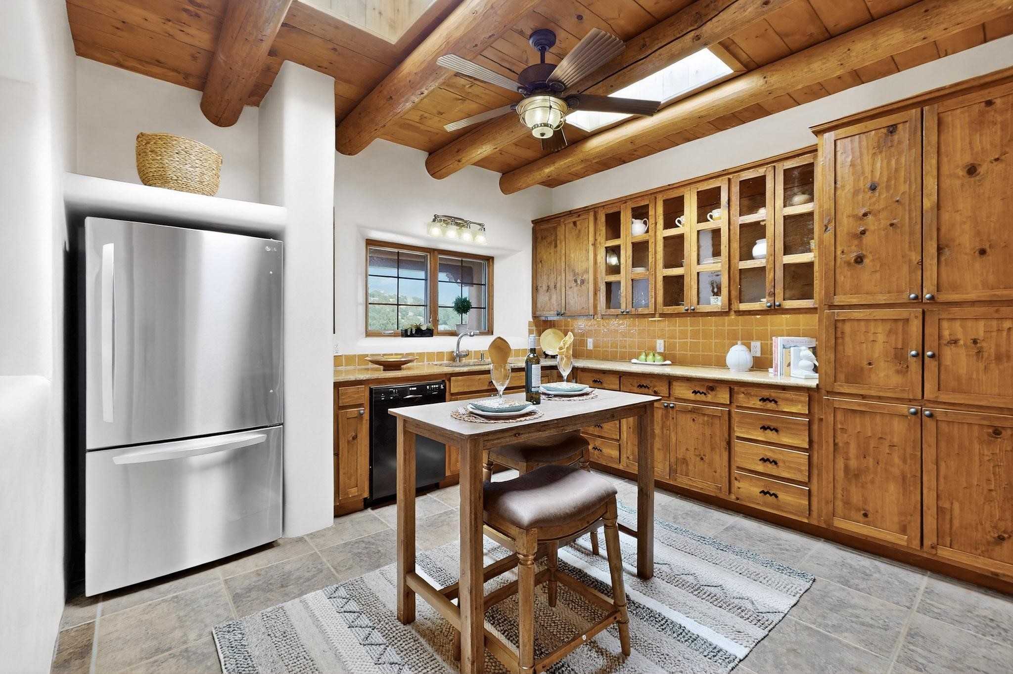 This Pueblo Revival style home features three bedrooms in the main house along with a detached, one-bedroom studio/casita. Situated in the beautiful La Tierra area, this adobe home is set on over two acres of land and is conveniently located just 15 minutes from downtown. The main home, spanning just over 2,000 sq ft, offers a private retreat with an open concept layout, high ceilings, vigas, wood decked ceilings, plastered walls, and two kiva fireplaces. You'll find panoramic views of the Sangre de Cristo Mountains from the large portal off the dining area, which creates a perfect setting for entertaining. The kitchen is well-appointed with a Wolf range, stainless steel appliances, colorful tile, Alder cabinets, and plenty of storage. The property also includes a heated garage for your convenience. The one-bedroom casita features similar finishes and a kiva fireplace, offering flexible options for use.