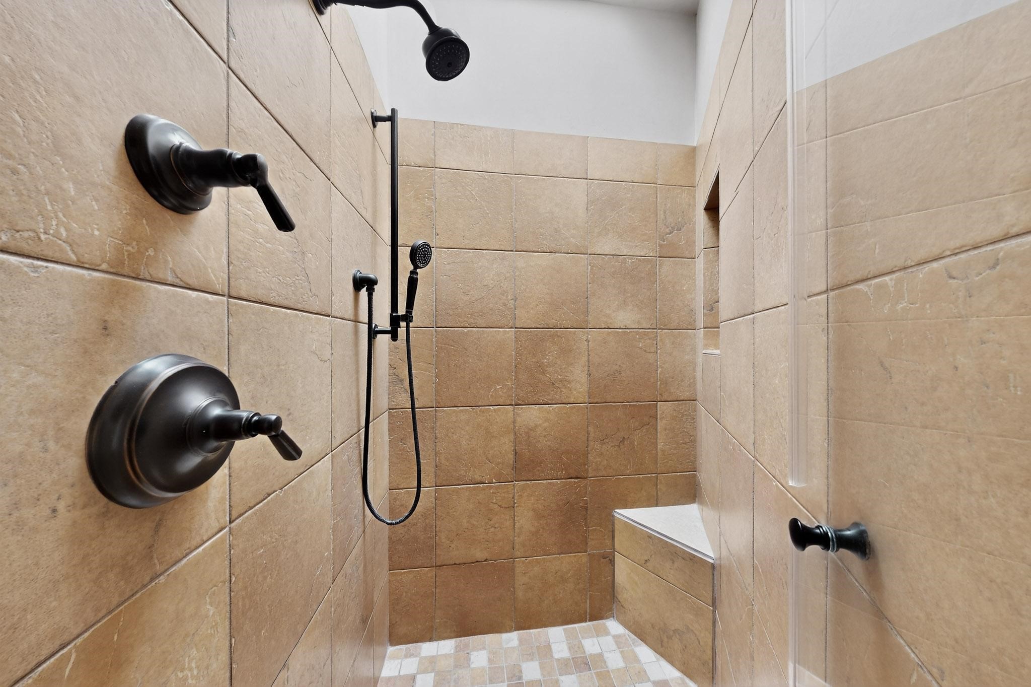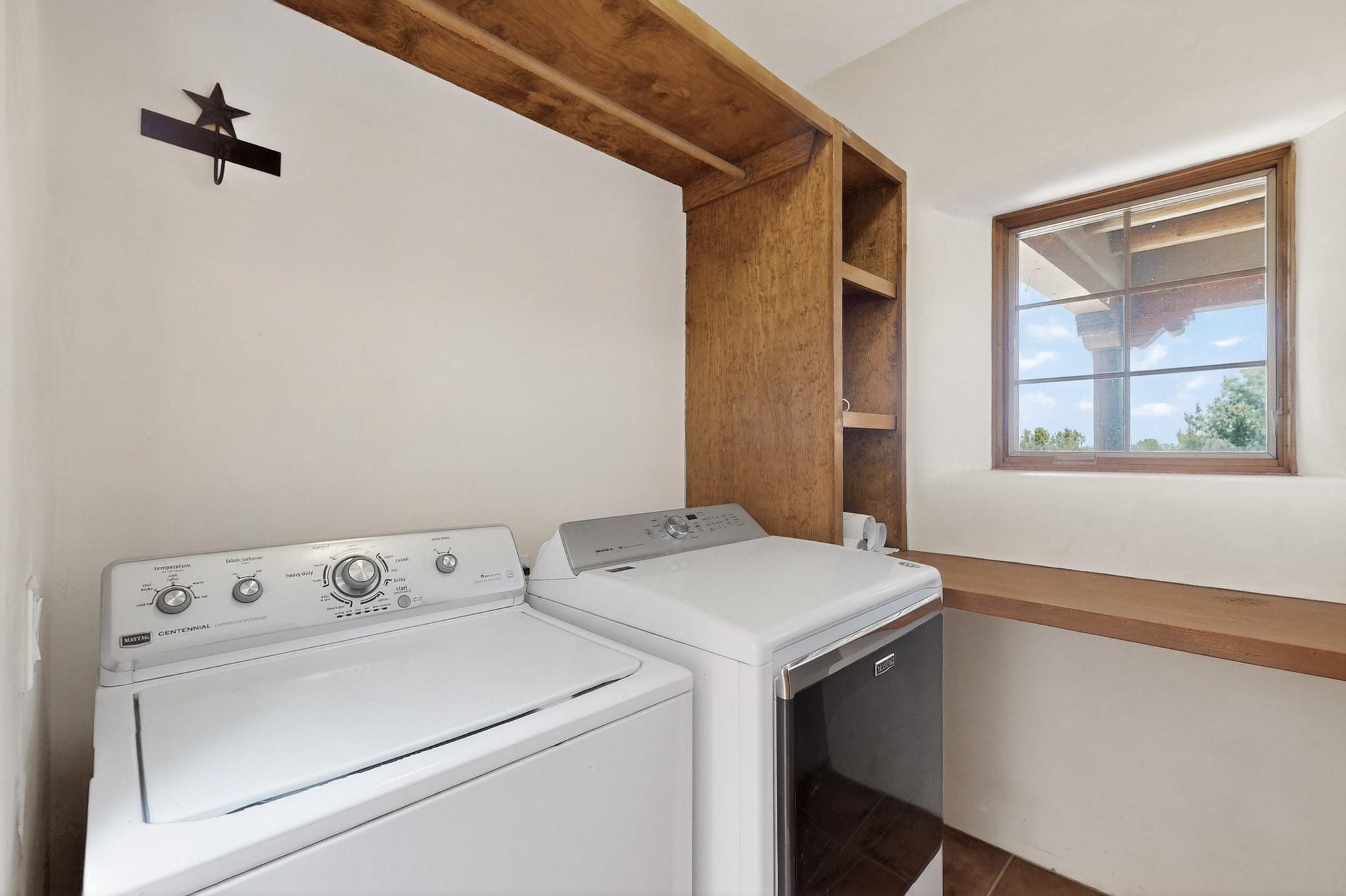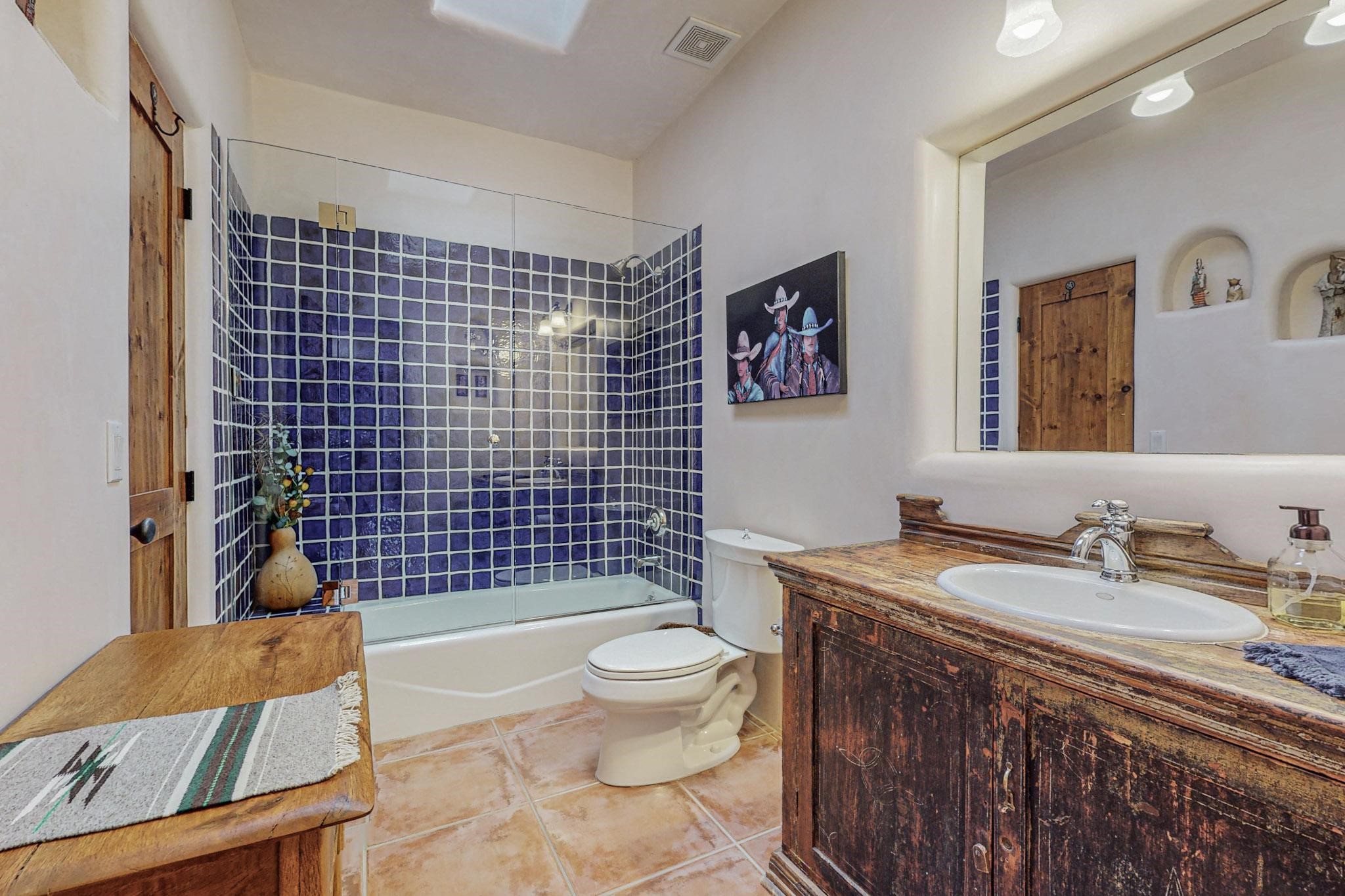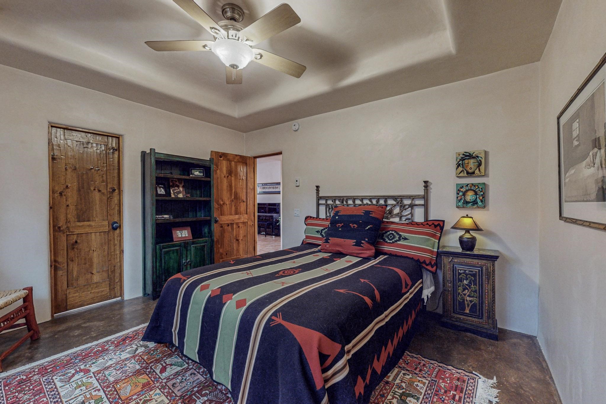 This Pueblo Revival style home features three bedrooms in the main house along with a detached, one-bedroom studio/casita. Situated in the beautiful La Tierra area, this adobe home is set on over two acres of land and is conveniently located just 15 minutes from downtown. The main home, spanning just over 2,000 sq ft, offers a private retreat with an open concept layout, high ceilings, vigas, wood decked ceilings, plastered walls, and two kiva fireplaces. You'll find panoramic views of the Sangre de Cristo Mountains from the large portal off the dining area, which creates a perfect setting for entertaining. The kitchen is well-appointed with a Wolf range, stainless steel appliances, colorful tile, Alder cabinets, and plenty of storage. The property also includes a heated garage for your convenience. The one-bedroom casita features similar finishes and a kiva fireplace, offering flexible options for use.