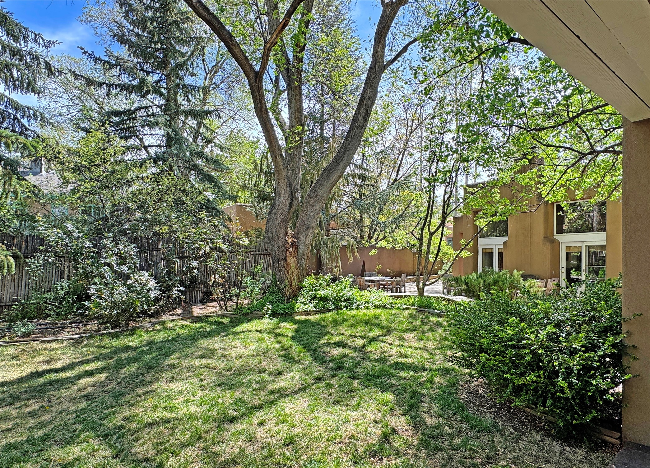 This refined house and guest house, on the market for the first time,is a hidden gem that's private, quiet, with a feeling of seclusion and set back on a charming street on the Eastside. The grounds unfold beyond the gate to a spacious,idyllic and entirely enclosed compound on .23 acres that is truly nestled among mature aspens and pines.The architectural harmony and green space create a feeling of tranquility, as if you're on retreat.The outdoor area, with garden beds and paved flagstone, brick patios and walkways, offer abundant opportunities for relaxation and entertaining.The great room has ceilings that soar to 14 ft. in height, a gracious primary bedroom has lovely views and spa-like ensuite bath.The home was refreshed to include wood and travertine flooring and a sunny kitchen with stunning granite counters.The pantry connects the kitchen to a rare feature:a two car attached garage.The loggias /extended portals frame lovely views and create a sense of movement and passage. Rich surfaces, fine details and classical references create a comfortable, polished and timeless take on Santa Fe style as designed by the award winning architect, Robert Zachry.Elegant details include fine metal and woodwork, skylights, symmetrical vigas, polished latillas, abundant storage, fireplaces and six French doors that make for breezy access to the lovely lawn and garden that connects the two homes.The guest house adds continuity of design and charm.What makes it truly special is the versatility of the spaces, with plenty of options as a home office and for guests. Inviting and soothing views connect you to the garden and the main house.A deep covered portal creates an al fresco room, with a generous patio and outdoor fireplace that's the perfect hub for garden parties and to enjoy quality time with family and friends.You are mere minutes from exciting Canyon Road and the Santa Fe Plaza and Kaunes grocery is just around the corner. Come and experience this place to call home.
