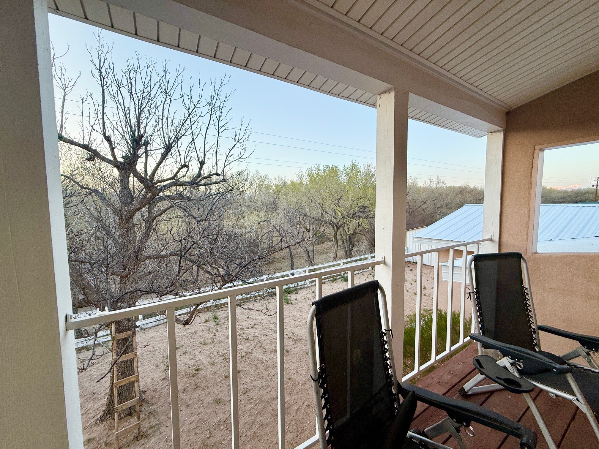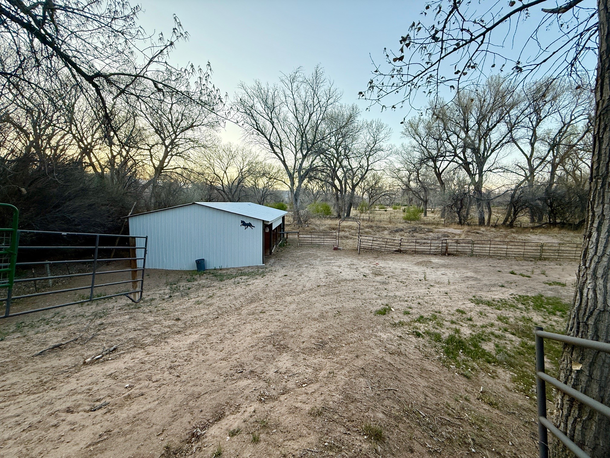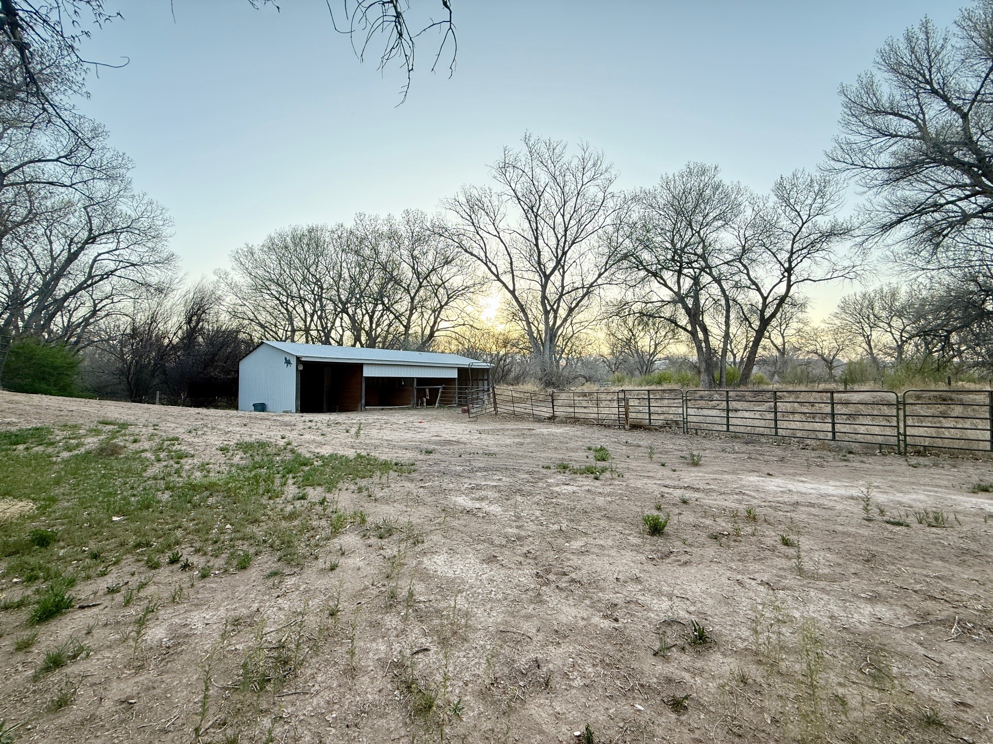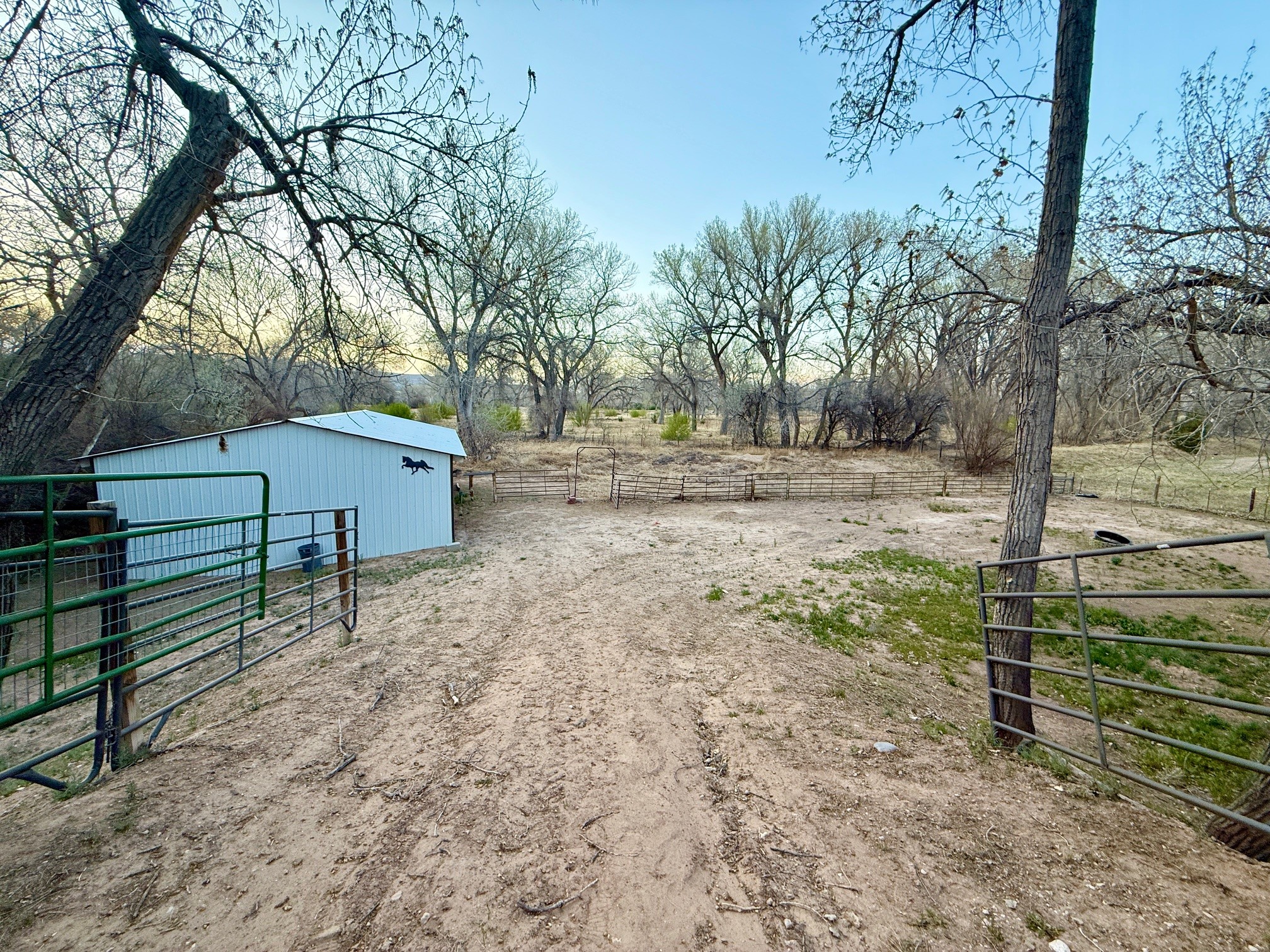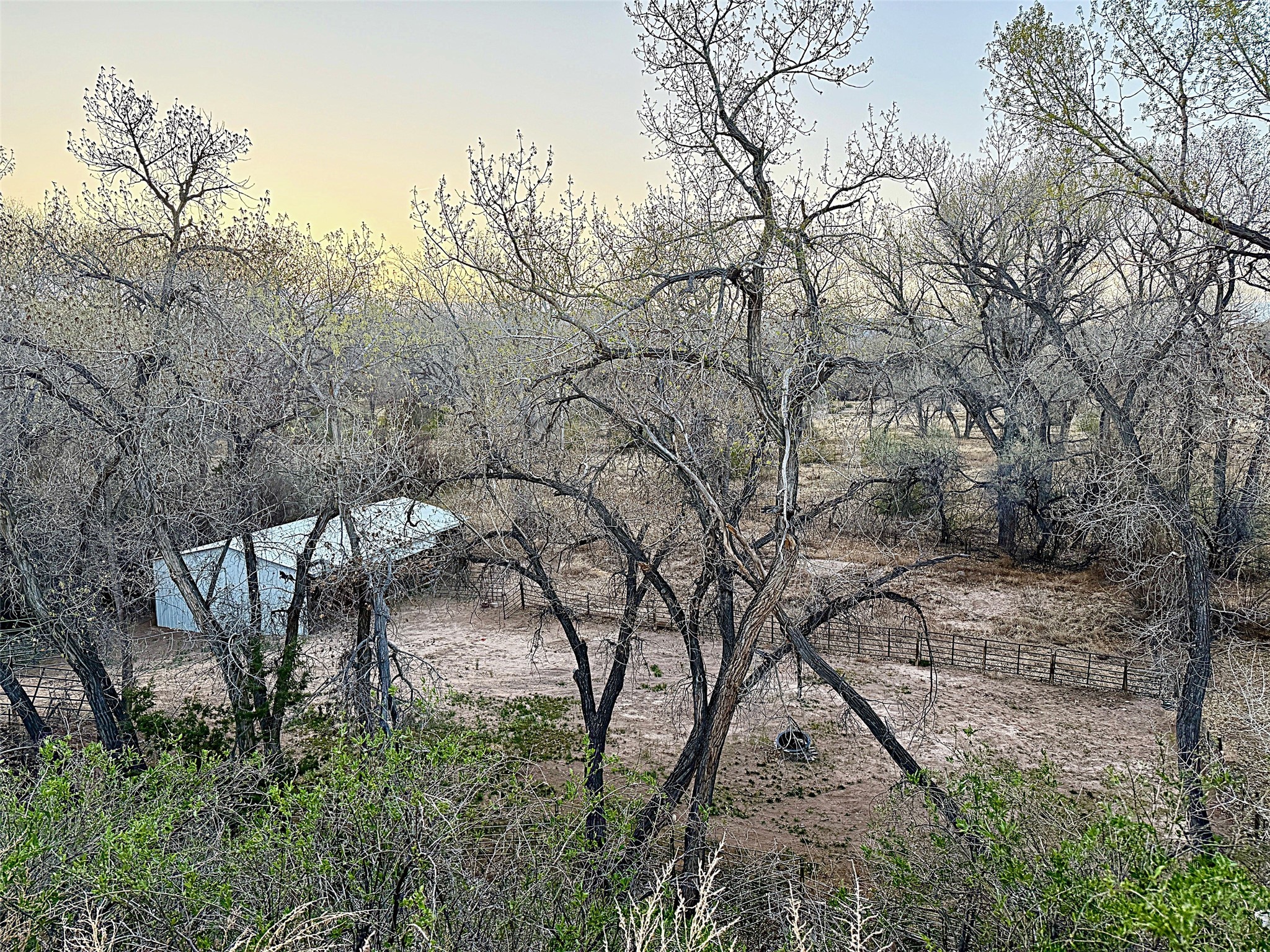 Motivated Seller! Tucked away at the peaceful southside of La Mesilla, this beautifully positioned property borders the tranquil Santa Clara tribes Bosque. The home features a spacious 3-bedroom, 2-bathroom design set on a full acre of land, complete with a barn with individual side access. The barn, situated at the edge of the bosque, features two horse stalls, divided pens, and three designated storage areas.The upstairs primary bedroom includes an ensuite bathroom and a private porch, perfectly placed to capture breathtaking views of Black Mesa and the surrounding bosque. The open living area is highlighted by a high-pitched ceiling, creating an inviting and airy space ideal for gatherings or quiet relaxation. For those seeking a private retreat in a serene setting bordered by mature trees, this property is a rare find you have been needing.