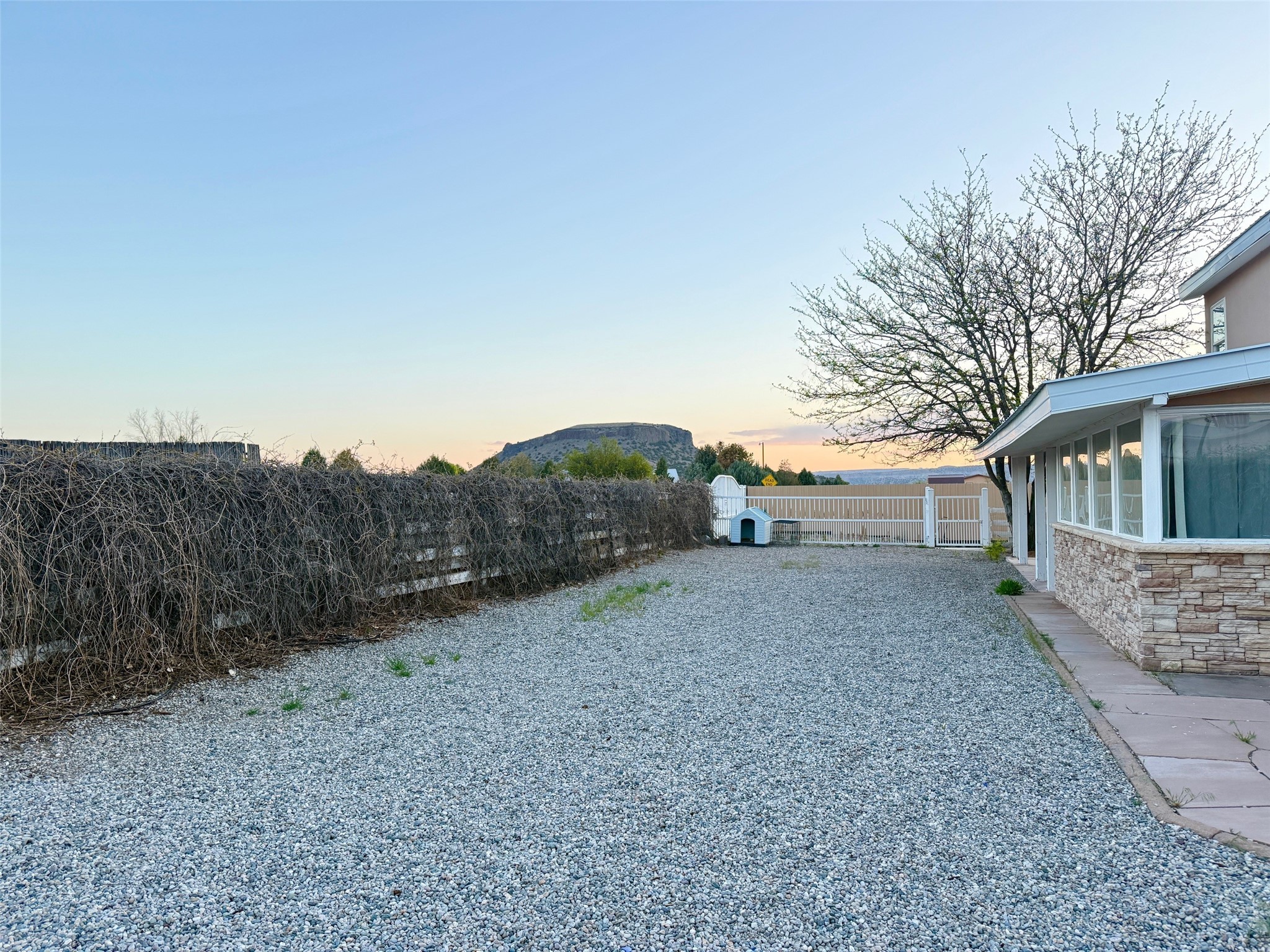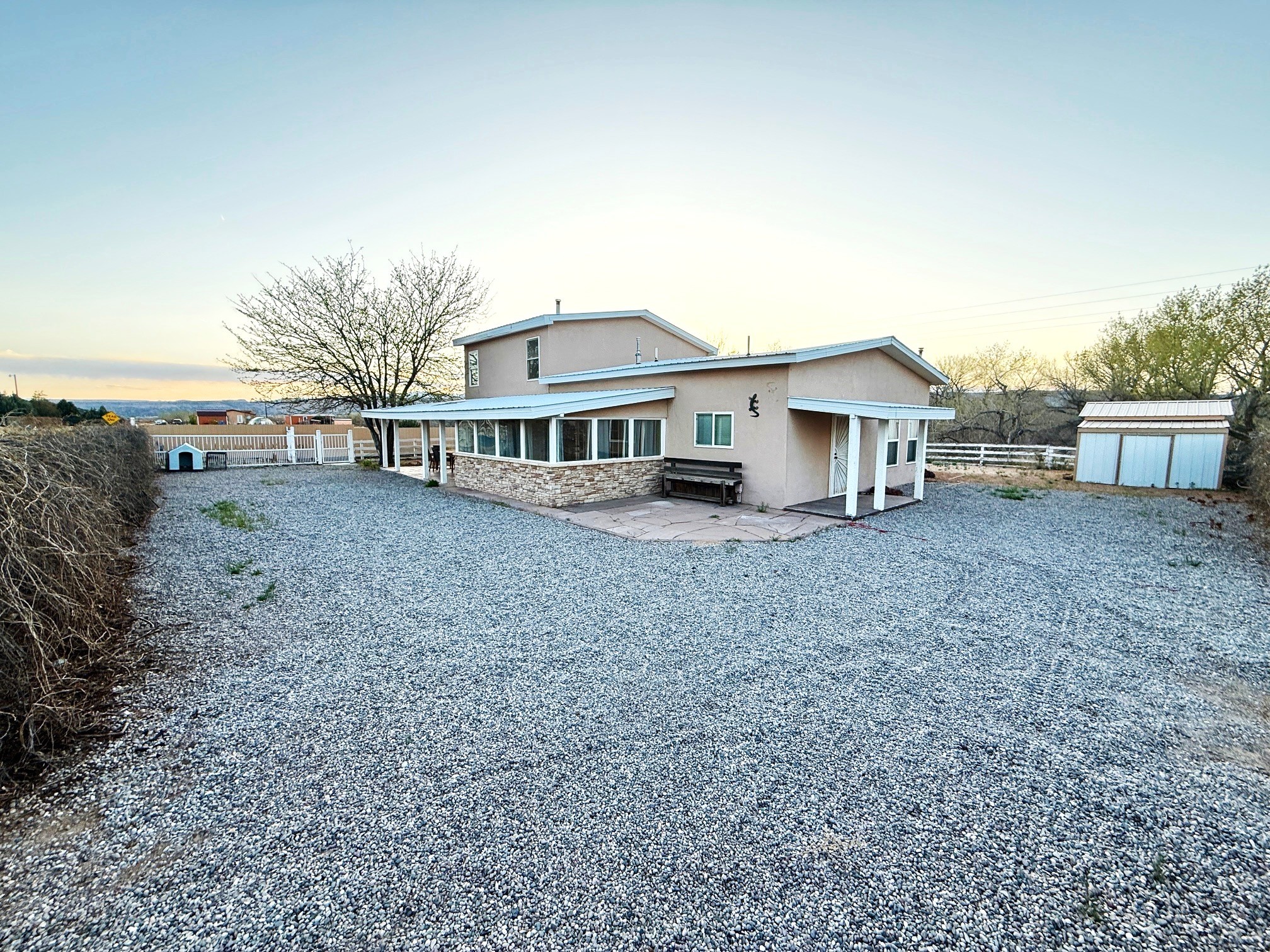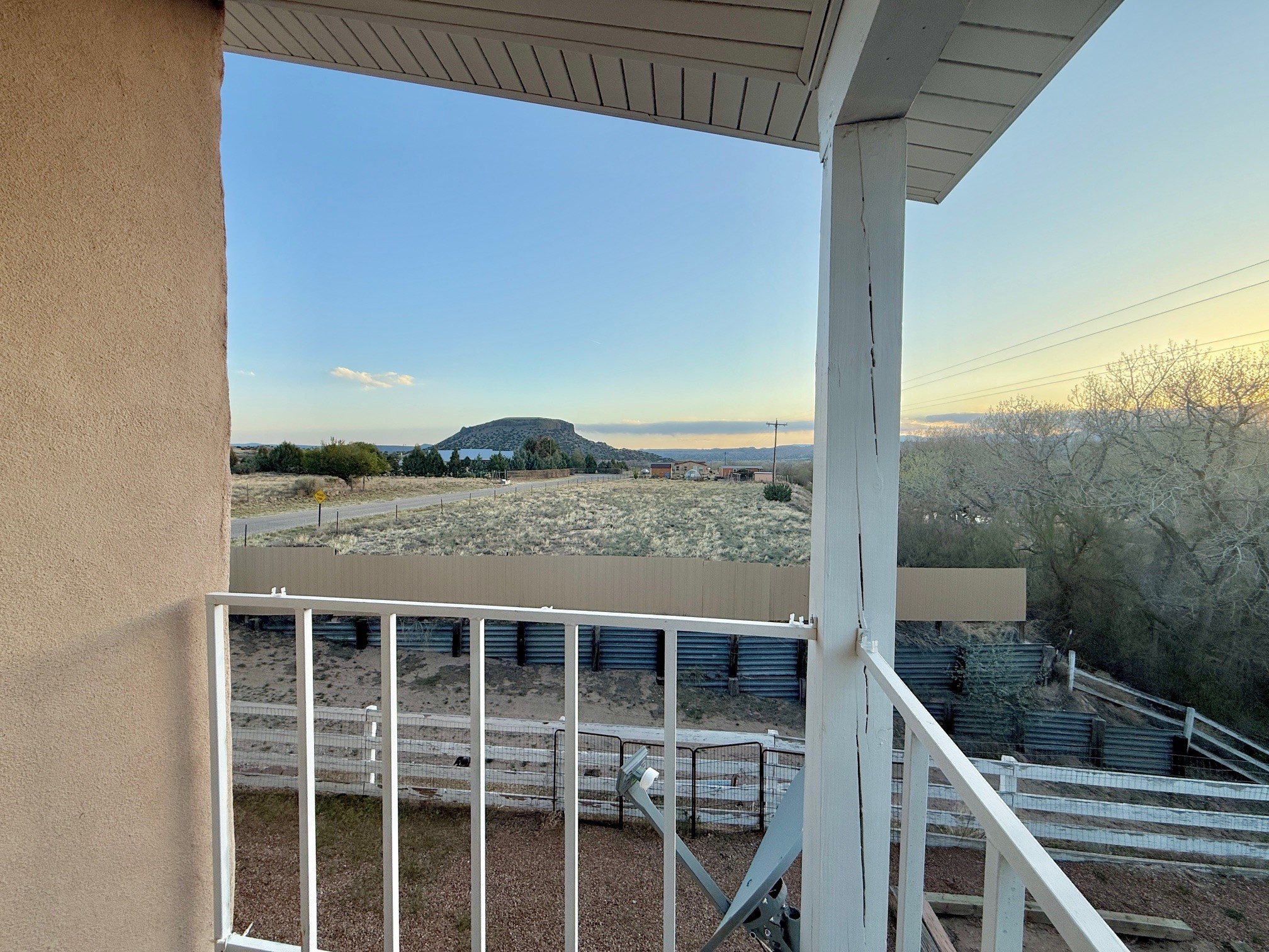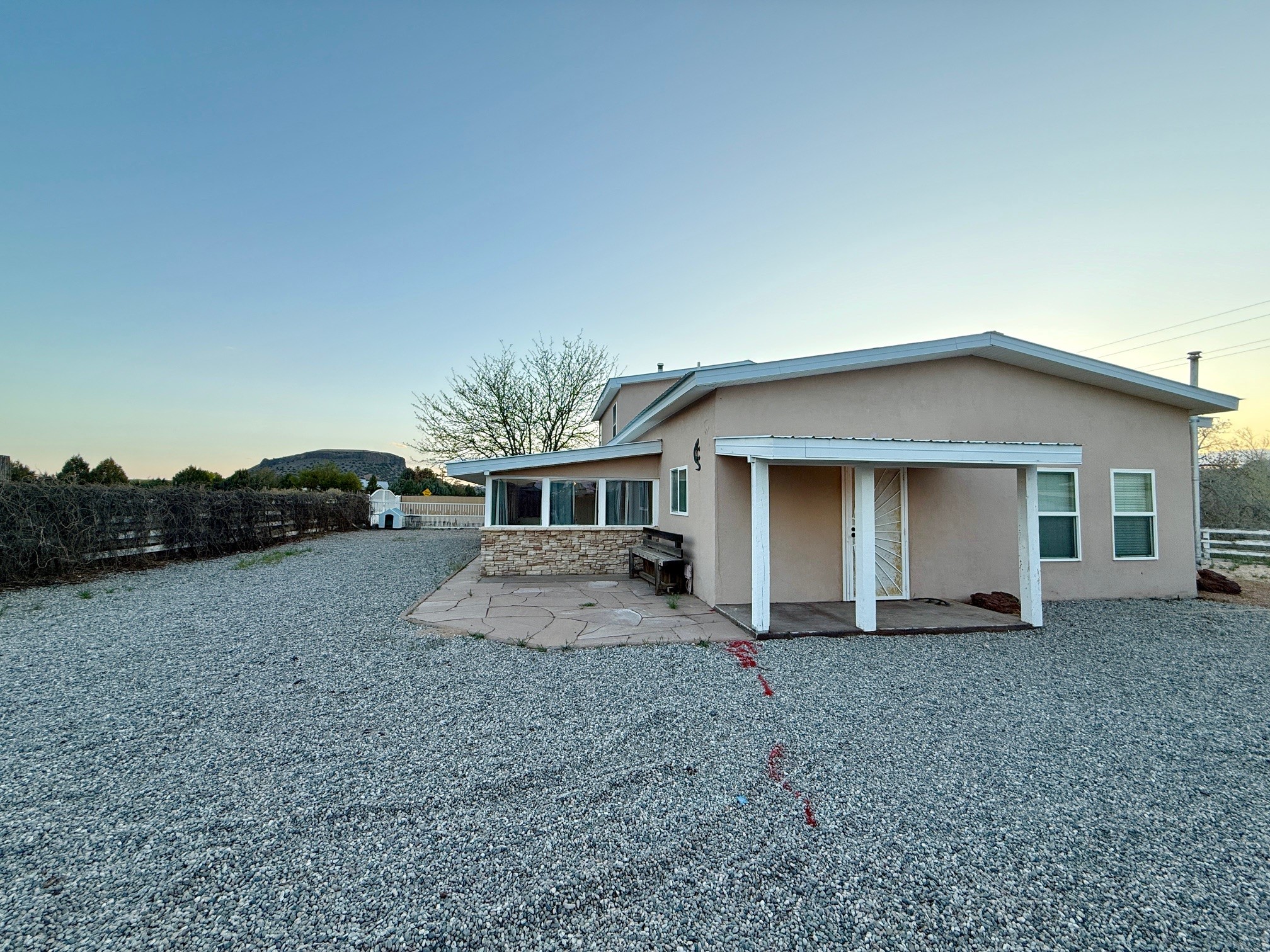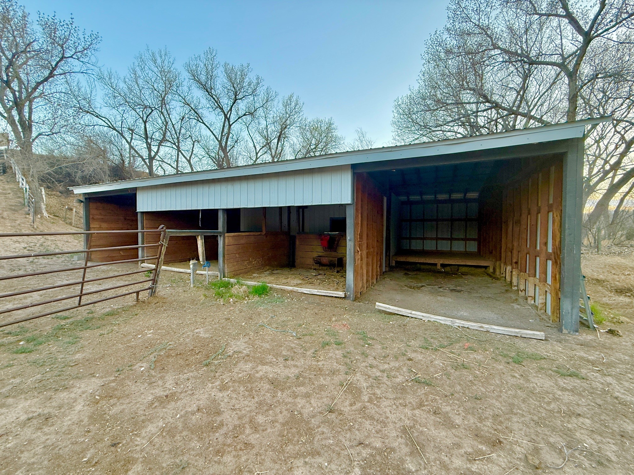 Motivated Seller! Tucked away at the peaceful southside of La Mesilla, this beautifully positioned property borders the tranquil Santa Clara tribes Bosque. The home features a spacious 3-bedroom, 2-bathroom design set on a full acre of land, complete with a barn with individual side access. The barn, situated at the edge of the bosque, features two horse stalls, divided pens, and three designated storage areas.The upstairs primary bedroom includes an ensuite bathroom and a private porch, perfectly placed to capture breathtaking views of Black Mesa and the surrounding bosque. The open living area is highlighted by a high-pitched ceiling, creating an inviting and airy space ideal for gatherings or quiet relaxation. For those seeking a private retreat in a serene setting bordered by mature trees, this property is a rare find you have been needing.