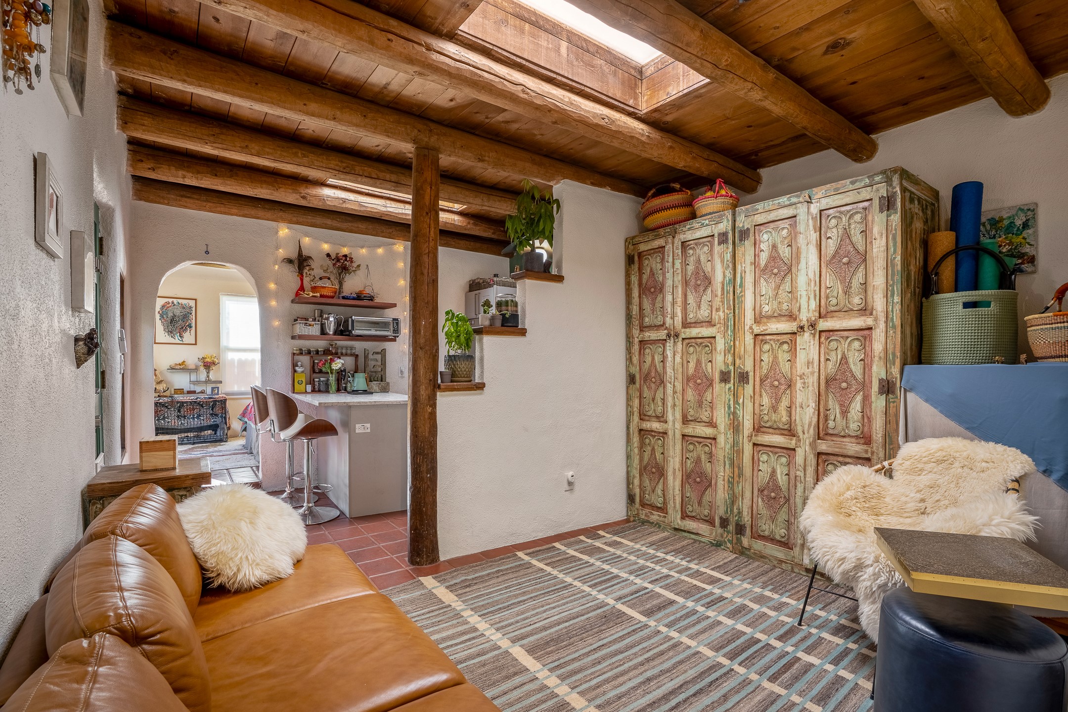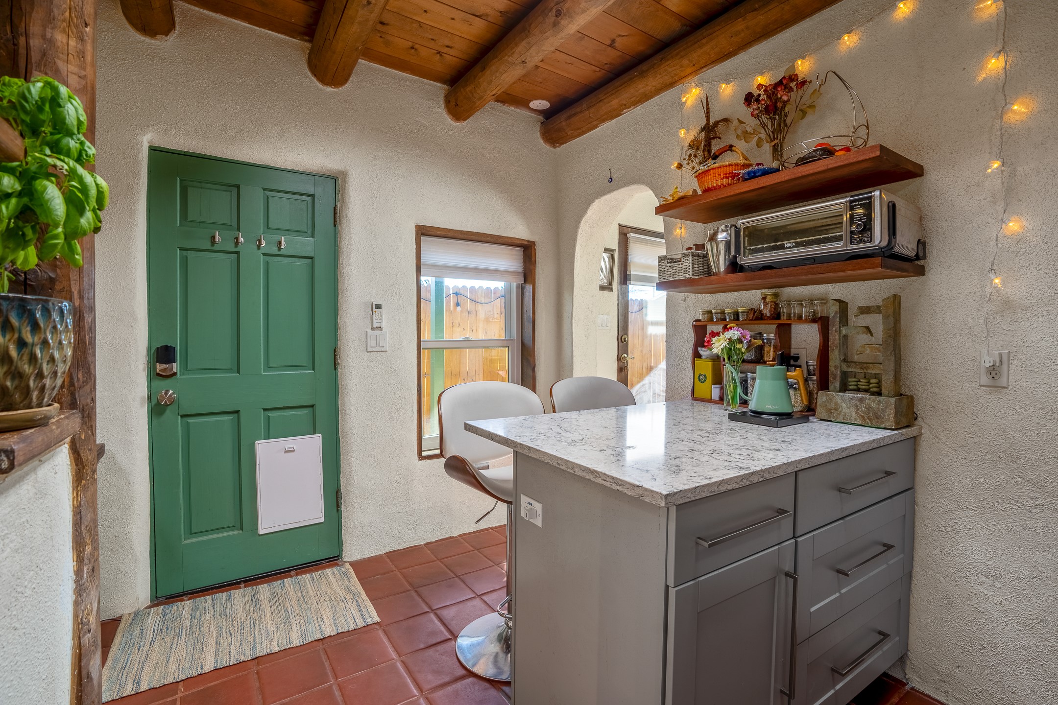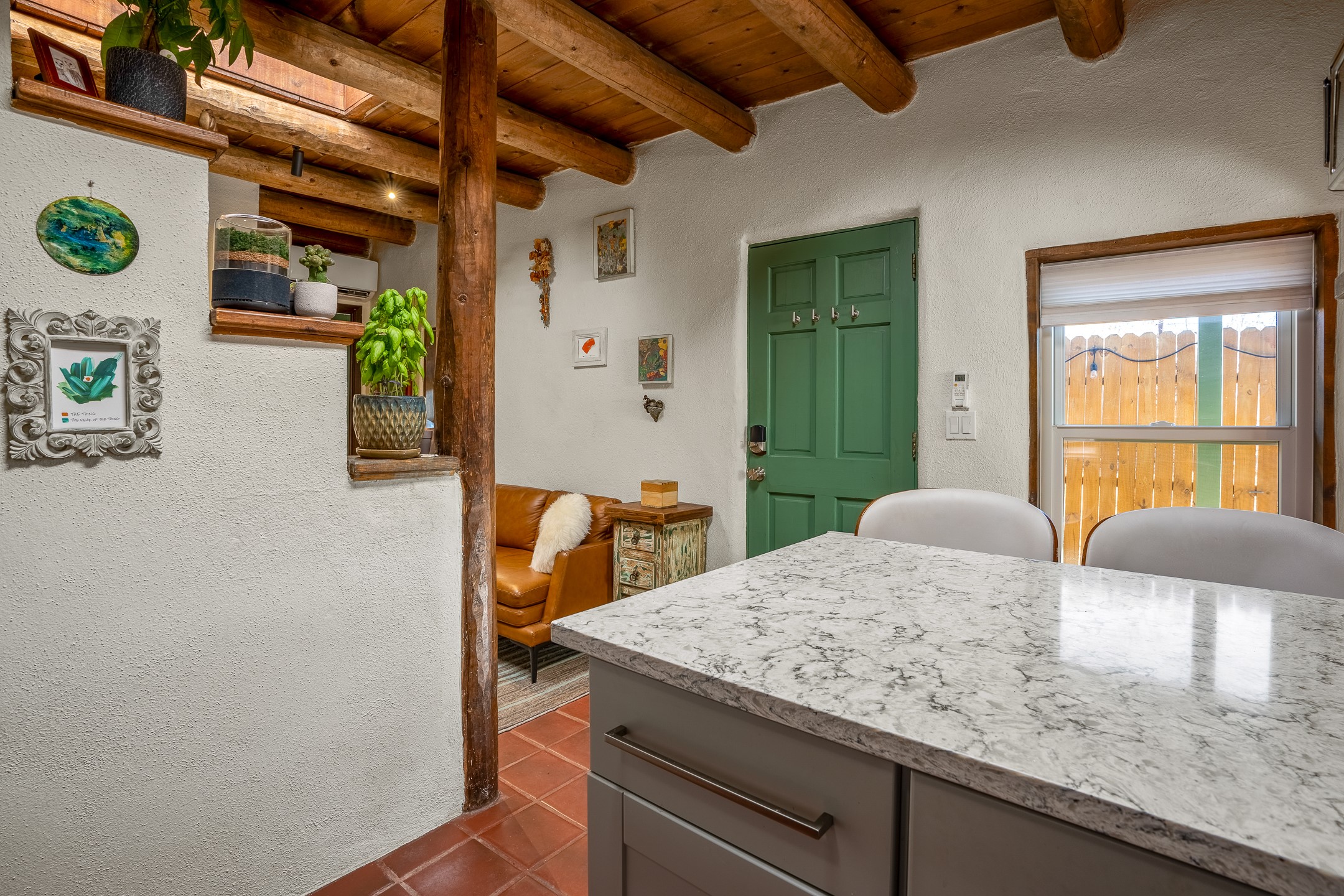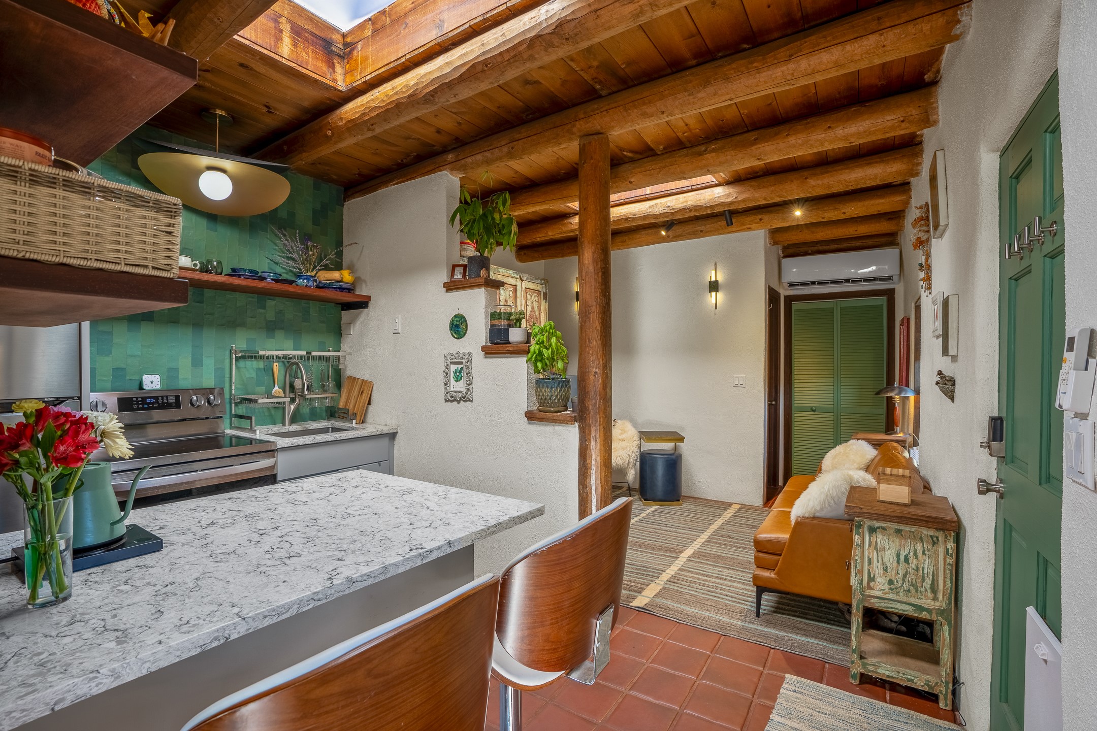 Nestled at the end of a private drive and just minutes from Santa Fe's vibrant Railyard District, this beautifully renovated 1920s casita offers a perfect blend of historic charm and modern sophistication. Whether you're dreaming of your own piece of Santa Fe to call home or seeking a savvy investment, this 1-bedroom, 1-bathroom treasure is brimming with possibilities.From the moment you step inside, you're embraced by Santa Fe's timeless character--exposed vigas, skylights, and an inviting kiva fireplace create a warm and welcoming atmosphere. The thoughtfully designed kitchen showcases a modern aesthetic, featuring designer tiles, stylish lighting, open wooden shelving, and sleek stainless steel appliances. Granite countertops with bar seating add functionality and flair, making this space ideal for casual meals or intimate gatherings.The cozy living room, bathed in natural light, seamlessly connects to the kitchen, ensuring effortless entertaining. The renovated bathroom is stylish in its simplicity with its high ceilings, vigas, and an elegant walk-in shower. Whether you're looking for an investment property or a serene sanctuary to call home, this delightful casita offers a fresh start in Santa Fe's enchanting real estate market. Don't miss the chance to experience the charm and opportunity this home embodies!