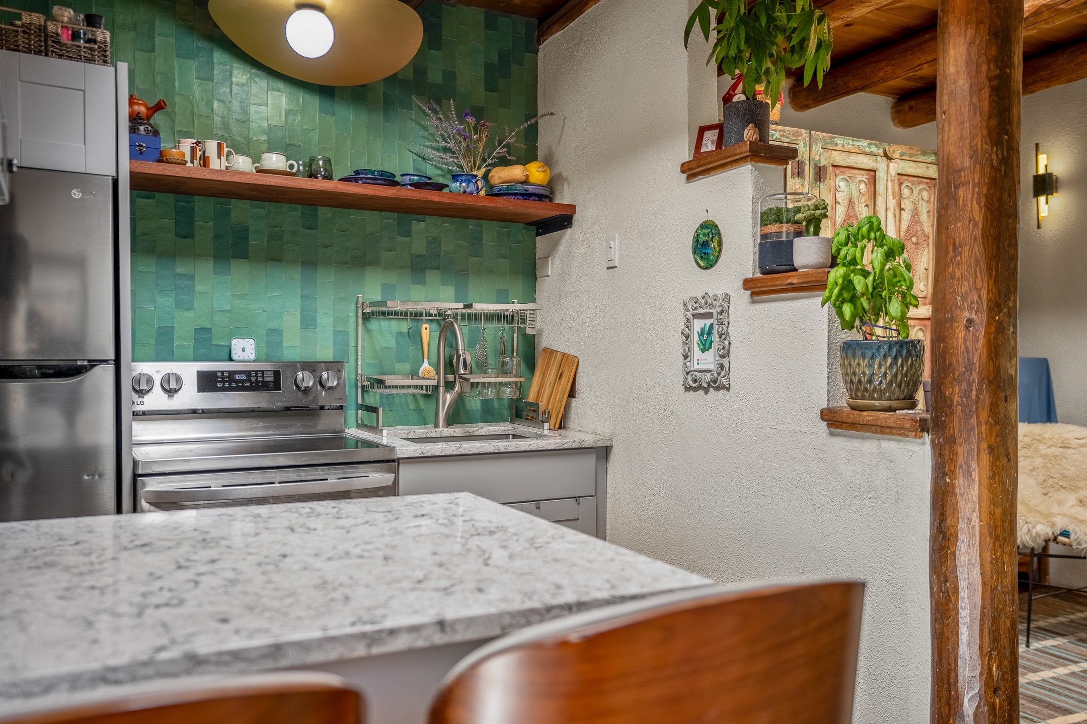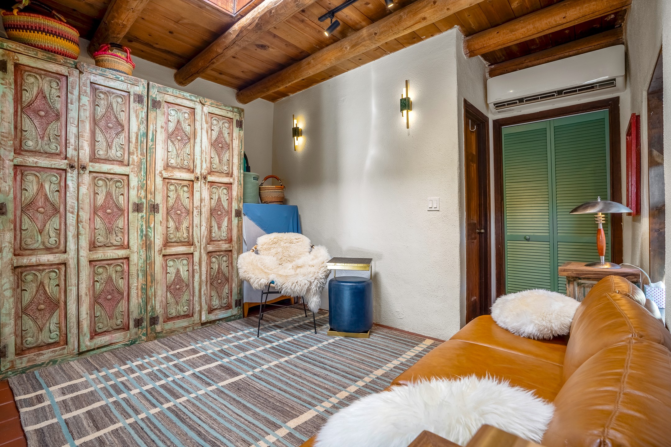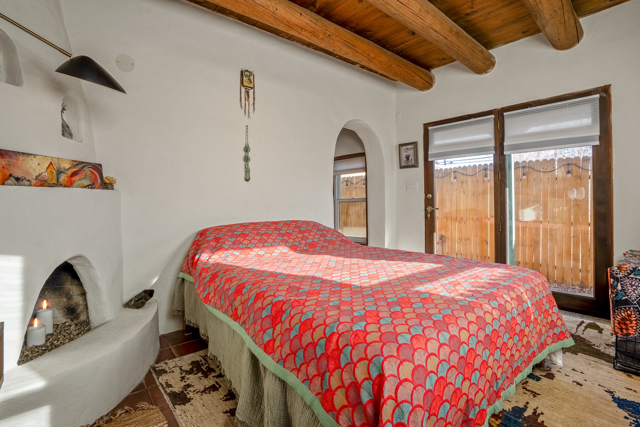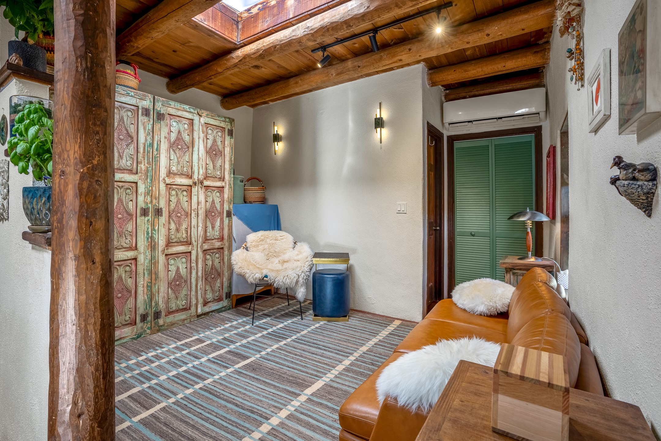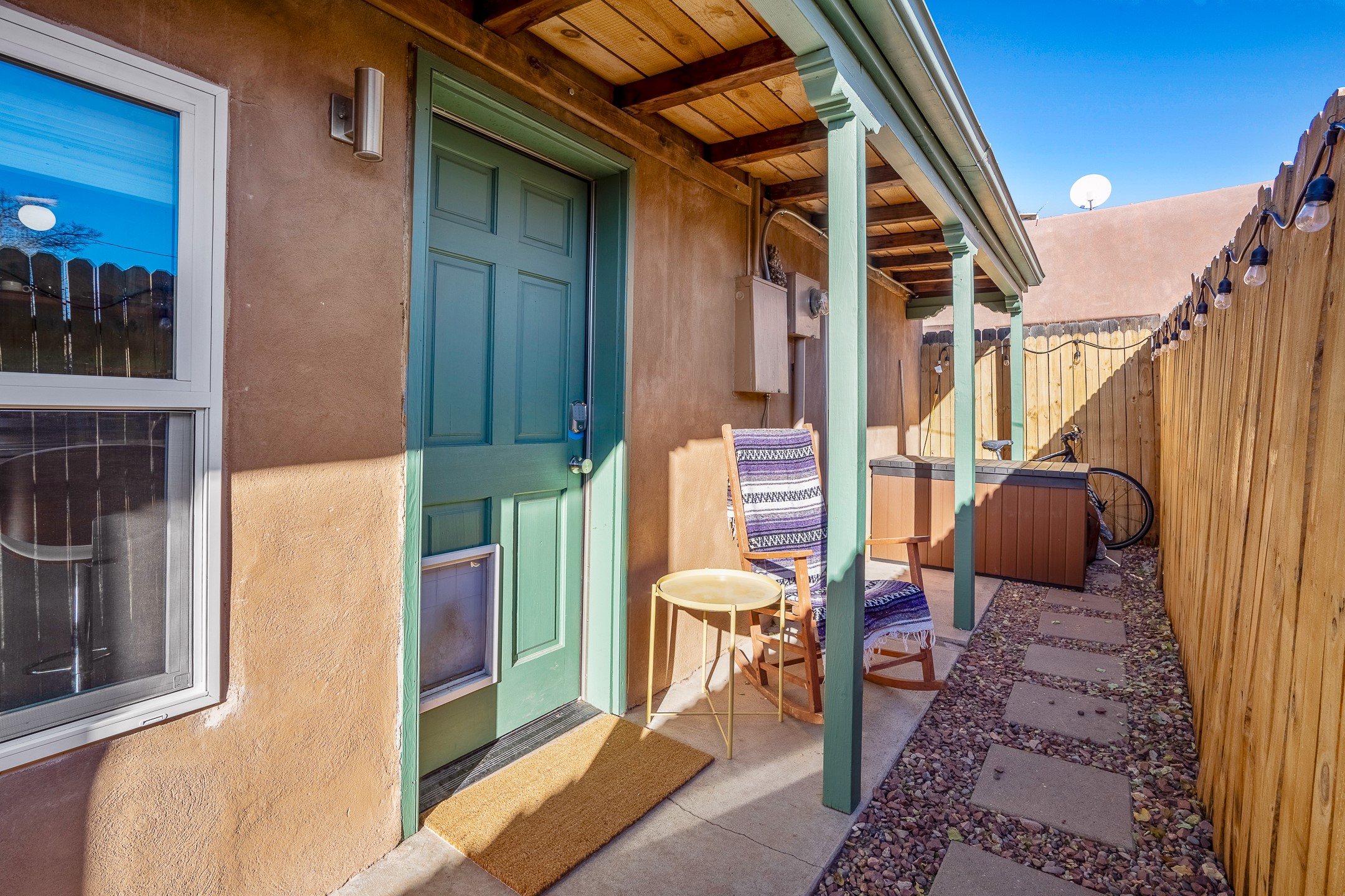 Nestled at the end of a private drive and just minutes from Santa Fe's vibrant Railyard District, this beautifully renovated 1920s casita offers a perfect blend of historic charm and modern sophistication. Whether you're dreaming of your own piece of Santa Fe to call home or seeking a savvy investment, this 1-bedroom, 1-bathroom treasure is brimming with possibilities.From the moment you step inside, you're embraced by Santa Fe's timeless character--exposed vigas, skylights, and an inviting kiva fireplace create a warm and welcoming atmosphere. The thoughtfully designed kitchen showcases a modern aesthetic, featuring designer tiles, stylish lighting, open wooden shelving, and sleek stainless steel appliances. Granite countertops with bar seating add functionality and flair, making this space ideal for casual meals or intimate gatherings.The cozy living room, bathed in natural light, seamlessly connects to the kitchen, ensuring effortless entertaining. The renovated bathroom is stylish in its simplicity with its high ceilings, vigas, and an elegant walk-in shower. Whether you're looking for an investment property or a serene sanctuary to call home, this delightful casita offers a fresh start in Santa Fe's enchanting real estate market. Don't miss the chance to experience the charm and opportunity this home embodies!