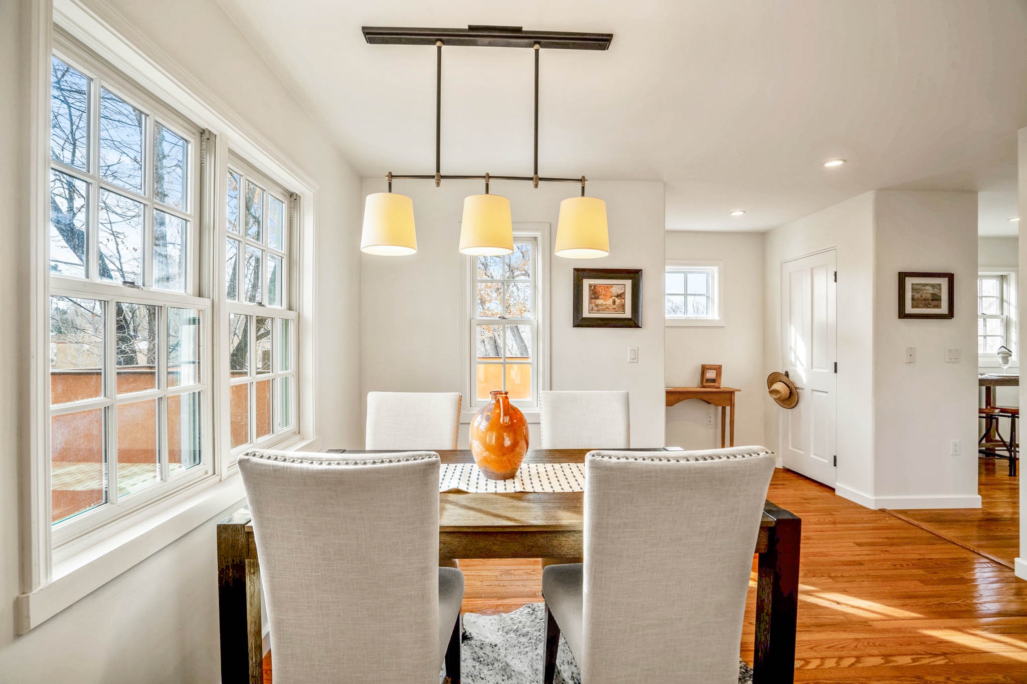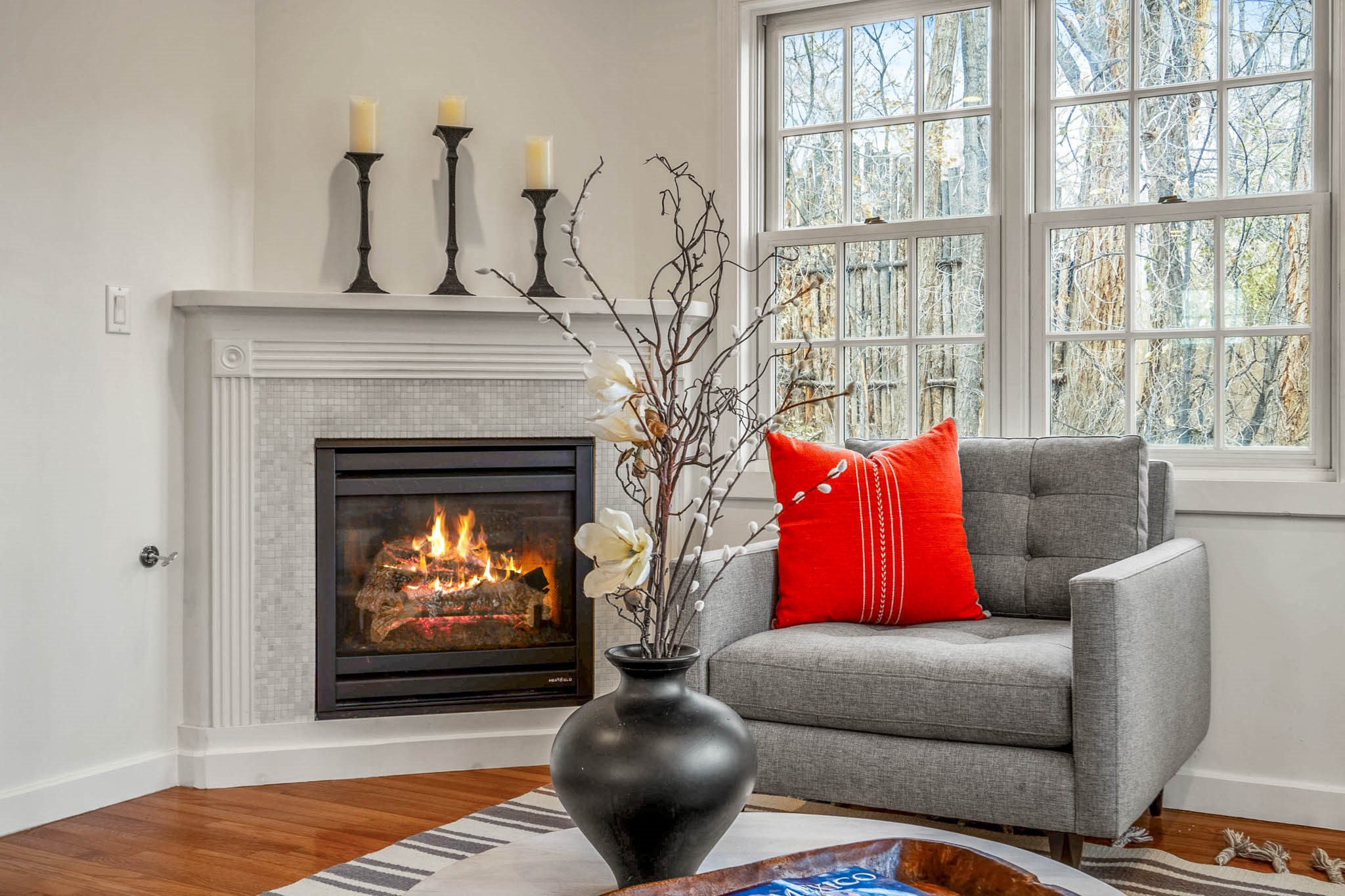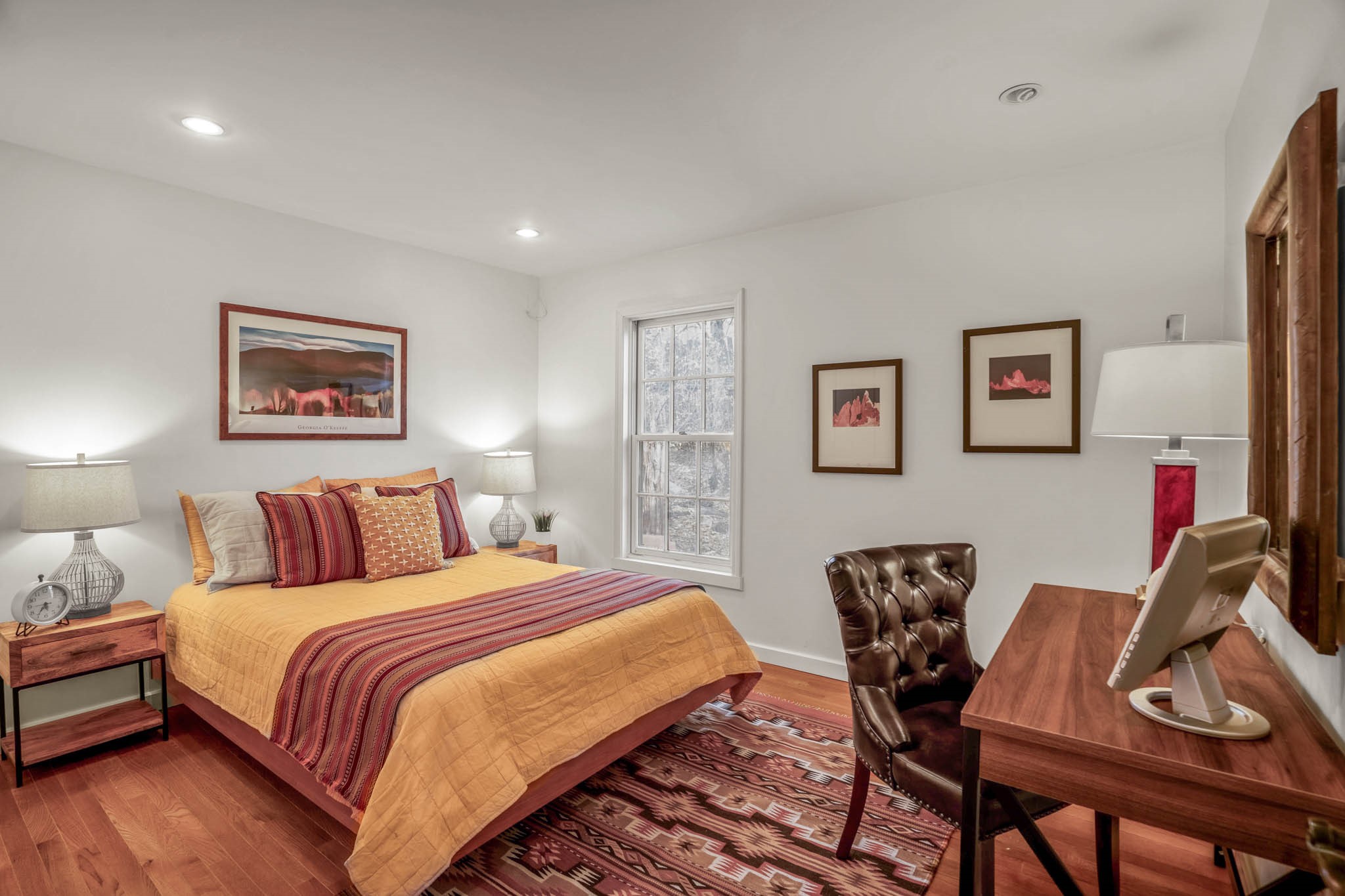 A treasure in Santa Fe's Historic Eastside, this beautiful 1 bedroom/1 bathroom condo, is located across from the Santa Fe River and offers a picturesque view of the river and its towering cottonwoods. Upon entering the home, one experiences a feeling of elegance with solid oak flooring throughout, divided light windows and a corner gas fireplace that enhances the ambiance. The kitchen has stainless steel Kitchen Aid appliances, open shelving and a sweet breakfast nook. In keeping with the level of this property's excellence, the bathroom was renovated in 2020 and has wood plank tile flooring and a deep soaking tub. The spacious bedroom is on the NorthEast side of the property, offering great privacy and serenity. More features: New roof in 2020, 1 designated parking space, forced air heating, refrigerated central air conditioning, an easy stroll to Canyon Rd. This wonderful home is your opportunity to experience living in Santa Fe's Historic Eastside.