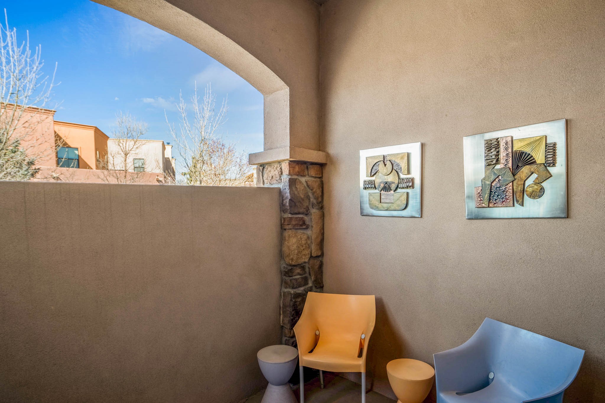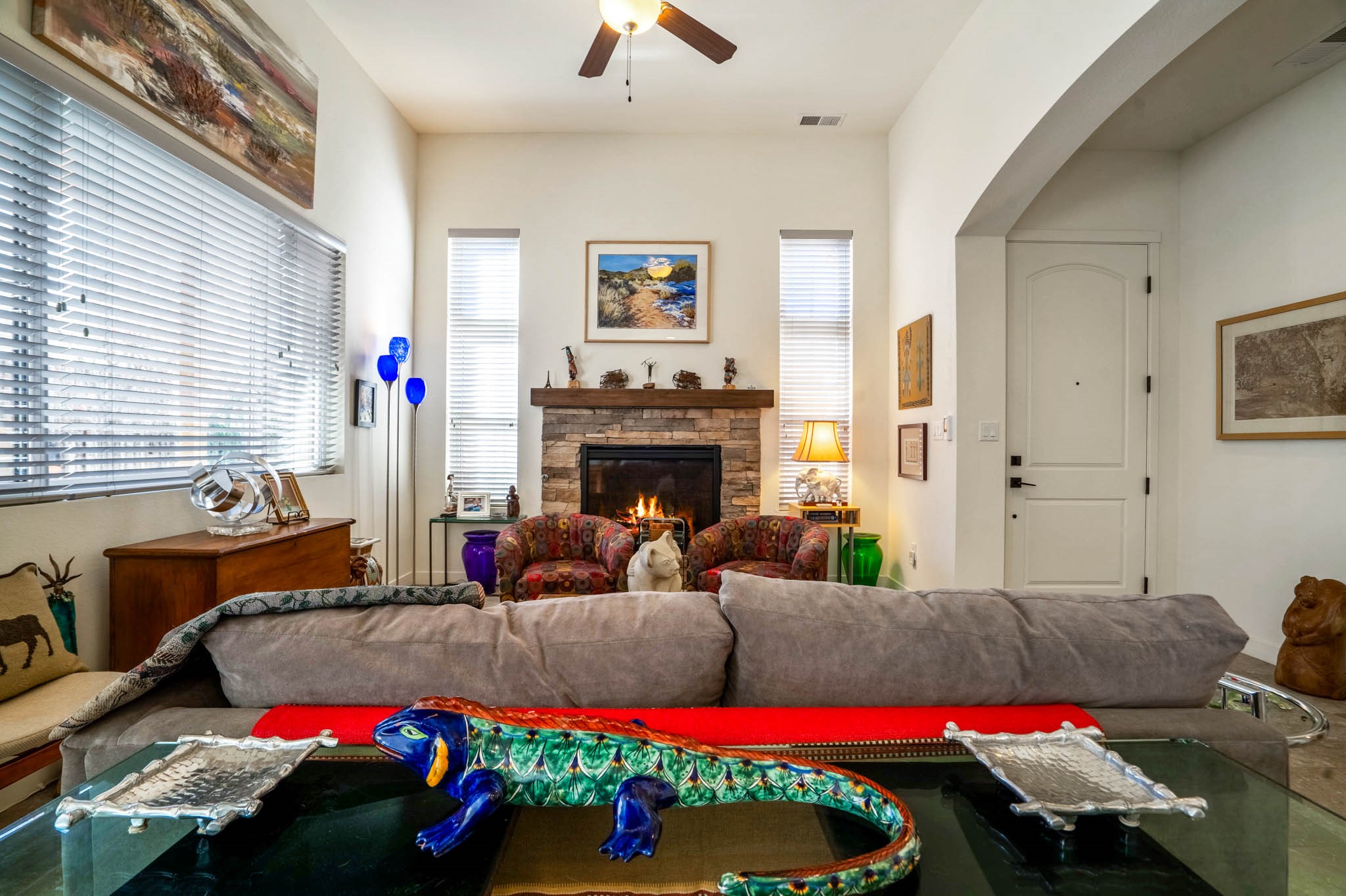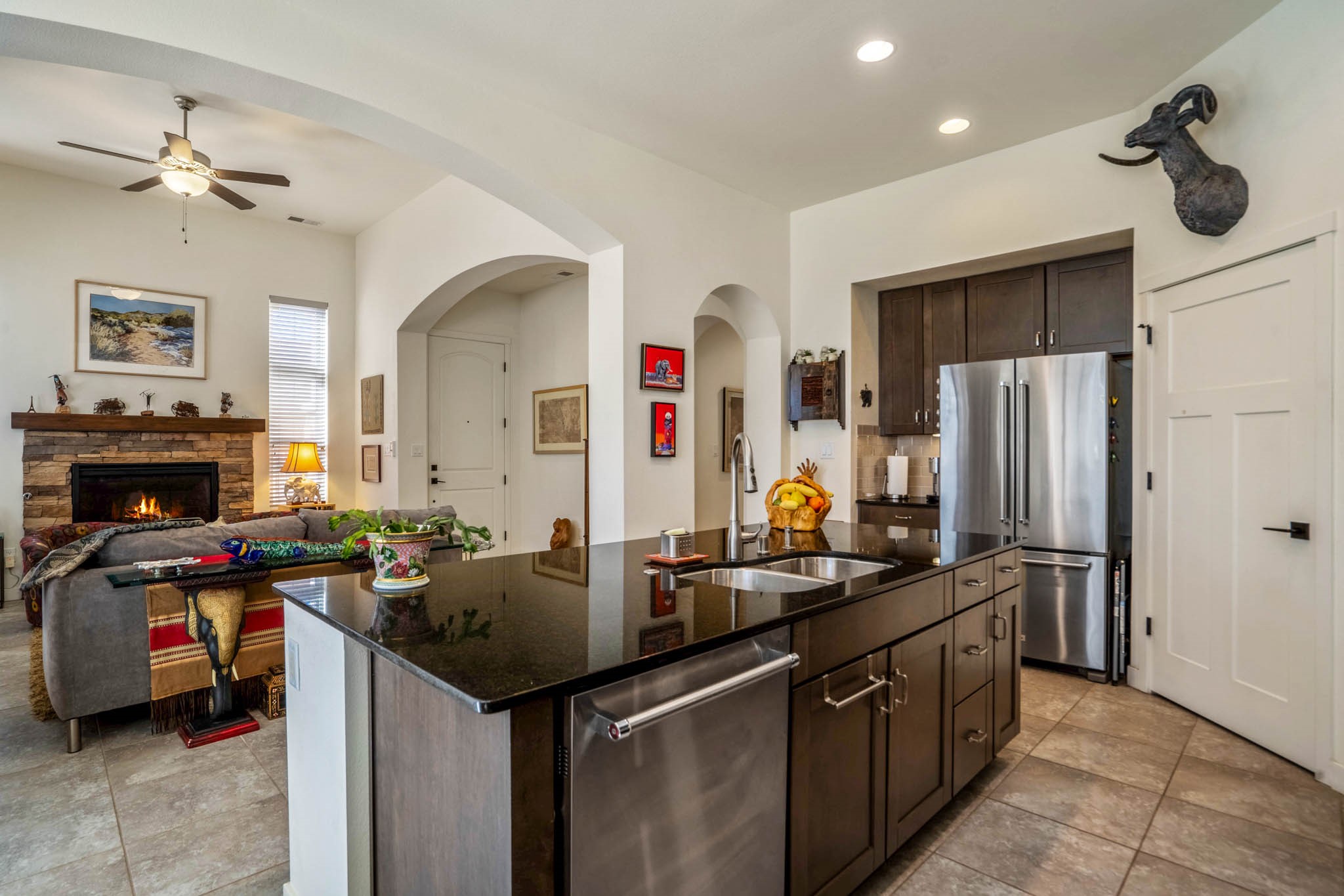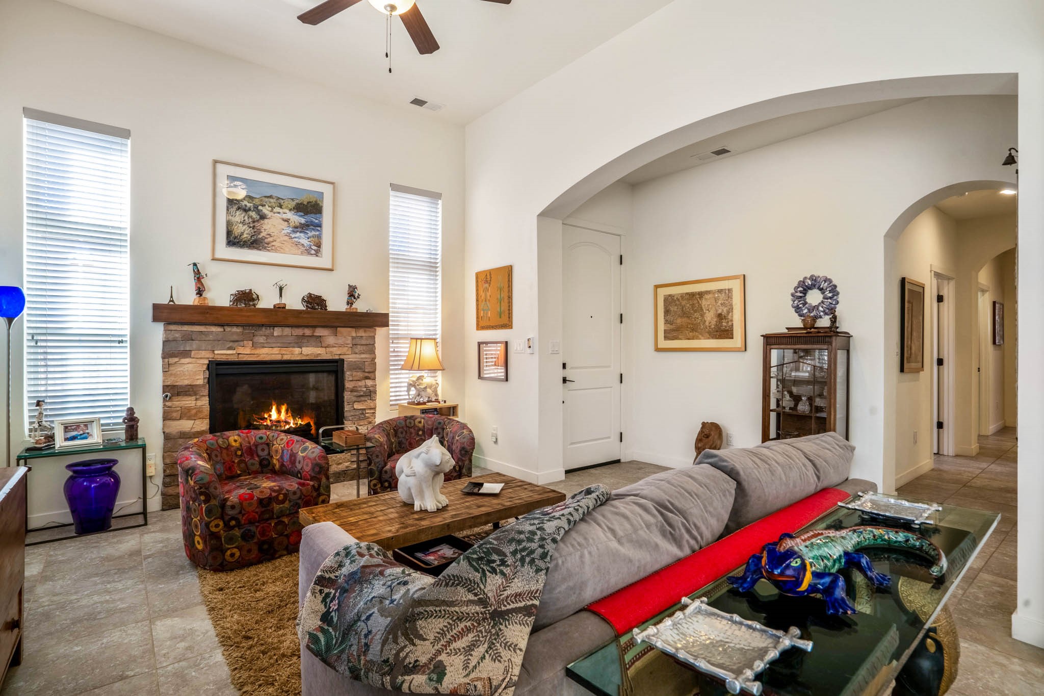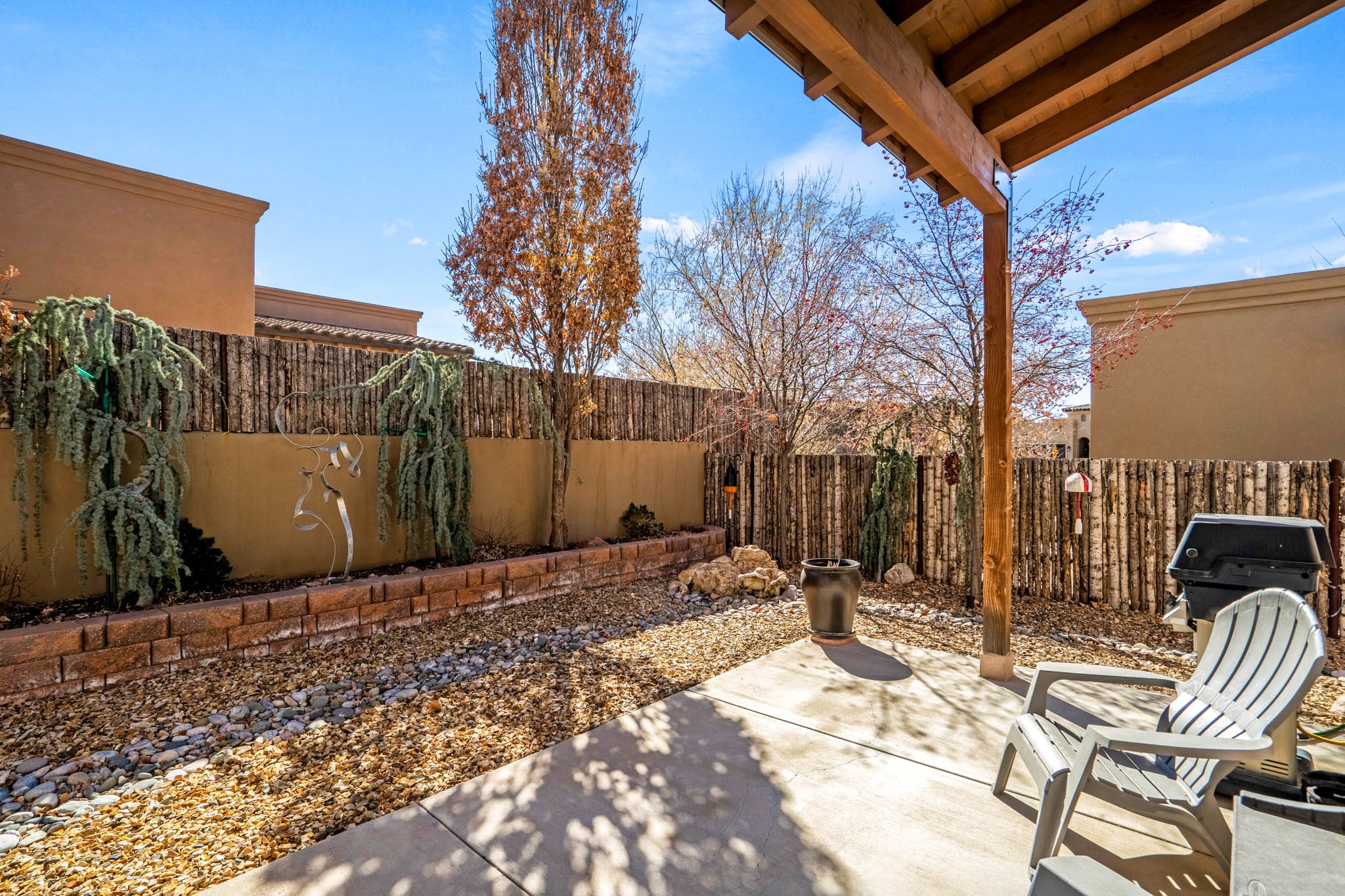 Experience the perfect blend of timeless architecture and modern convenience at 3175 Viale Cetona, a stunning 3-bedroom, 2-bath home in a gated community. From the moment you step inside, you'll be greeted by soaring high ceilings and premium finishes that create an atmosphere of refined elegance. The well-appointed kitchen is a chef's dream, featuring KitchenAid appliances, pull-out drawers in the cabinets, and ample space for cooking and entertaining. The primary suite offers a serene retreat with a walk-in shower, a spacious walk-in closet upgraded with an Easy Closet system, and thoughtful design touches throughout. Enjoy the beautifully landscaped courtyards, complete with a drip irrigation system, perfect for Santa Fe's sunny climate. Additional features include refrigerated air conditioning, a one-car garage with extra storage, and close proximity to shopping and easy travel access. This home combines luxurious comfort and practicality, making it an exceptional opportunity in a desirable Santa Fe community.