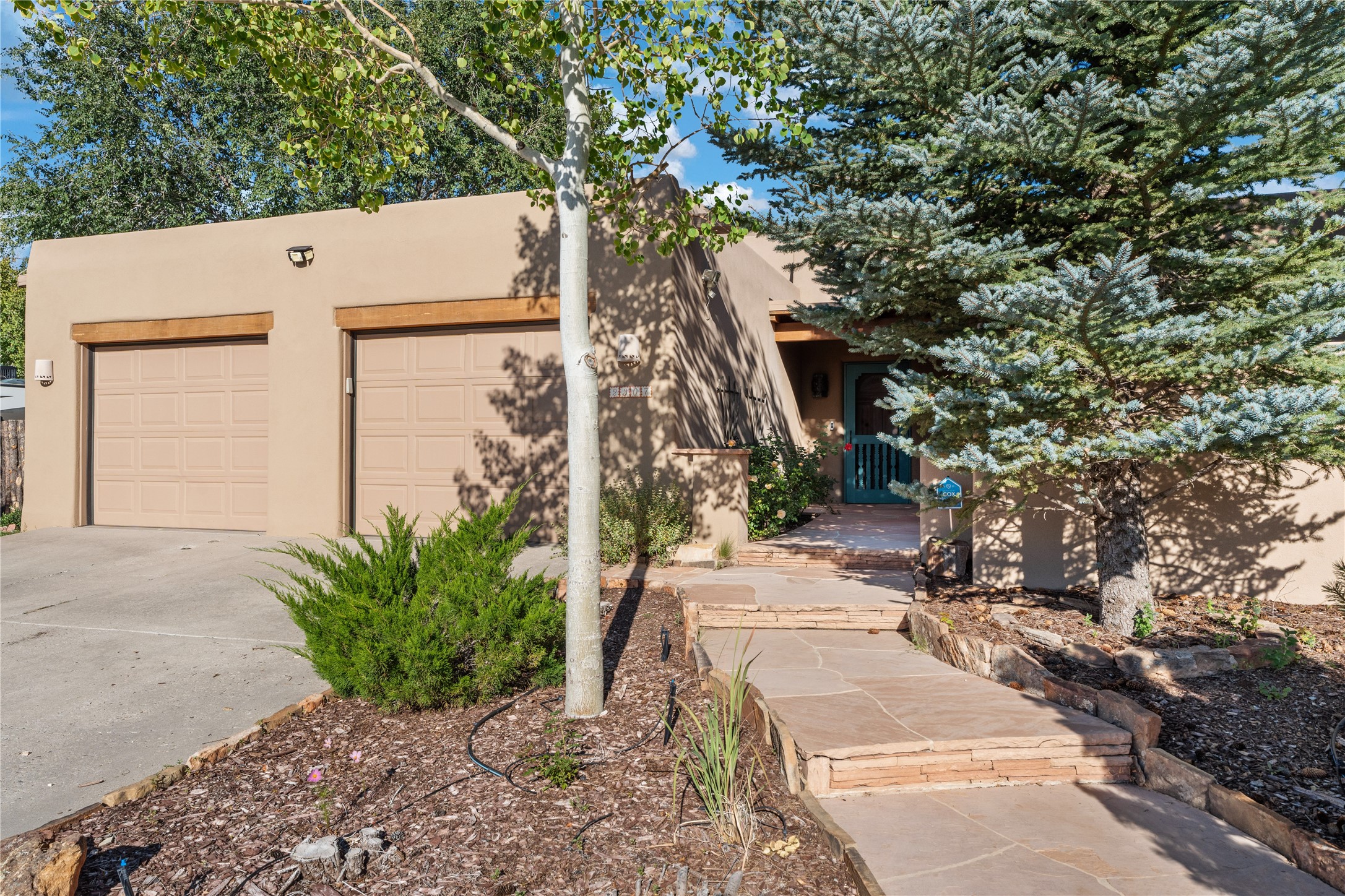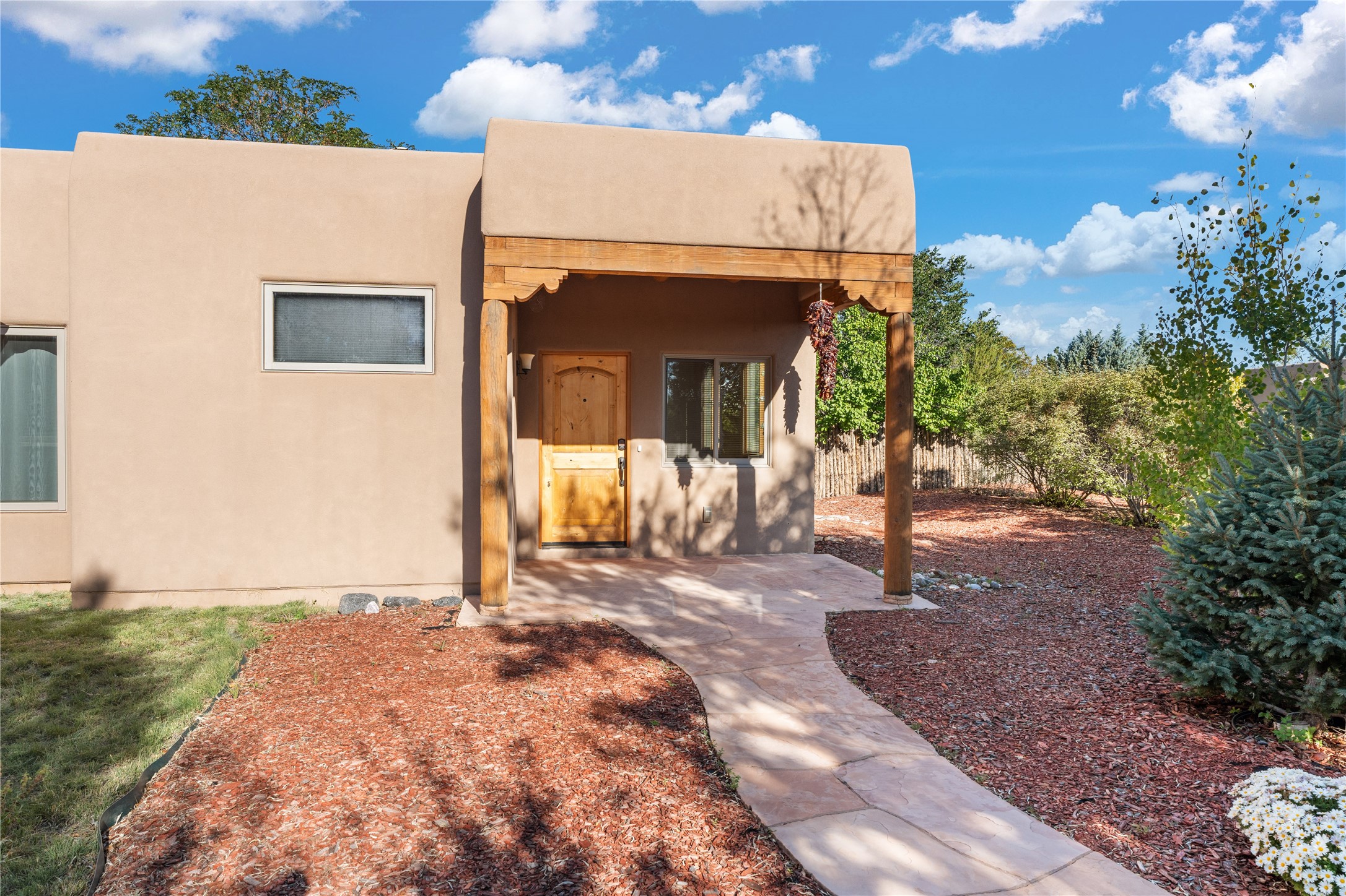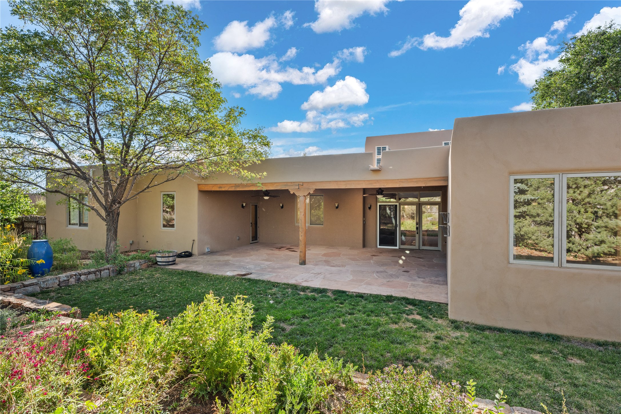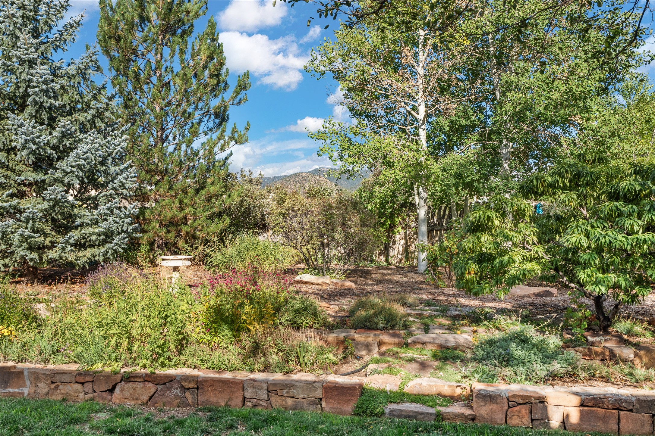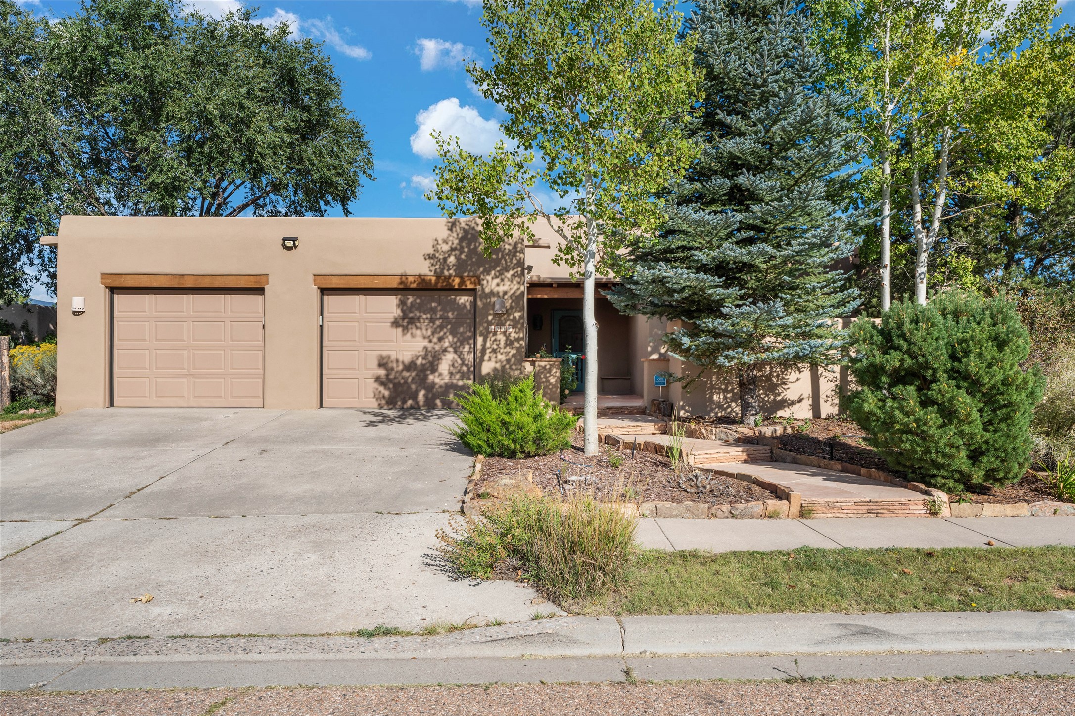 Tucked away off a serene cul-de-sac, this entirely single level, meticulous Santa Fe style home must be seen! Located on the city's lower east side near the medical district and St. Michael's High School, everything you need is a short drive away. The home is situated on a huge, beautifully landscaped lot with a peak of mountain views. For the enjoyment of your private sanctuary, there is a 455 sq. ft. portal with vigas and wood decking above and flagstone flooring below that is a true extension of your living space with Santa Fe's delightful climate many months of the year. The home is immaculate and offers incredible flexibility with a spacious studio or office addition. With a private entrance, this light and airy room with a multitude of windows could also function as a mother-in-law suite with a beautiful bathroom nearby featuring a walk-in shower. The living room boasts soaring ceilings with vigas and wood ceiling and an amazing kiva fireplace that commands attention. The primary bedroom is private and spacious and the remodeled bath with a gorgeous shower and huge walk-in closet will not disappoint. The home also features three other bedrooms with beautifully renovated guest bath. The kitchen is lovely with quartz counter tops and high end stainless steel appliances and more than sufficient storage for all your culinary needs. For your dining requirements, the home offers a charming breakfast nook replete with windows bringing the lovely outdoors in as well as a more formal dining space. There is a fabulous laundry room with cabinets, built in sink, and a window to the backyard. The home also features 7 nearly new mini-splits which offer both heating and cooling for year round comfort and a two car attached garage. This home is truly a gem! If you are seeking a home full of Santa Fe charm, character, and thoughtful upgrades- all in a prime location that allows for privacy and convenience, this property is not to be missed!