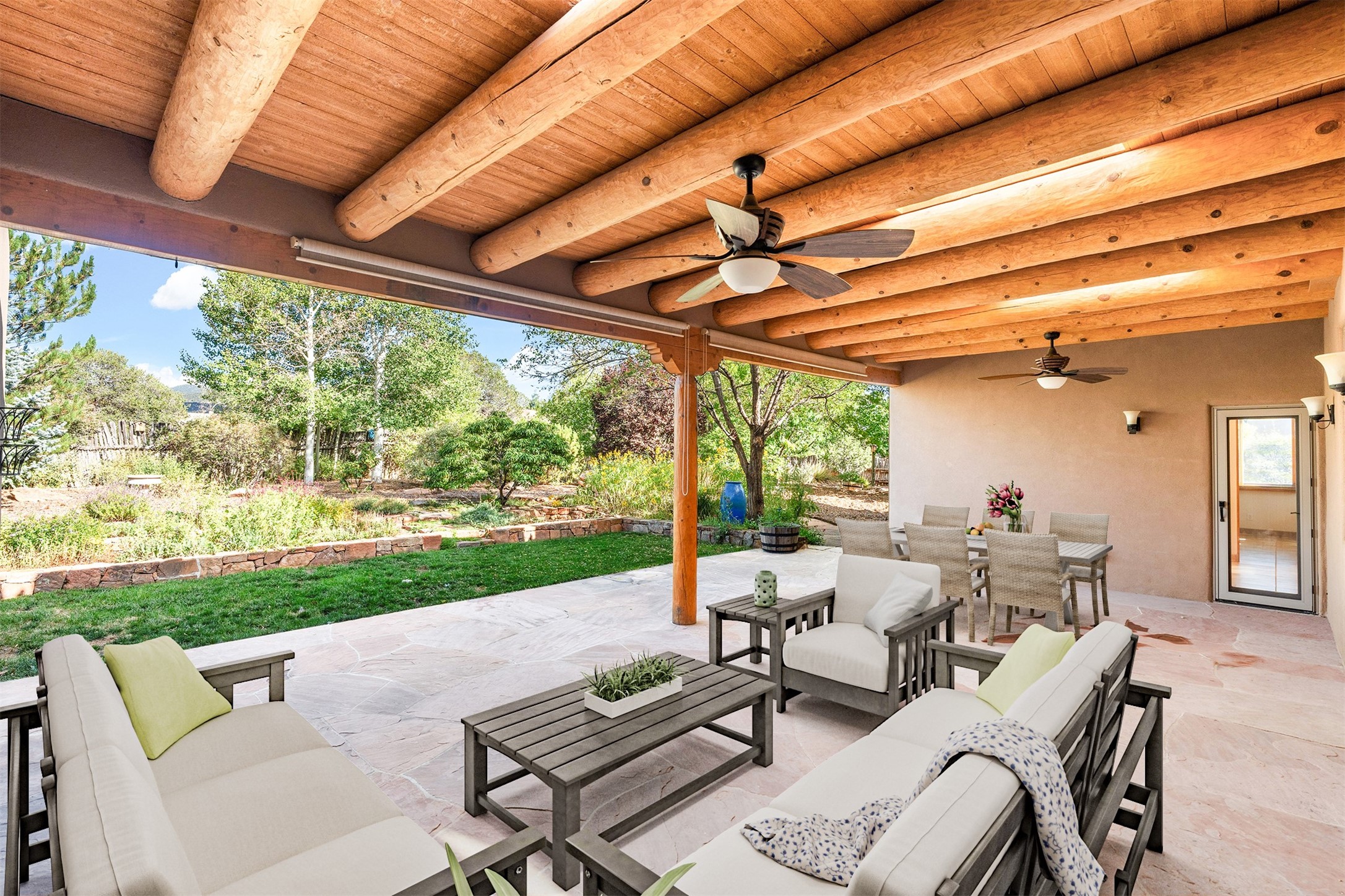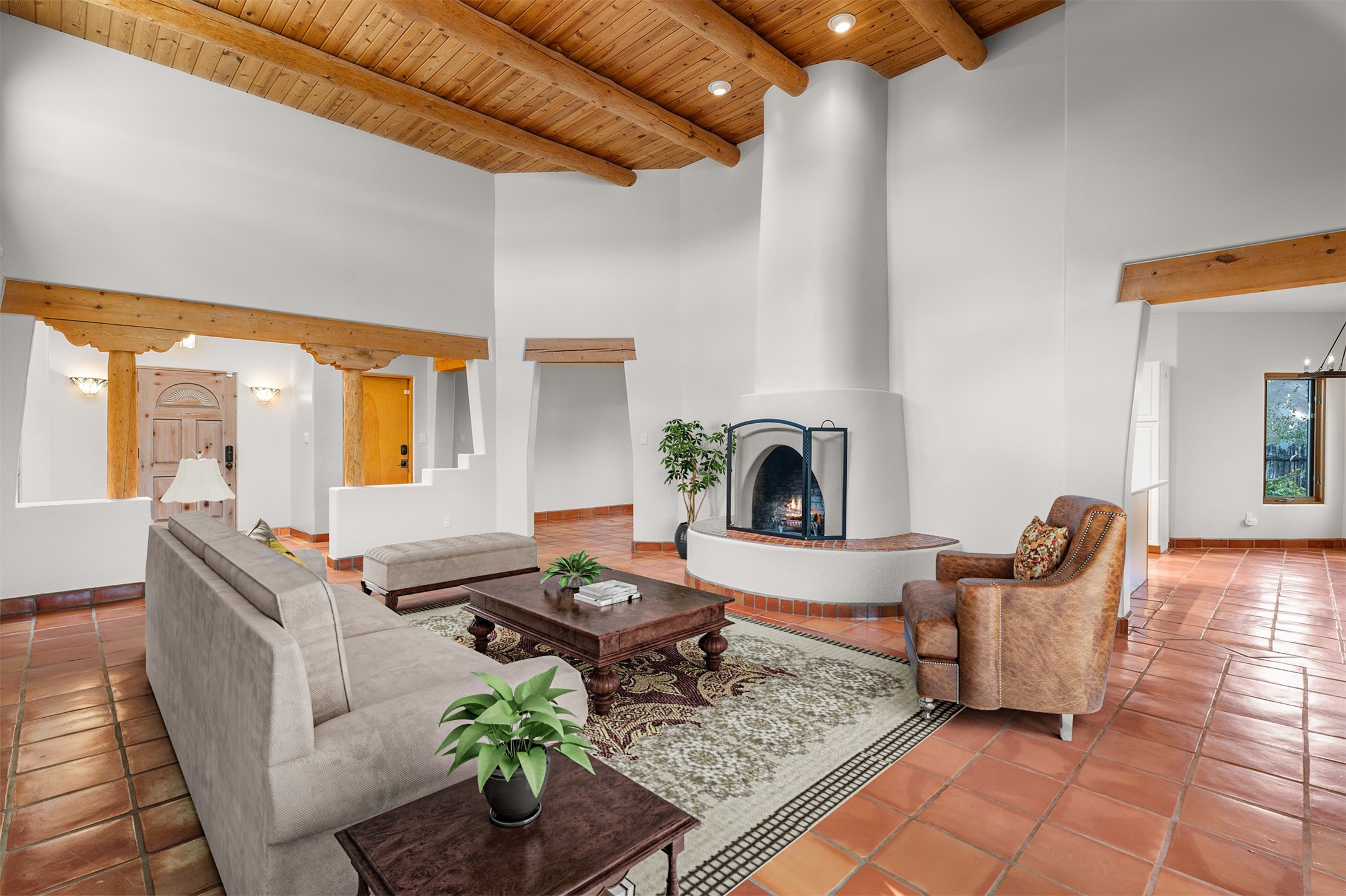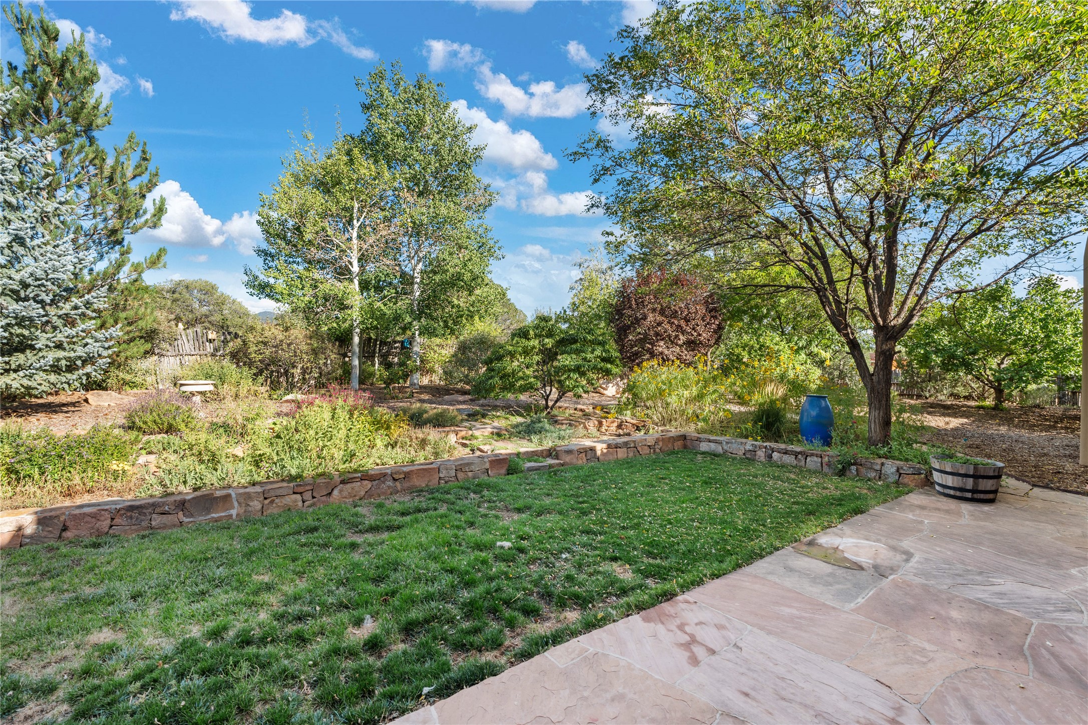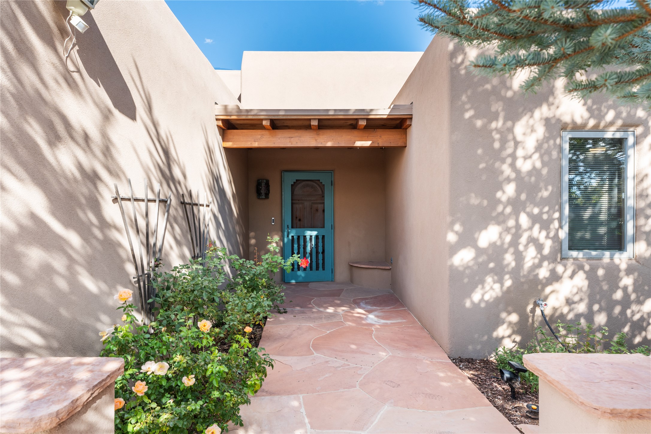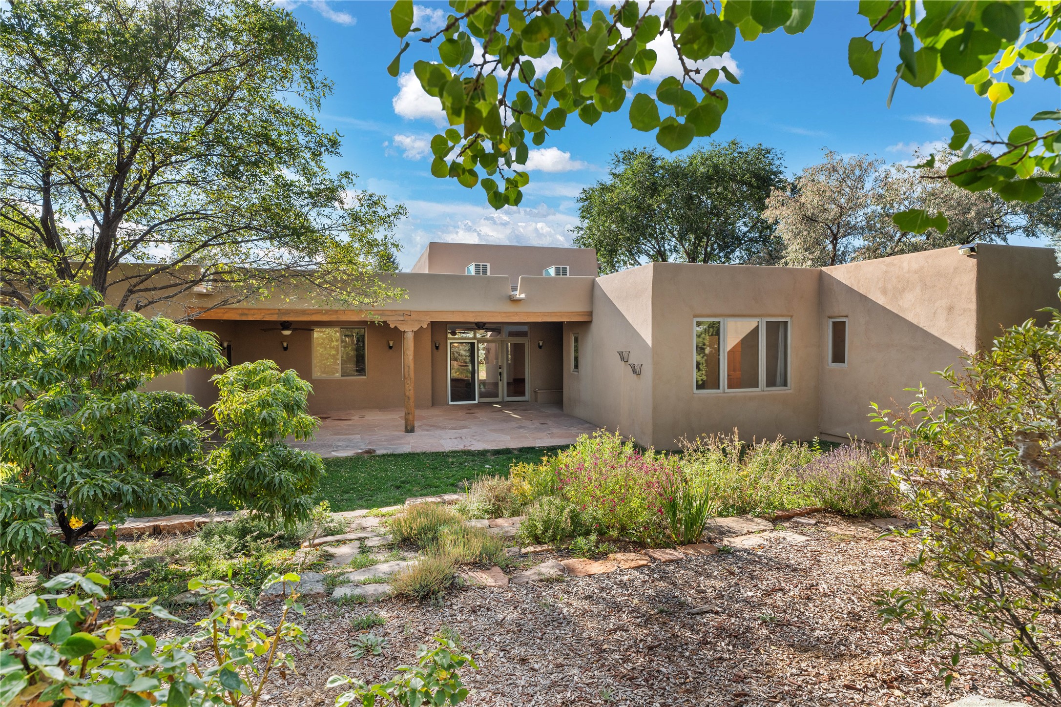 Tucked away off a serene cul-de-sac, this entirely single level, meticulous Santa Fe style home must be seen! Located on the city's lower east side near the medical district and St. Michael's High School, everything you need is a short drive away. The home is situated on a huge, beautifully landscaped lot with a peak of mountain views. For the enjoyment of your private sanctuary, there is a 455 sq. ft. portal with vigas and wood decking above and flagstone flooring below that is a true extension of your living space with Santa Fe's delightful climate many months of the year. The home is immaculate and offers incredible flexibility with a spacious studio or office addition. With a private entrance, this light and airy room with a multitude of windows could also function as a mother-in-law suite with a beautiful bathroom nearby featuring a walk-in shower. The living room boasts soaring ceilings with vigas and wood ceiling and an amazing kiva fireplace that commands attention. The primary bedroom is private and spacious and the remodeled bath with a gorgeous shower and huge walk-in closet will not disappoint. The home also features three other bedrooms with beautifully renovated guest bath. The kitchen is lovely with quartz counter tops and high end stainless steel appliances and more than sufficient storage for all your culinary needs. For your dining requirements, the home offers a charming breakfast nook replete with windows bringing the lovely outdoors in as well as a more formal dining space. There is a fabulous laundry room with cabinets, built in sink, and a window to the backyard. The home also features 7 nearly new mini-splits which offer both heating and cooling for year round comfort and a two car attached garage. This home is truly a gem! If you are seeking a home full of Santa Fe charm, character, and thoughtful upgrades- all in a prime location that allows for privacy and convenience, this property is not to be missed!