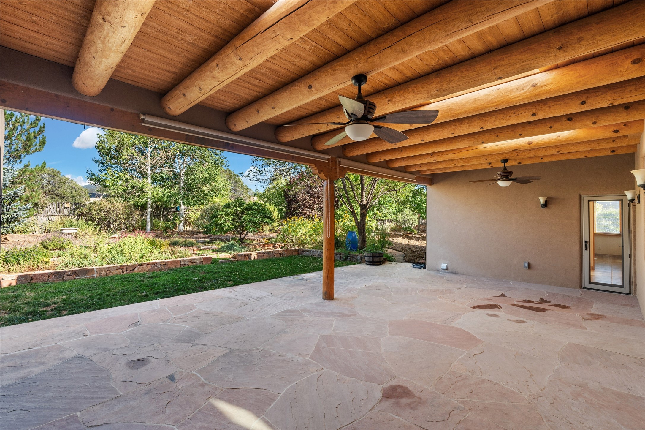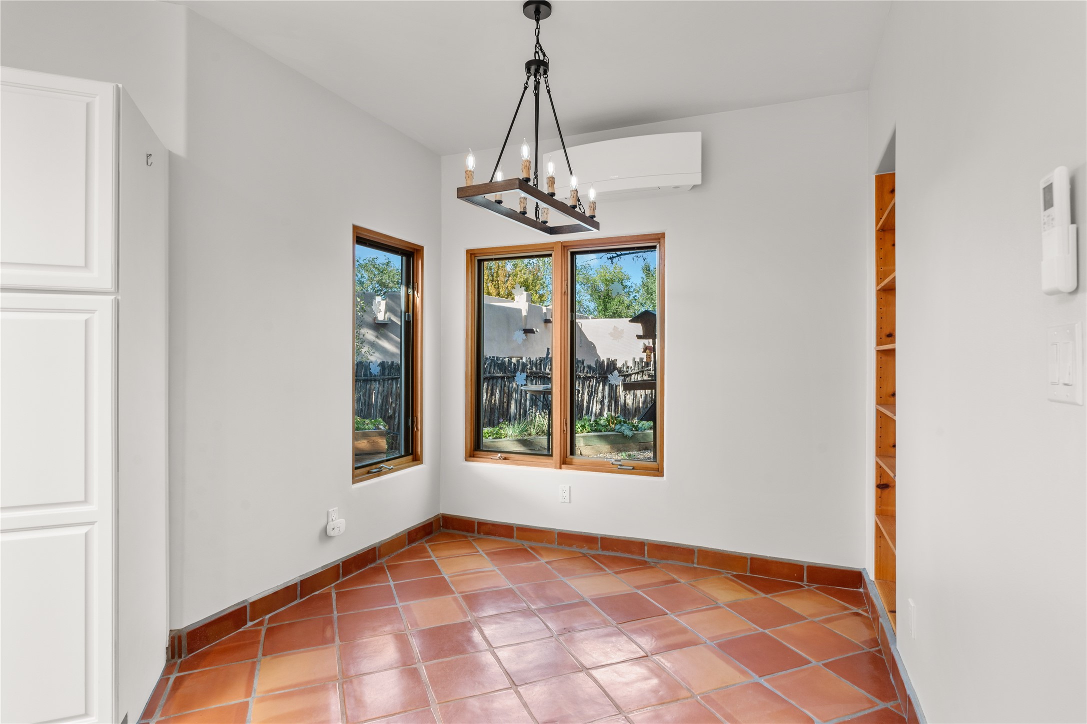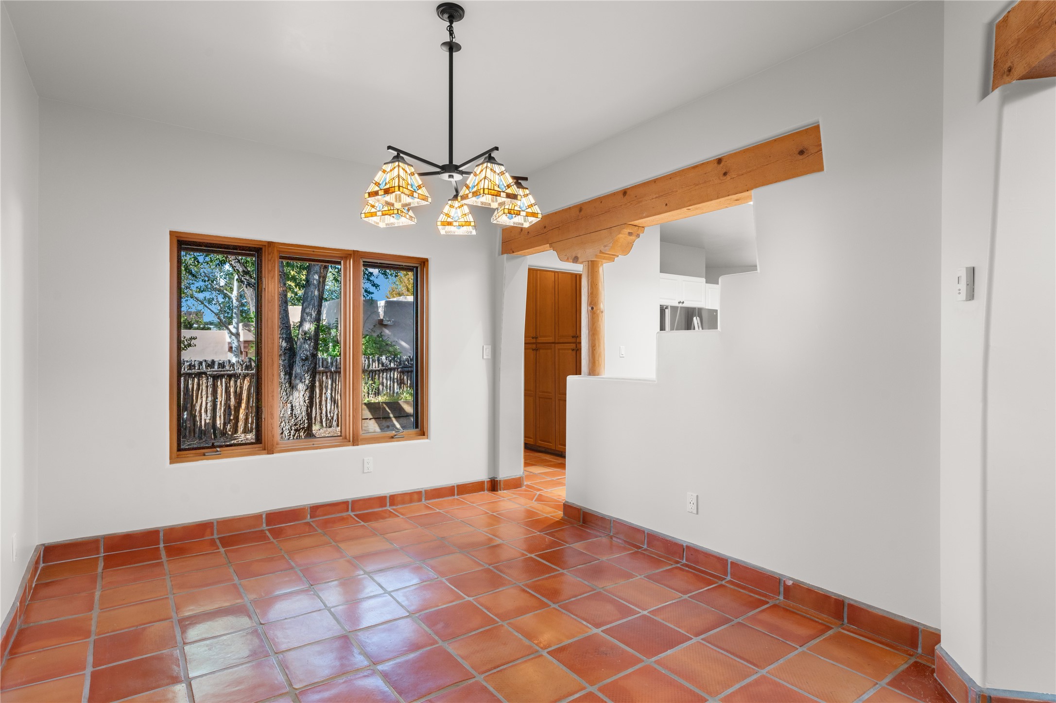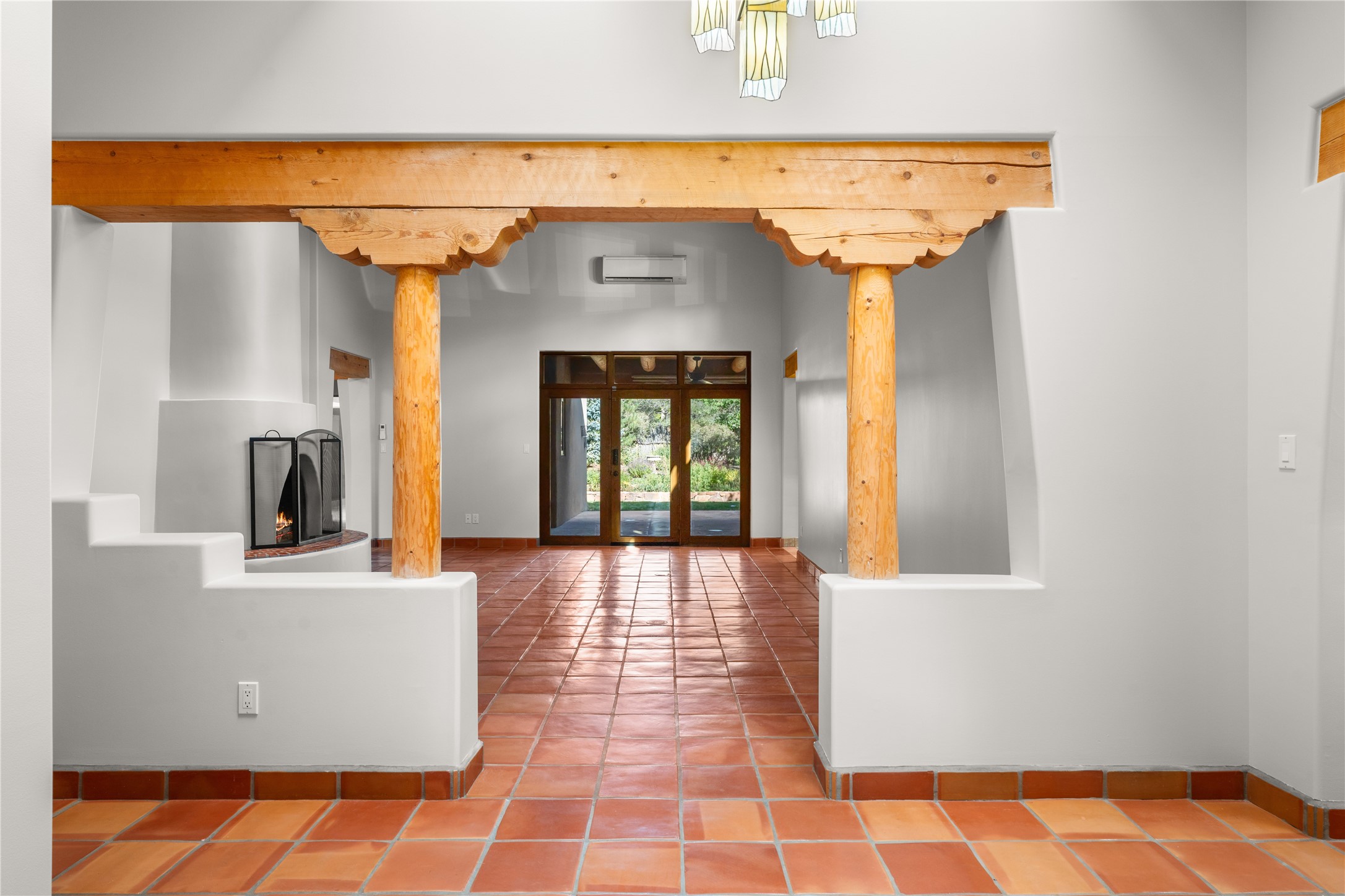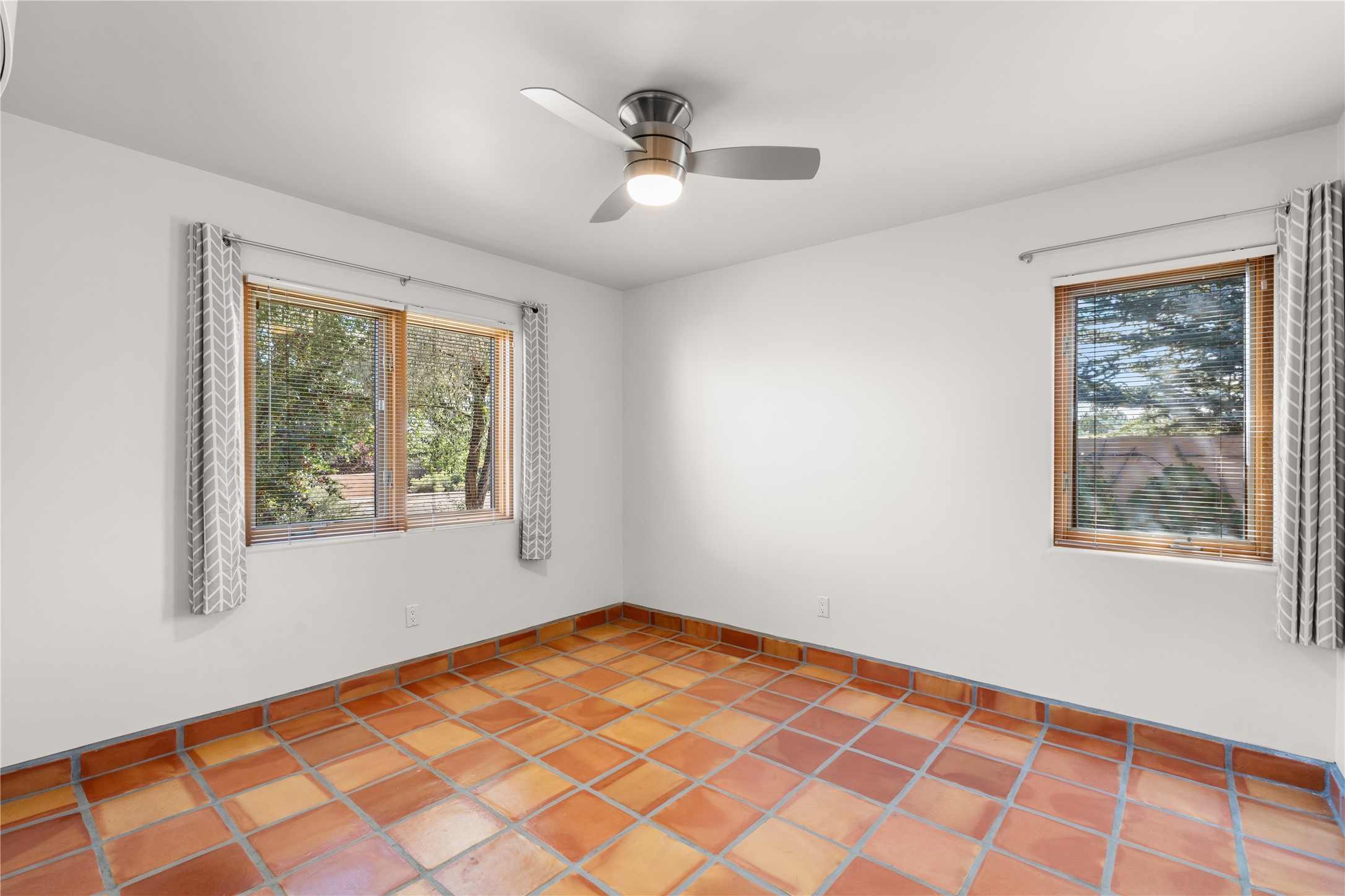 Tucked away off a serene cul-de-sac, this entirely single level, meticulous Santa Fe style home must be seen! Located on the city's lower east side near the medical district and St. Michael's High School, everything you need is a short drive away. The home is situated on a huge, beautifully landscaped lot with a peak of mountain views. For the enjoyment of your private sanctuary, there is a 455 sq. ft. portal with vigas and wood decking above and flagstone flooring below that is a true extension of your living space with Santa Fe's delightful climate many months of the year. The home is immaculate and offers incredible flexibility with a spacious studio or office addition. With a private entrance, this light and airy room with a multitude of windows could also function as a mother-in-law suite with a beautiful bathroom nearby featuring a walk-in shower. The living room boasts soaring ceilings with vigas and wood ceiling and an amazing kiva fireplace that commands attention. The primary bedroom is private and spacious and the remodeled bath with a gorgeous shower and huge walk-in closet will not disappoint. The home also features three other bedrooms with beautifully renovated guest bath. The kitchen is lovely with quartz counter tops and high end stainless steel appliances and more than sufficient storage for all your culinary needs. For your dining requirements, the home offers a charming breakfast nook replete with windows bringing the lovely outdoors in as well as a more formal dining space. There is a fabulous laundry room with cabinets, built in sink, and a window to the backyard. The home also features 7 nearly new mini-splits which offer both heating and cooling for year round comfort and a two car attached garage. This home is truly a gem! If you are seeking a home full of Santa Fe charm, character, and thoughtful upgrades- all in a prime location that allows for privacy and convenience, this property is not to be missed!