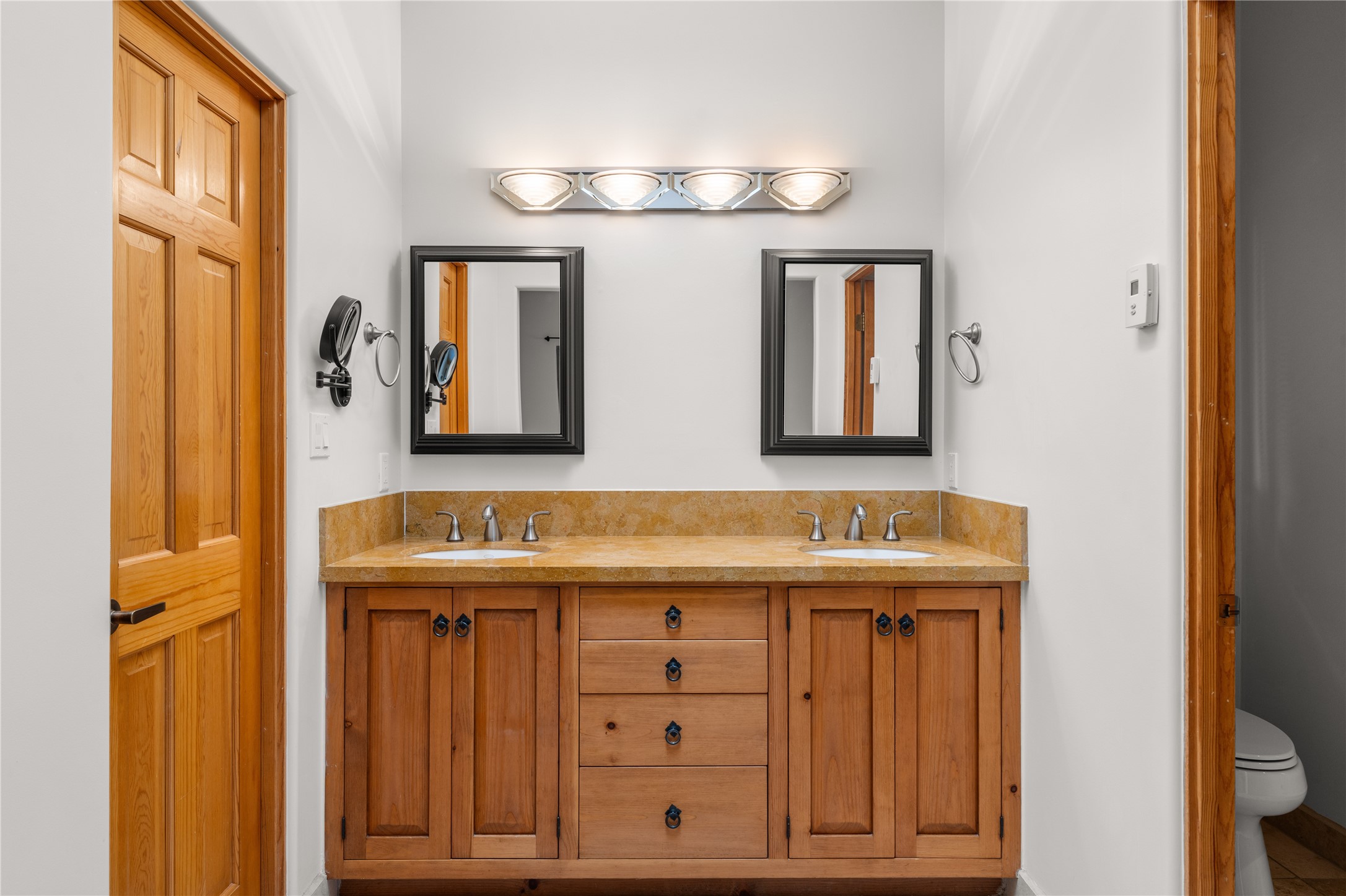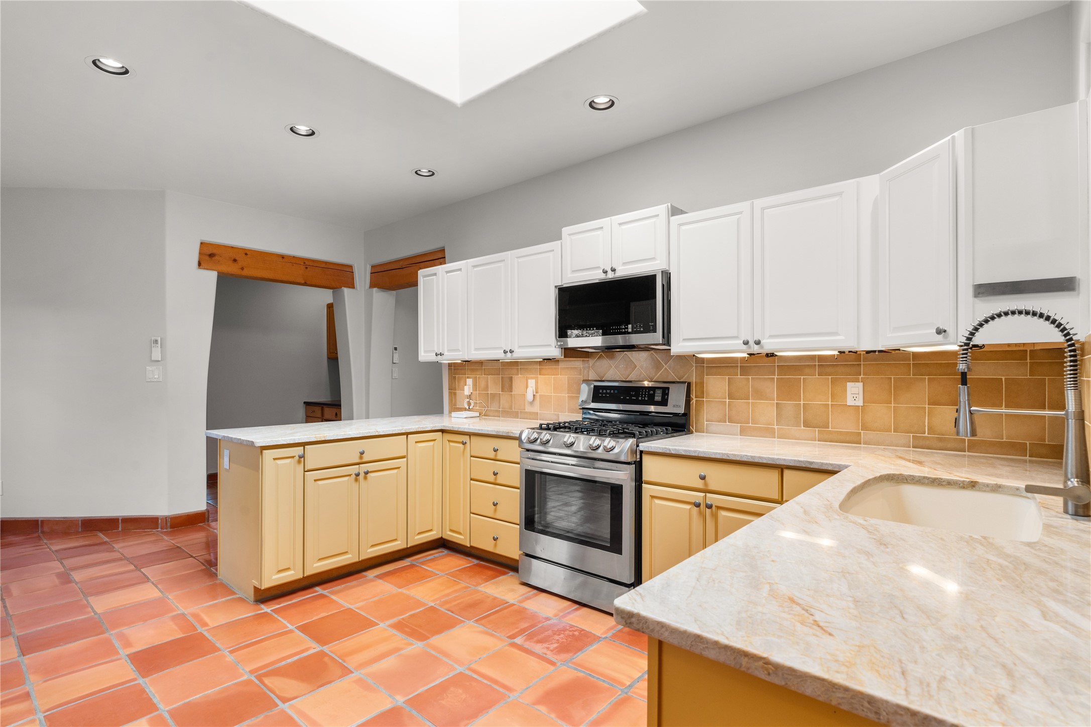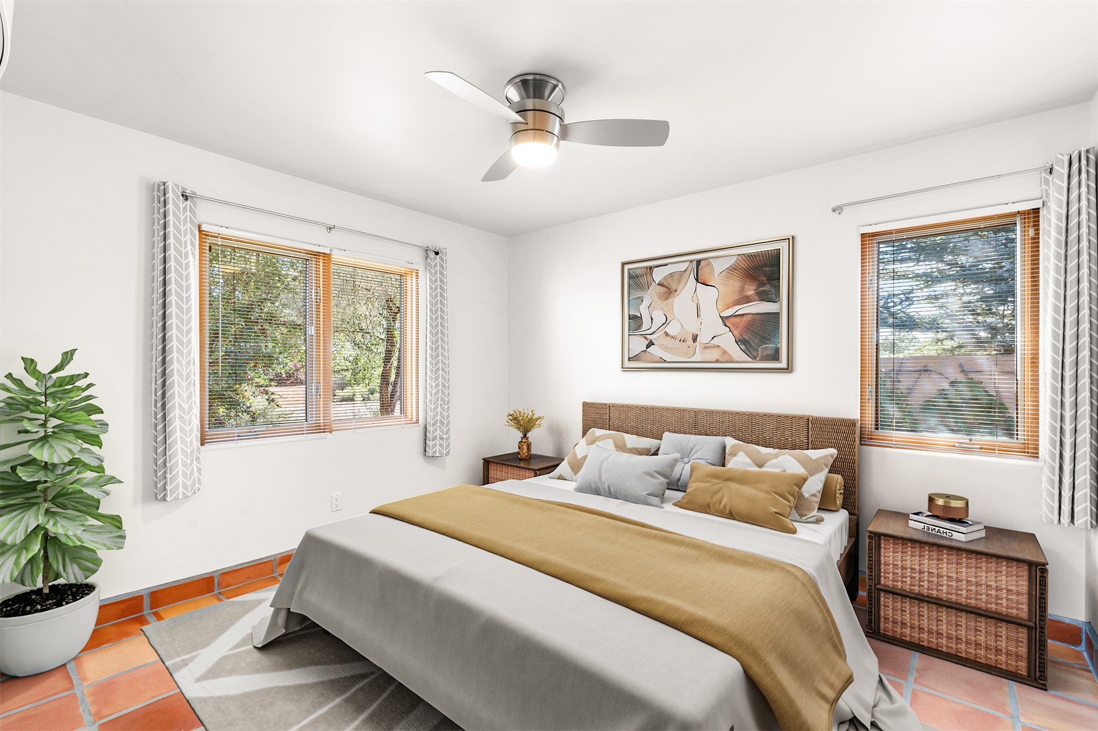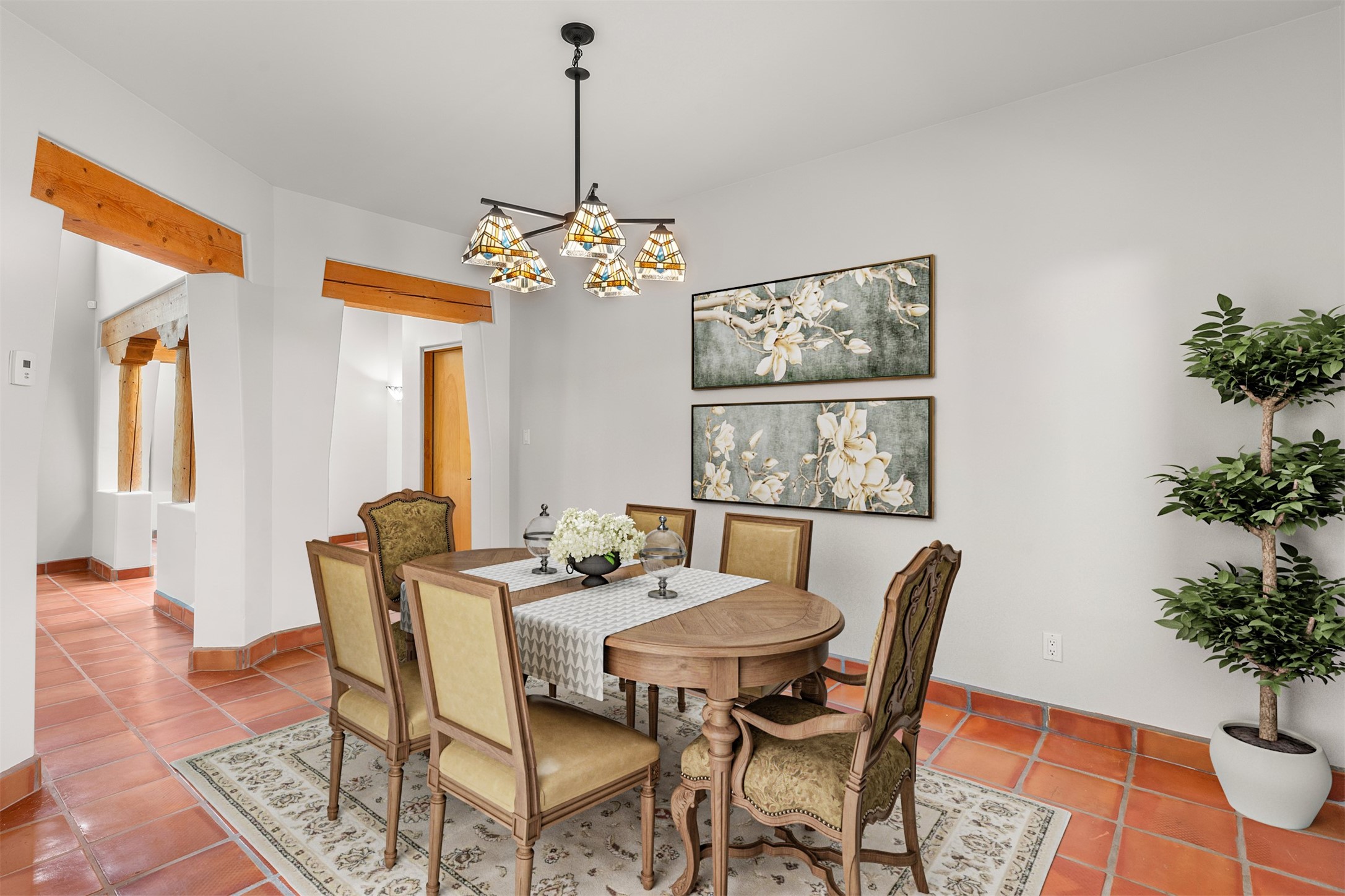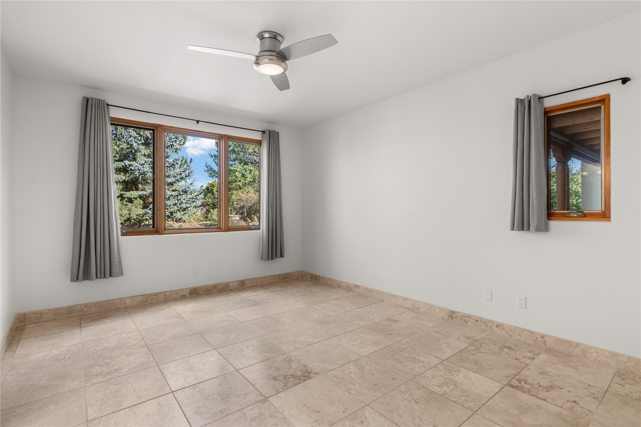 Tucked away off a serene cul-de-sac, this entirely single level, meticulous Santa Fe style home must be seen! Located on the city's lower east side near the medical district and St. Michael's High School, everything you need is a short drive away. The home is situated on a huge, beautifully landscaped lot with a peak of mountain views. For the enjoyment of your private sanctuary, there is a 455 sq. ft. portal with vigas and wood decking above and flagstone flooring below that is a true extension of your living space with Santa Fe's delightful climate many months of the year. The home is immaculate and offers incredible flexibility with a spacious studio or office addition. With a private entrance, this light and airy room with a multitude of windows could also function as a mother-in-law suite with a beautiful bathroom nearby featuring a walk-in shower. The living room boasts soaring ceilings with vigas and wood ceiling and an amazing kiva fireplace that commands attention. The primary bedroom is private and spacious and the remodeled bath with a gorgeous shower and huge walk-in closet will not disappoint. The home also features three other bedrooms with beautifully renovated guest bath. The kitchen is lovely with quartz counter tops and high end stainless steel appliances and more than sufficient storage for all your culinary needs. For your dining requirements, the home offers a charming breakfast nook replete with windows bringing the lovely outdoors in as well as a more formal dining space. There is a fabulous laundry room with cabinets, built in sink, and a window to the backyard. The home also features 7 nearly new mini-splits which offer both heating and cooling for year round comfort and a two car attached garage. This home is truly a gem! If you are seeking a home full of Santa Fe charm, character, and thoughtful upgrades- all in a prime location that allows for privacy and convenience, this property is not to be missed!