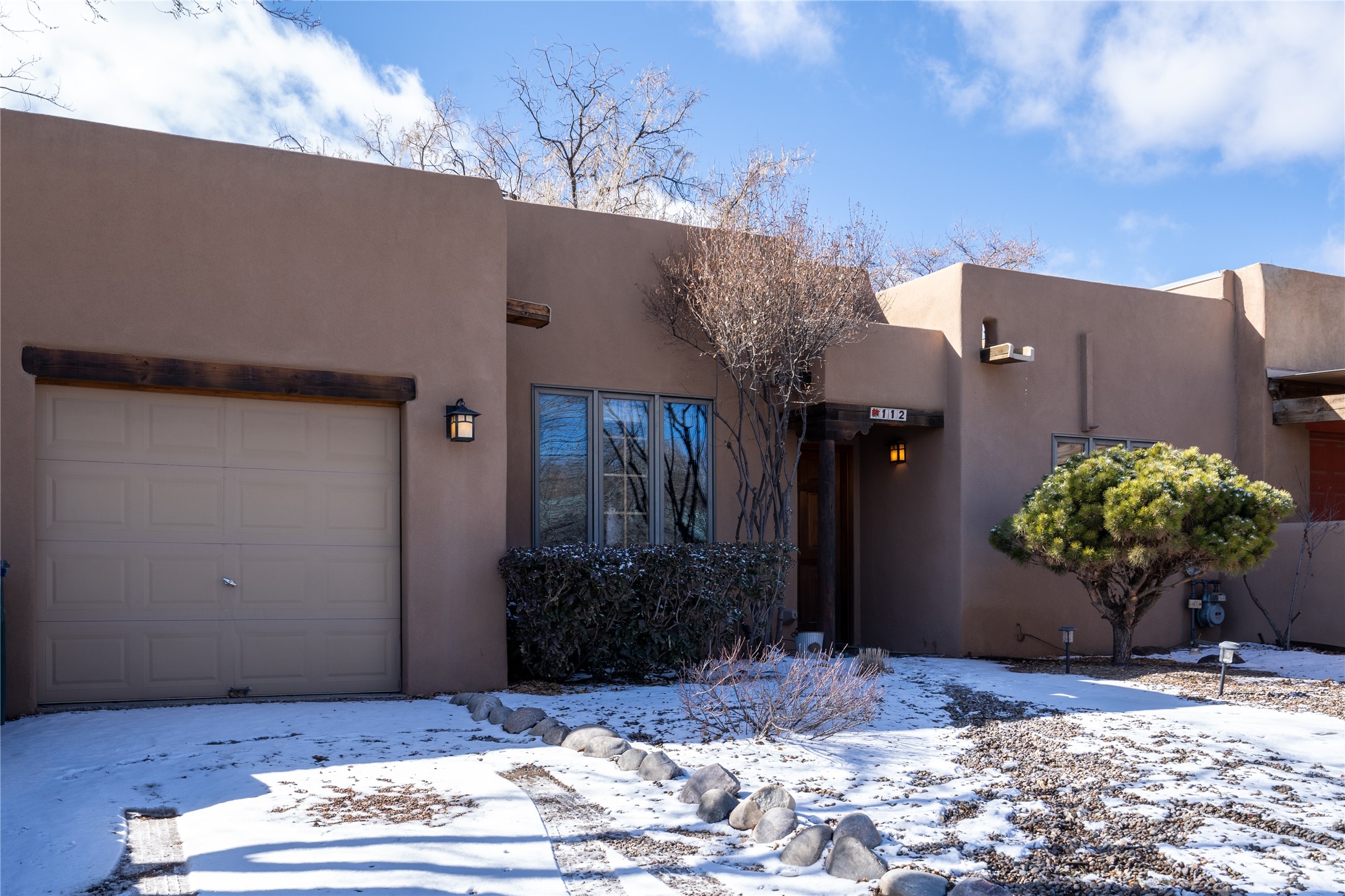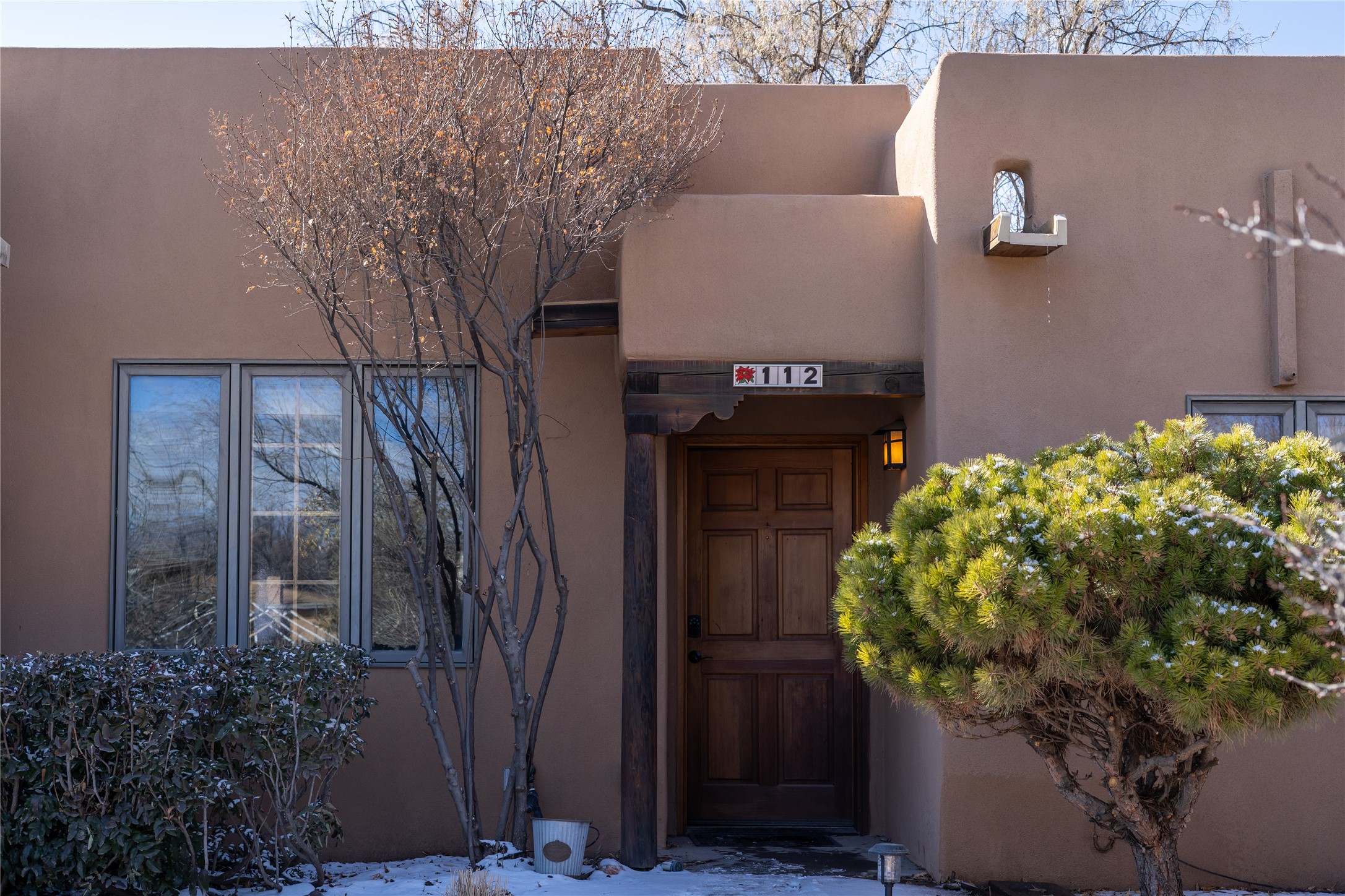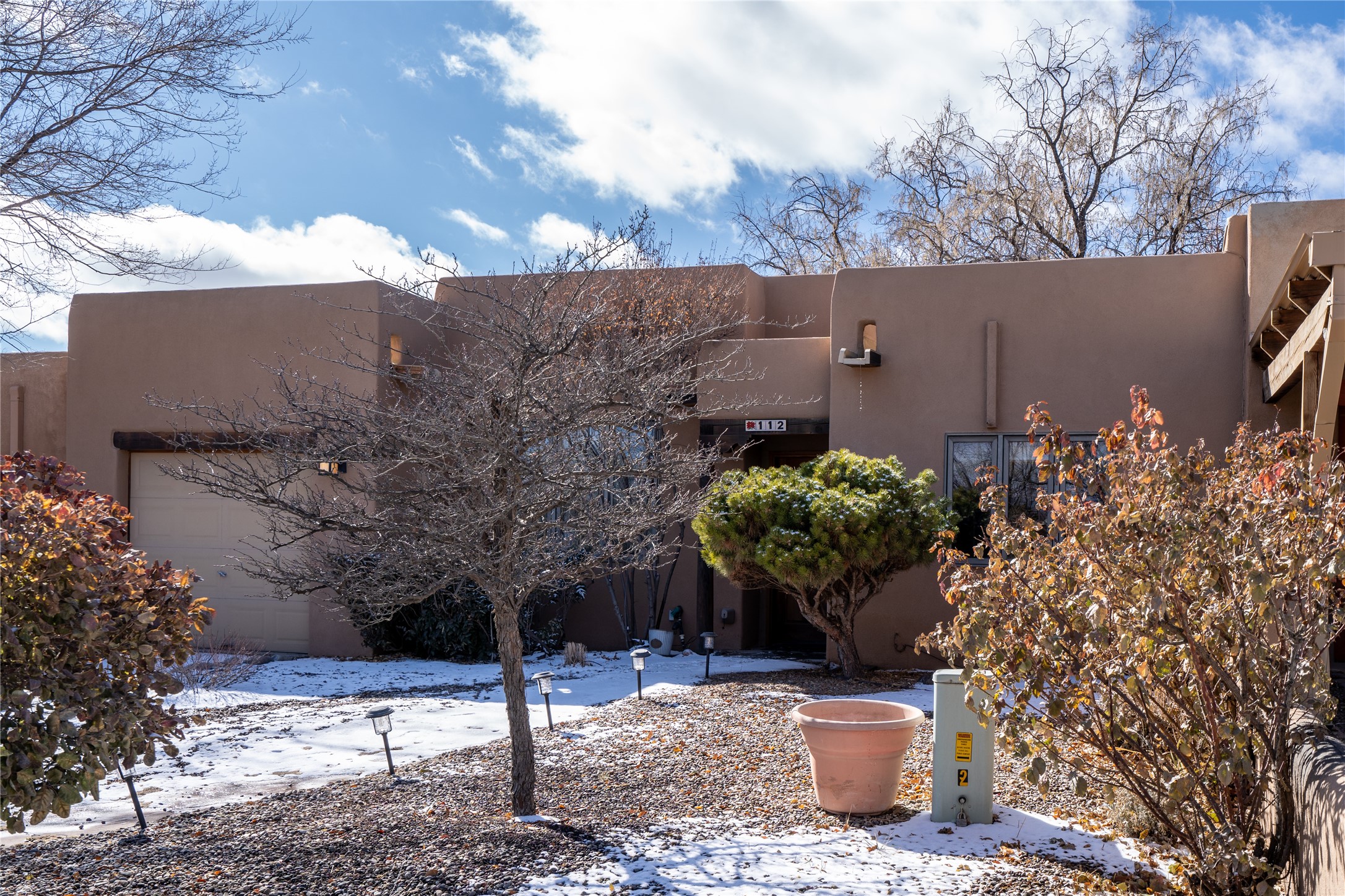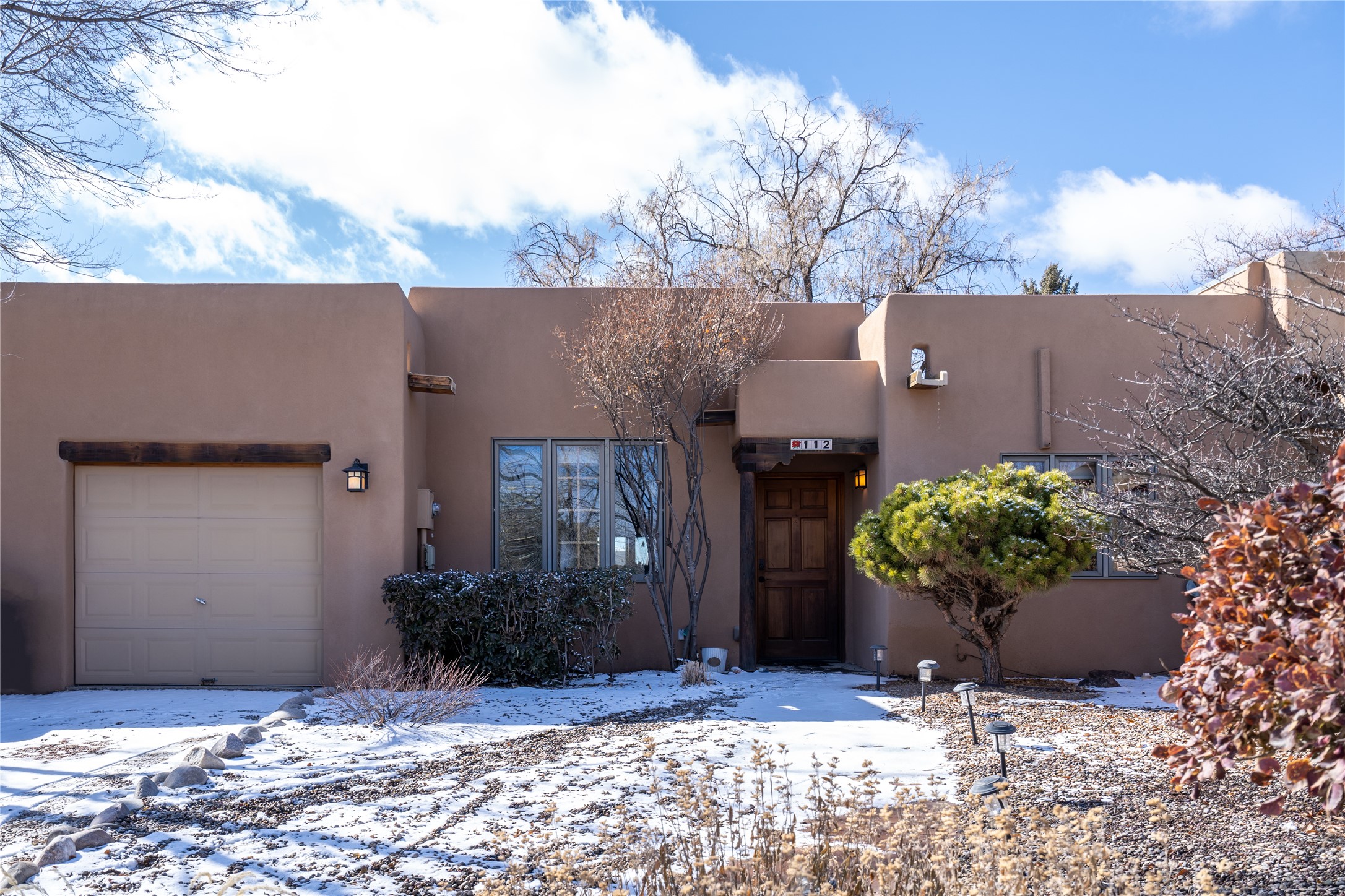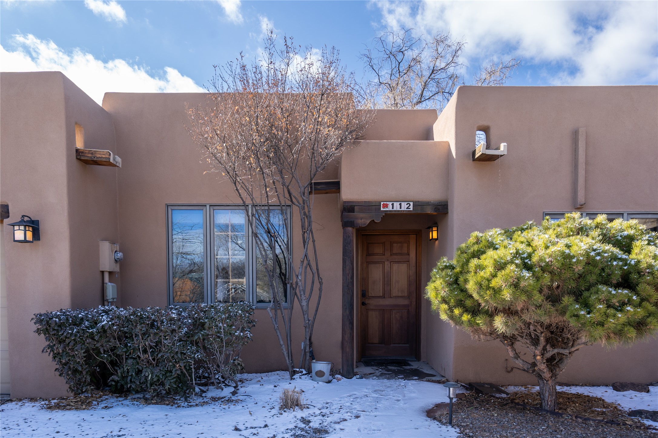 Tucked away in a peaceful enclave off West Alameda, 112 Del Rio is a 2-bedroom, 2-bathroom attached home offering a charming blend of Santa Fe style and modern convenience. Just 12 minutes from the historic Plaza, this attached townhome is a rare find--quiet, private, and with no HOA fees or restrictions. Step inside to find classic Santa Fe details, including vigas and a striking red plaster kiva fireplace, the perfect place to spend a cozy winter evening. The bright and airy living space is complemented by large windows, inviting in natural light and views of the serene surroundings and the Sangre de Cristo mountains. Recently installed mini splits create year-round comfort. The home is move-in ready with a well-appointed kitchen and a fenced backyard with a patio, mature trees, and drip irrigation. The primary bedroom has an en-suite private bath as well as back patio direct access. The Santa Fe River Trail is just moments away, with endless opportunities for walking and biking downtown (it's only a 17-minute bike ride to the Plaza). With an attached one-car garage and easy access to the Plaza and the Railyard/Farmer's Market as well as the Alameda neighborhood shops and parks, this Santa Fe gem is sure to inspire you.
