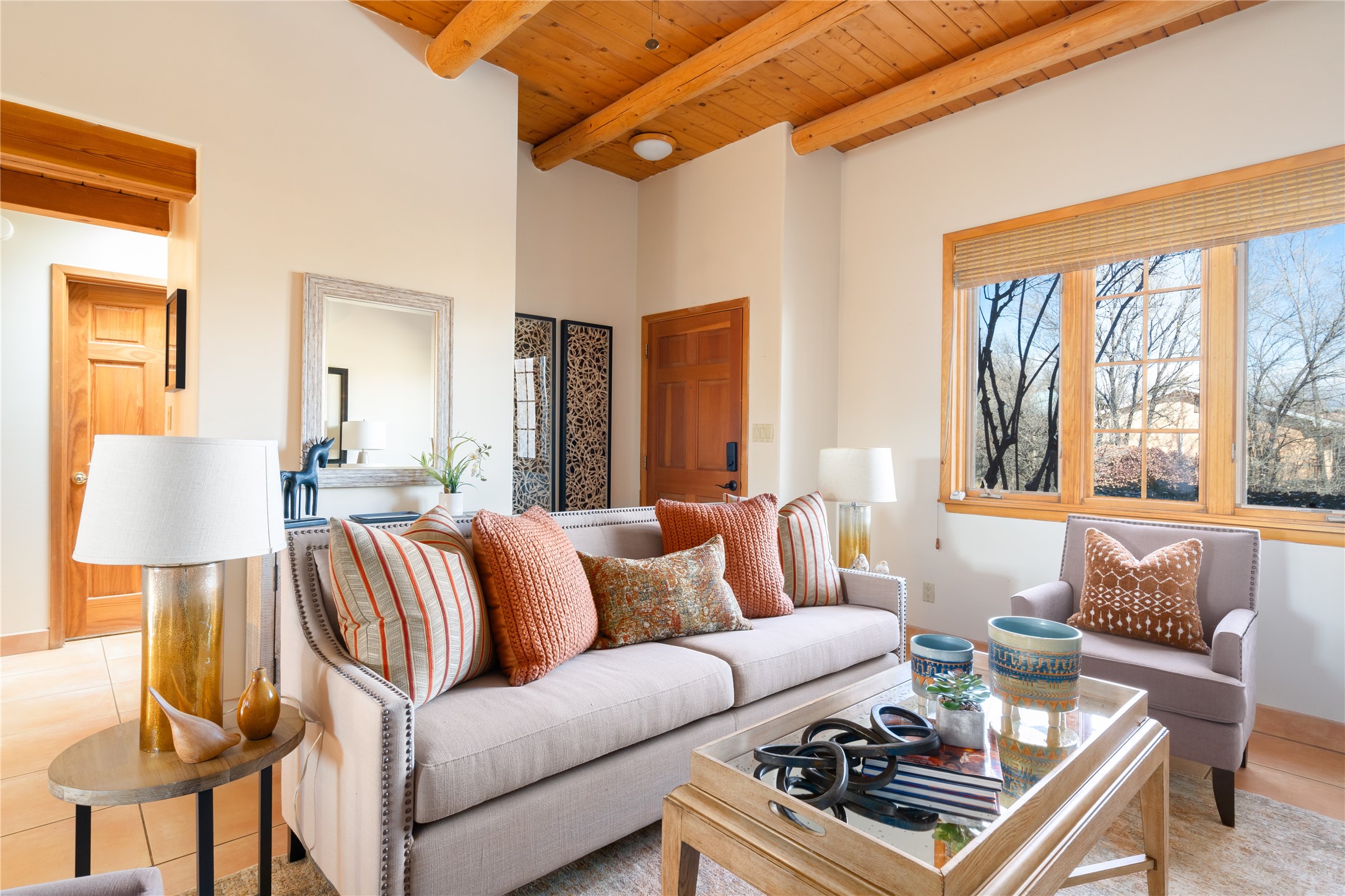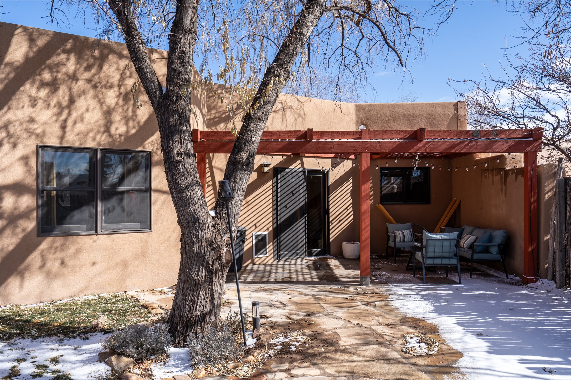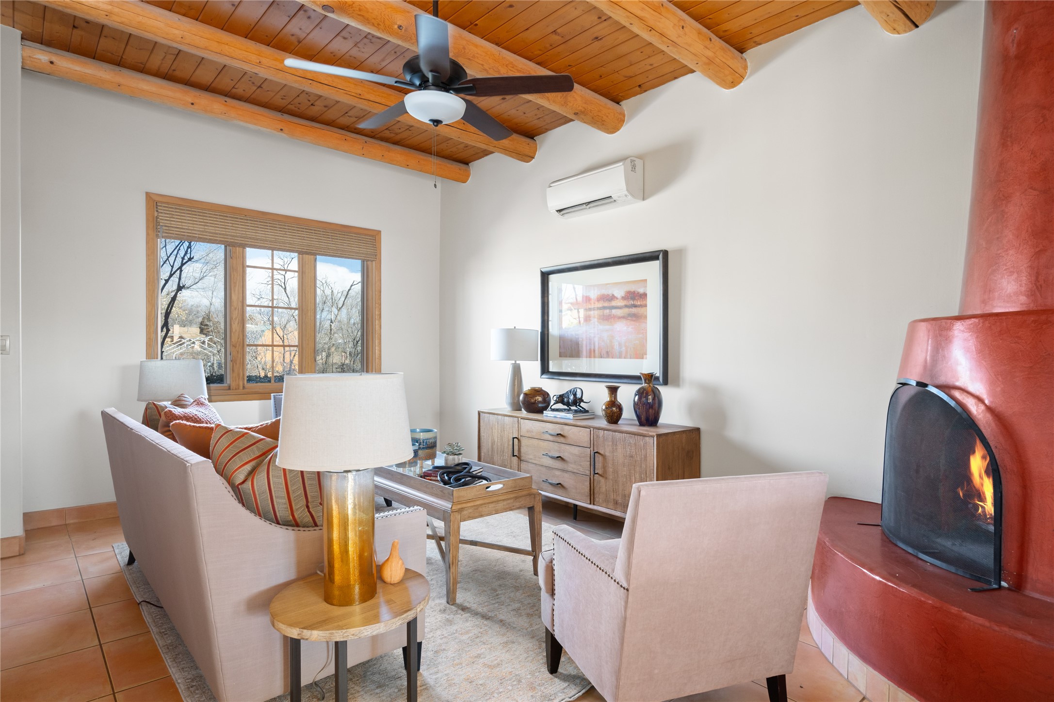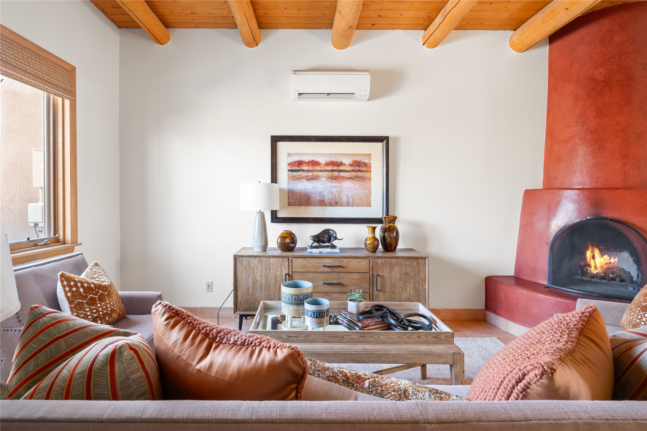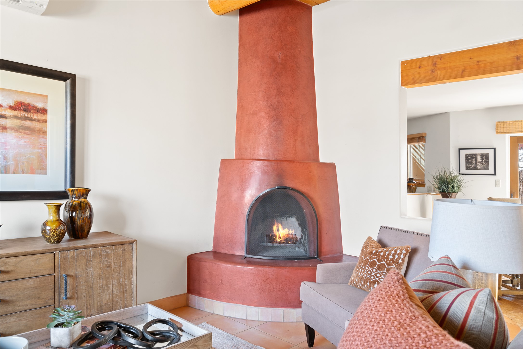 Tucked away in a peaceful enclave off West Alameda, 112 Del Rio is a 2-bedroom, 2-bathroom attached home offering a charming blend of Santa Fe style and modern convenience. Just 12 minutes from the historic Plaza, this attached townhome is a rare find--quiet, private, and with no HOA fees or restrictions. Step inside to find classic Santa Fe details, including vigas and a striking red plaster kiva fireplace, the perfect place to spend a cozy winter evening. The bright and airy living space is complemented by large windows, inviting in natural light and views of the serene surroundings and the Sangre de Cristo mountains. Recently installed mini splits create year-round comfort. The home is move-in ready with a well-appointed kitchen and a fenced backyard with a patio, mature trees, and drip irrigation. The primary bedroom has an en-suite private bath as well as back patio direct access. The Santa Fe River Trail is just moments away, with endless opportunities for walking and biking downtown (it's only a 17-minute bike ride to the Plaza). With an attached one-car garage and easy access to the Plaza and the Railyard/Farmer's Market as well as the Alameda neighborhood shops and parks, this Santa Fe gem is sure to inspire you.