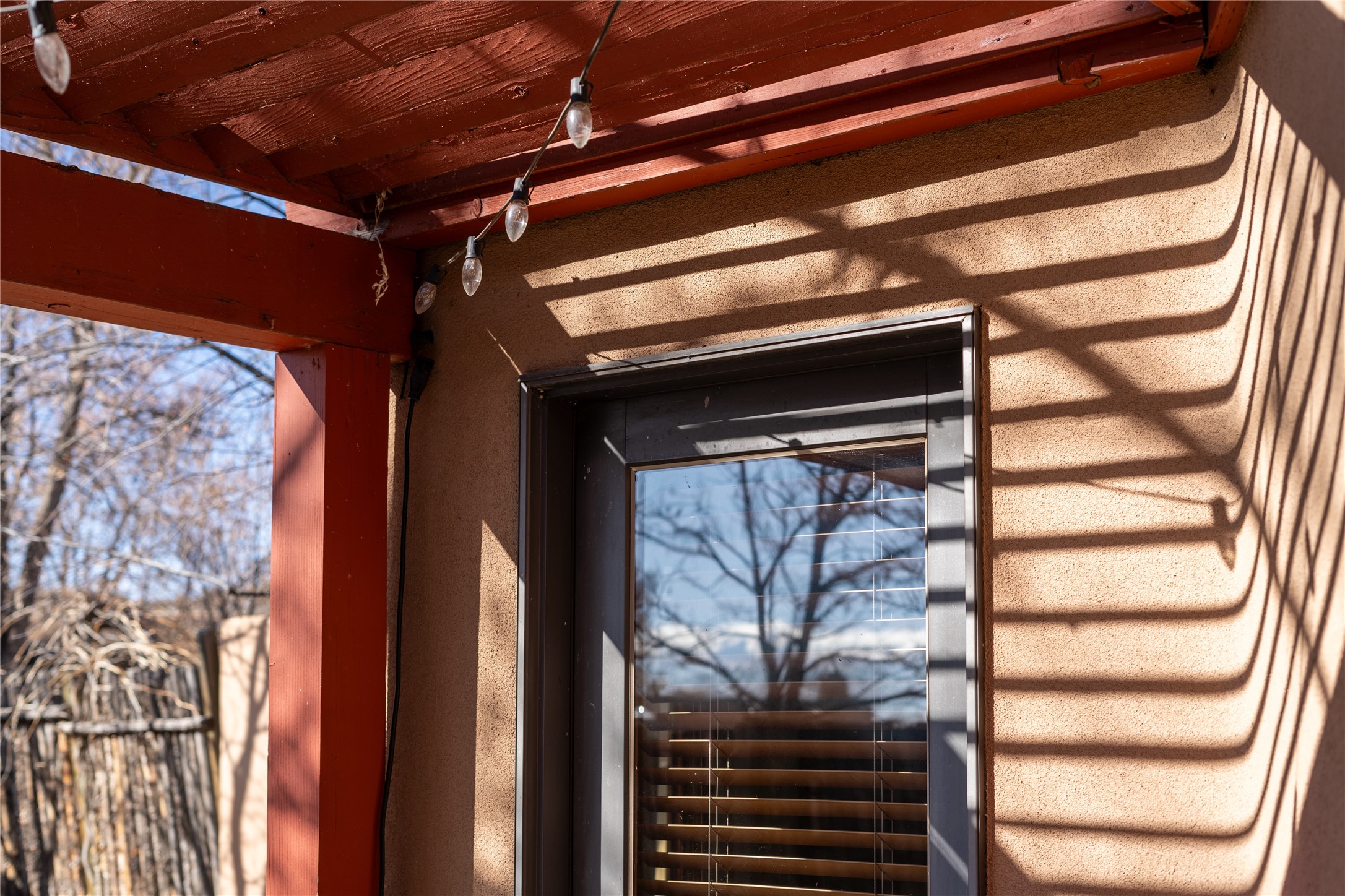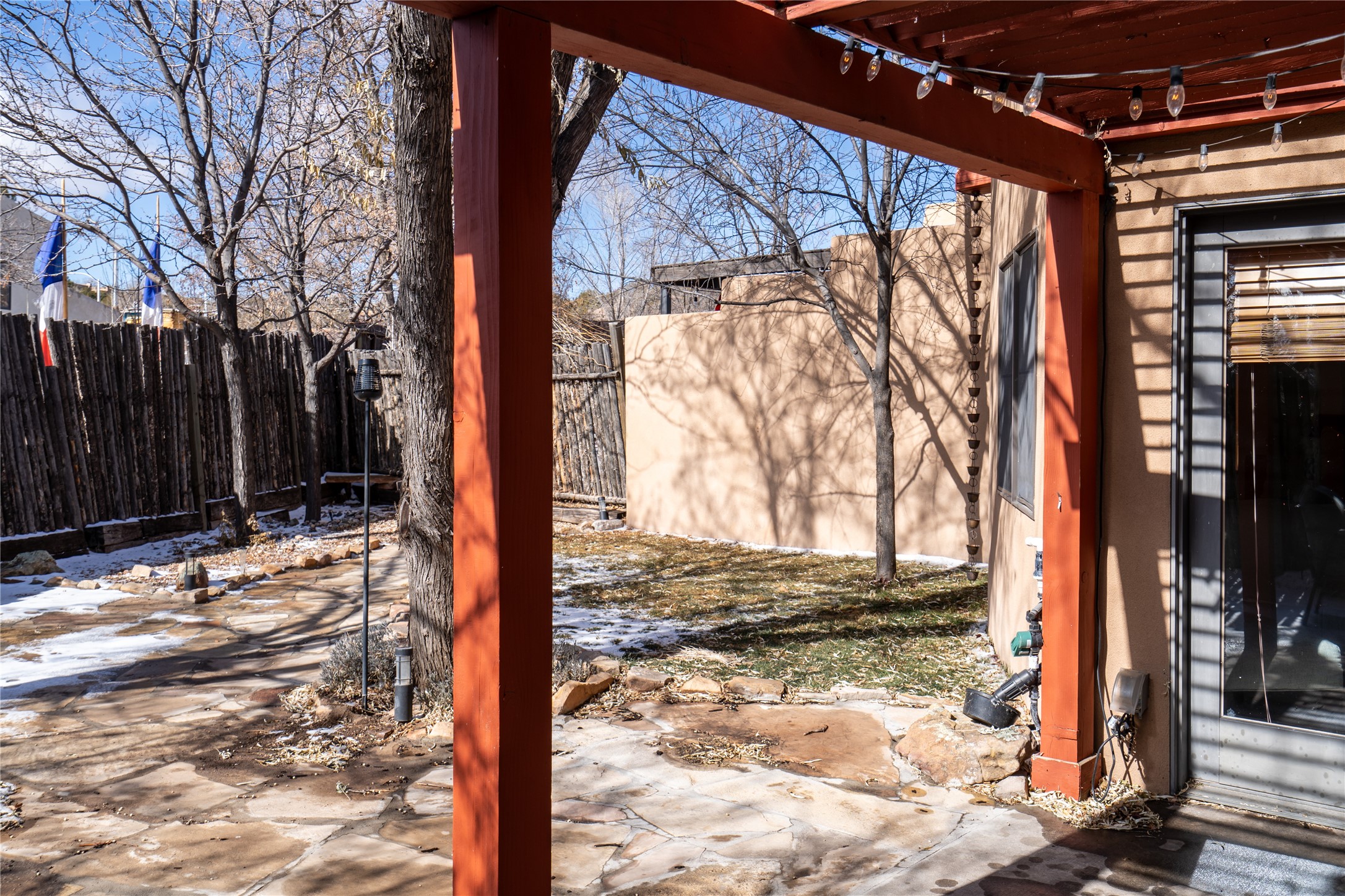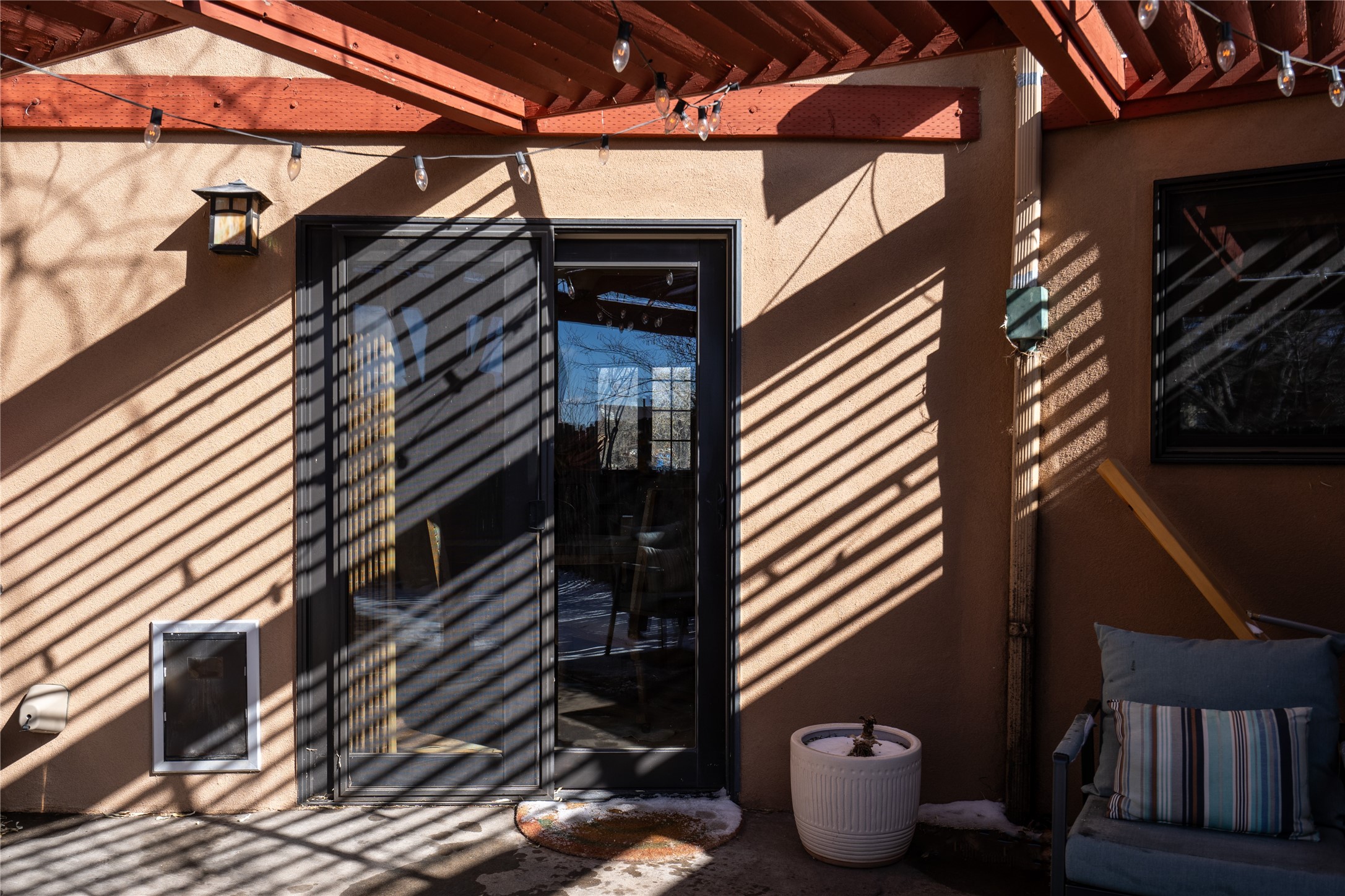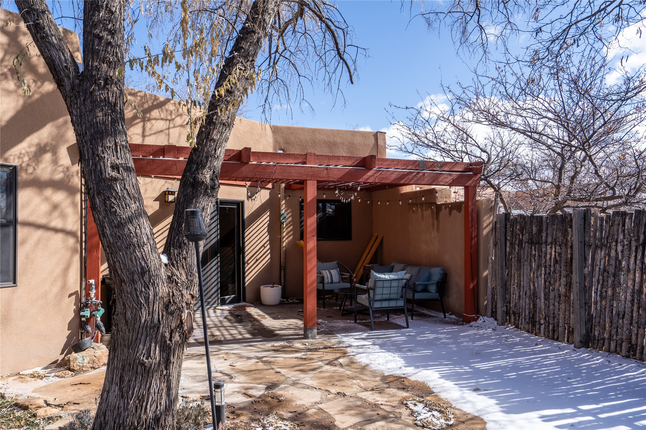 Tucked away in a peaceful enclave off West Alameda, 112 Del Rio is a 2-bedroom, 2-bathroom attached home offering a charming blend of Santa Fe style and modern convenience. Just 12 minutes from the historic Plaza, this attached townhome is a rare find--quiet, private, and with no HOA fees or restrictions. Step inside to find classic Santa Fe details, including vigas and a striking red plaster kiva fireplace, the perfect place to spend a cozy winter evening. The bright and airy living space is complemented by large windows, inviting in natural light and views of the serene surroundings and the Sangre de Cristo mountains. Recently installed mini splits create year-round comfort. The home is move-in ready with a well-appointed kitchen and a fenced backyard with a patio, mature trees, and drip irrigation. The primary bedroom has an en-suite private bath as well as back patio direct access. The Santa Fe River Trail is just moments away, with endless opportunities for walking and biking downtown (it's only a 17-minute bike ride to the Plaza). With an attached one-car garage and easy access to the Plaza and the Railyard/Farmer's Market as well as the Alameda neighborhood shops and parks, this Santa Fe gem is sure to inspire you.