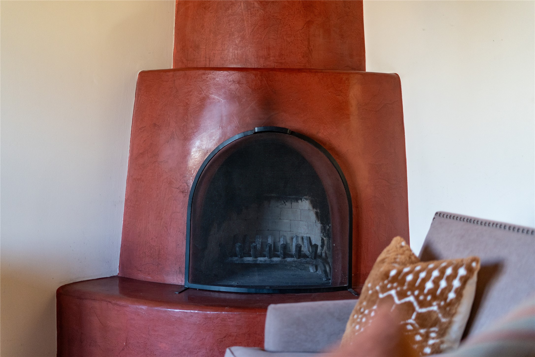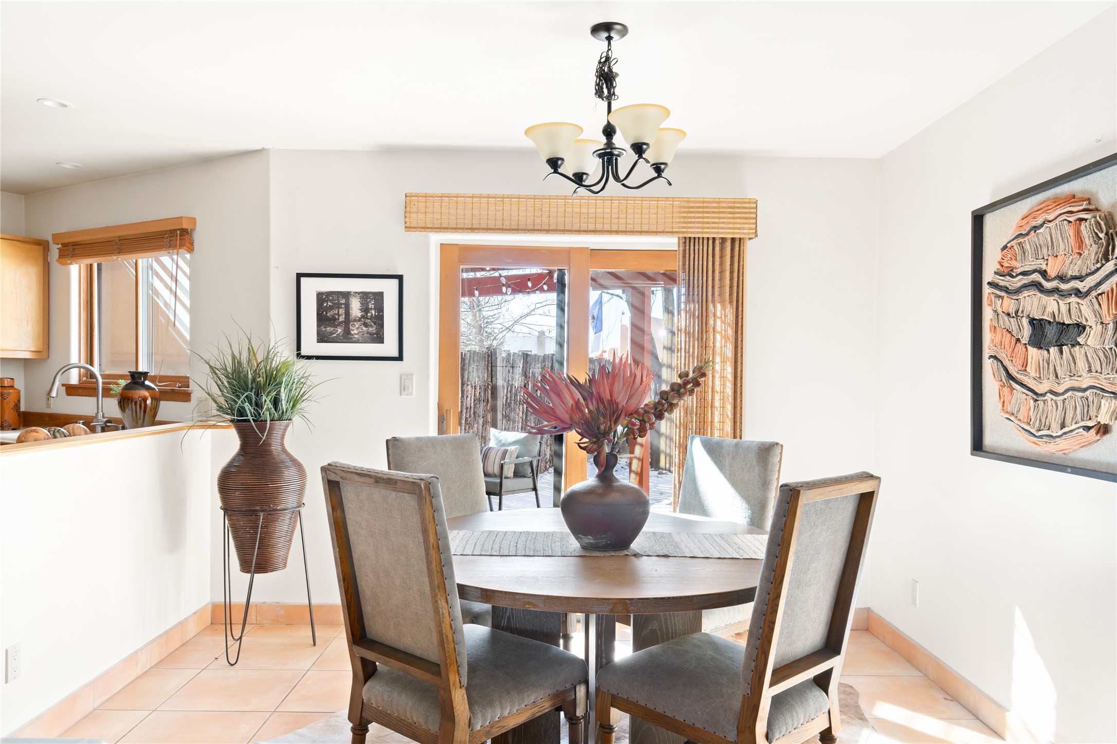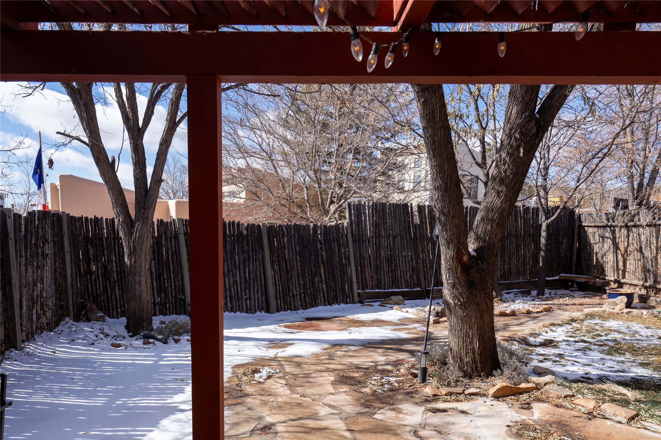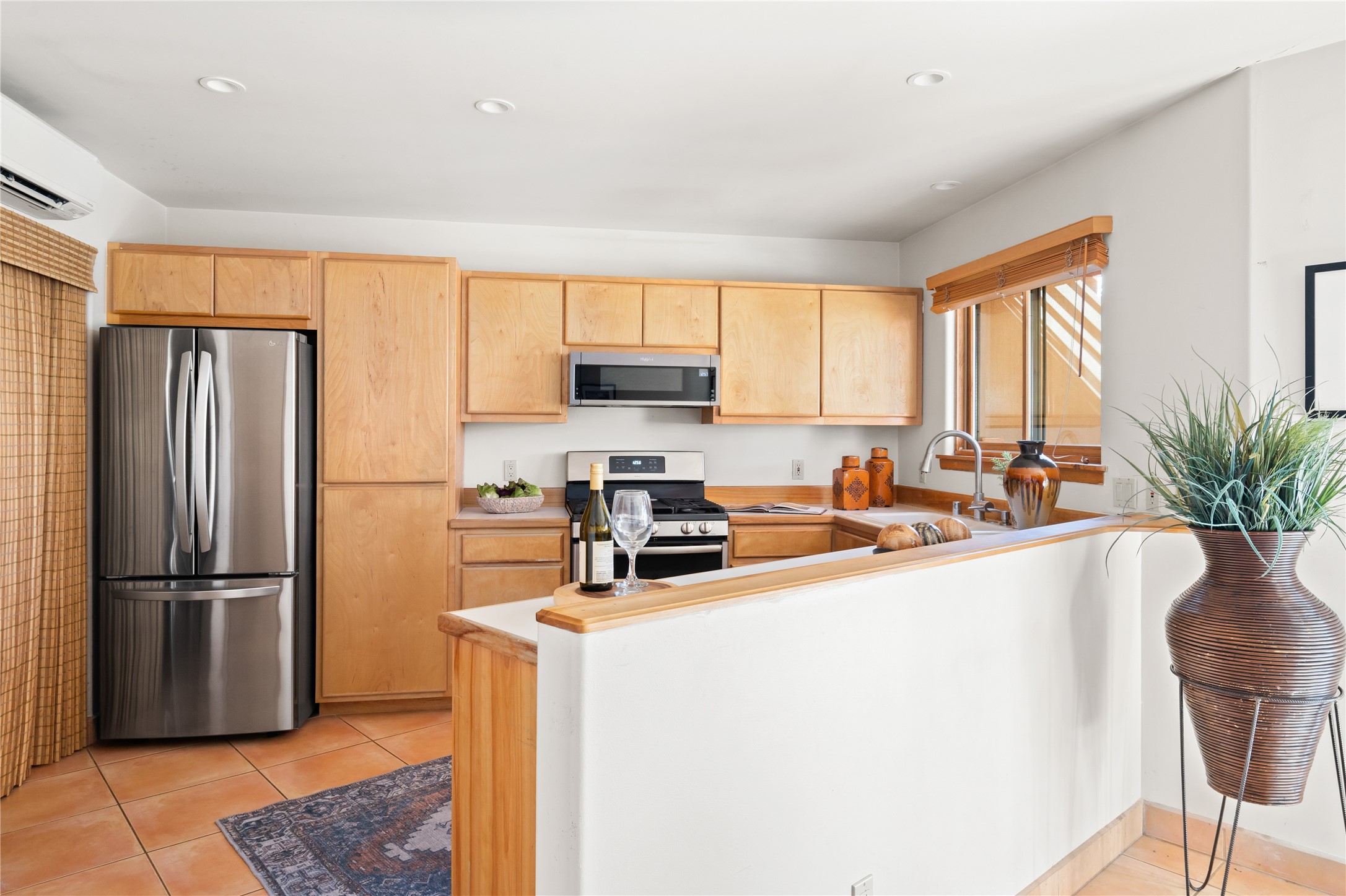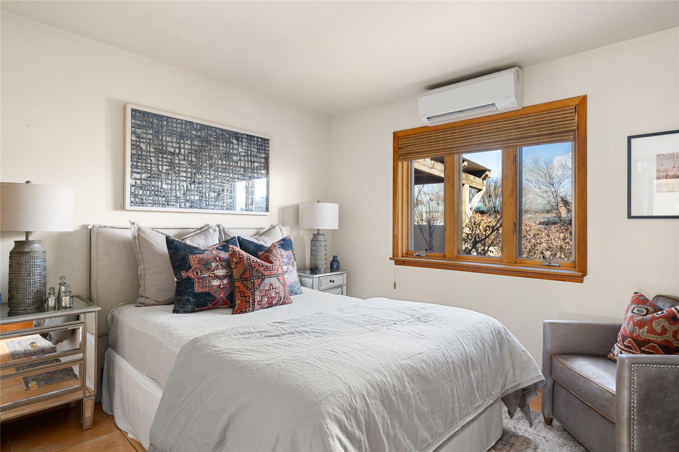 Tucked away in a peaceful enclave off West Alameda, 112 Del Rio is a 2-bedroom, 2-bathroom attached home offering a charming blend of Santa Fe style and modern convenience. Just 12 minutes from the historic Plaza, this attached townhome is a rare find--quiet, private, and with no HOA fees or restrictions. Step inside to find classic Santa Fe details, including vigas and a striking red plaster kiva fireplace, the perfect place to spend a cozy winter evening. The bright and airy living space is complemented by large windows, inviting in natural light and views of the serene surroundings and the Sangre de Cristo mountains. Recently installed mini splits create year-round comfort. The home is move-in ready with a well-appointed kitchen and a fenced backyard with a patio, mature trees, and drip irrigation. The primary bedroom has an en-suite private bath as well as back patio direct access. The Santa Fe River Trail is just moments away, with endless opportunities for walking and biking downtown (it's only a 17-minute bike ride to the Plaza). With an attached one-car garage and easy access to the Plaza and the Railyard/Farmer's Market as well as the Alameda neighborhood shops and parks, this Santa Fe gem is sure to inspire you.