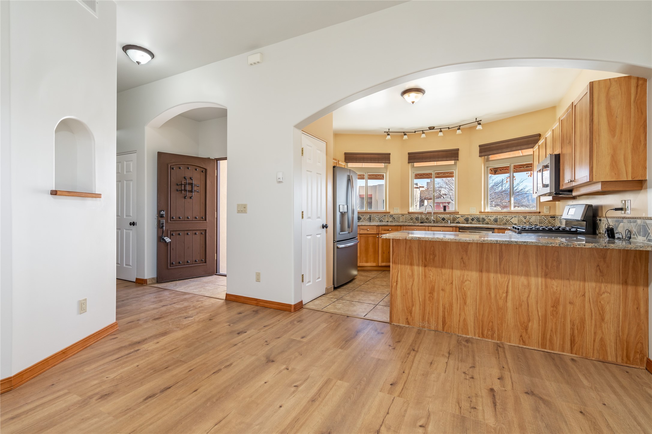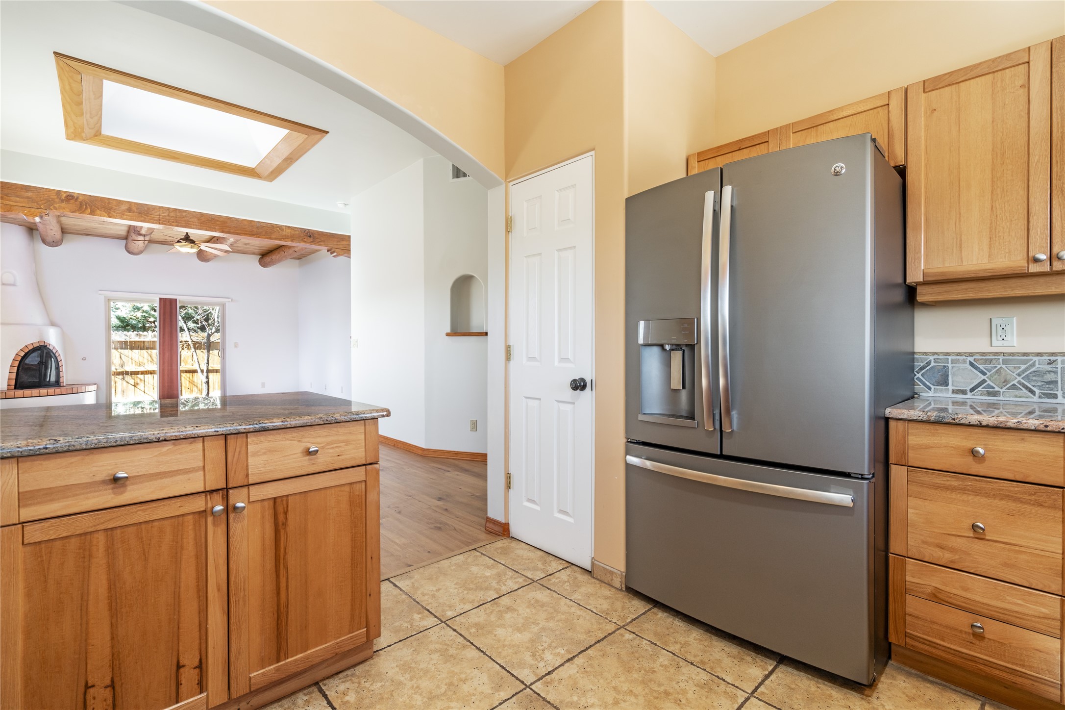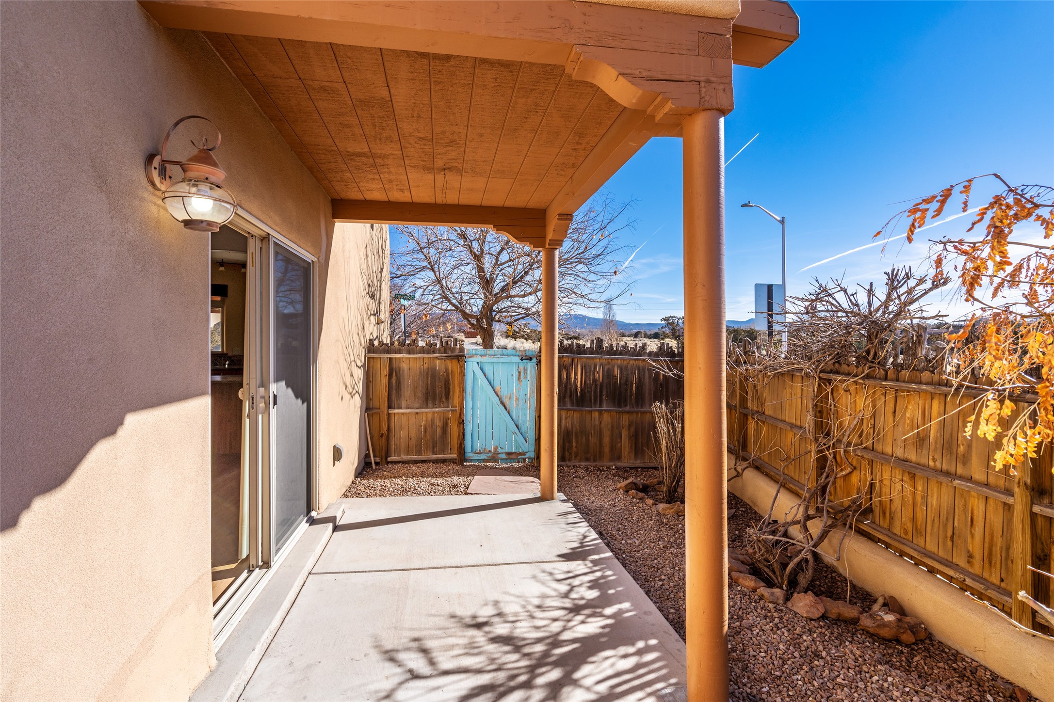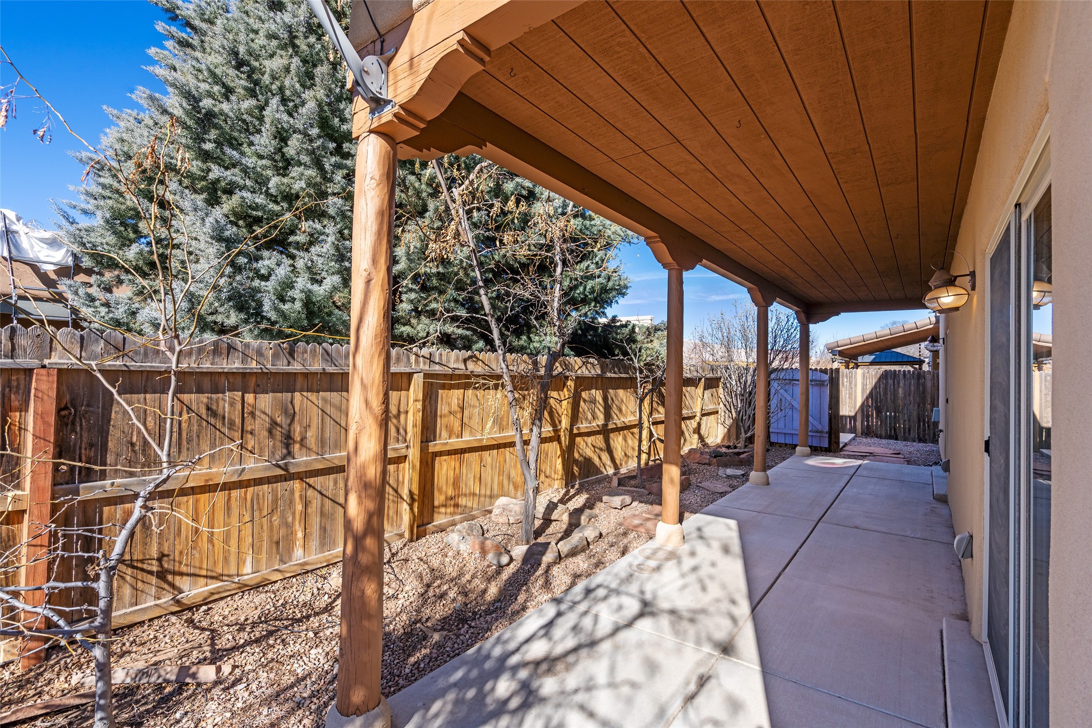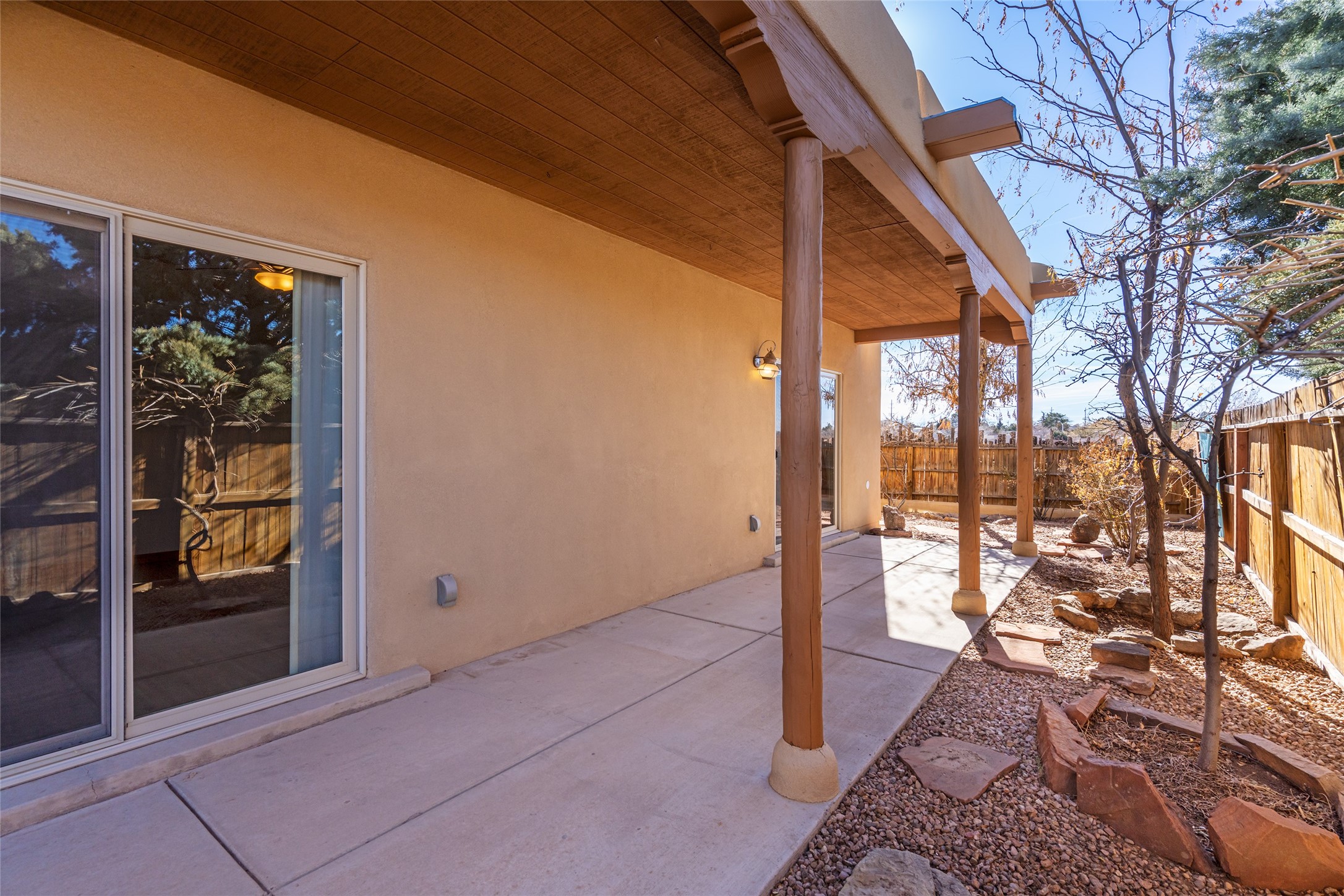 Conveniently located, desirable end unit in the Kachina Ridge neighborhood, this charming 3 bed, 2 bath single level and single family home with office/flex-space is adjacent to an arroyo and the Arroyo de Los Chamisos Urban Trail, offering the best of all worlds: a tucked away neighborhood feel with outdoor open space and convenient access to major arteries and shopping hubs.Traditional Southwest details include a kiva fireplace, nichos, a corbel beam, and viga and beam ceilings in the living area, complemented by contemporary features including laminate wood flooring in the living room and primary bedroom, radiant floor heating and refrigerated central air. Enjoy abundant natural light from clerestory windows and two sets of sliding doors in the living area, a large skylight in the dining area, and multiple windows in the welcoming kitchen with granite countertops and stainless steel appliances.An interior office or flex space as well as a 1-car garage with a 160 sq ft unfinished flex space is ideal for artists, hobbyists, remote workers, or additional storage. Hosts will love the landscaped sideyard with two portals and additional patio space, perfect for dining al fresco and soaking up our gorgeous skies.This lovely home is move-in ready and waiting for its next owner. Schedule a showing today!