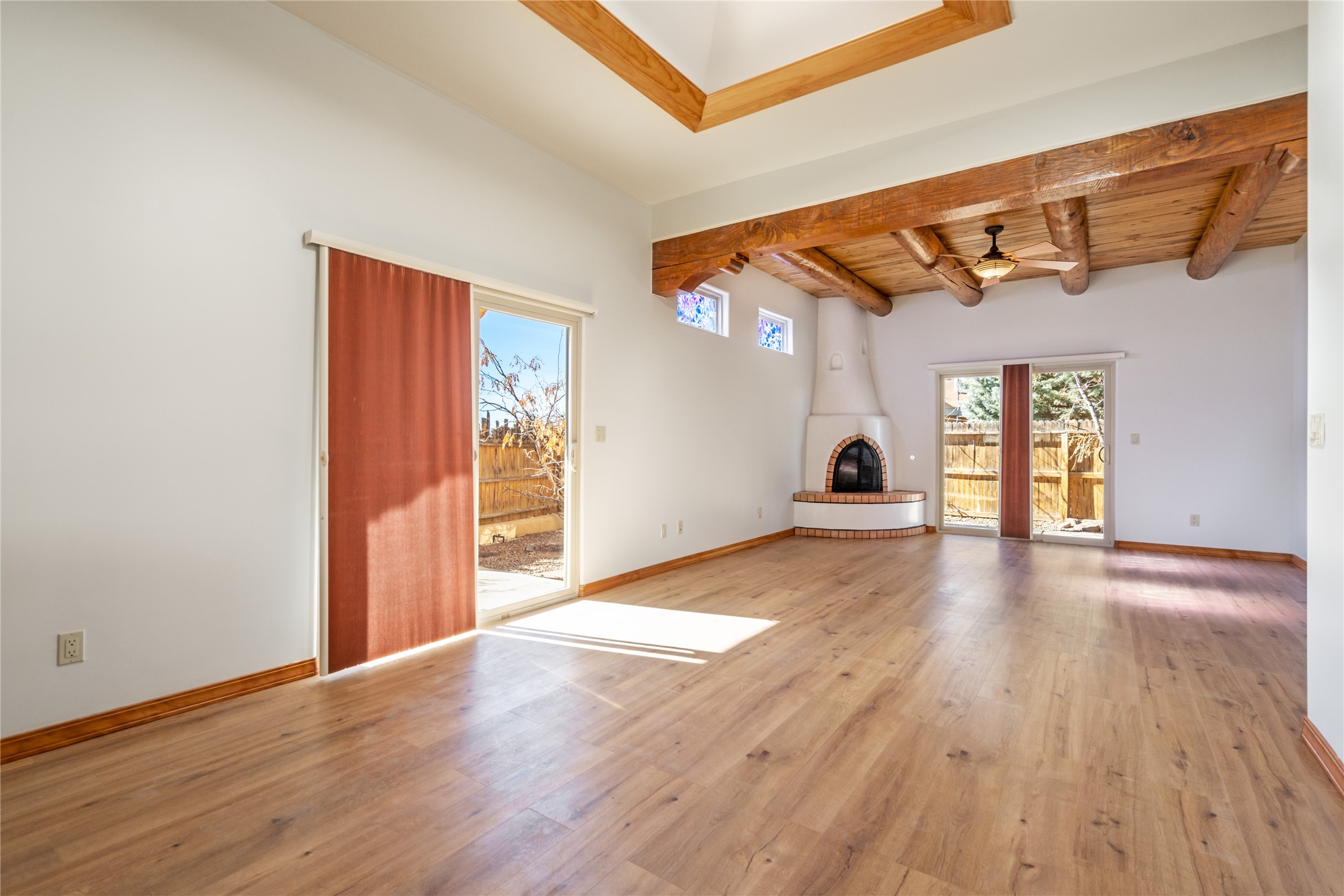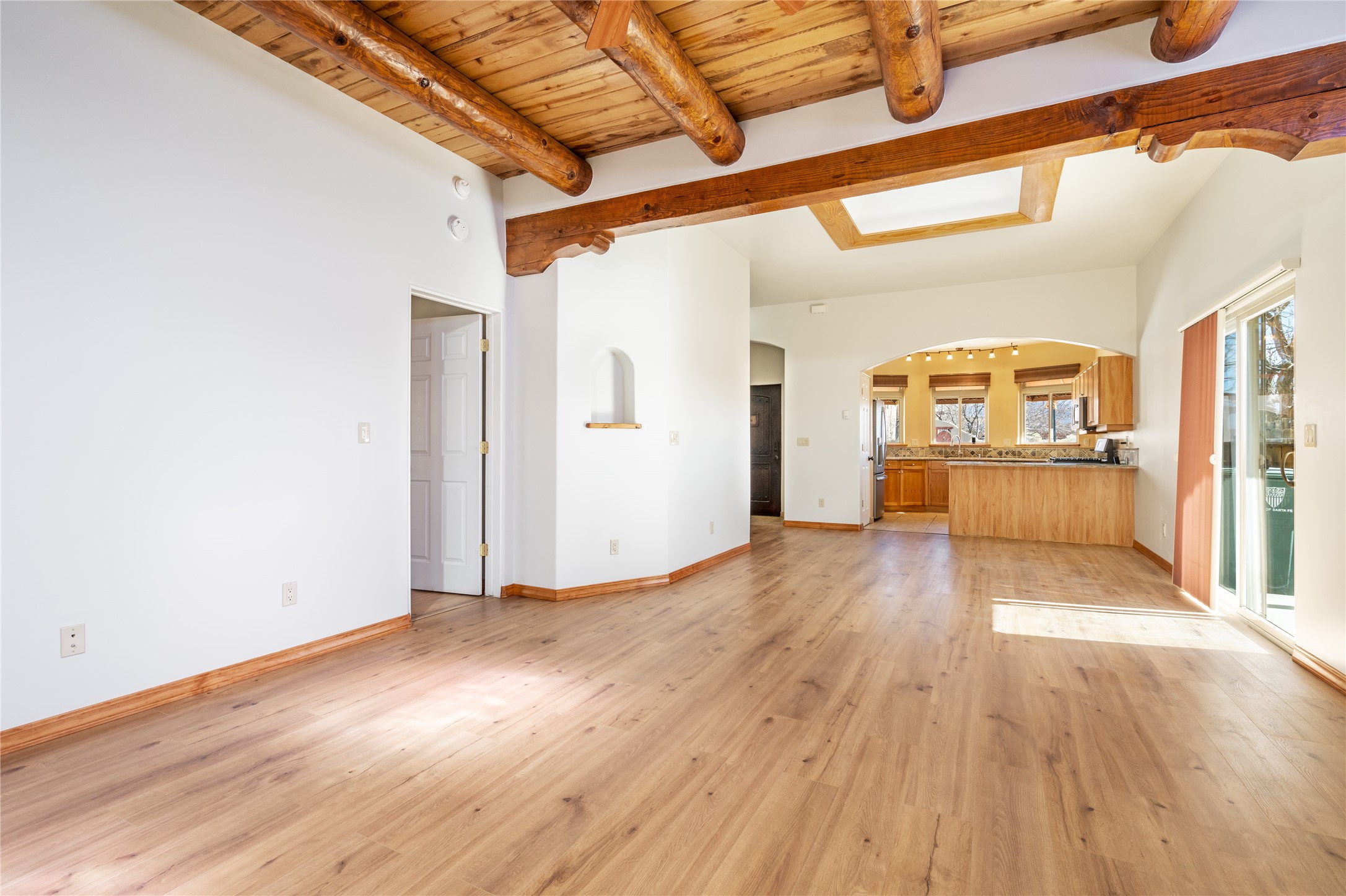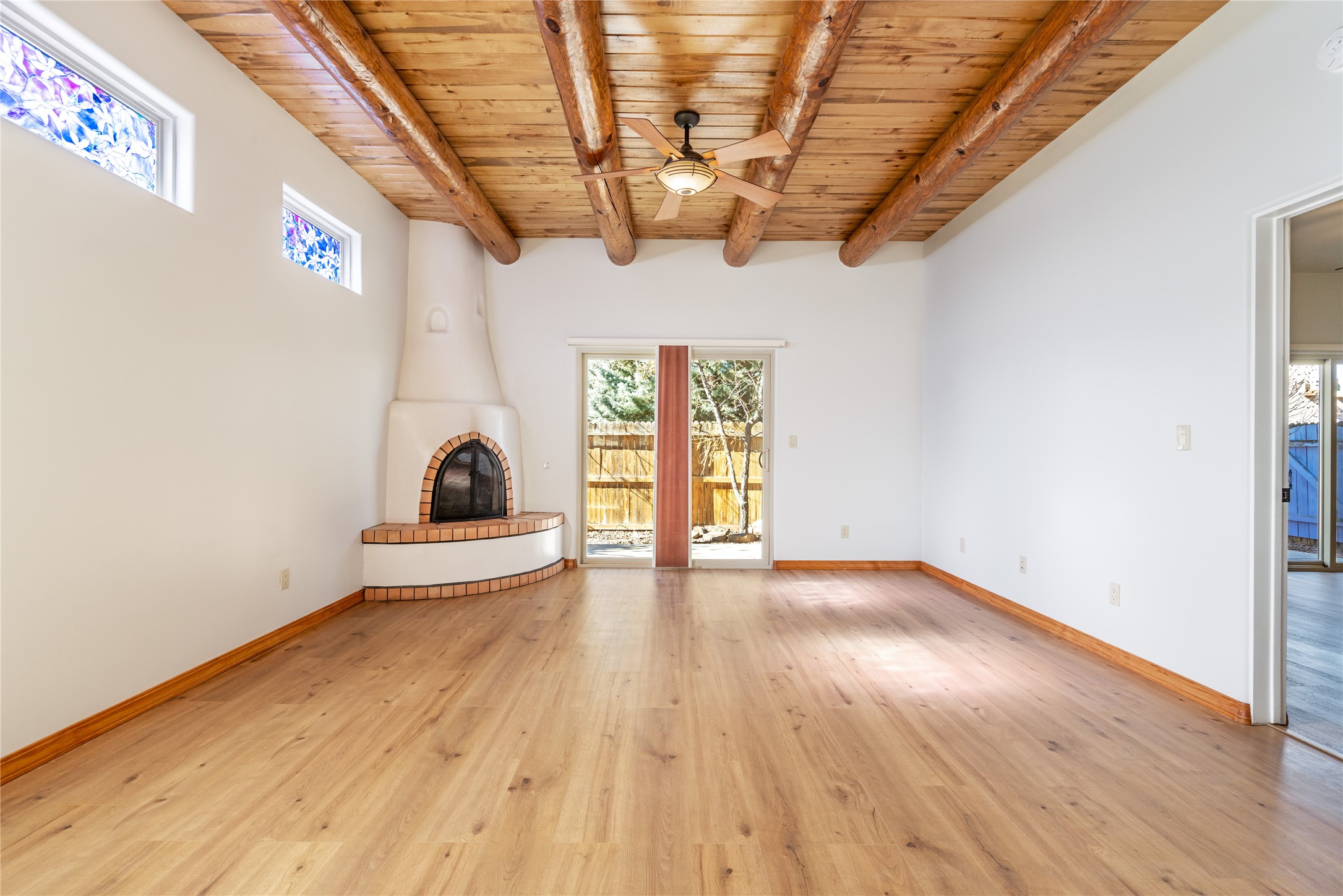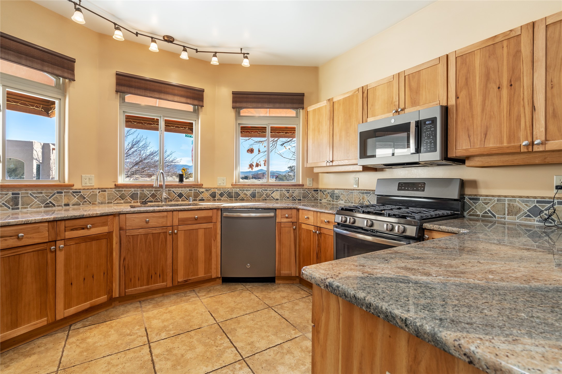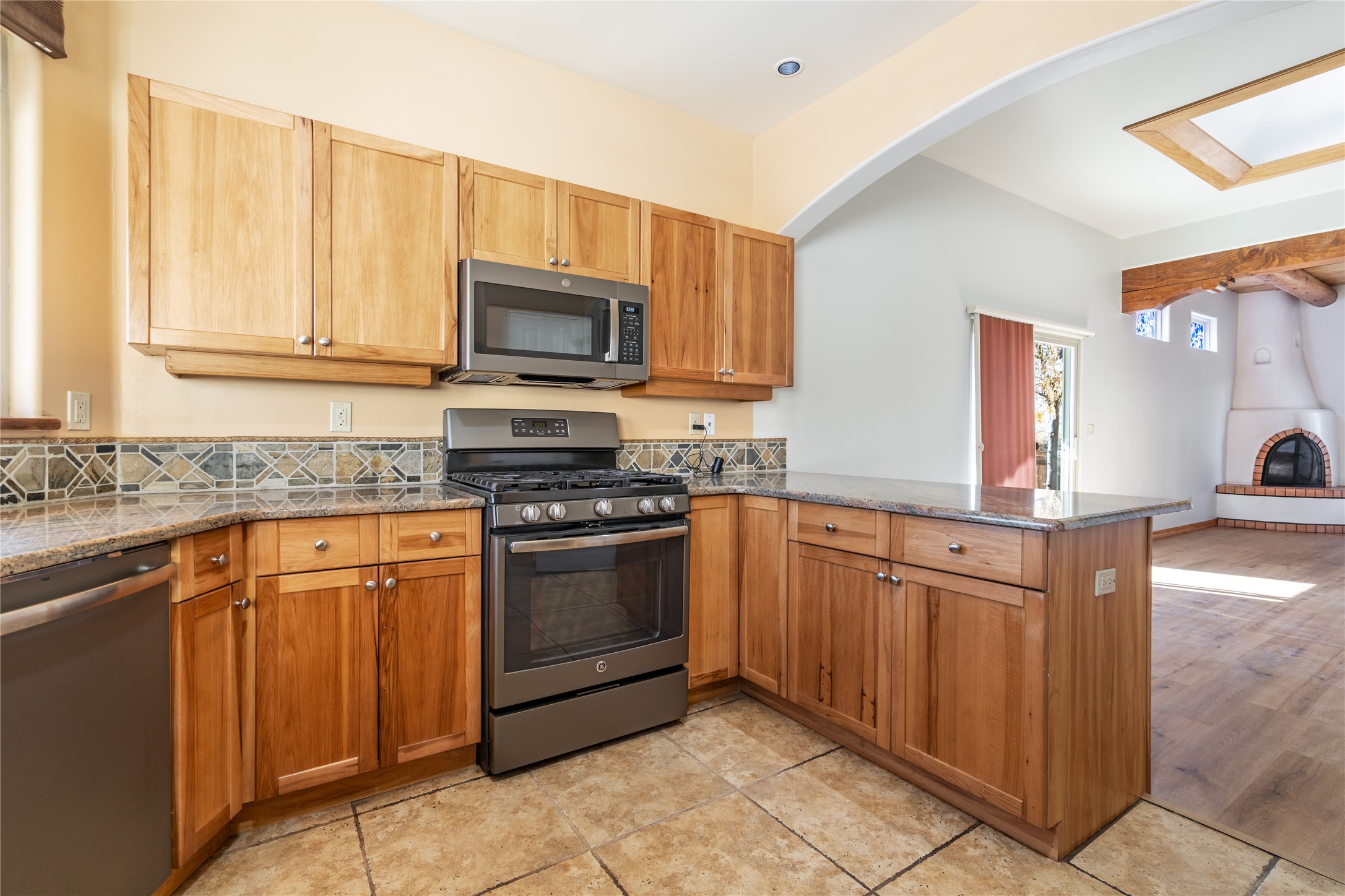 Conveniently located, desirable end unit in the Kachina Ridge neighborhood, this charming 3 bed, 2 bath single level and single family home with office/flex-space is adjacent to an arroyo and the Arroyo de Los Chamisos Urban Trail, offering the best of all worlds: a tucked away neighborhood feel with outdoor open space and convenient access to major arteries and shopping hubs.Traditional Southwest details include a kiva fireplace, nichos, a corbel beam, and viga and beam ceilings in the living area, complemented by contemporary features including laminate wood flooring in the living room and primary bedroom, radiant floor heating and refrigerated central air. Enjoy abundant natural light from clerestory windows and two sets of sliding doors in the living area, a large skylight in the dining area, and multiple windows in the welcoming kitchen with granite countertops and stainless steel appliances.An interior office or flex space as well as a 1-car garage with a 160 sq ft unfinished flex space is ideal for artists, hobbyists, remote workers, or additional storage. Hosts will love the landscaped sideyard with two portals and additional patio space, perfect for dining al fresco and soaking up our gorgeous skies.This lovely home is move-in ready and waiting for its next owner. Schedule a showing today!