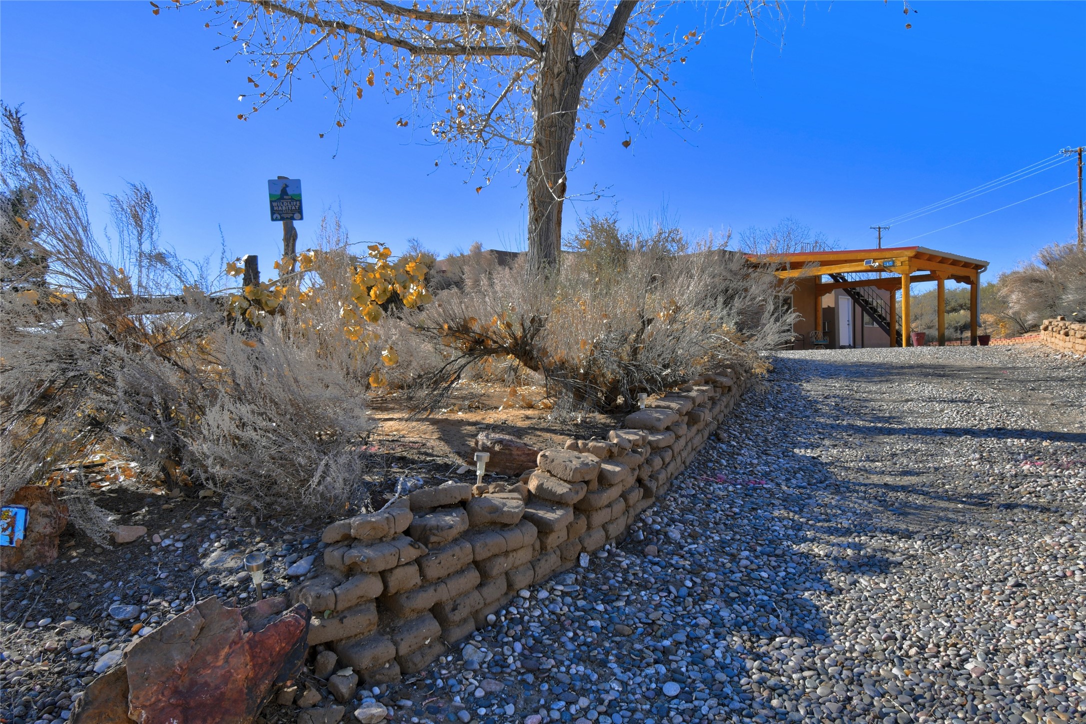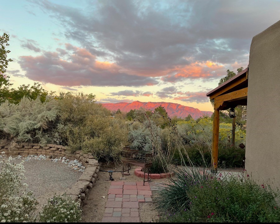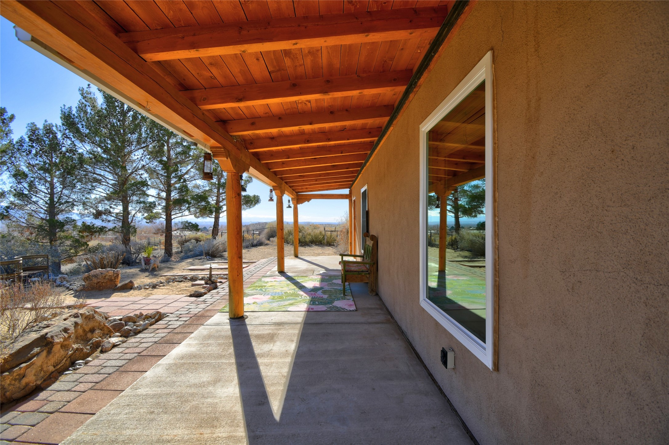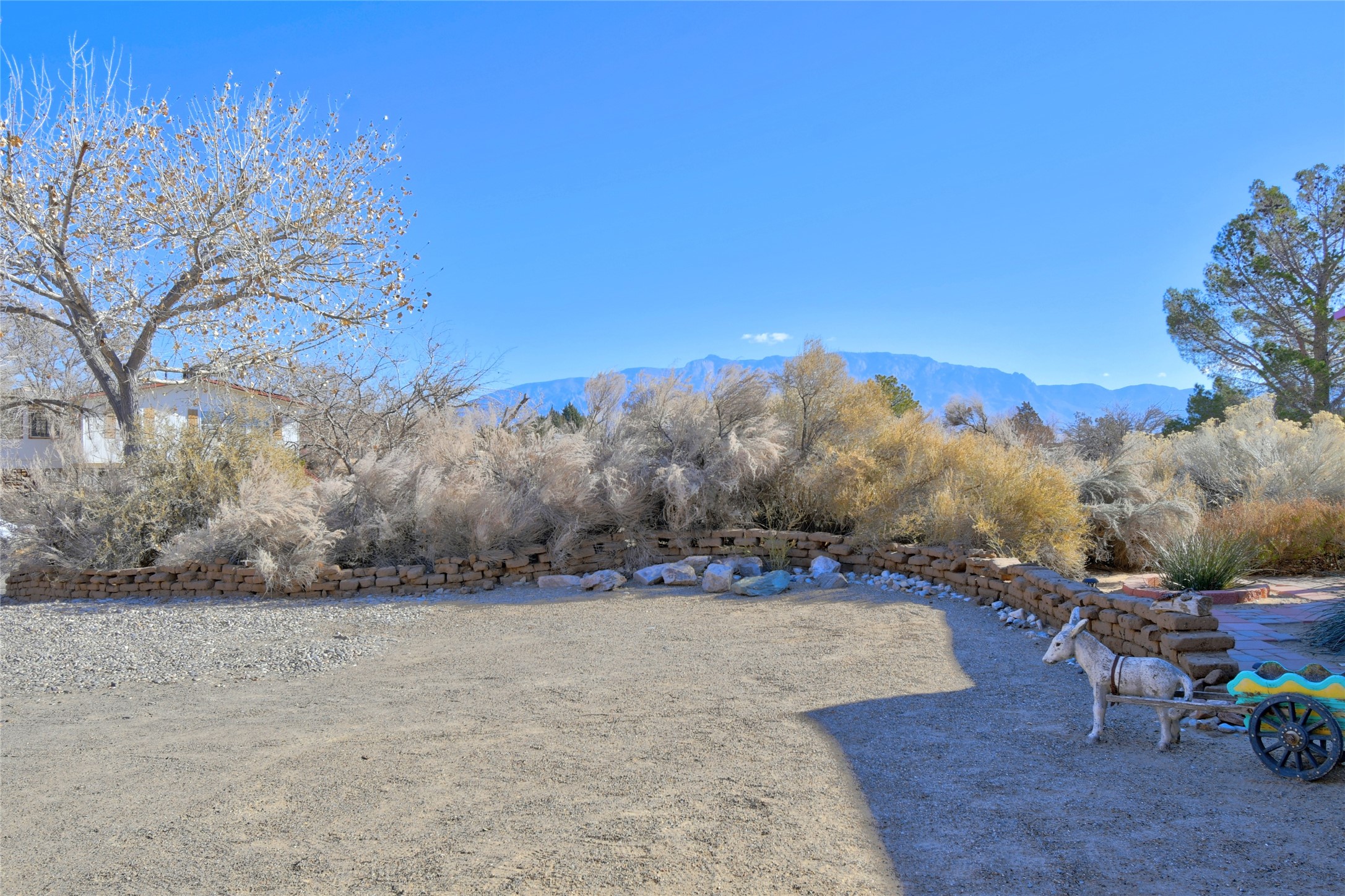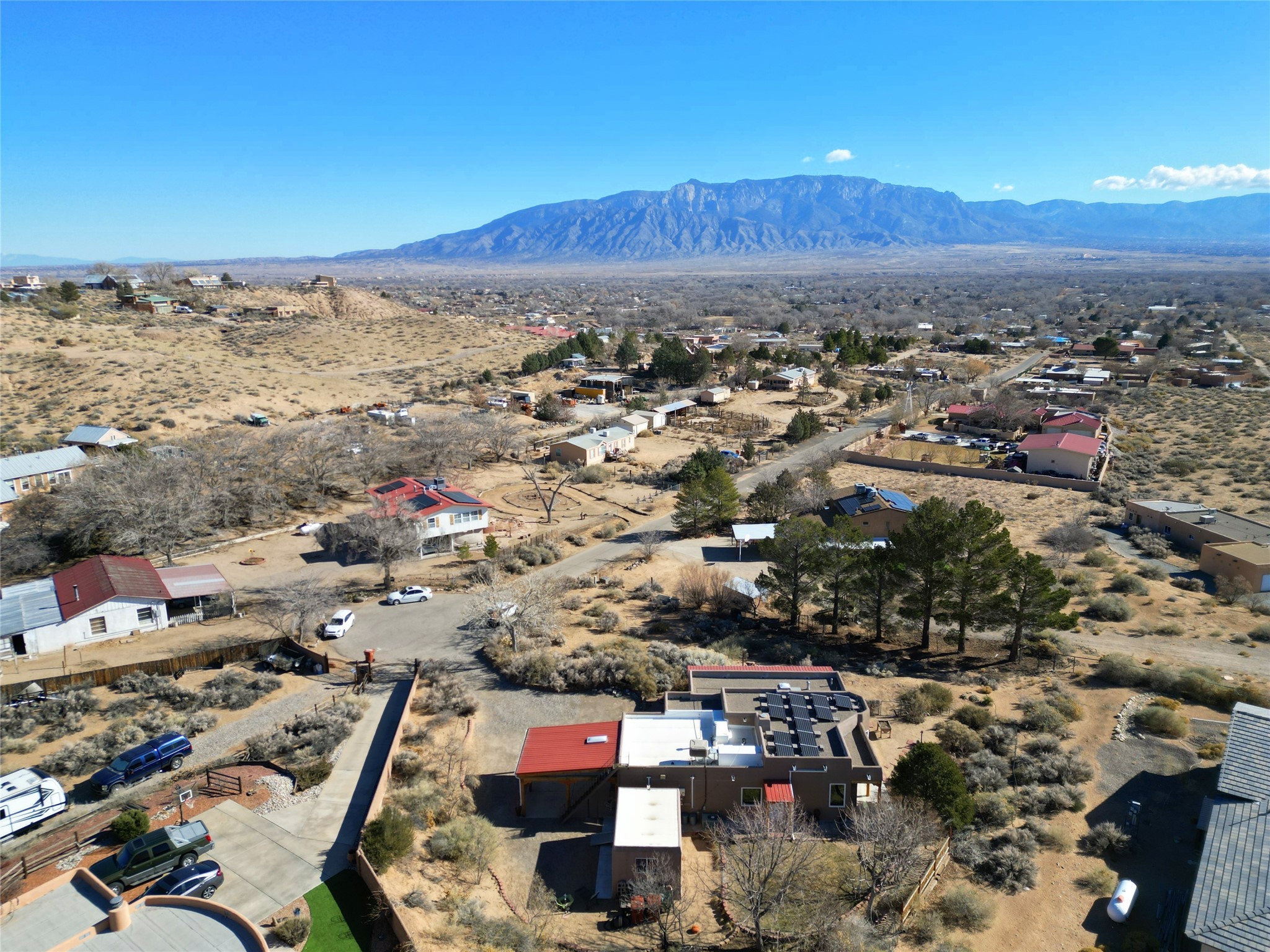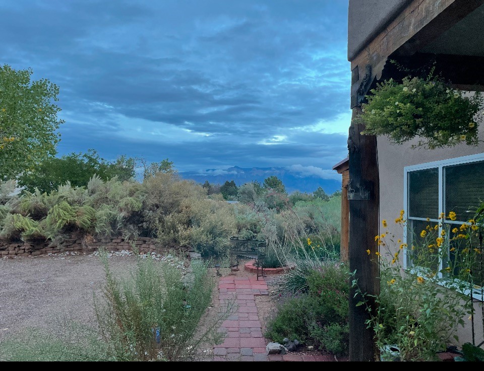 Experience the charm of Pueblo-style architecture in this welcoming home located in the Village of Corrales. This property includes three bedrooms and two bathrooms, a living room featuring high ceilings with corbelled beams for a bright and airy feel. Natural light floods the living spaces, enhanced by captivating daytime mountain and evening city lights views that provide a serene backdrop. Enjoy the benefits of nature and outdoor living with a covered porch and plenty of space for relaxation, entertaining and watching the quail. The home is equipped with owned solar panels, promoting energy efficiency and sustainability. An extra-large great room offers versatile usage for a home office, craft room, or play area, while a large, detached storage room adds convenience.