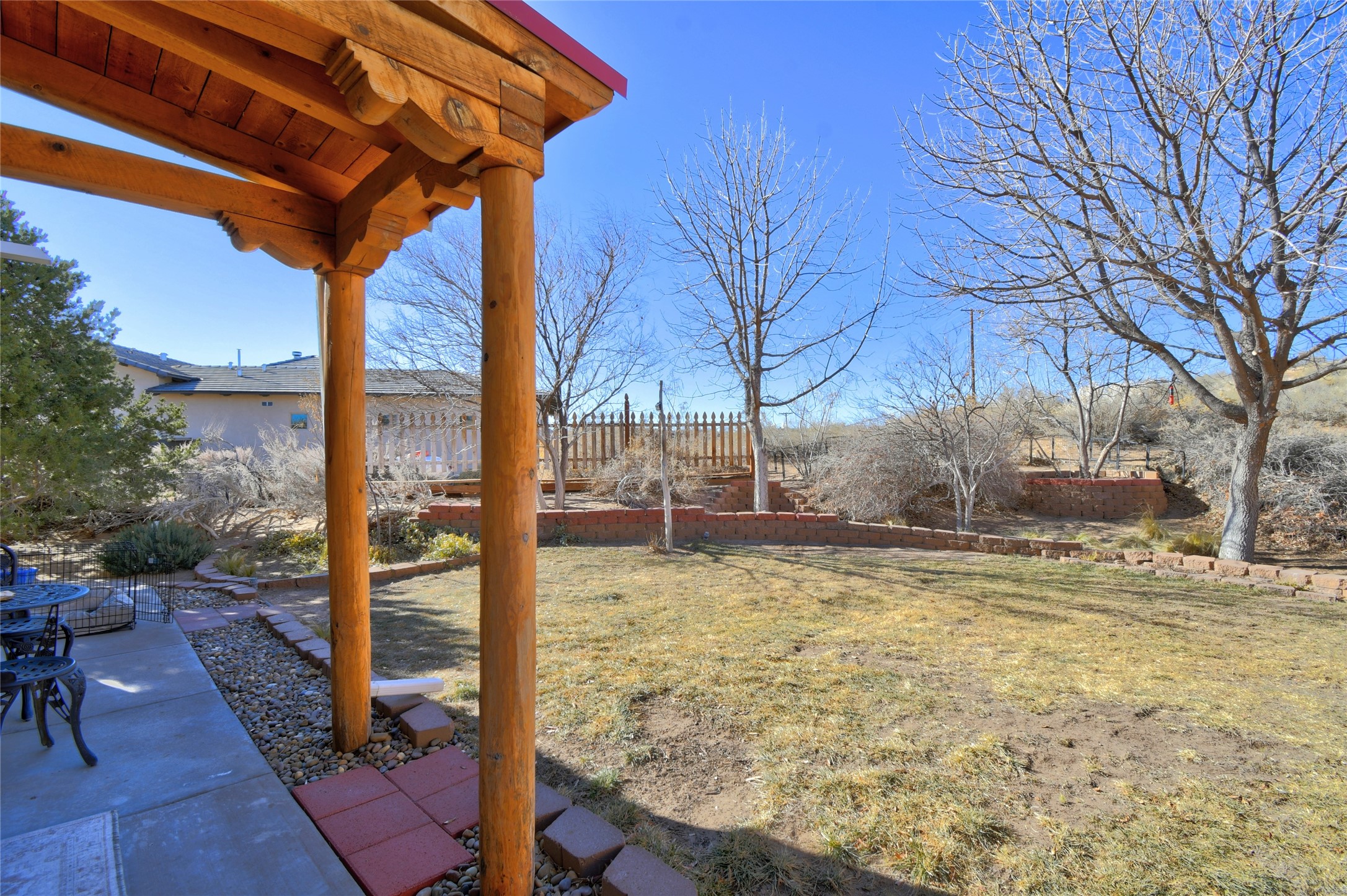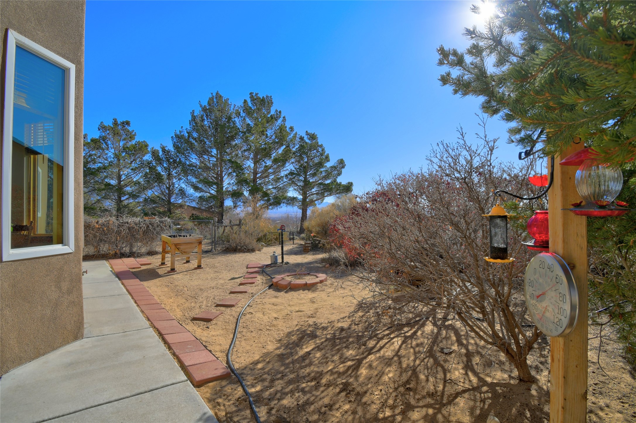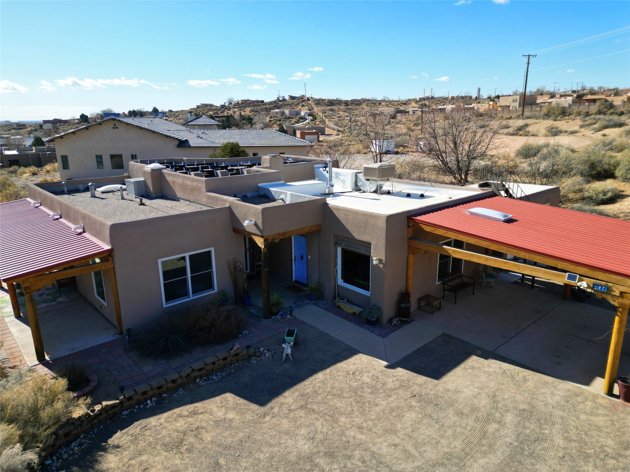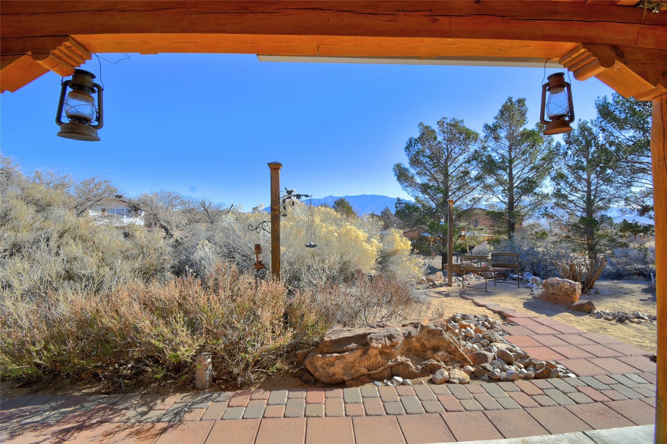 Experience the charm of Pueblo-style architecture in this welcoming home located in the Village of Corrales. This property includes three bedrooms and two bathrooms, a living room featuring high ceilings with corbelled beams for a bright and airy feel. Natural light floods the living spaces, enhanced by captivating daytime mountain and evening city lights views that provide a serene backdrop. Enjoy the benefits of nature and outdoor living with a covered porch and plenty of space for relaxation, entertaining and watching the quail. The home is equipped with owned solar panels, promoting energy efficiency and sustainability. An extra-large great room offers versatile usage for a home office, craft room, or play area, while a large, detached storage room adds convenience.