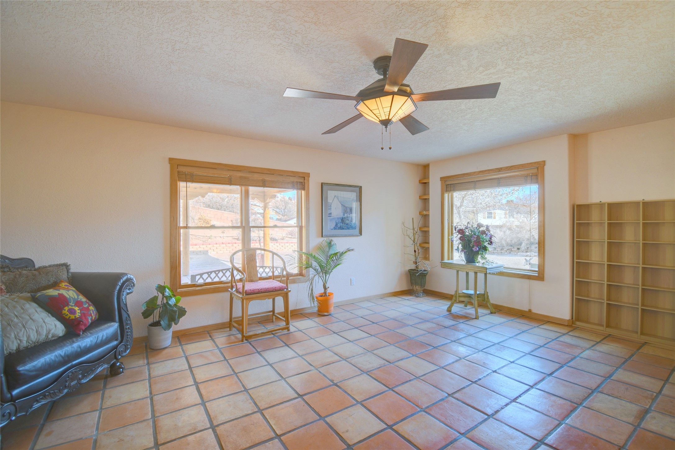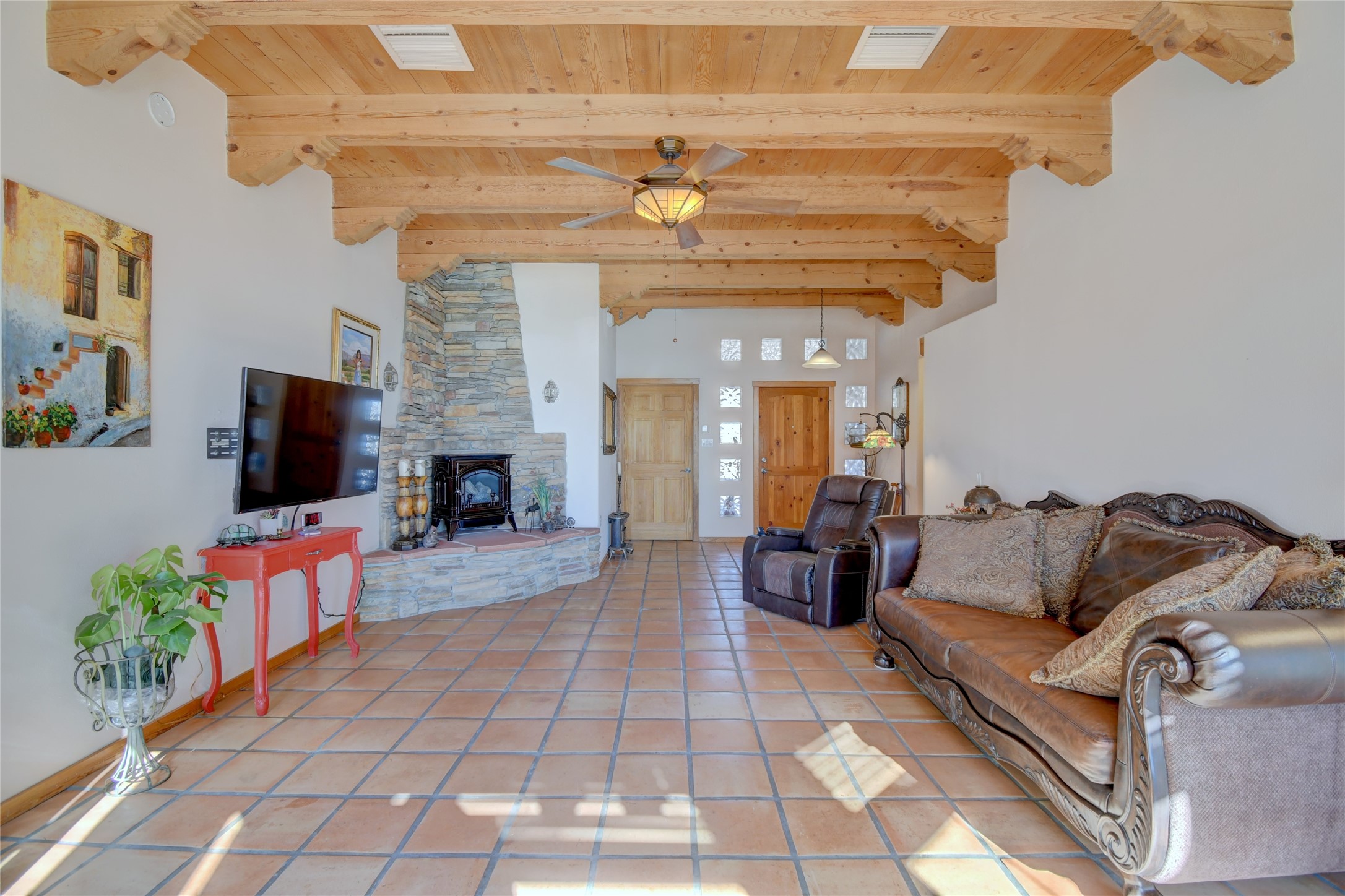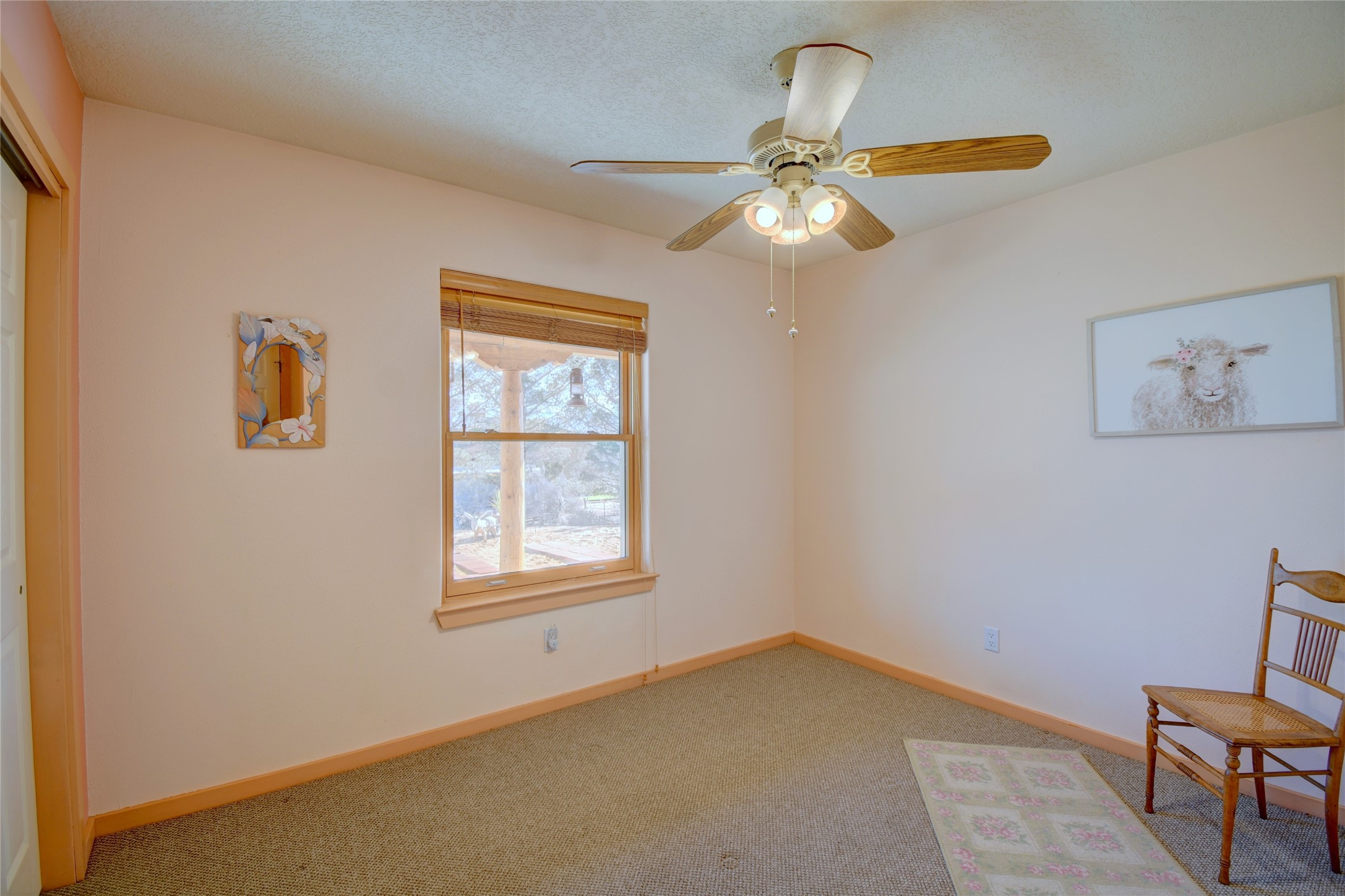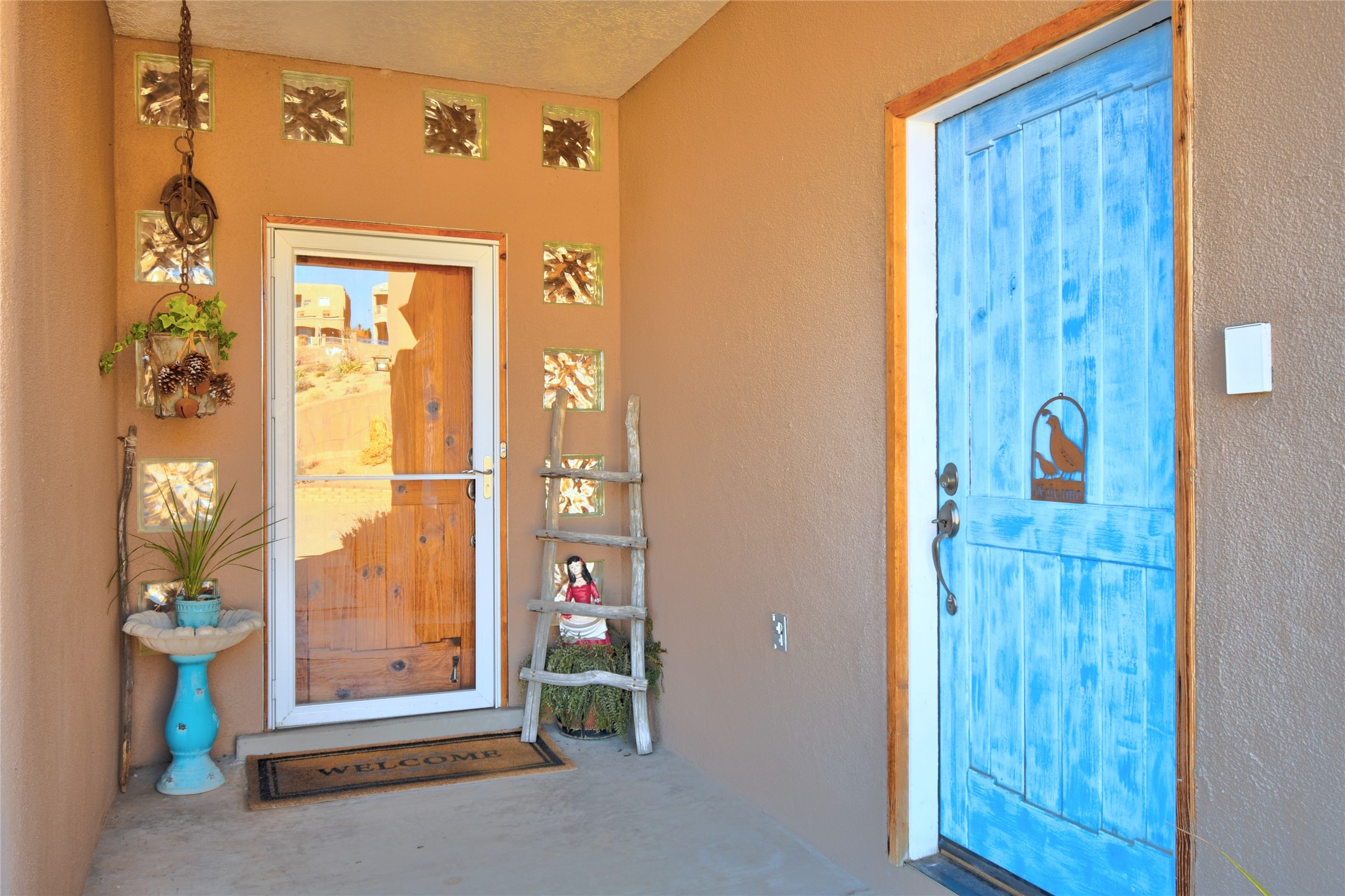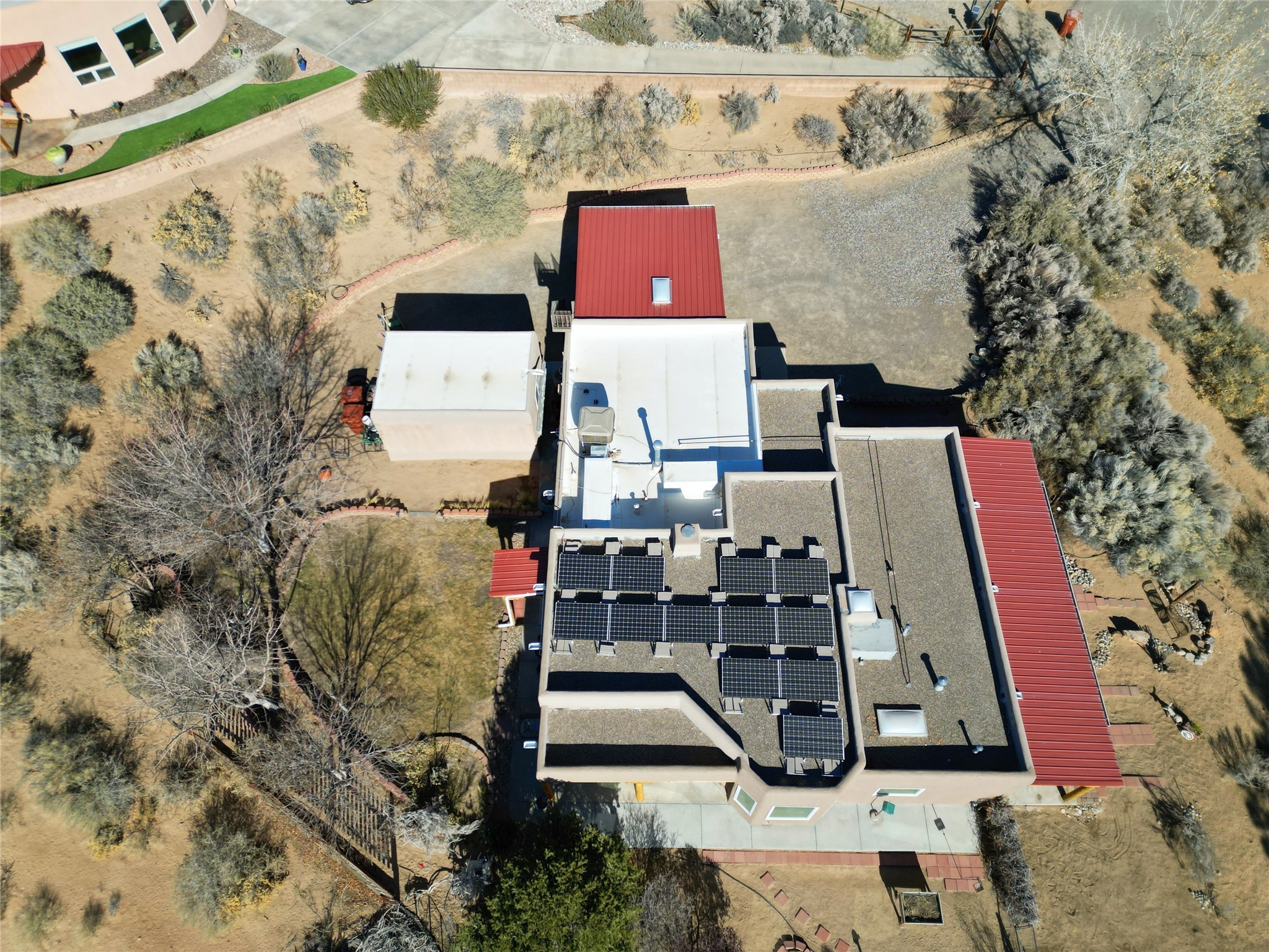 Experience the charm of Pueblo-style architecture in this welcoming home located in the Village of Corrales. This property includes three bedrooms and two bathrooms, a living room featuring high ceilings with corbelled beams for a bright and airy feel. Natural light floods the living spaces, enhanced by captivating daytime mountain and evening city lights views that provide a serene backdrop. Enjoy the benefits of nature and outdoor living with a covered porch and plenty of space for relaxation, entertaining and watching the quail. The home is equipped with owned solar panels, promoting energy efficiency and sustainability. An extra-large great room offers versatile usage for a home office, craft room, or play area, while a large, detached storage room adds convenience.