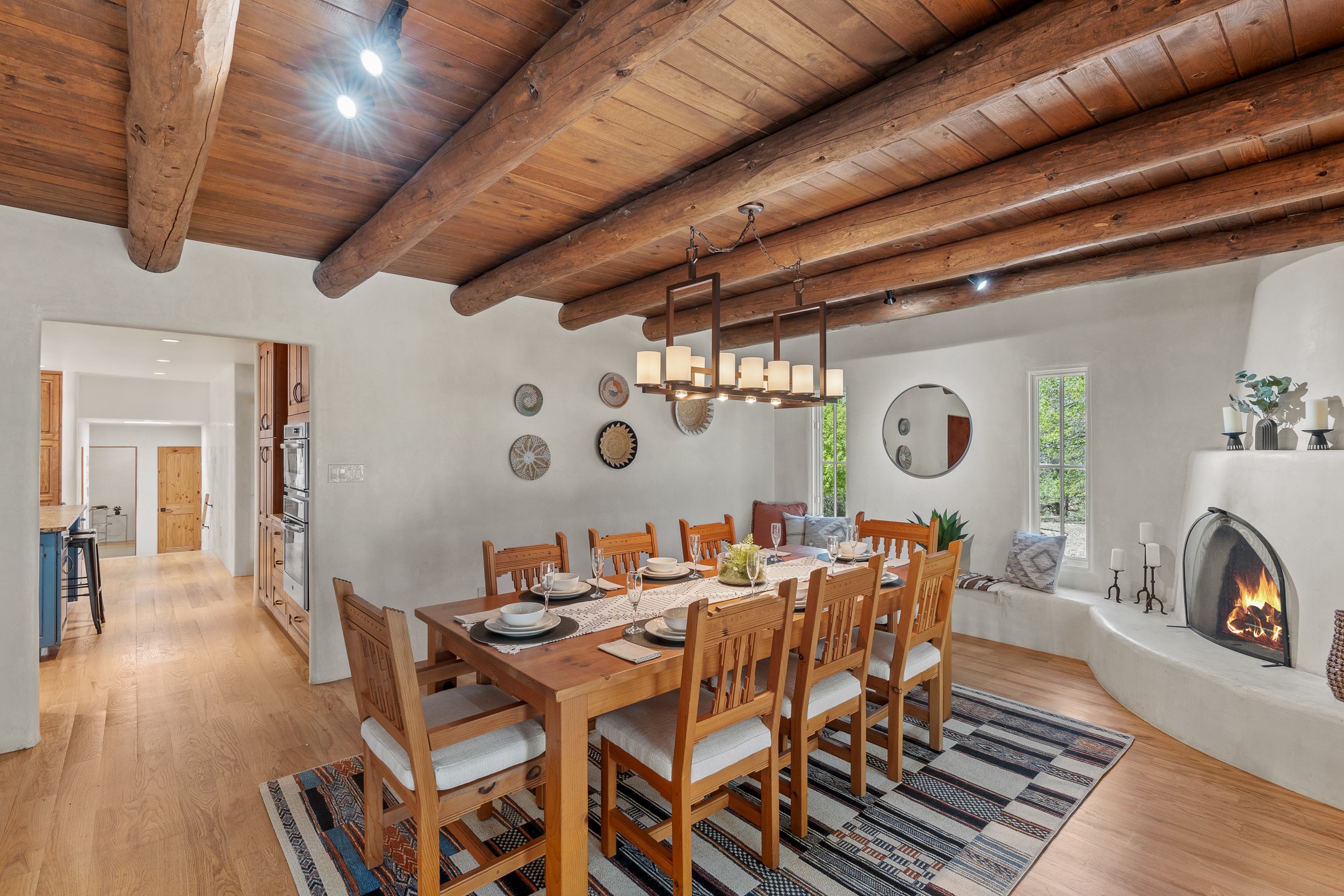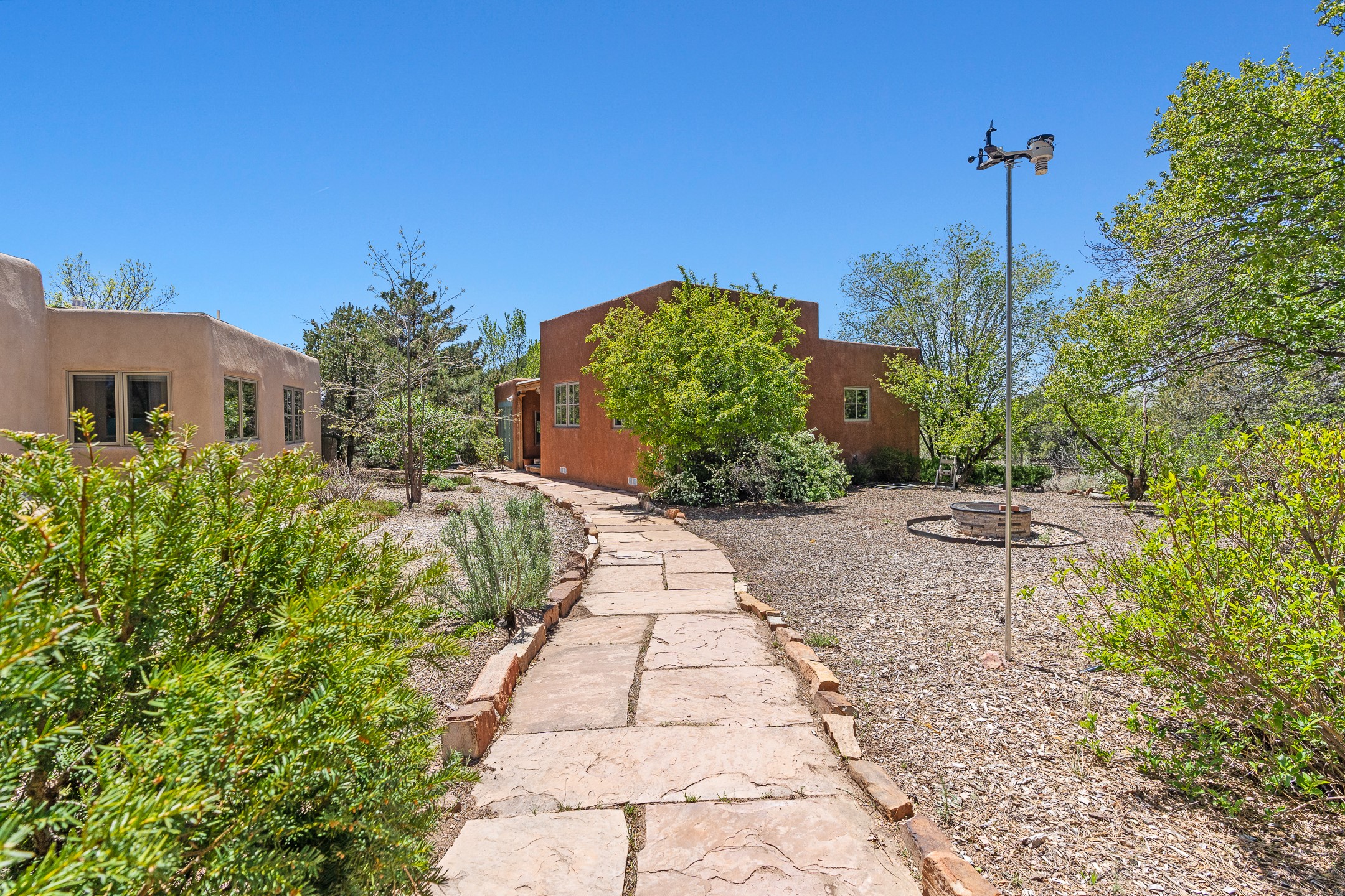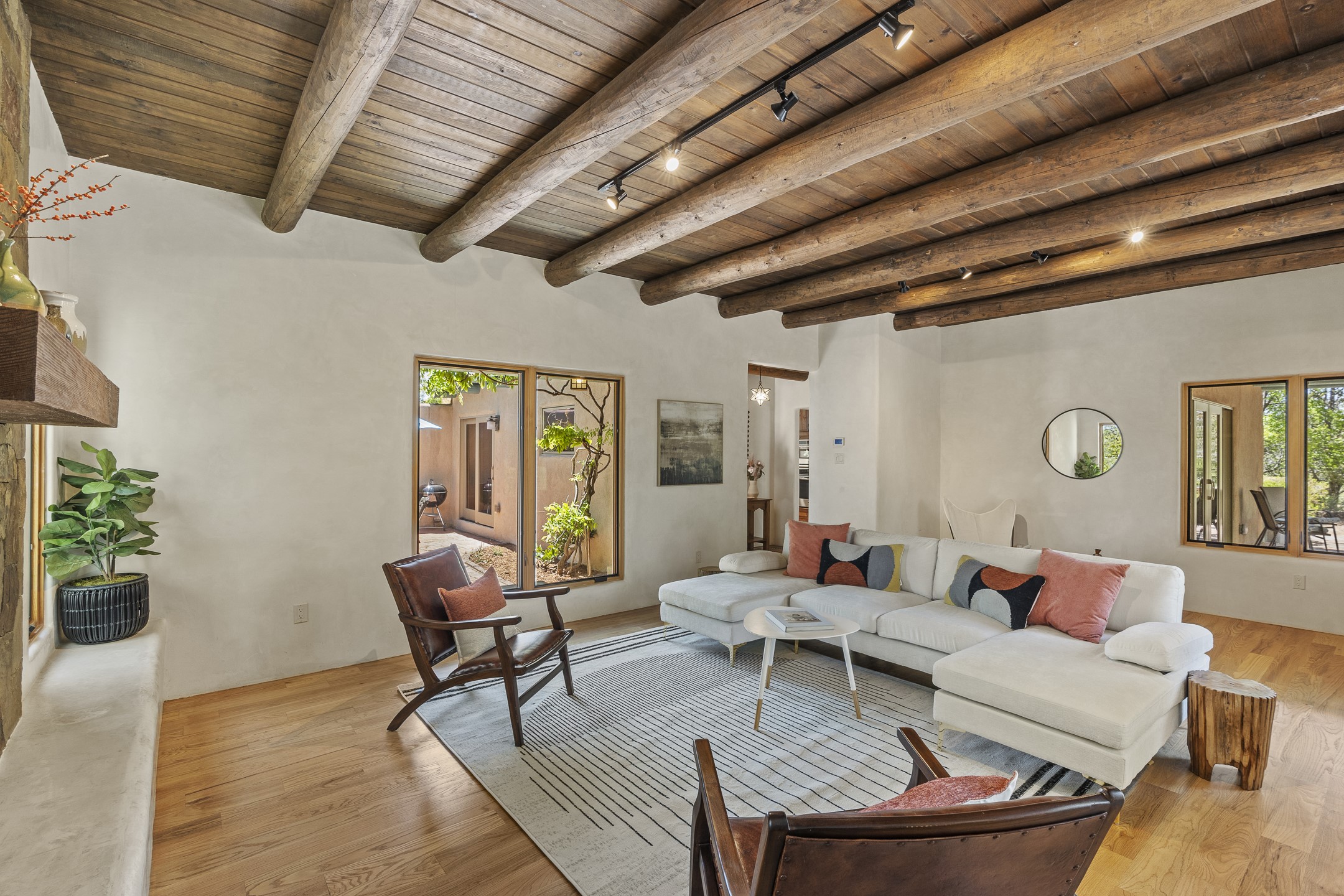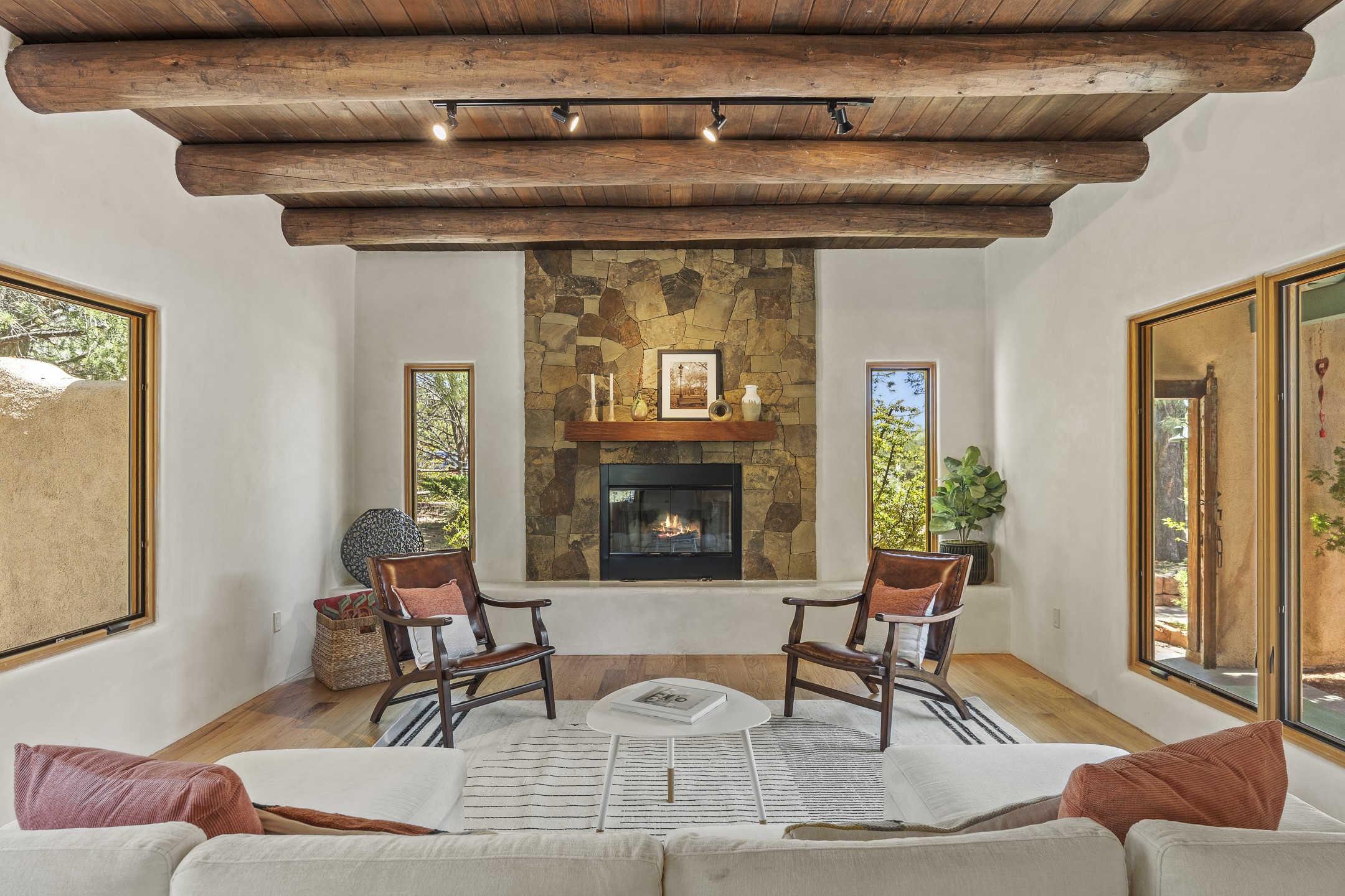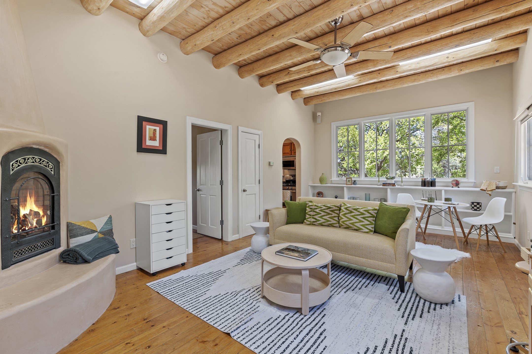 Beautifully renovated and reimagined in 2017, this exceptional property offers a main residence with 3 bedrooms and 2.5 baths, a detached 1-bedroom/1-bath casita with a full kitchen and 3/4 bath, and a versatile studio/gym. Behind a private walled courtyard, the home welcomes you with warmth and charm. Inside, the elegant living room features a stone fireplace and tall ceilings with wooden beams, and the inviting dining room continues with a classic Kiva and French sliding doors opening to a covered portal and expansive .6 acre lot. A bright and open secondary living area sits just off the kitchen, creating a connected flow for everyday living and entertaining. The kitchen was reimagined for both form and function, featuring warm-toned cabinetry, granite countertops, expanded storage, and a six-burner Wolf range. Past the kitchen, a fews stops down lead to the laundry room with direct access to the 2 car garage, and a central hallway leads to the private bedroom wing. The primary suite offers a tranquil retreat, complete with a deep soaking tub, dual vanities, and a generous walk-in closet. Additional improvements include smooth plaster walls, a reconfigured guest and powder bath, upgraded electrical panel, windows, roof, furnace, and beautifully refinished wood floors. Mini-split systems have been added to the guesthouse and studio for year-round comfort and the drip irrigation has a brand new controller.Located in a coveted residential neighborhood with a rare in-town private well, this singular property backs to the scenic Arroyo Chamiso and offers direct access to the Dale Ball Trails near St. John's College. The Casita and studio provide elevated flexibility, whether as a home office, creative retreat, guest/ family quarters or income-producing rental.Set within the sought-after Wood Gormley School District and just minutes from downtown, this is a rare blend of charm, versatility, and design.