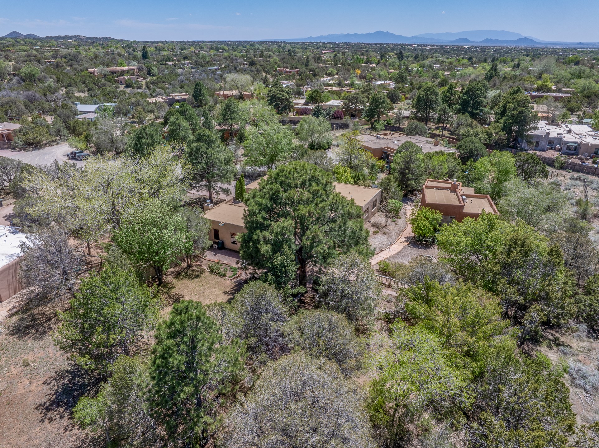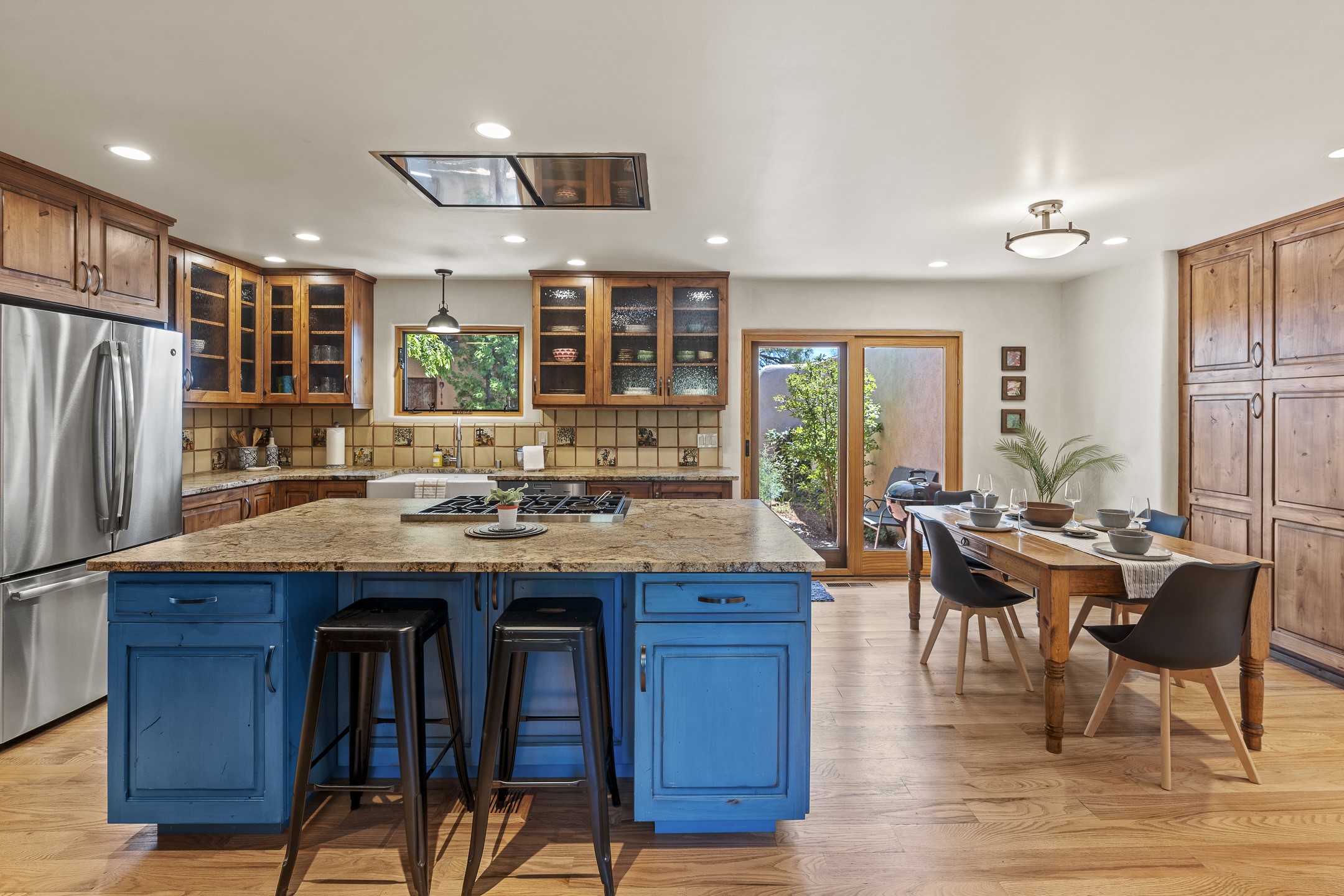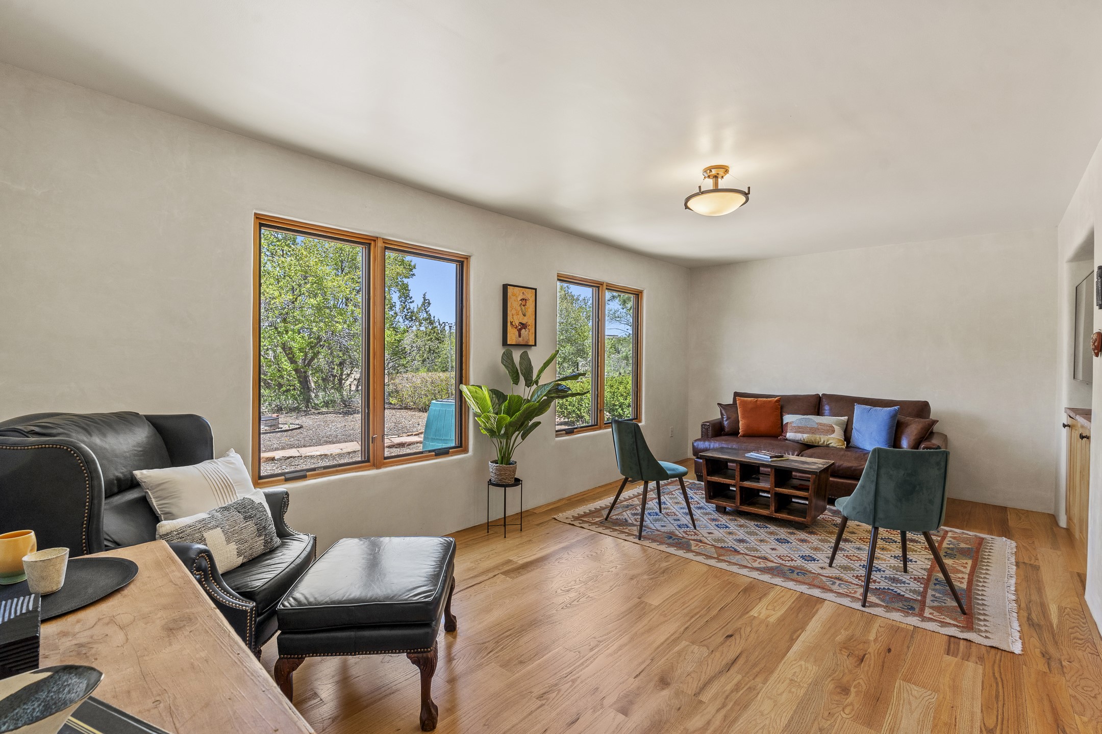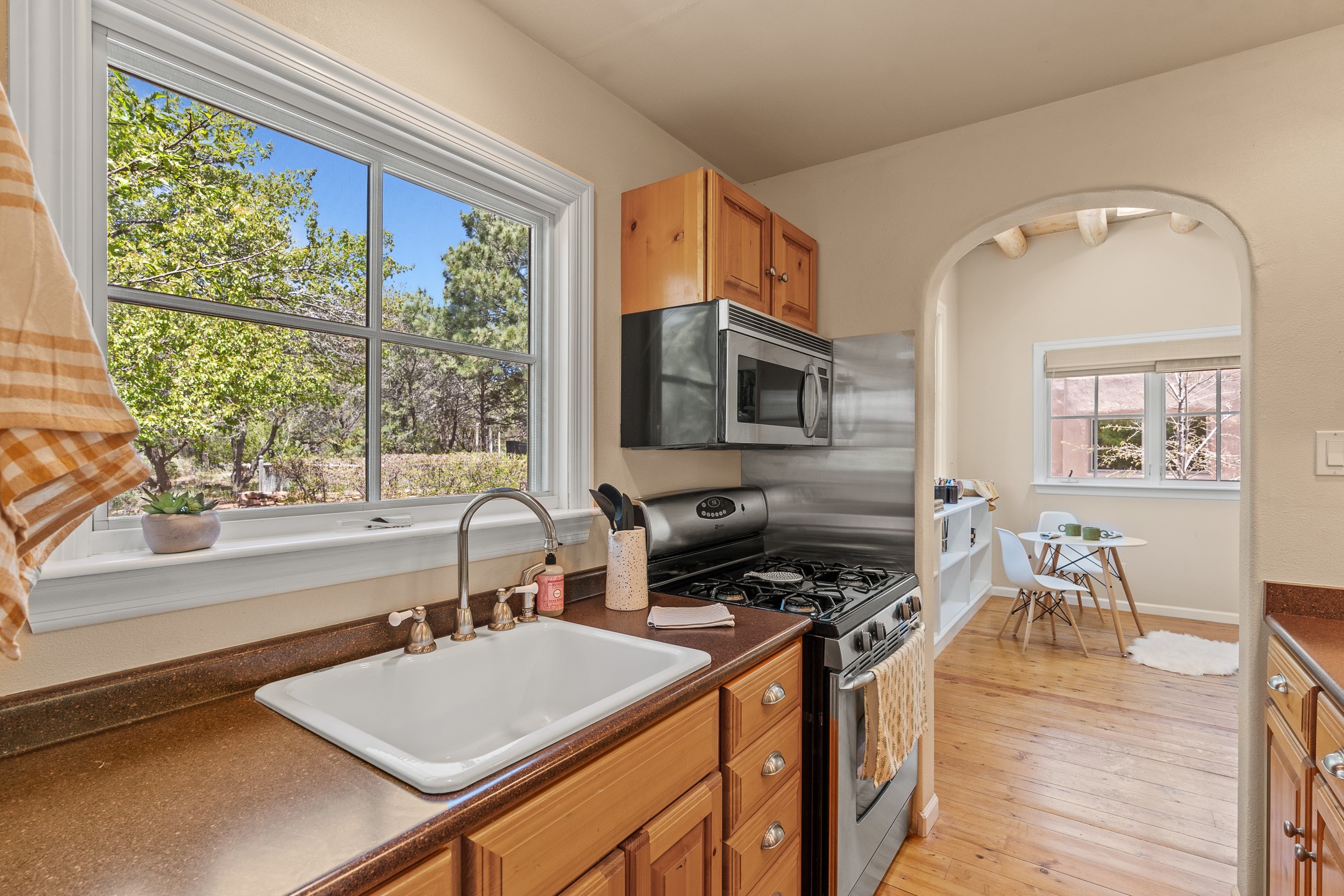 Beautifully renovated and reimagined in 2017, this exceptional property offers a main residence with 3 bedrooms and 2.5 baths, a detached 1-bedroom/1-bath casita with a full kitchen and 3/4 bath, and a versatile studio/gym. Behind a private walled courtyard, the home welcomes you with warmth and charm. Inside, the elegant living room features a stone fireplace and tall ceilings with wooden beams, and the inviting dining room continues with a classic Kiva and French sliding doors opening to a covered portal and expansive .6 acre lot. A bright and open secondary living area sits just off the kitchen, creating a connected flow for everyday living and entertaining. The kitchen was reimagined for both form and function, featuring warm-toned cabinetry, granite countertops, expanded storage, and a six-burner Wolf range. Past the kitchen, a fews stops down lead to the laundry room with direct access to the 2 car garage, and a central hallway leads to the private bedroom wing. The primary suite offers a tranquil retreat, complete with a deep soaking tub, dual vanities, and a generous walk-in closet. Additional improvements include smooth plaster walls, a reconfigured guest and powder bath, upgraded electrical panel, windows, roof, furnace, and beautifully refinished wood floors. Mini-split systems have been added to the guesthouse and studio for year-round comfort and the drip irrigation has a brand new controller.Located in a coveted residential neighborhood with a rare in-town private well, this singular property backs to the scenic Arroyo Chamiso and offers direct access to the Dale Ball Trails near St. John's College. The Casita and studio provide elevated flexibility, whether as a home office, creative retreat, guest/ family quarters or income-producing rental.Set within the sought-after Wood Gormley School District and just minutes from downtown, this is a rare blend of charm, versatility, and design.