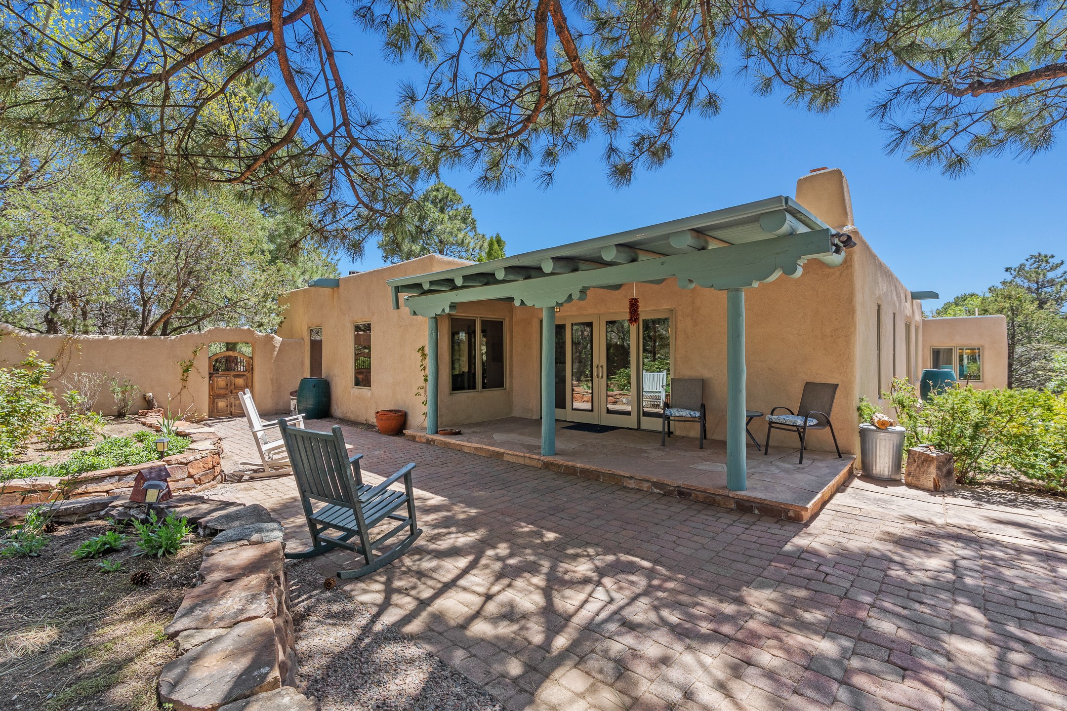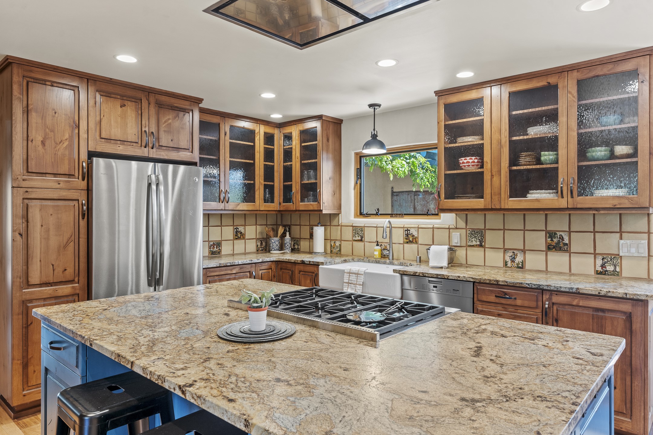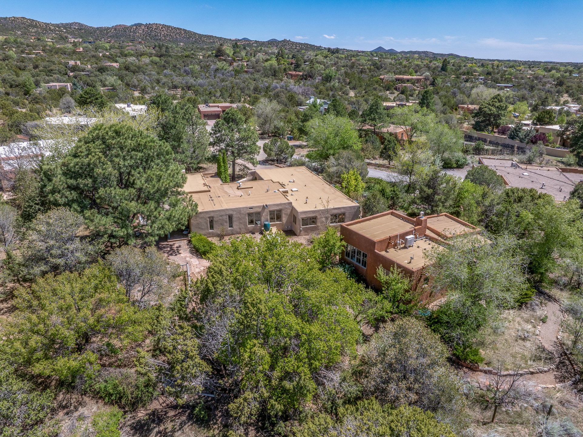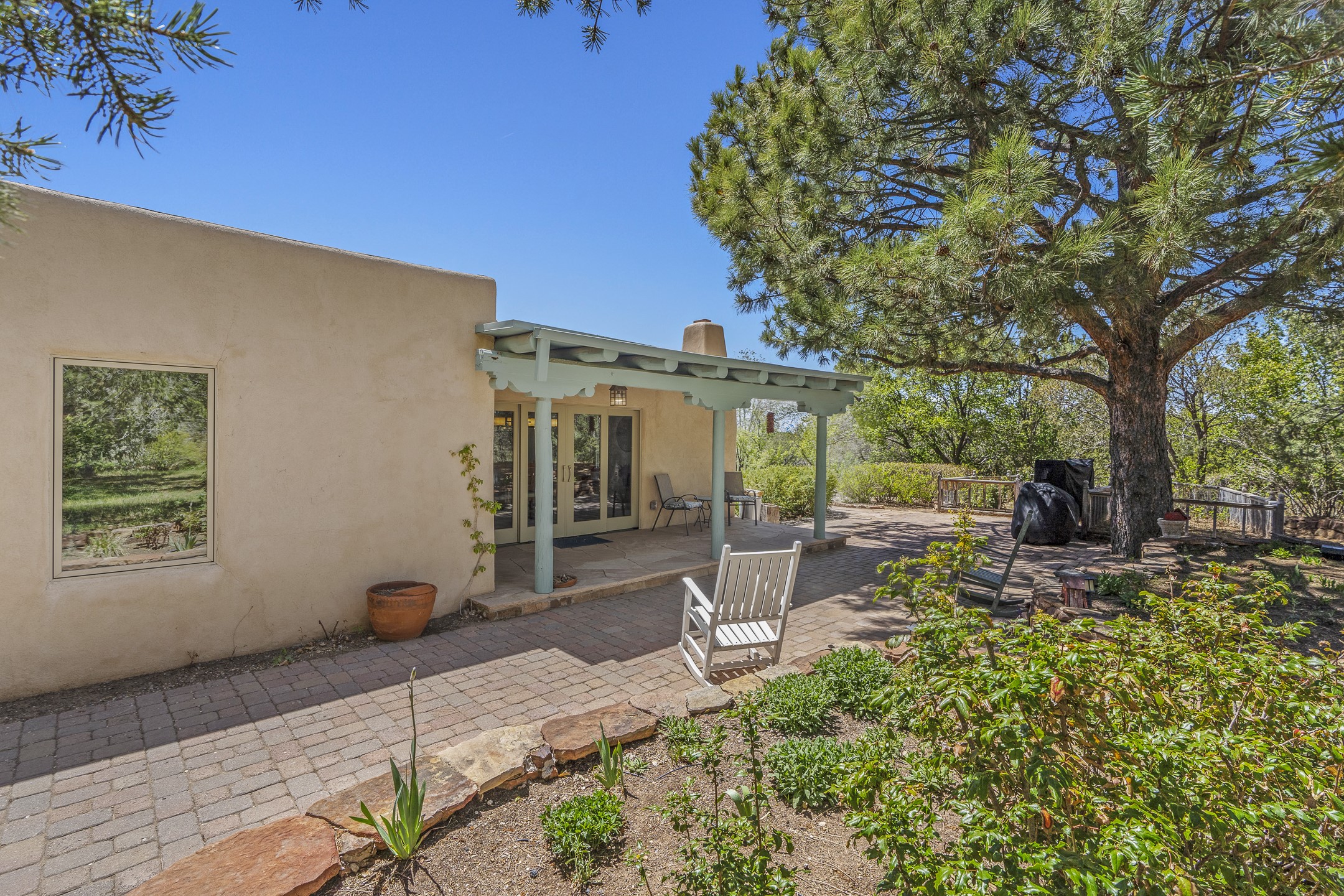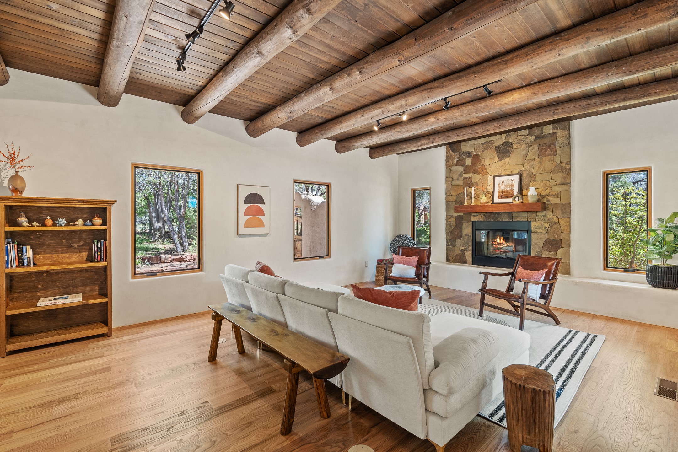Beautifully renovated and reimagined in 2017, this exceptional property offers a main residence with 3 bedrooms and 2.5 baths, a detached 1-bedroom/1-bath casita with a full kitchen and 3/4 bath, and a versatile studio/gym. Behind a private walled courtyard, the home welcomes you with warmth and charm. Inside, the elegant living room features a stone fireplace and tall ceilings with wooden beams, and the inviting dining room continues with a classic Kiva and French sliding doors opening to a covered portal and expansive .6 acre lot. A bright and open secondary living area sits just off the kitchen, creating a connected flow for everyday living and entertaining. The kitchen was reimagined for both form and function, featuring warm-toned cabinetry, granite countertops, expanded storage, and a six-burner Wolf range. Past the kitchen, a fews stops down lead to the laundry room with direct access to the 2 car garage, and a central hallway leads to the private bedroom wing. The primary suite offers a tranquil retreat, complete with a deep soaking tub, dual vanities, and a generous walk-in closet. Additional improvements include smooth plaster walls, a reconfigured guest and powder bath, upgraded electrical panel, windows, roof, furnace, and beautifully refinished wood floors. Mini-split systems have been added to the guesthouse and studio for year-round comfort and the drip irrigation has a brand new controller.Located in a coveted residential neighborhood with a rare in-town private well, this singular property backs to the scenic Arroyo Chamiso and offers direct access to the Dale Ball Trails near St. John's College. The Casita and studio provide elevated flexibility, whether as a home office, creative retreat, guest/ family quarters or income-producing rental.Set within the sought-after Wood Gormley School District and just minutes from downtown, this is a rare blend of charm, versatility, and design.