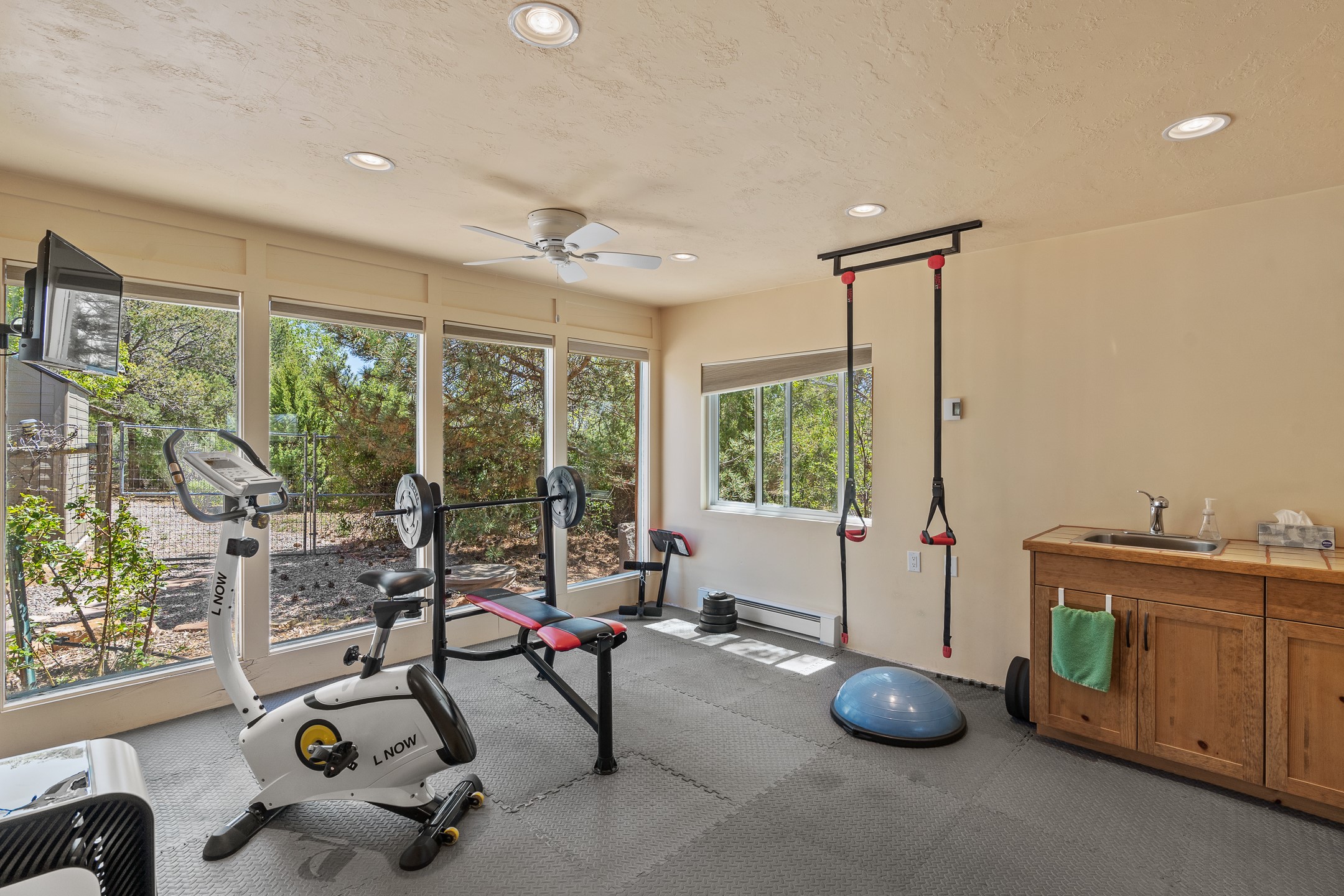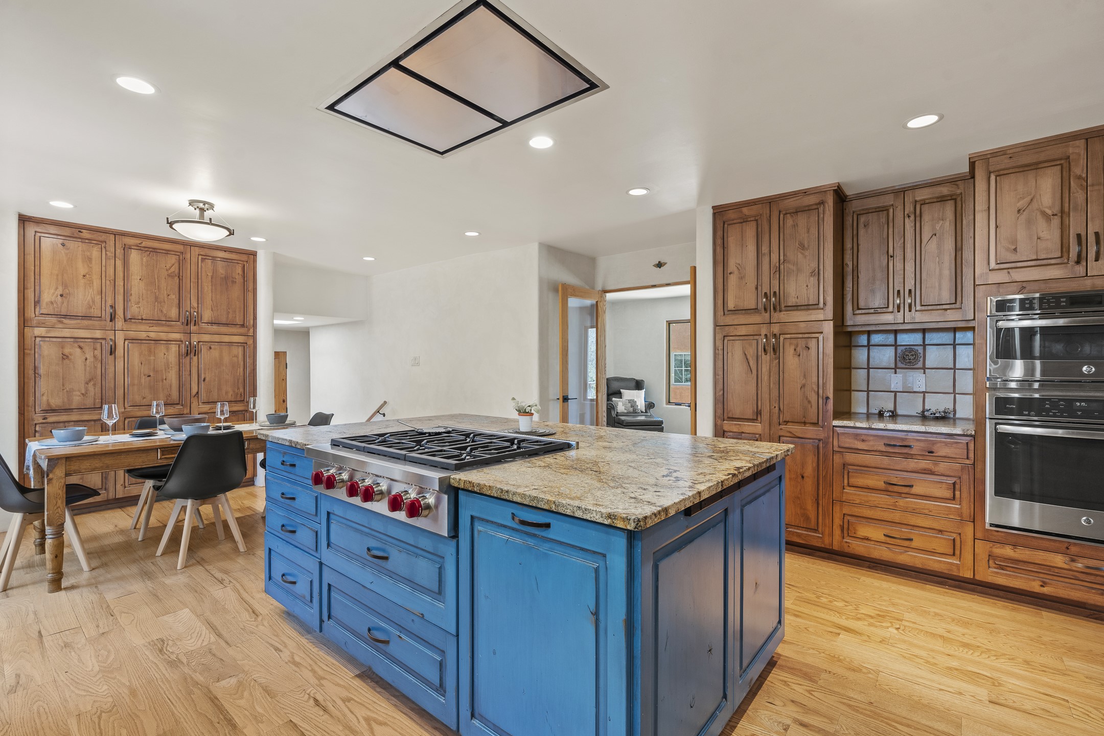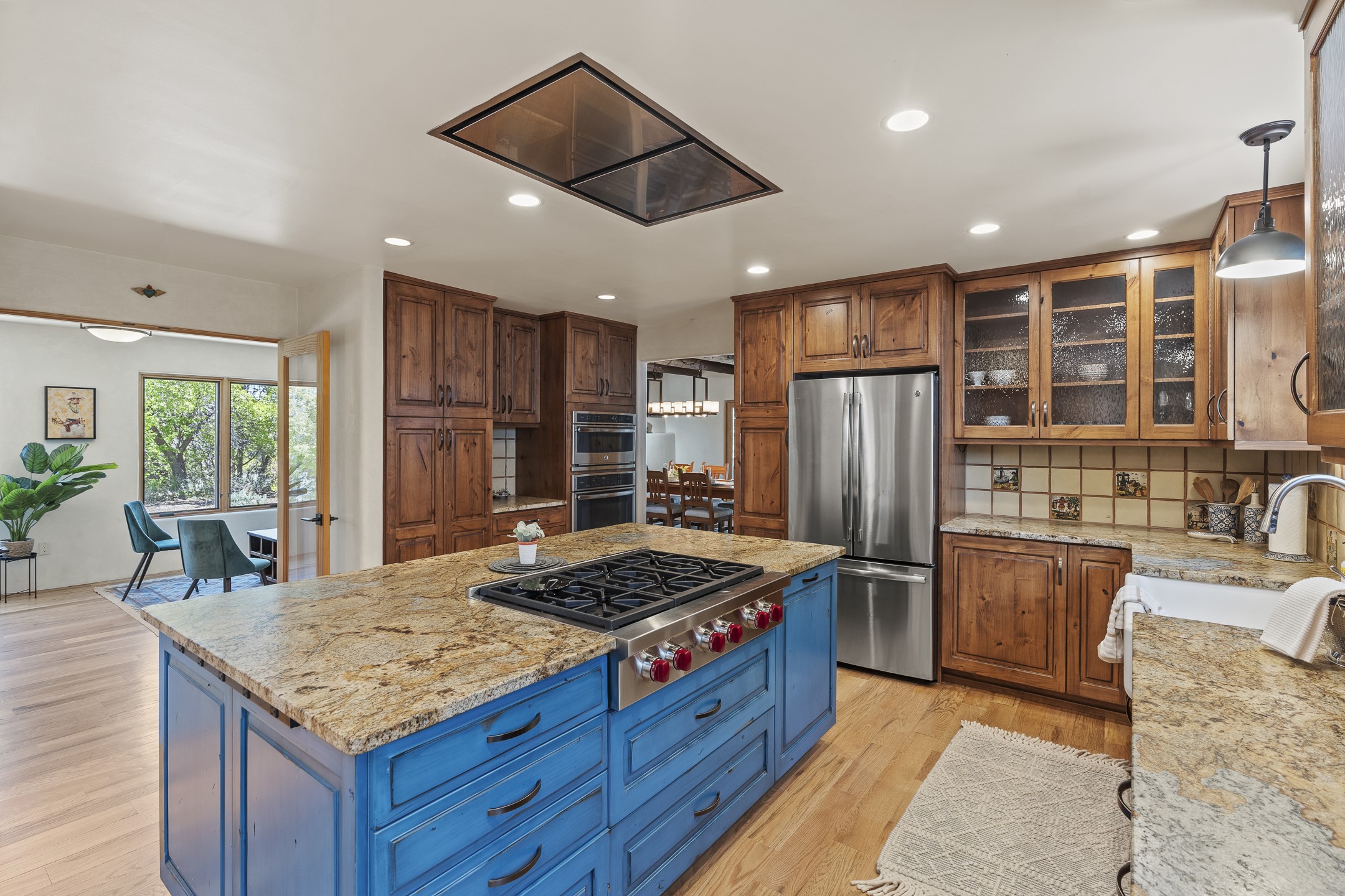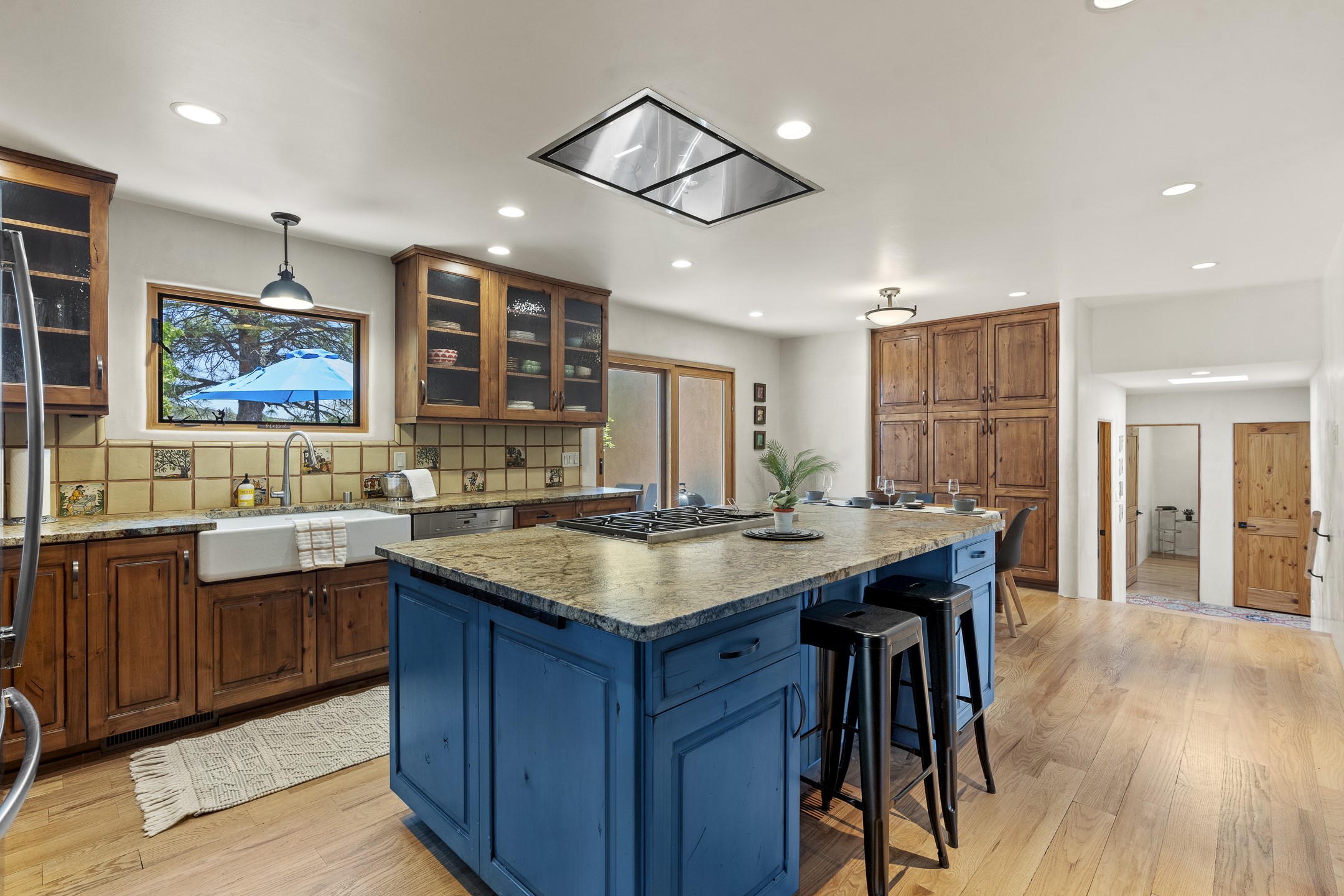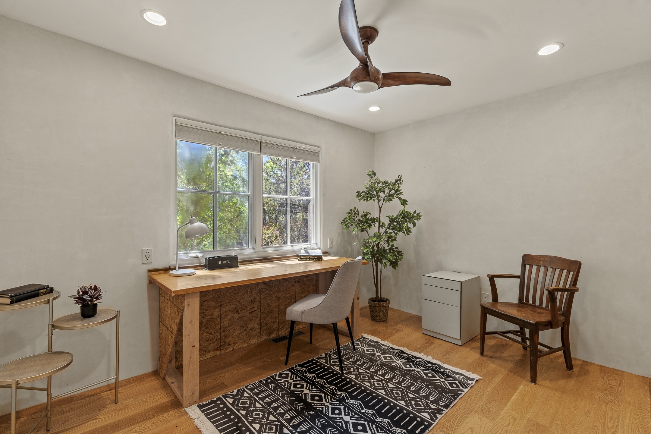 Beautifully renovated and reimagined in 2017, this exceptional property offers a main residence with 3 bedrooms and 2.5 baths, a detached 1-bedroom/1-bath casita with a full kitchen and 3/4 bath, and a versatile studio/gym. Behind a private walled courtyard, the home welcomes you with warmth and charm. Inside, the elegant living room features a stone fireplace and tall ceilings with wooden beams, and the inviting dining room continues with a classic Kiva and French sliding doors opening to a covered portal and expansive .6 acre lot. A bright and open secondary living area sits just off the kitchen, creating a connected flow for everyday living and entertaining. The kitchen was reimagined for both form and function, featuring warm-toned cabinetry, granite countertops, expanded storage, and a six-burner Wolf range. Past the kitchen, a fews stops down lead to the laundry room with direct access to the 2 car garage, and a central hallway leads to the private bedroom wing. The primary suite offers a tranquil retreat, complete with a deep soaking tub, dual vanities, and a generous walk-in closet. Additional improvements include smooth plaster walls, a reconfigured guest and powder bath, upgraded electrical panel, windows, roof, furnace, and beautifully refinished wood floors. Mini-split systems have been added to the guesthouse and studio for year-round comfort and the drip irrigation has a brand new controller.Located in a coveted residential neighborhood with a rare in-town private well, this singular property backs to the scenic Arroyo Chamiso and offers direct access to the Dale Ball Trails near St. John's College. The Casita and studio provide elevated flexibility, whether as a home office, creative retreat, guest/ family quarters or income-producing rental.Set within the sought-after Wood Gormley School District and just minutes from downtown, this is a rare blend of charm, versatility, and design.