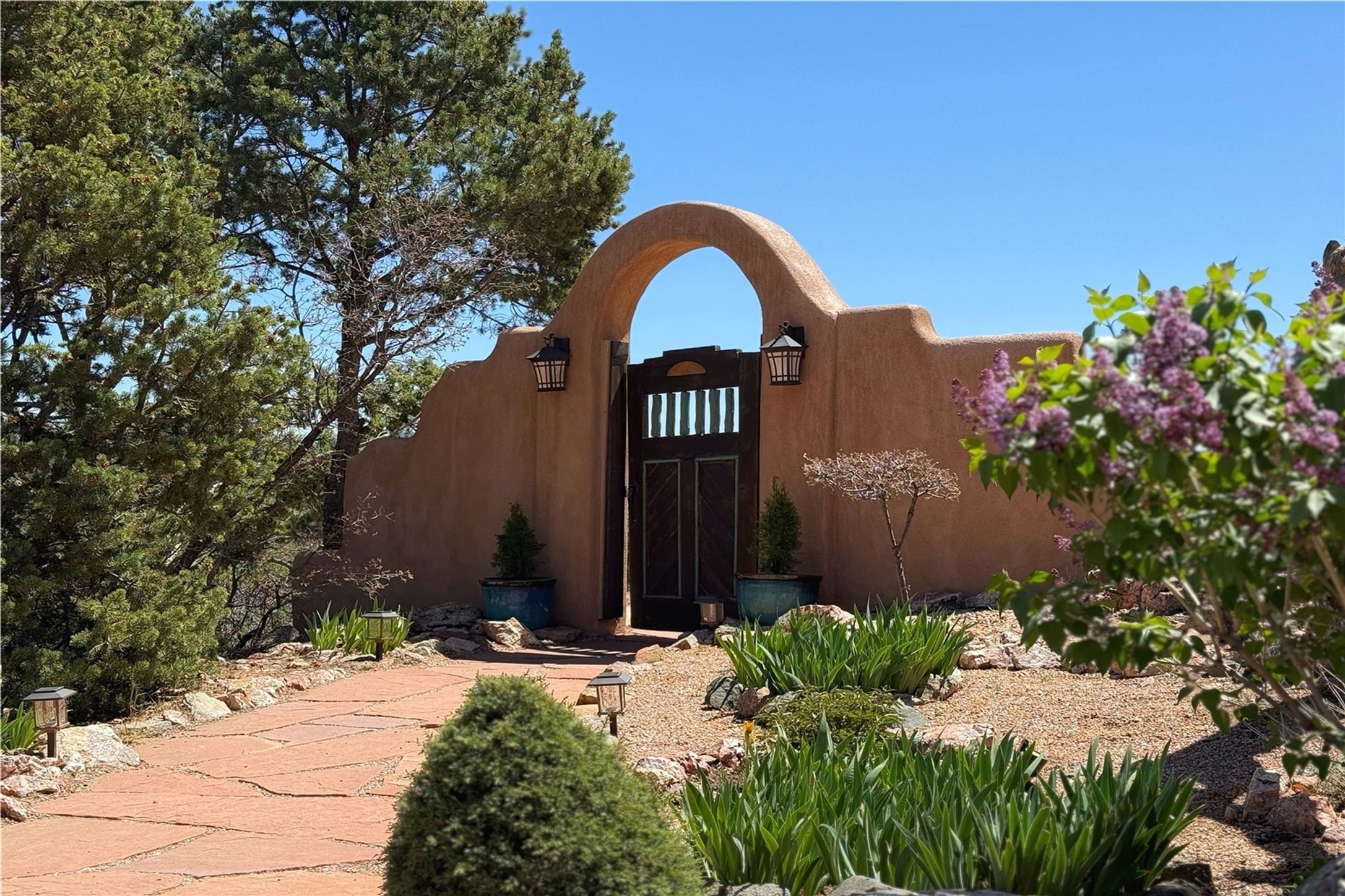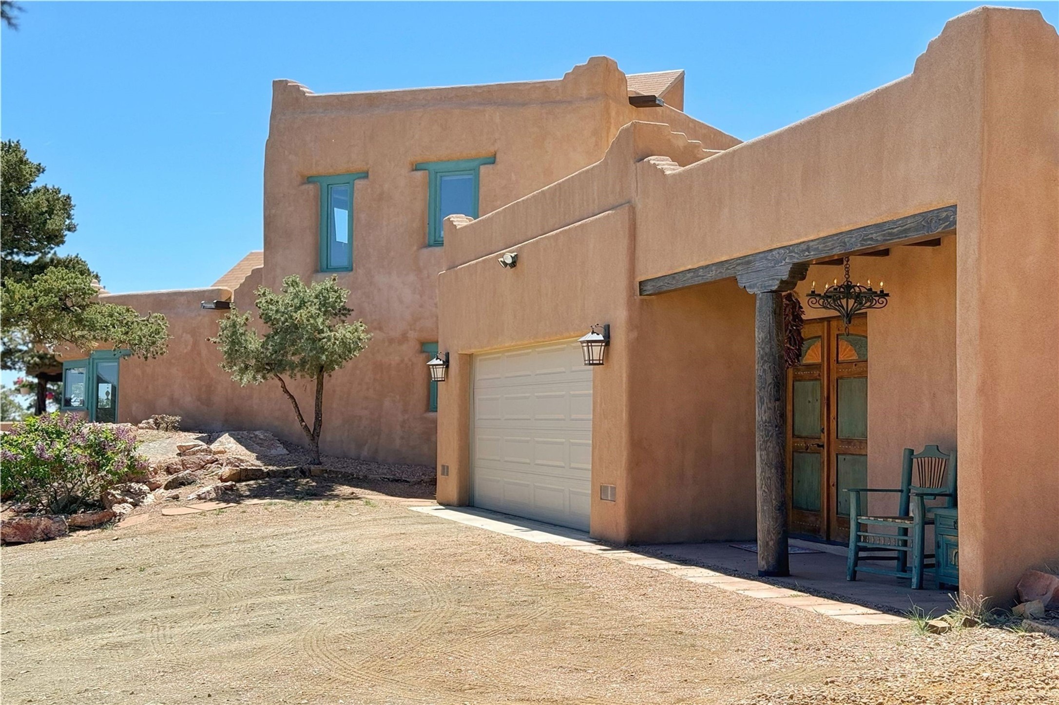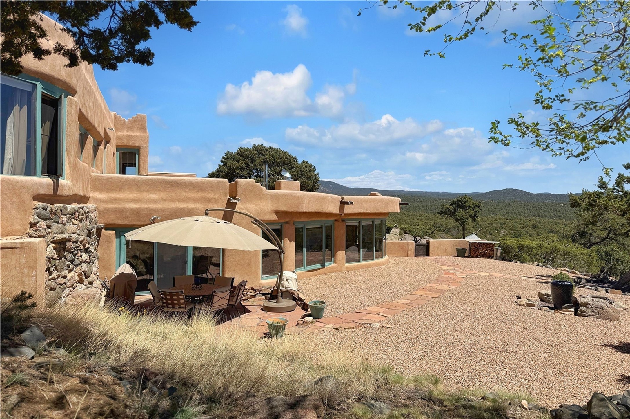 Discover a rare one-of-a-kind Hacienda w/ Studio on 6+ acres boasting dramatic rock outcroppings, sweeping views of Apache Ridge, Rowe Mesa and the Sangre de Cristos in a private pristine setting, just 20 minutes from the Santa Fe Plaza. Perched on a hillside to capture the breathtaking surroundings, this custom-built adobe Pueblo-style gem offers incredible craftsmanship, rounded architecture and unparalleled custom artisan touches. Soaring ceilings w/massive wood vigas throughout, exquisite Saltillo tile, cherry, hardwood and brick floors, rounded art walls curved arches, heavy antique carved doors, a walnut staircase, built-in bancos, recessed nichos, multiple portals and skylights abound. The current owners have thoughtfully renovated the house to add a sense of grand luxury. An added 2-car garage w/custom cabinetry includes an attached studio w/private entry. Follow the path to a small hobbit house-like hideaway to enjoy the exhilarating mountain air and views. Another path leads to a 2-3 stall barn/workshop.The floorplan moves effortlessly between indoor and outdoor living to showcase the arresting views and superb landscaping. The primary suite boasts a private deck, adjoiningsitting room w/curved window walls, custom closets, one cedar lined, a spa-like bath w/giant jetted soaking tub and private courtyard. The kitchen highlights rich cherryvcabinetry, wood-burning stove and opens to a spacious dining room w/patio. Rounded architecture flows seamlessly into the living room w/panoramic bays of passive-solar windows, bancos, a large Kiva wood-burning fireplace, and main portal access.Other spaces include an office, spacious media/family room, two additional bedrooms, one w/private entry and patio, a mudroom, plus a versatile flex room, ideal for an overflowbedroom. This home is truly an architectural wonder to experience. With its incredible craftsmanship, artisan details and never-ending vistas, 8 Hampton Road marries luxury w/privacy and historic charm.