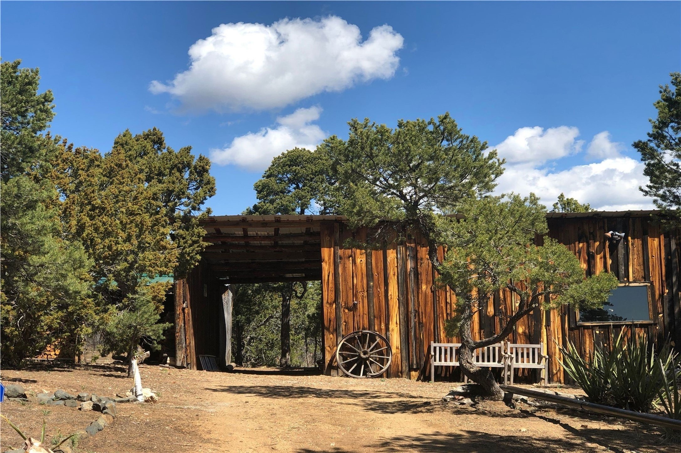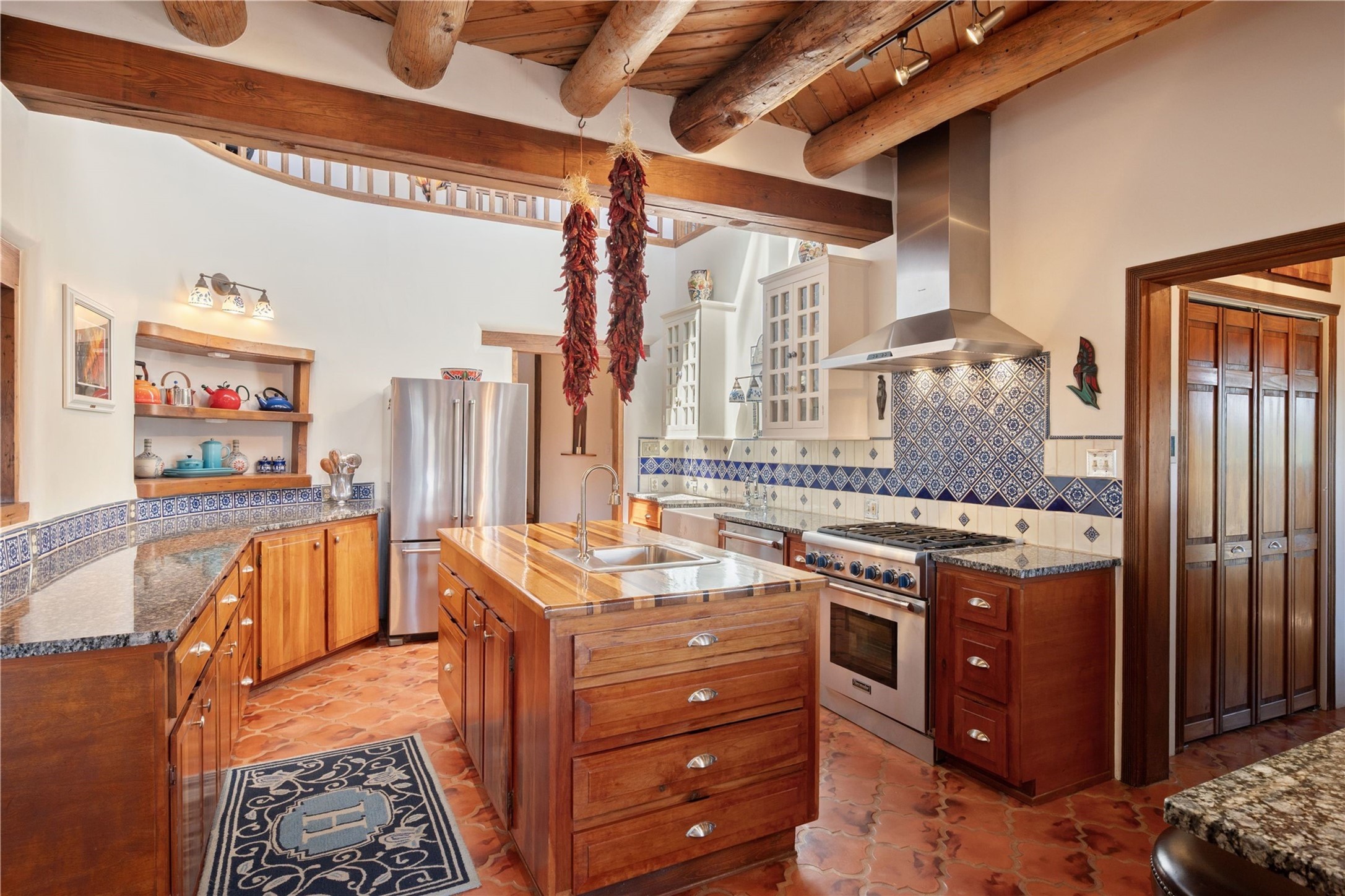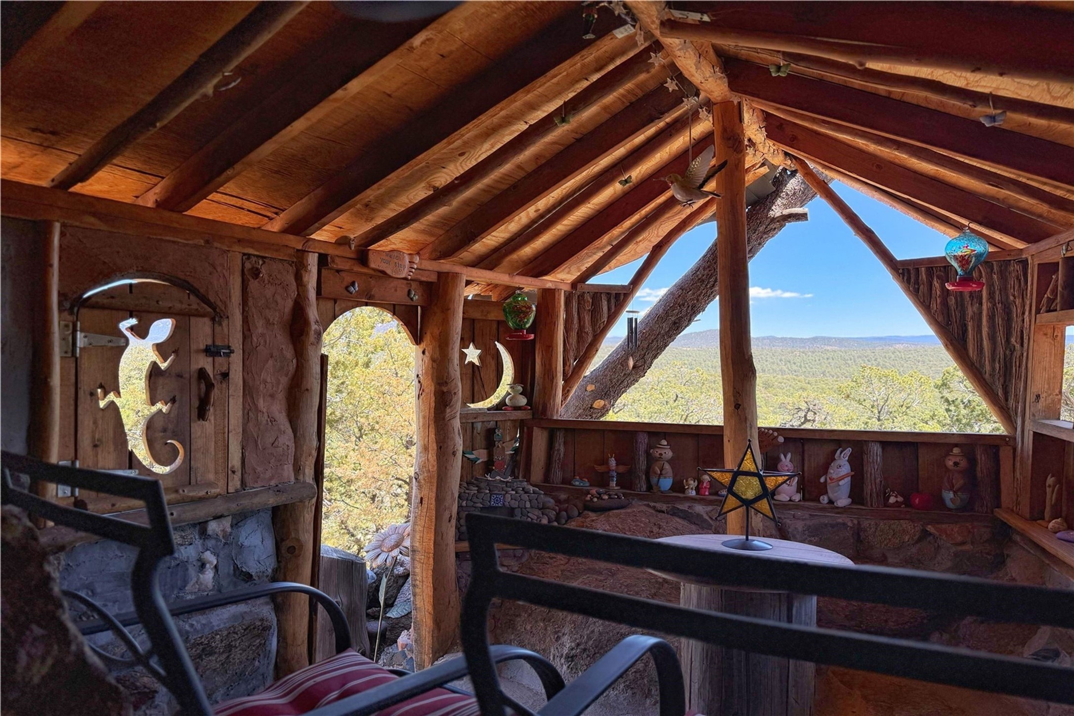 Discover a rare one-of-a-kind Hacienda w/ Studio on 6+ acres boasting dramatic rock outcroppings, sweeping views of Apache Ridge, Rowe Mesa and the Sangre de Cristos in a private pristine setting, just 20 minutes from the Santa Fe Plaza. Perched on a hillside to capture the breathtaking surroundings, this custom-built adobe Pueblo-style gem offers incredible craftsmanship, rounded architecture and unparalleled custom artisan touches. Soaring ceilings w/massive wood vigas throughout, exquisite Saltillo tile, cherry, hardwood and brick floors, rounded art walls curved arches, heavy antique carved doors, a walnut staircase, built-in bancos, recessed nichos, multiple portals and skylights abound. The current owners have thoughtfully renovated the house to add a sense of grand luxury. An added 2-car garage w/custom cabinetry includes an attached studio w/private entry. Follow the path to a small hobbit house-like hideaway to enjoy the exhilarating mountain air and views. Another path leads to a 2-3 stall barn/workshop.The floorplan moves effortlessly between indoor and outdoor living to showcase the arresting views and superb landscaping. The primary suite boasts a private deck, adjoiningsitting room w/curved window walls, custom closets, one cedar lined, a spa-like bath w/giant jetted soaking tub and private courtyard. The kitchen highlights rich cherryvcabinetry, wood-burning stove and opens to a spacious dining room w/patio. Rounded architecture flows seamlessly into the living room w/panoramic bays of passive-solar windows, bancos, a large Kiva wood-burning fireplace, and main portal access.Other spaces include an office, spacious media/family room, two additional bedrooms, one w/private entry and patio, a mudroom, plus a versatile flex room, ideal for an overflowbedroom. This home is truly an architectural wonder to experience. With its incredible craftsmanship, artisan details and never-ending vistas, 8 Hampton Road marries luxury w/privacy and historic charm.