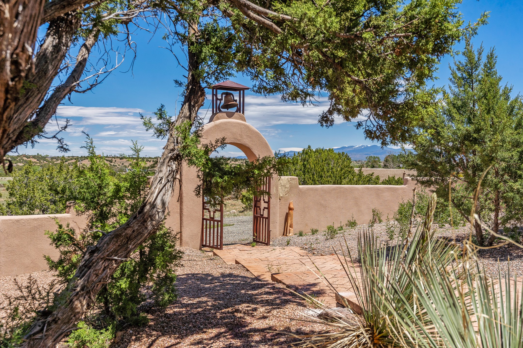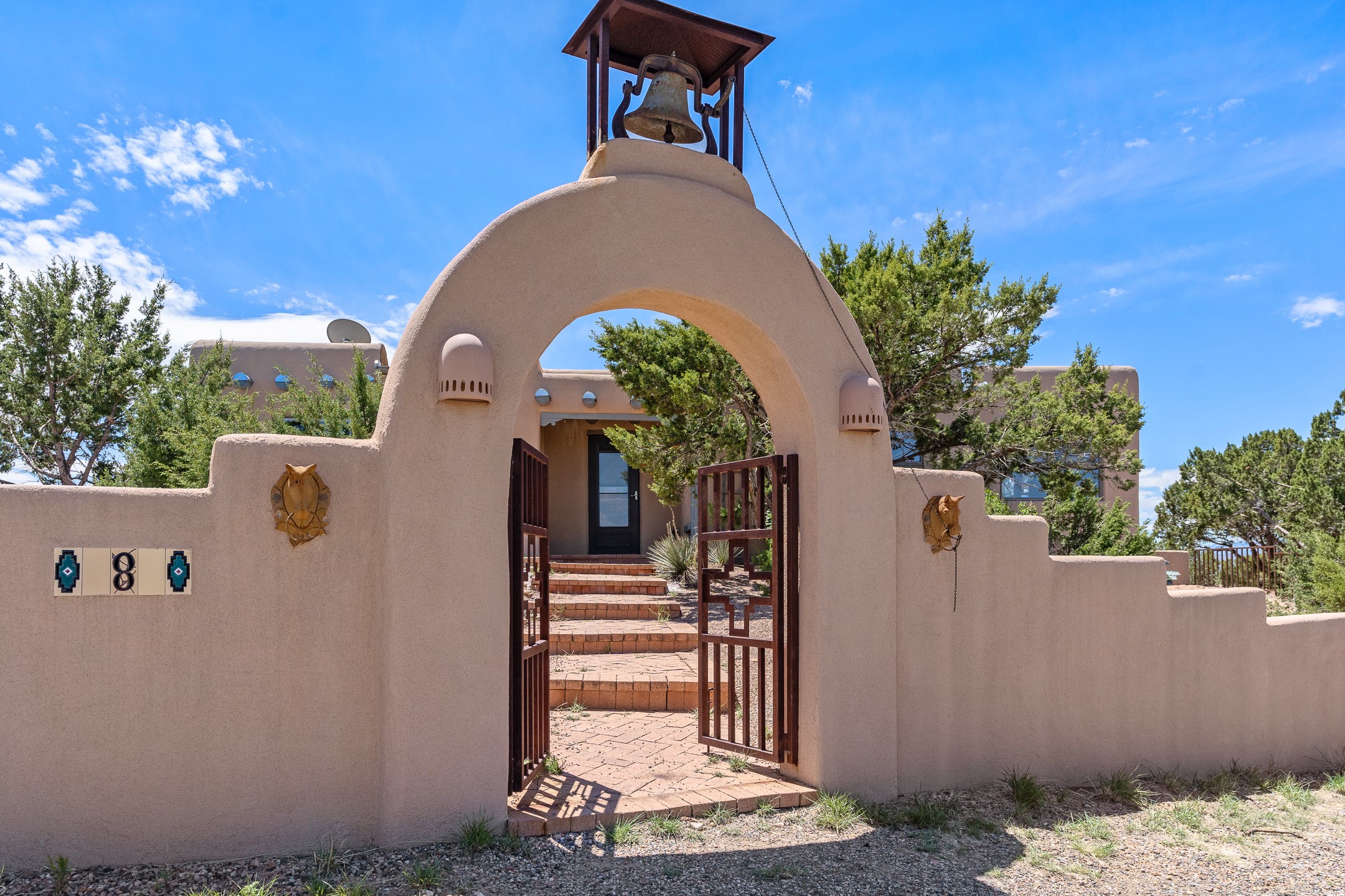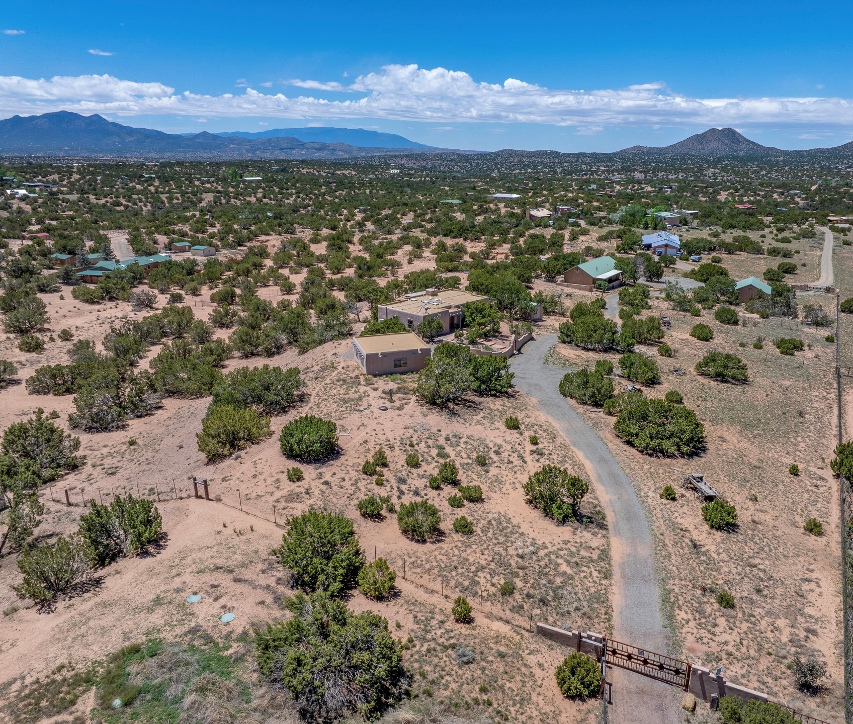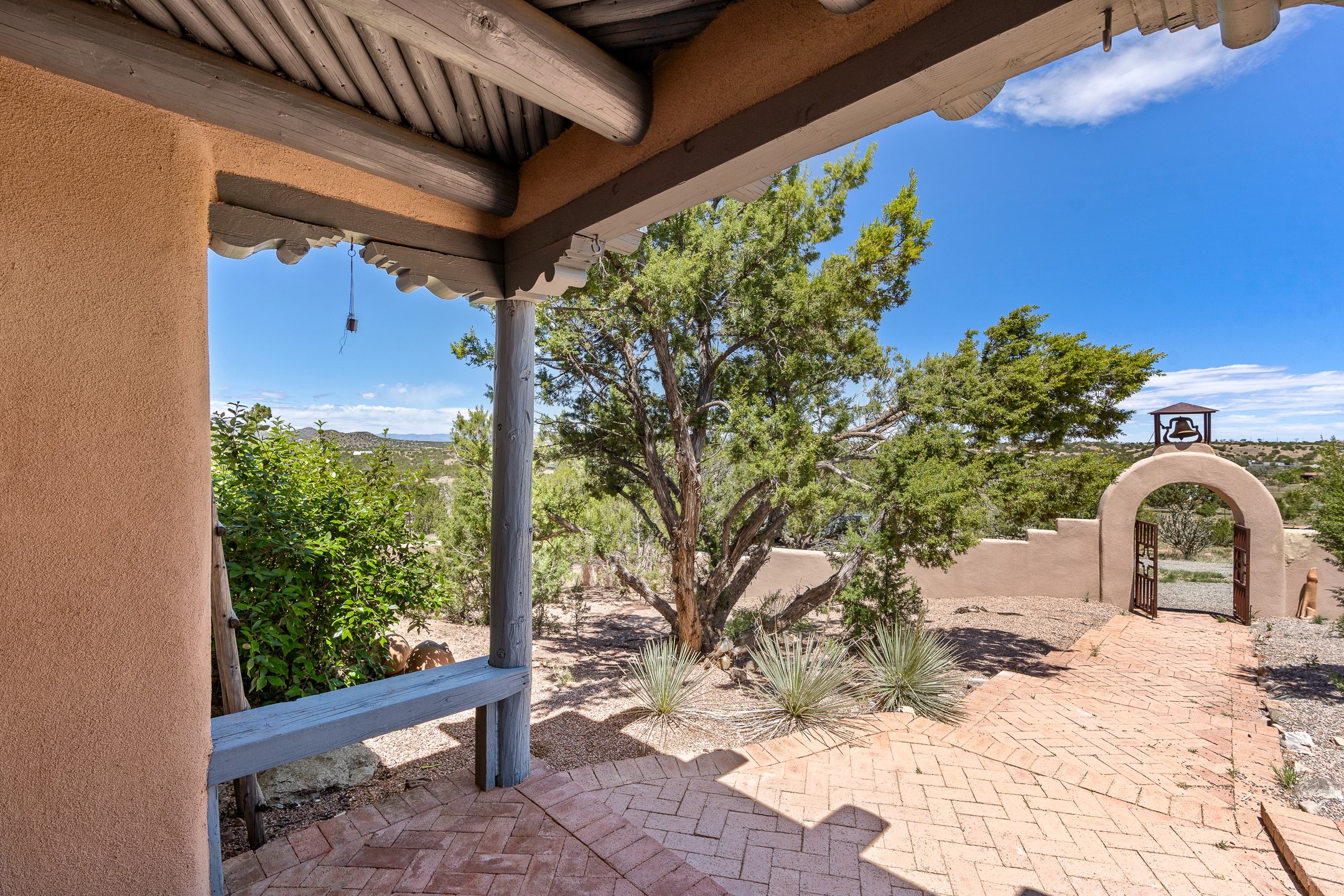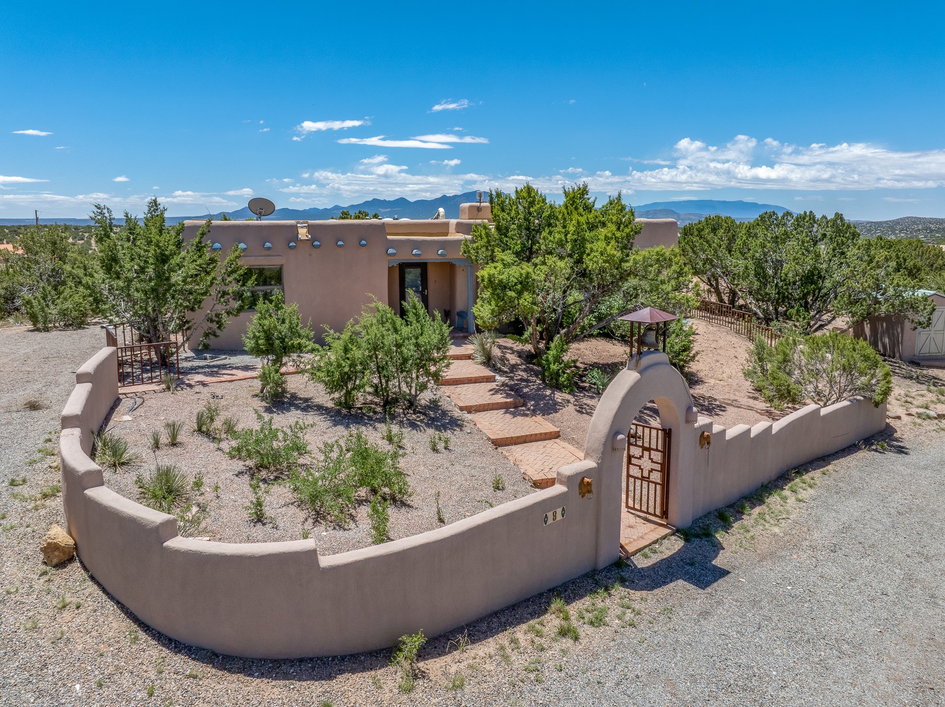 Escape to serenity with this truly unique 2 Bedroom, 2 bath 1520 sq. ft single-family home perched atop a peaceful plateau just off Hwy 14. Situated on 3.5 acres with gated access, this property offers privacy, security, and panoramic mountain views in every direction--perfect for soaking in spectacular sunsets and the quiet stillness of nature. Crafted with rustic charm in mind, the home features brick floors, wood ceilings, exposed vigas, and a traditional kiva fireplace that brings warmth and Southwestern character to the living space. With 2 spacious bedrooms and 2 full baths, it's the ideal size for a peaceful retreat or full-time living. Enjoy the expansive outdoor space, ideal for horses, gardens, or simply enjoying the wide-open sky. The 2-car garage offers ample storage, and the location provides convenient access to Santa Fe while feeling worlds away from the hustle and bustle. If you're seeking a western lifestyle surrounded by natural beauty and timeless charm, this is the one.