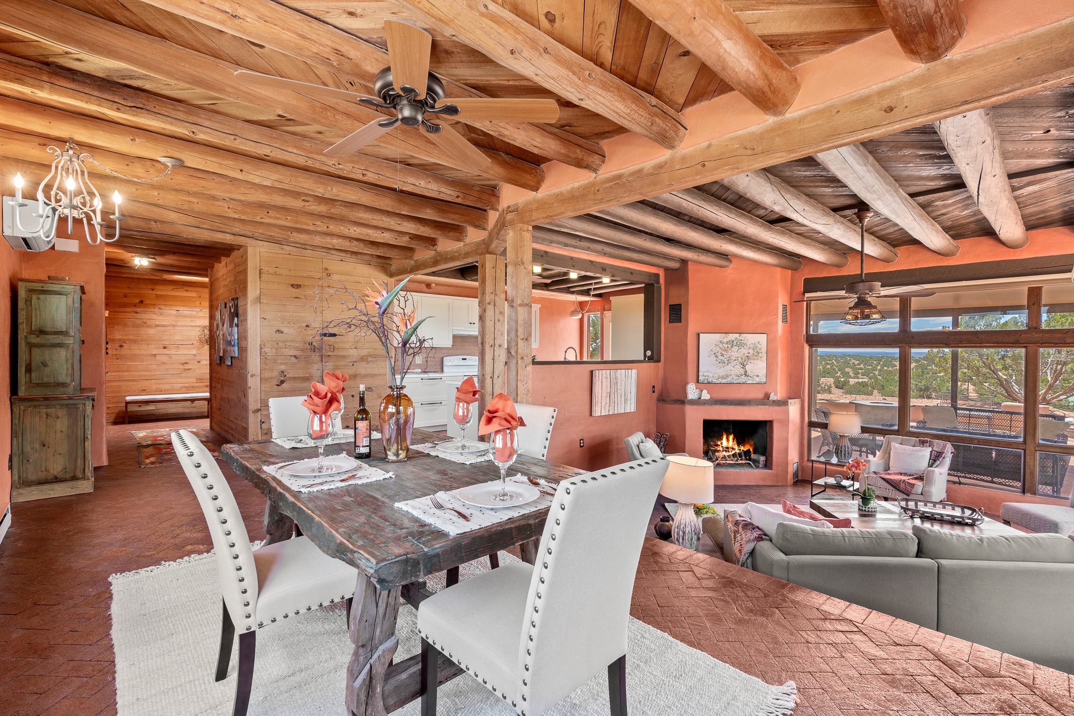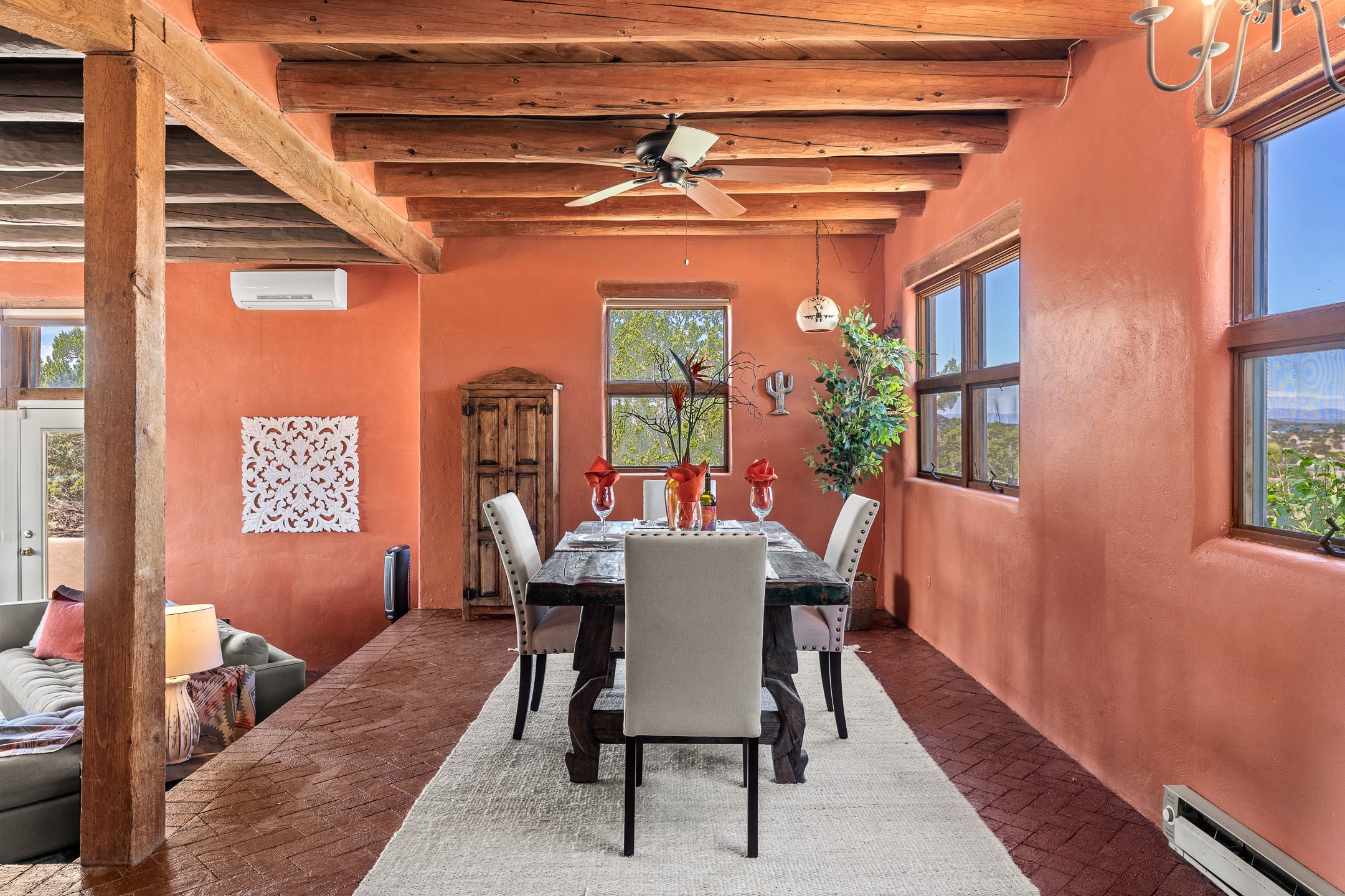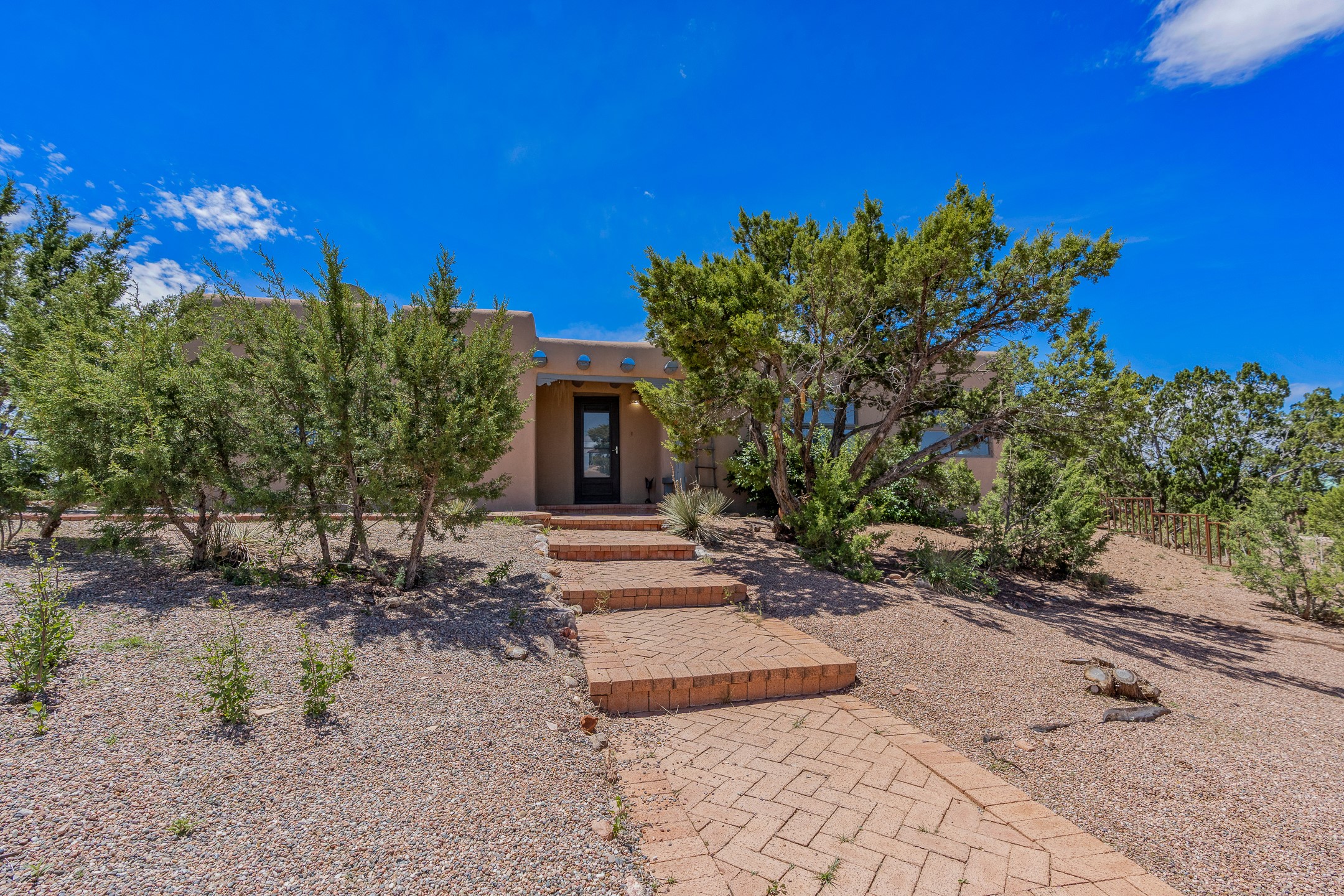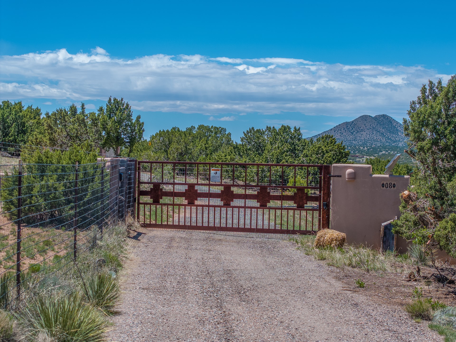 Escape to serenity with this truly unique 2 Bedroom, 2 bath 1520 sq. ft single-family home perched atop a peaceful plateau just off Hwy 14. Situated on 3.5 acres with gated access, this property offers privacy, security, and panoramic mountain views in every direction--perfect for soaking in spectacular sunsets and the quiet stillness of nature. Crafted with rustic charm in mind, the home features brick floors, wood ceilings, exposed vigas, and a traditional kiva fireplace that brings warmth and Southwestern character to the living space. With 2 spacious bedrooms and 2 full baths, it's the ideal size for a peaceful retreat or full-time living. Enjoy the expansive outdoor space, ideal for horses, gardens, or simply enjoying the wide-open sky. The 2-car garage offers ample storage, and the location provides convenient access to Santa Fe while feeling worlds away from the hustle and bustle. If you're seeking a western lifestyle surrounded by natural beauty and timeless charm, this is the one.