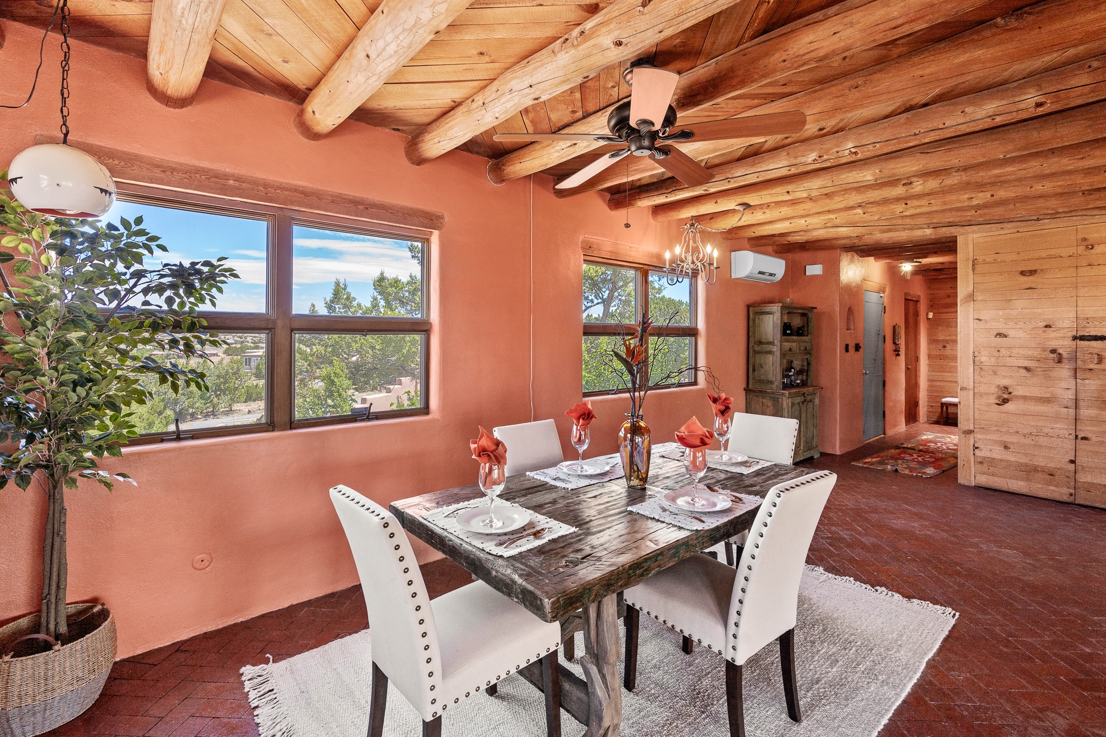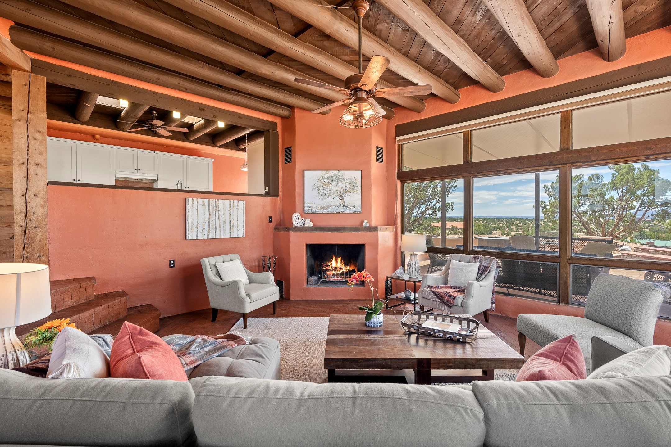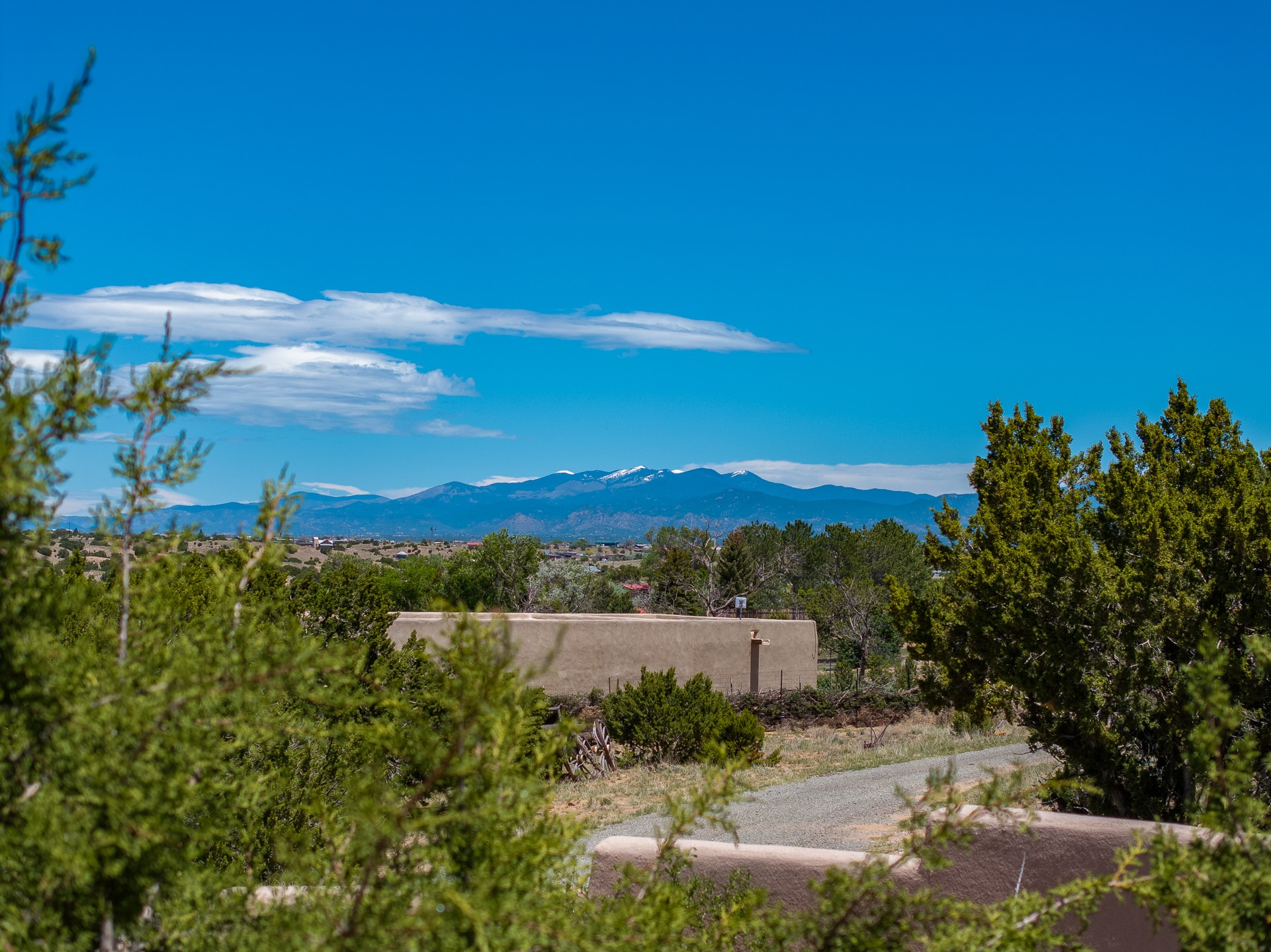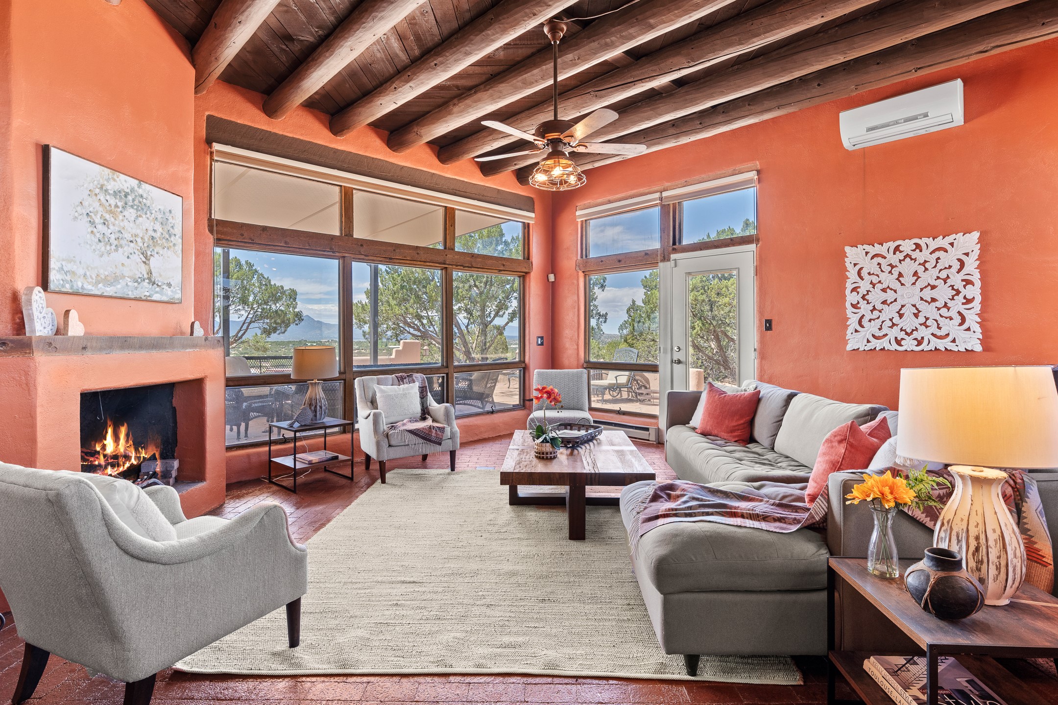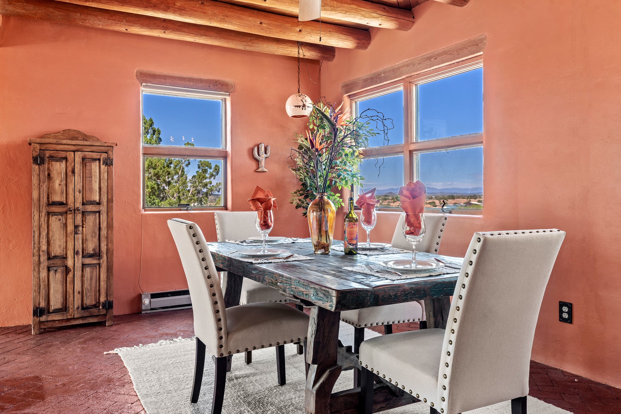 Escape to serenity with this truly unique 2 Bedroom, 2 bath 1520 sq. ft single-family home perched atop a peaceful plateau just off Hwy 14. Situated on 3.5 acres with gated access, this property offers privacy, security, and panoramic mountain views in every direction--perfect for soaking in spectacular sunsets and the quiet stillness of nature. Crafted with rustic charm in mind, the home features brick floors, wood ceilings, exposed vigas, and a traditional kiva fireplace that brings warmth and Southwestern character to the living space. With 2 spacious bedrooms and 2 full baths, it's the ideal size for a peaceful retreat or full-time living. Enjoy the expansive outdoor space, ideal for horses, gardens, or simply enjoying the wide-open sky. The 2-car garage offers ample storage, and the location provides convenient access to Santa Fe while feeling worlds away from the hustle and bustle. If you're seeking a western lifestyle surrounded by natural beauty and timeless charm, this is the one.