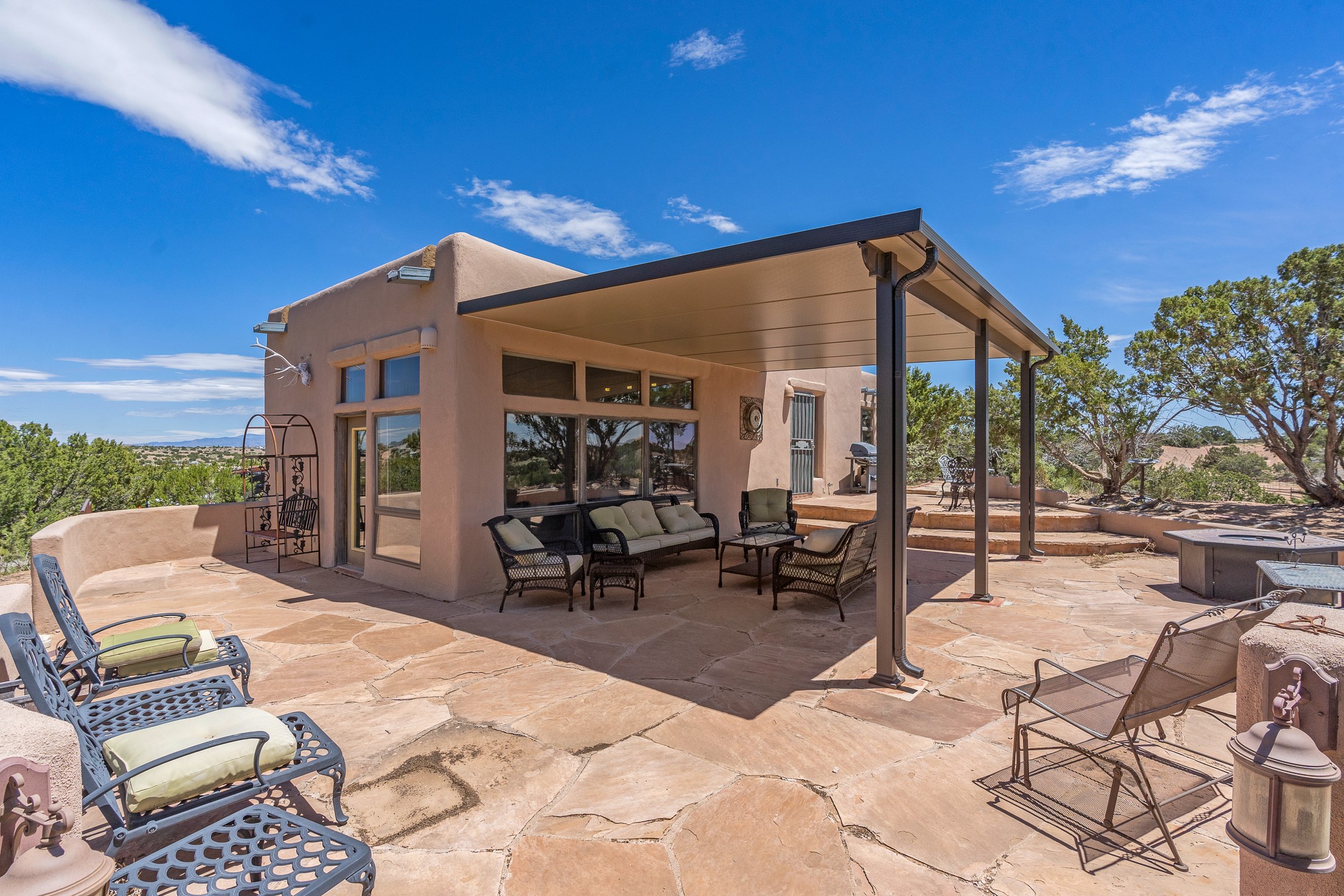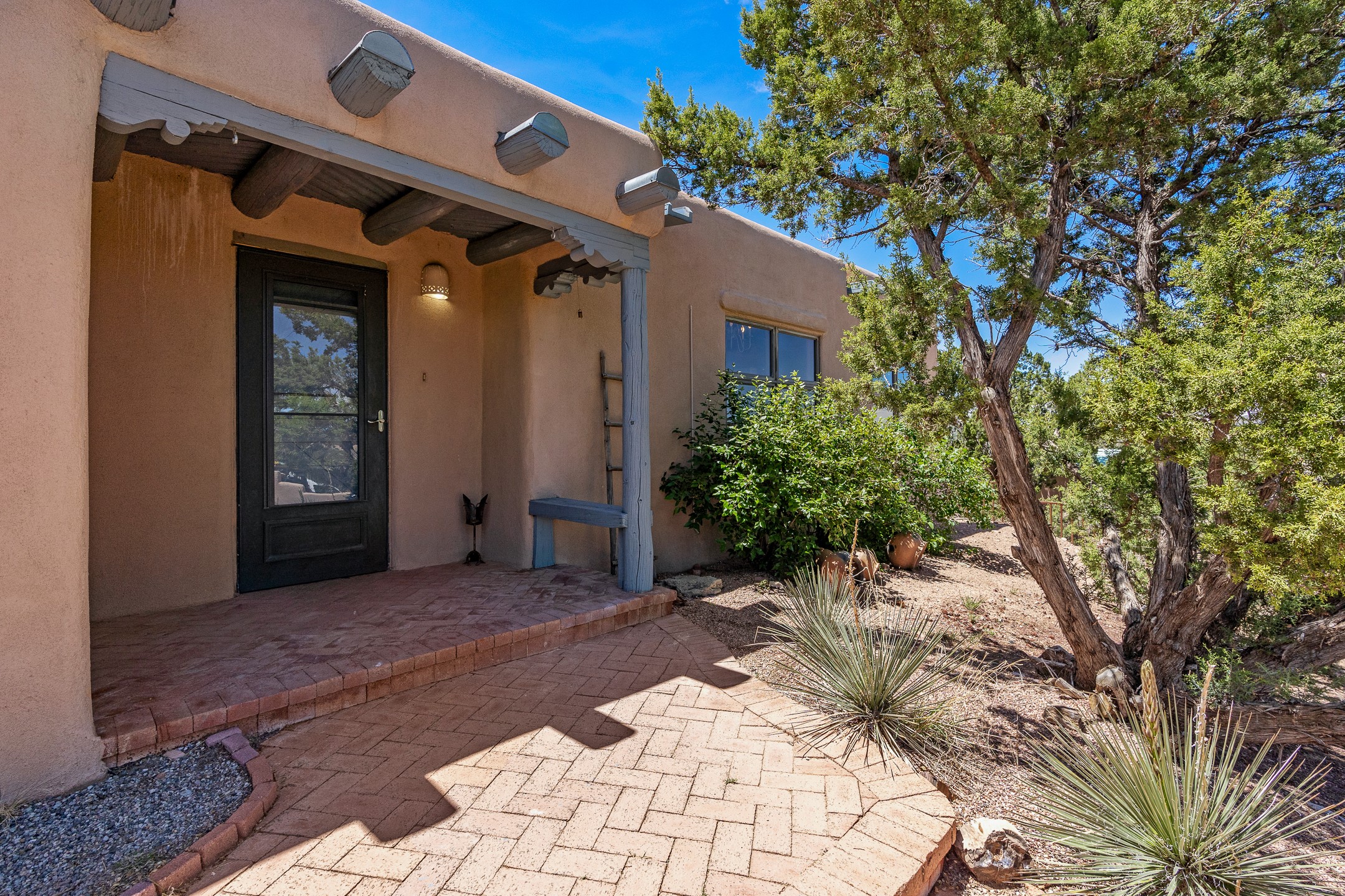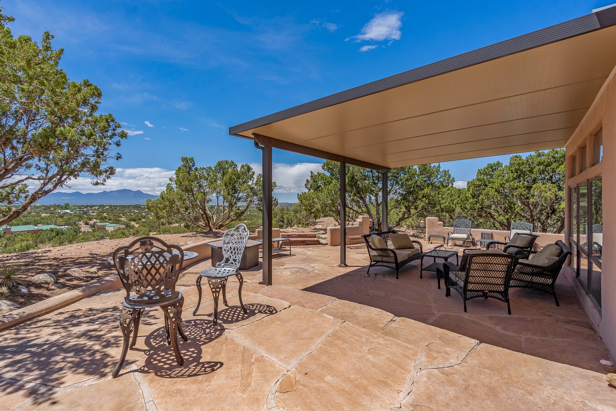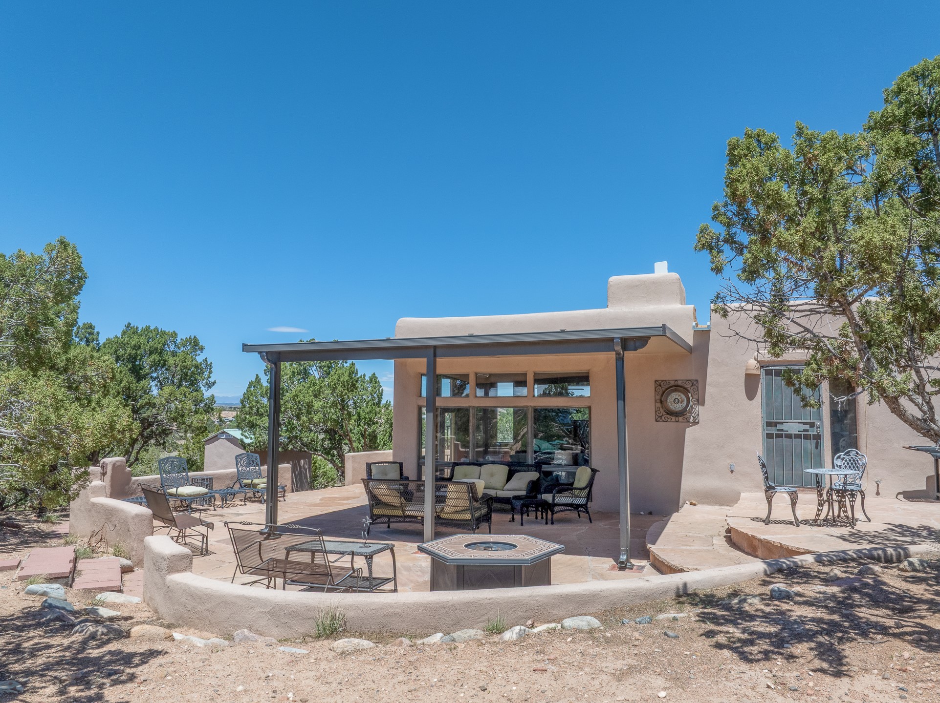 Escape to serenity with this truly unique 2 Bedroom, 2 bath 1520 sq. ft single-family home perched atop a peaceful plateau just off Hwy 14. Situated on 3.5 acres with gated access, this property offers privacy, security, and panoramic mountain views in every direction--perfect for soaking in spectacular sunsets and the quiet stillness of nature. Crafted with rustic charm in mind, the home features brick floors, wood ceilings, exposed vigas, and a traditional kiva fireplace that brings warmth and Southwestern character to the living space. With 2 spacious bedrooms and 2 full baths, it's the ideal size for a peaceful retreat or full-time living. Enjoy the expansive outdoor space, ideal for horses, gardens, or simply enjoying the wide-open sky. The 2-car garage offers ample storage, and the location provides convenient access to Santa Fe while feeling worlds away from the hustle and bustle. If you're seeking a western lifestyle surrounded by natural beauty and timeless charm, this is the one.